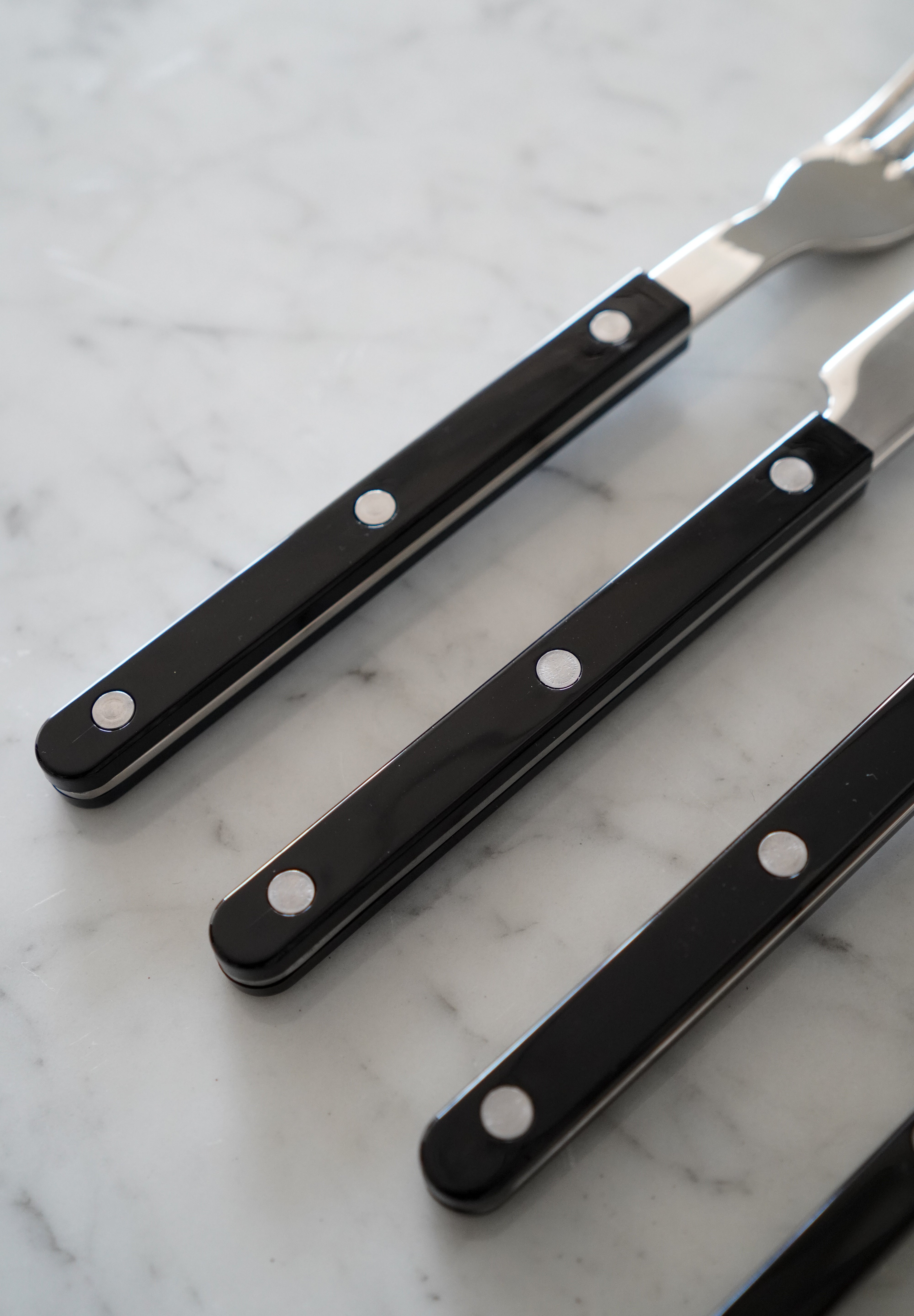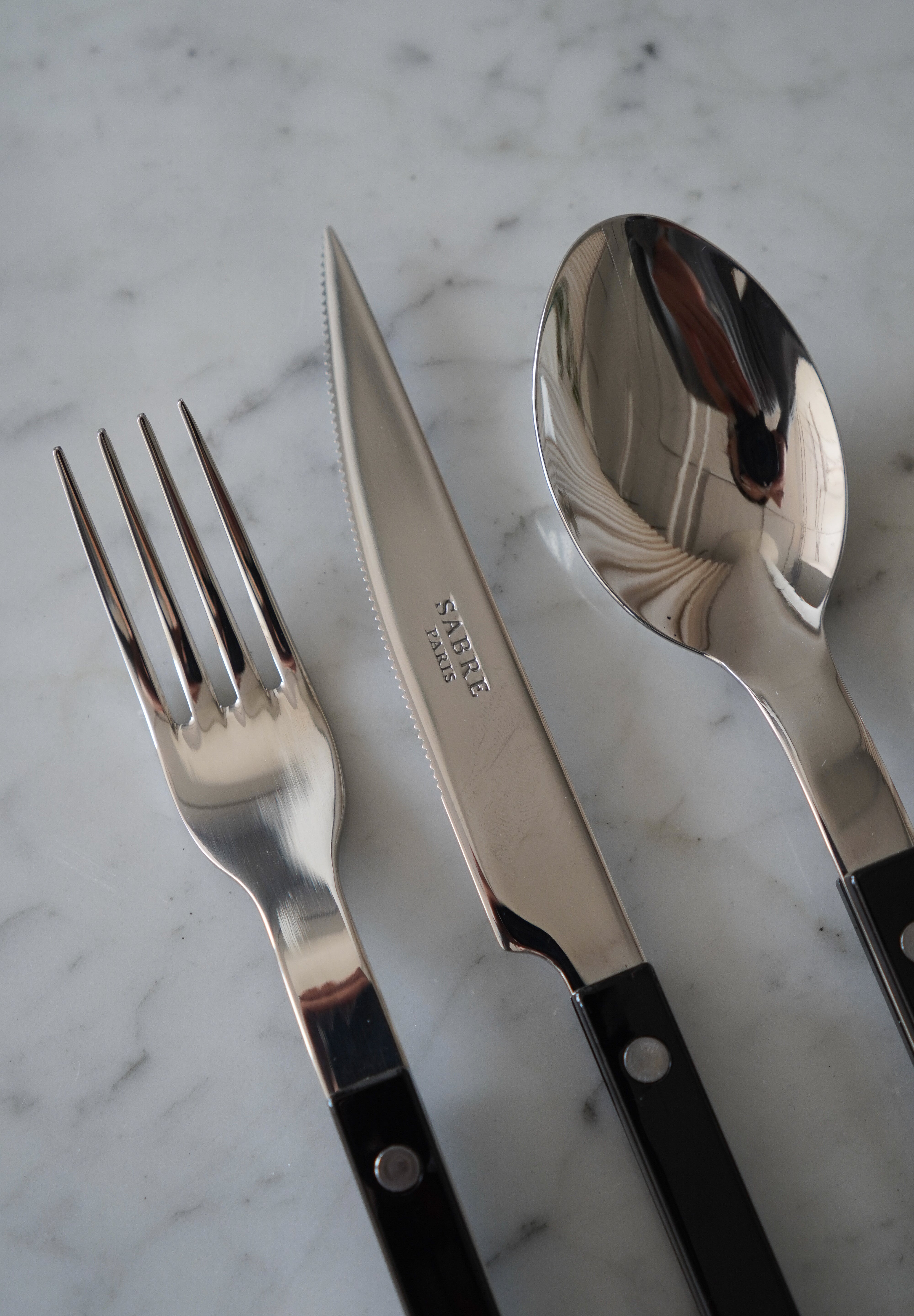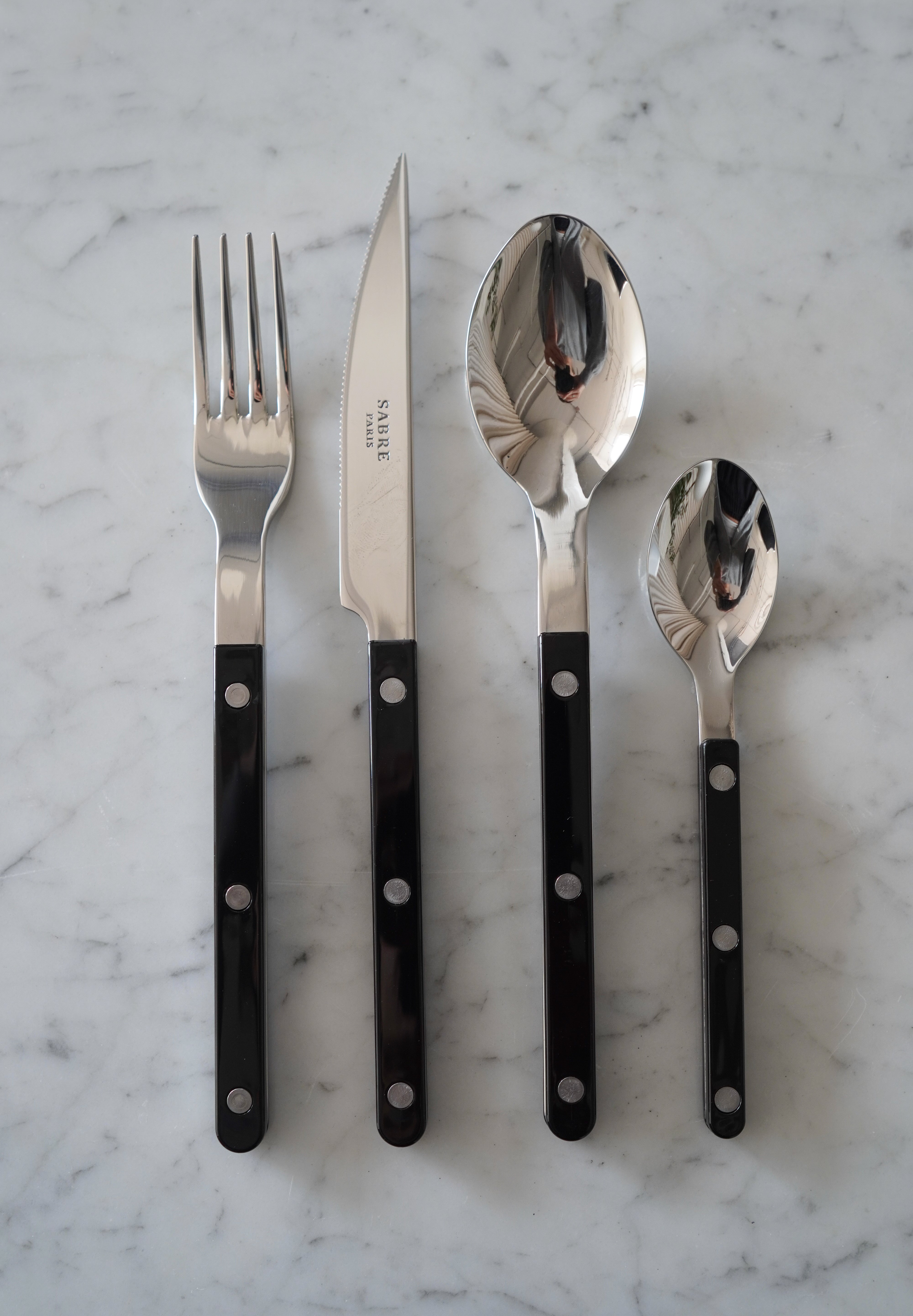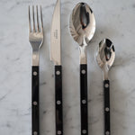4-piece flatware set by Sabre Paris. Made of stainless steel in a shiny finish and a black coloured acrylic handle. Set includes a soup spoon, a dinner fork, a dinner knife and a teaspoon.