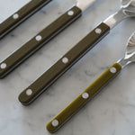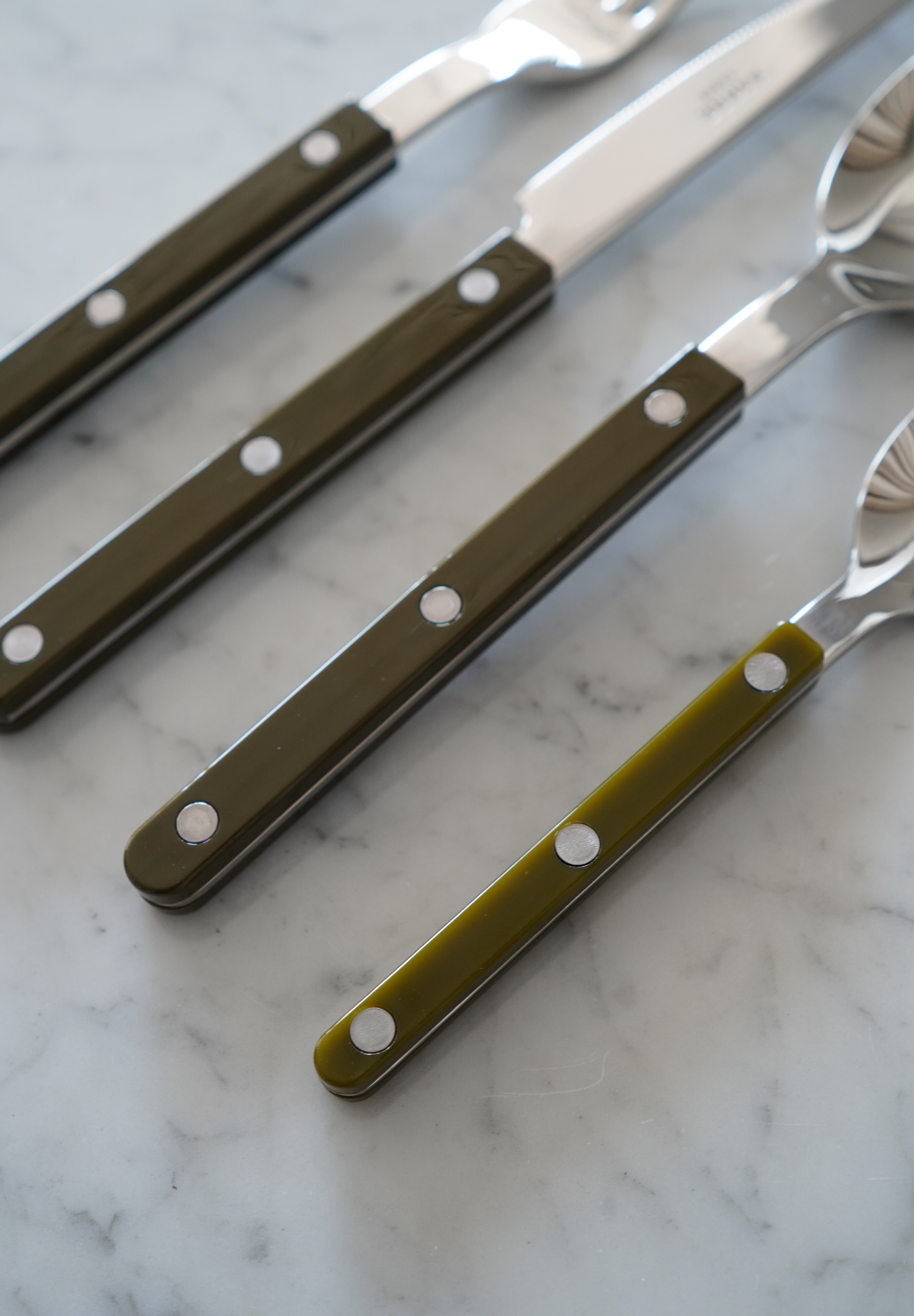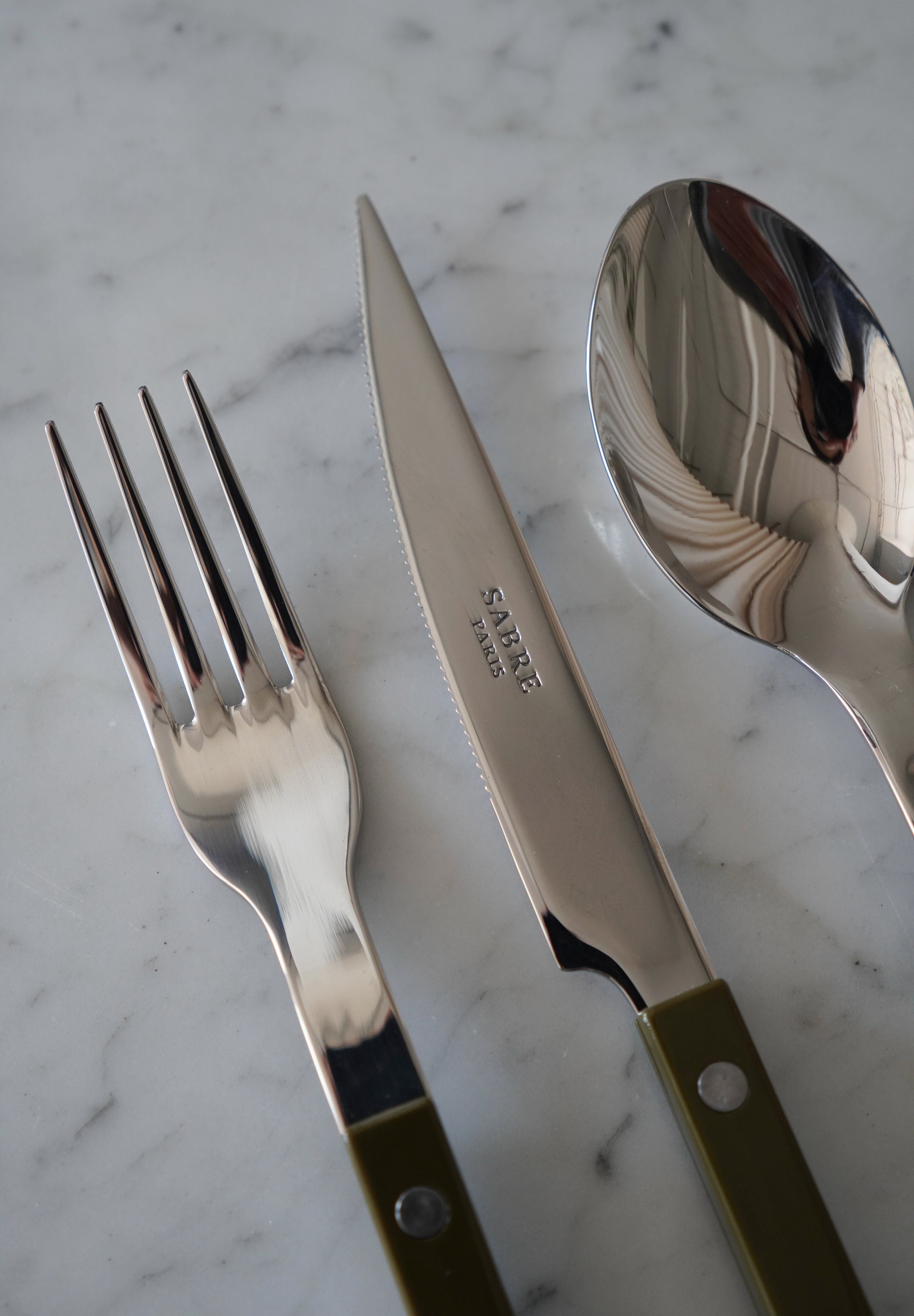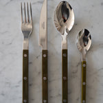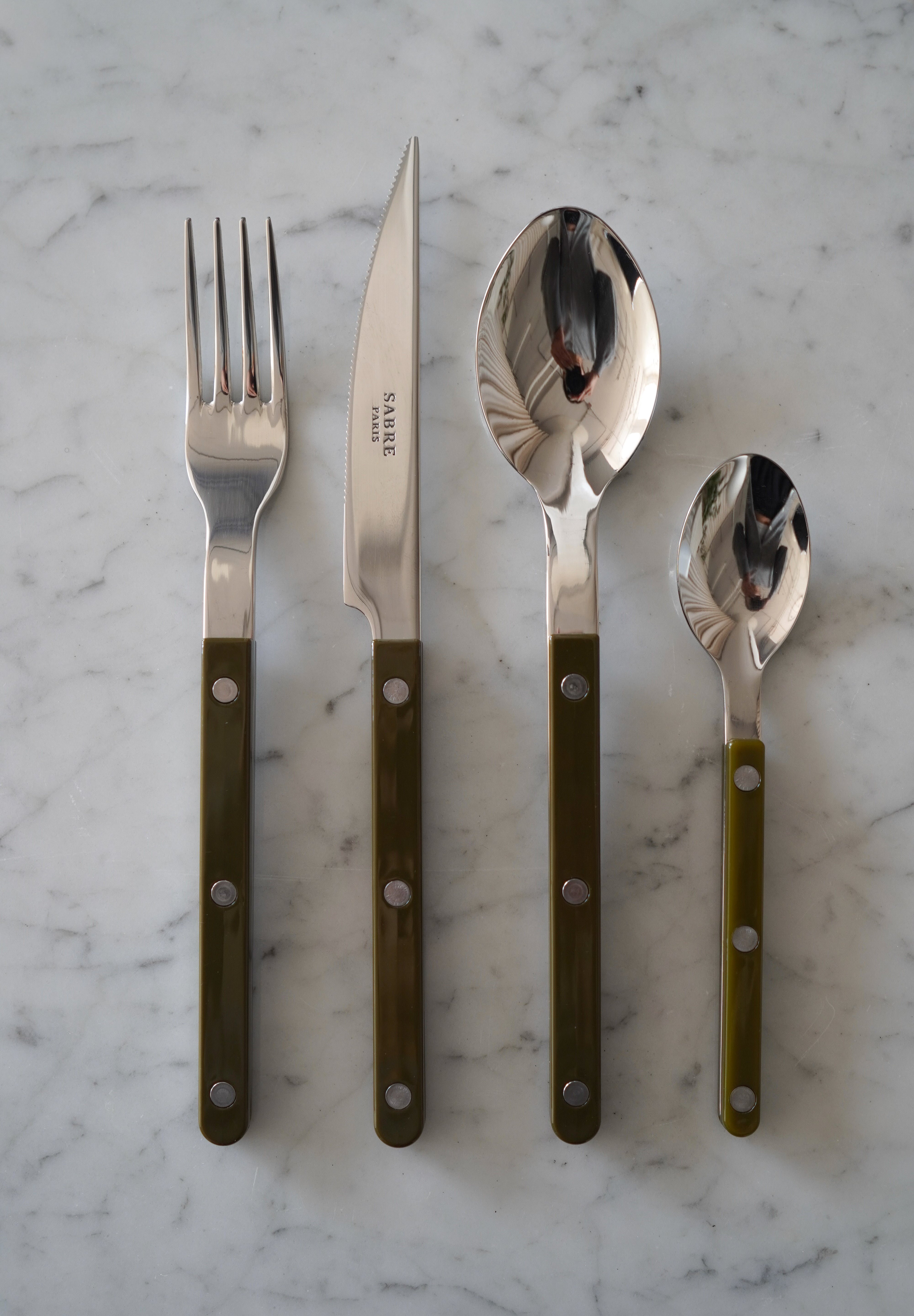 4-piece flatware set by Sabre Paris. Made of stainless steel in a shiny finish and dark green coloured acrylic handle. Set includes a soup spoon, a dinner fork, a dinner knife and a teaspoon.