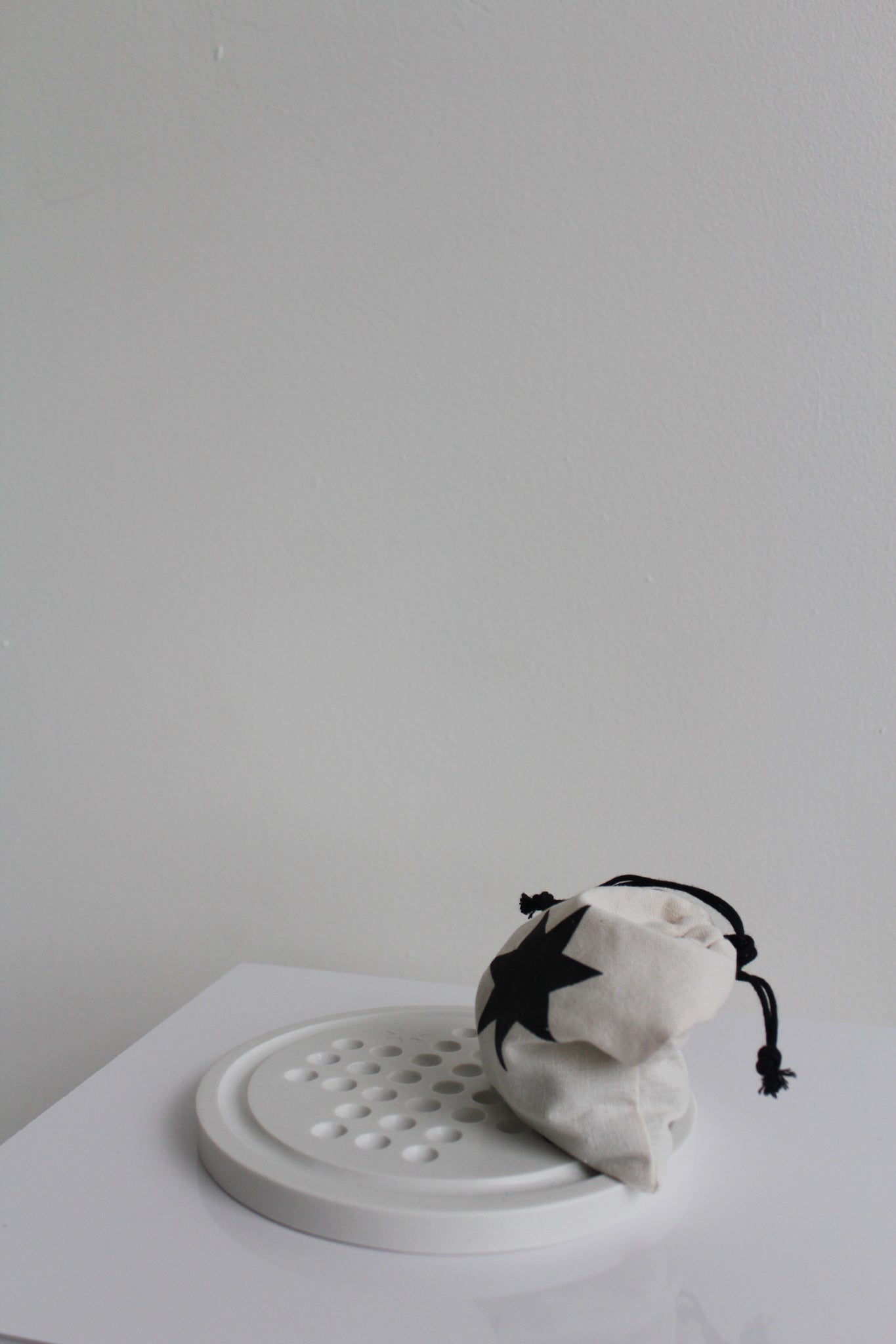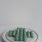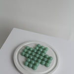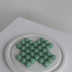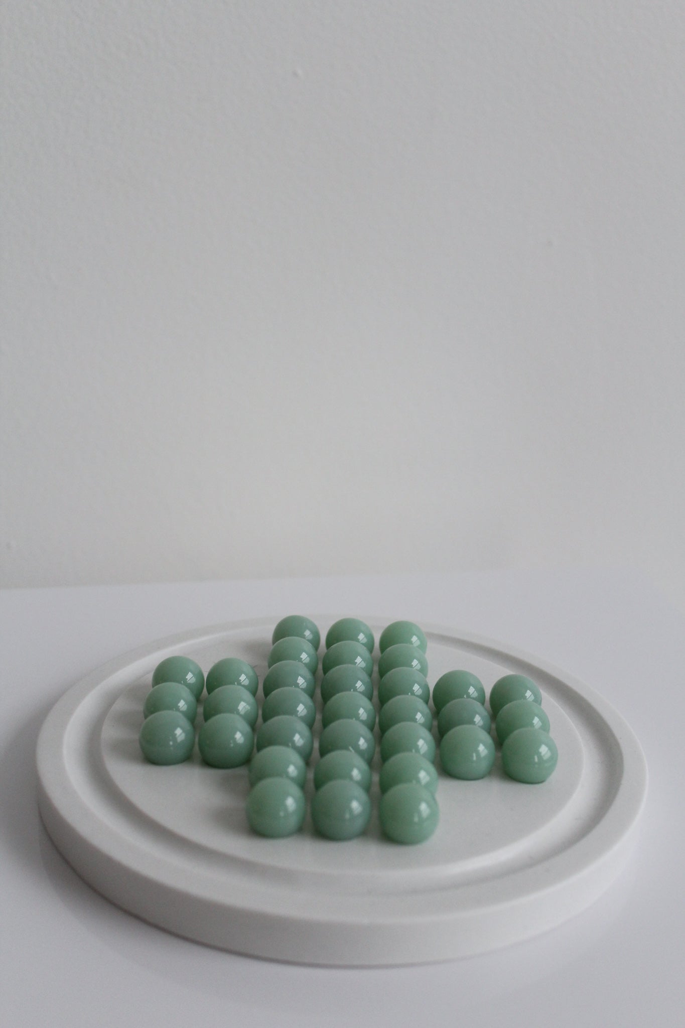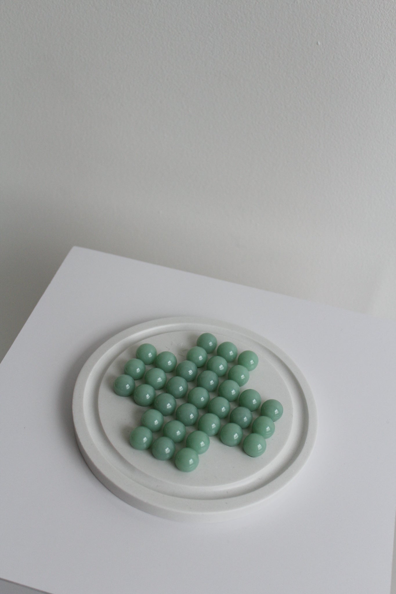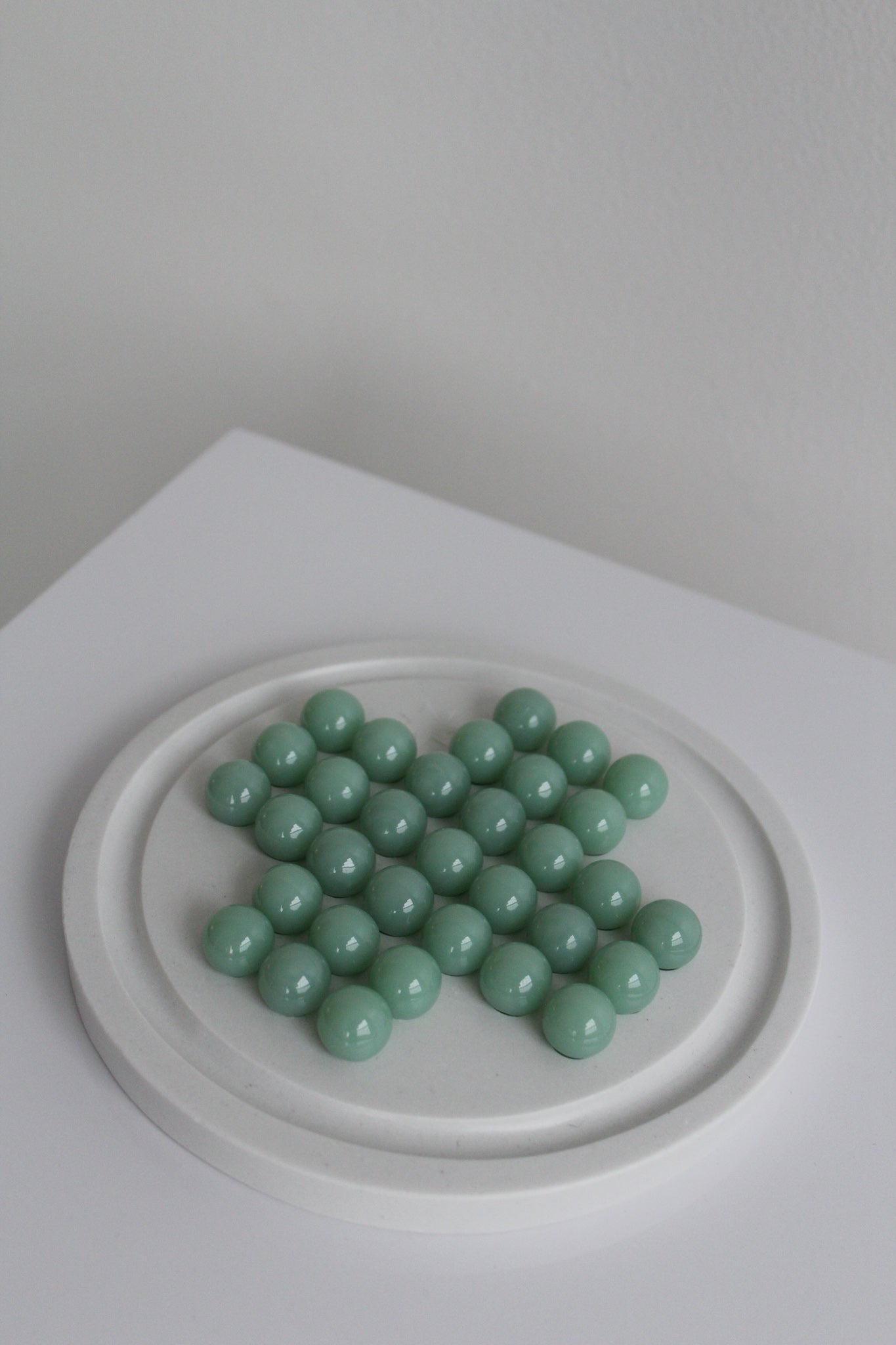 Made sustainably by hand in France with white marble powder from Carrara in Italy and opaque mint green borosilicate glass marbles.