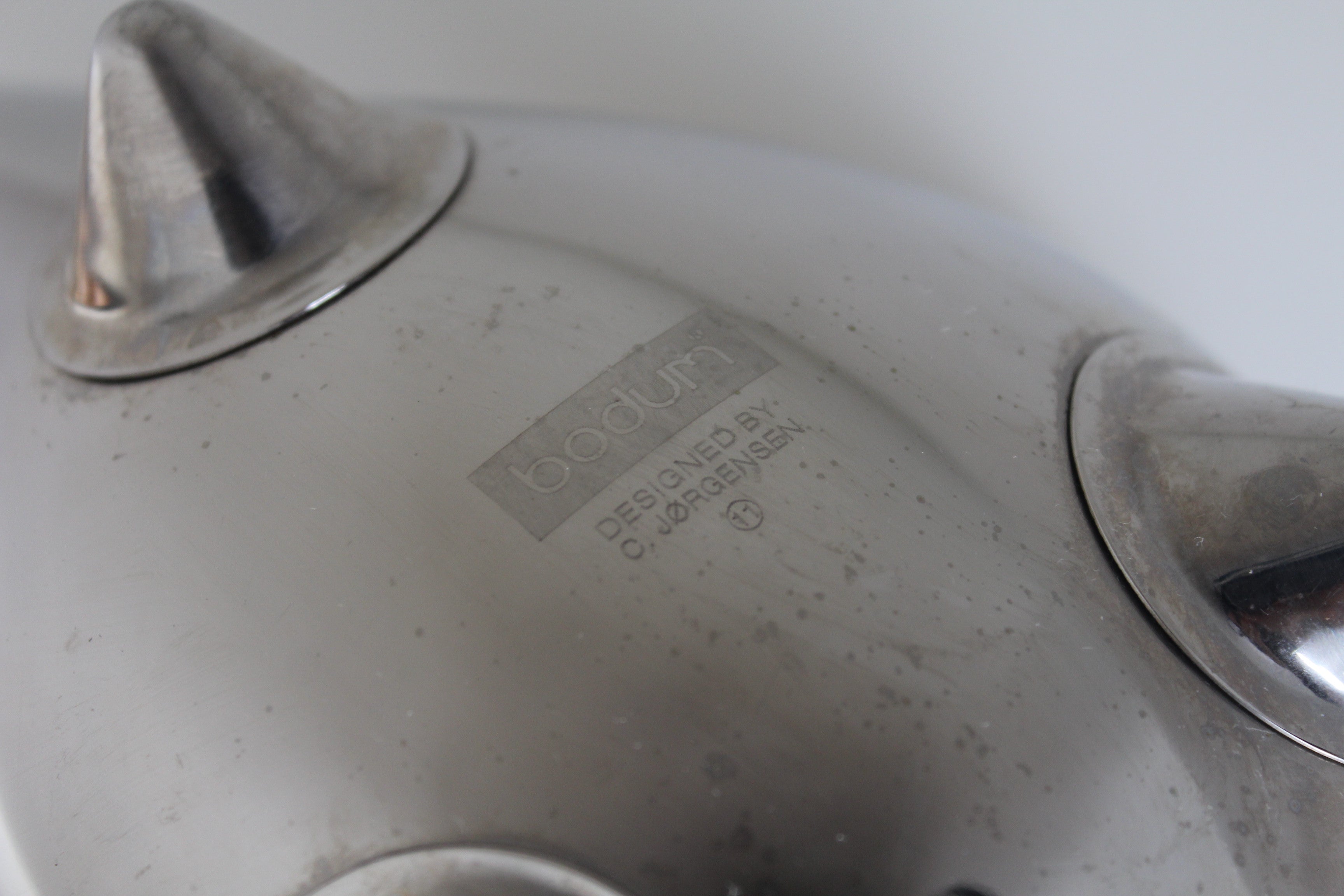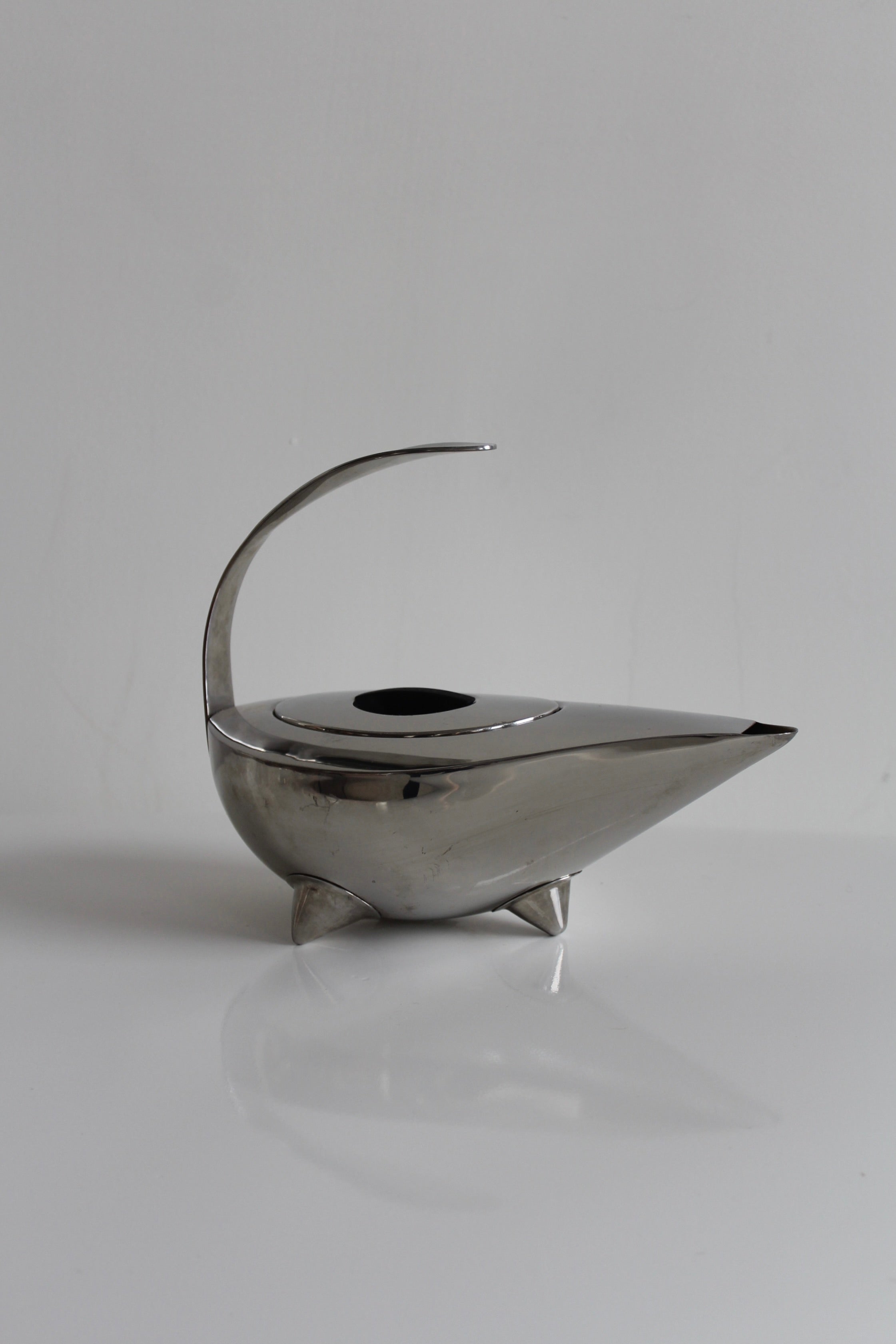 "Naoko" Aladdin's Teapot by Carsten Jorgensen for Bodum, made in Switzerland, 1980s. Stainless steel with original black rubber lid.