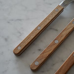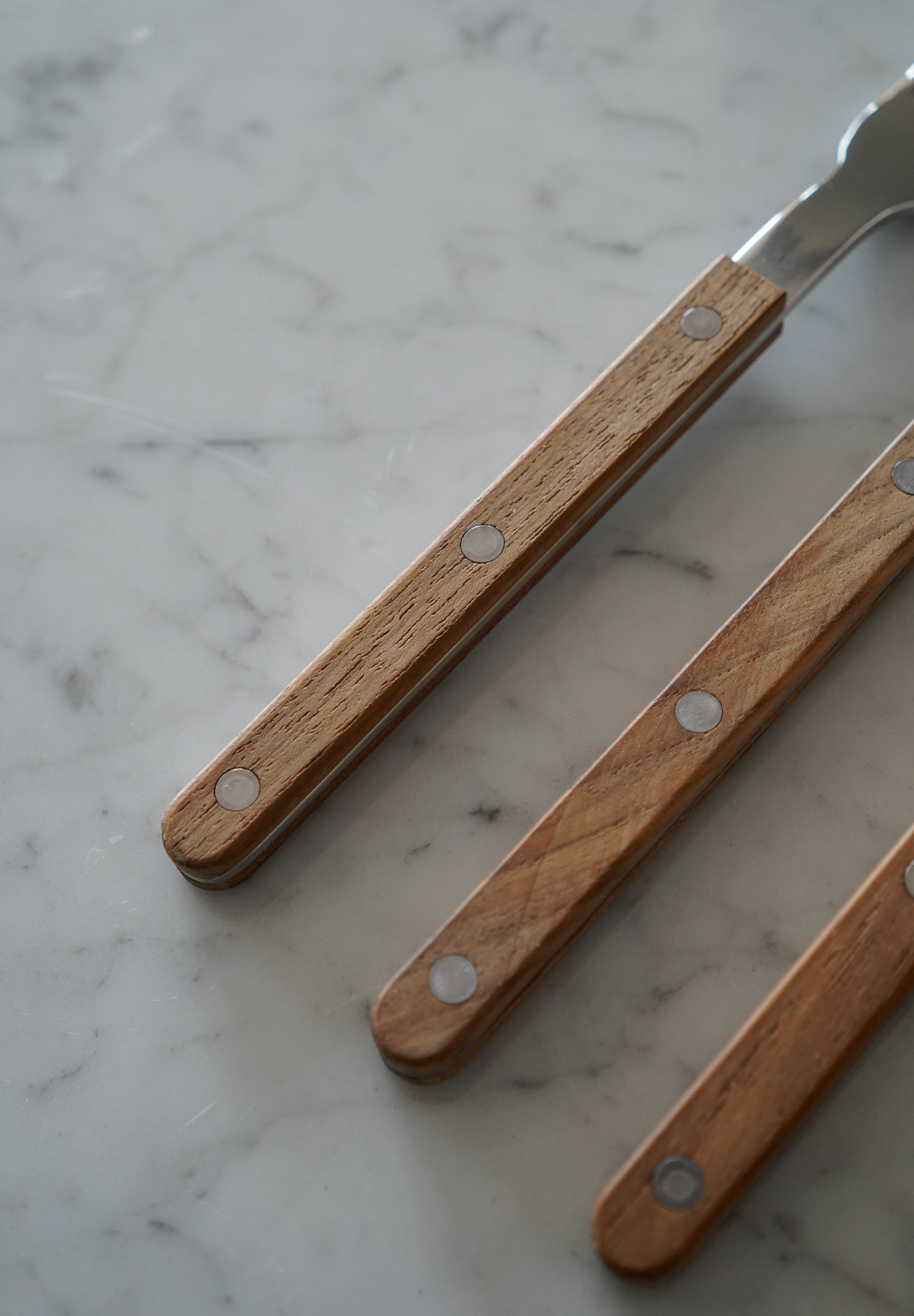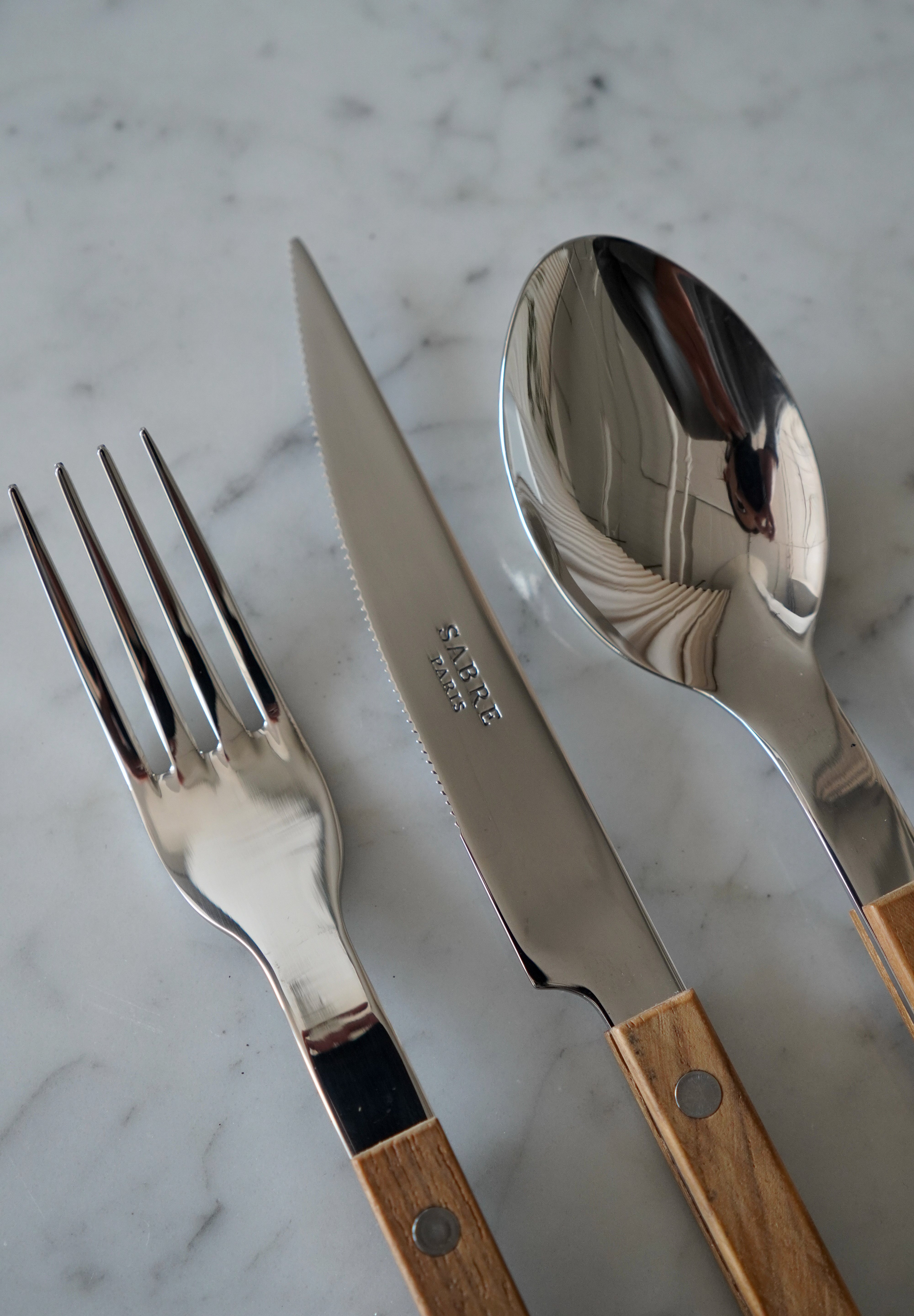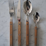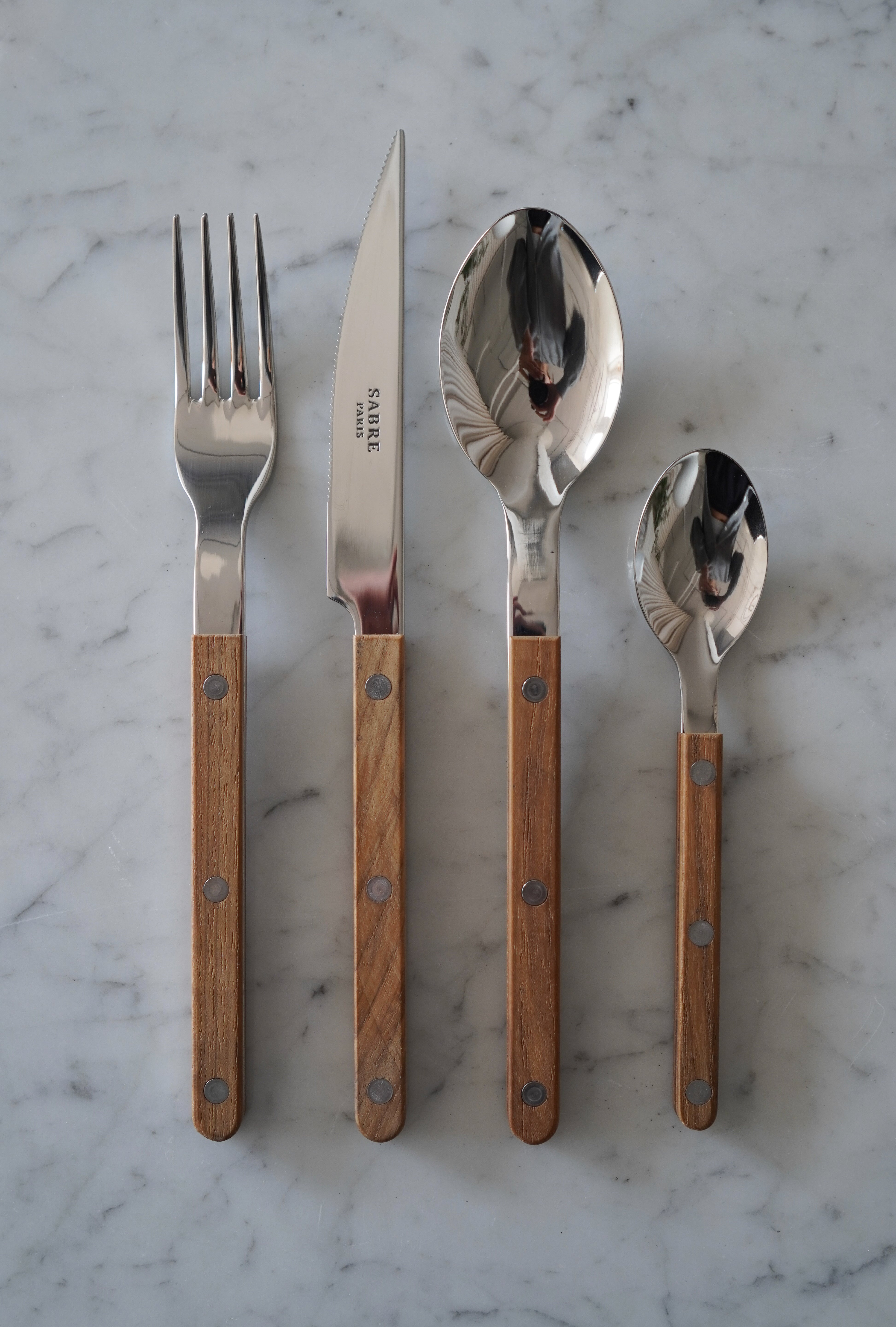 4-piece flatware set by Sabre Paris. Made of stainless steel in a shiny finish and teak coloured acrylic handle. Set includes a soup spoon, a dinner fork, a dinner knife and a teaspoon.