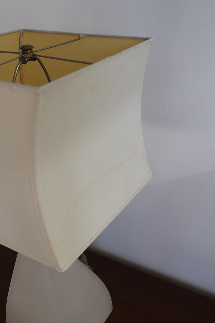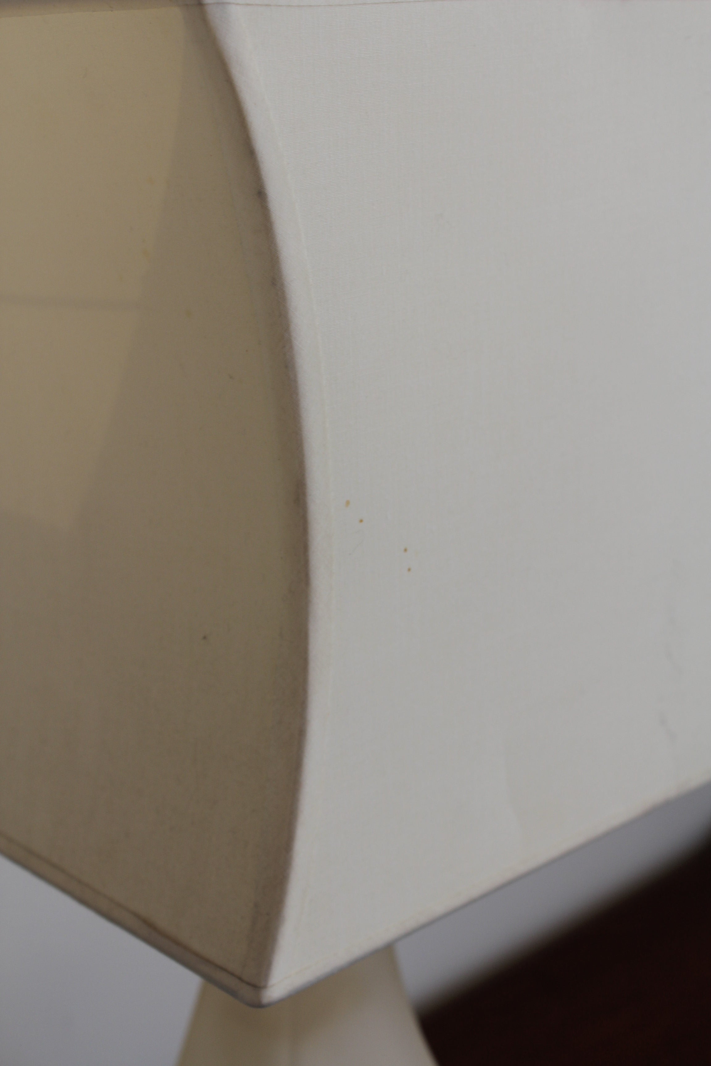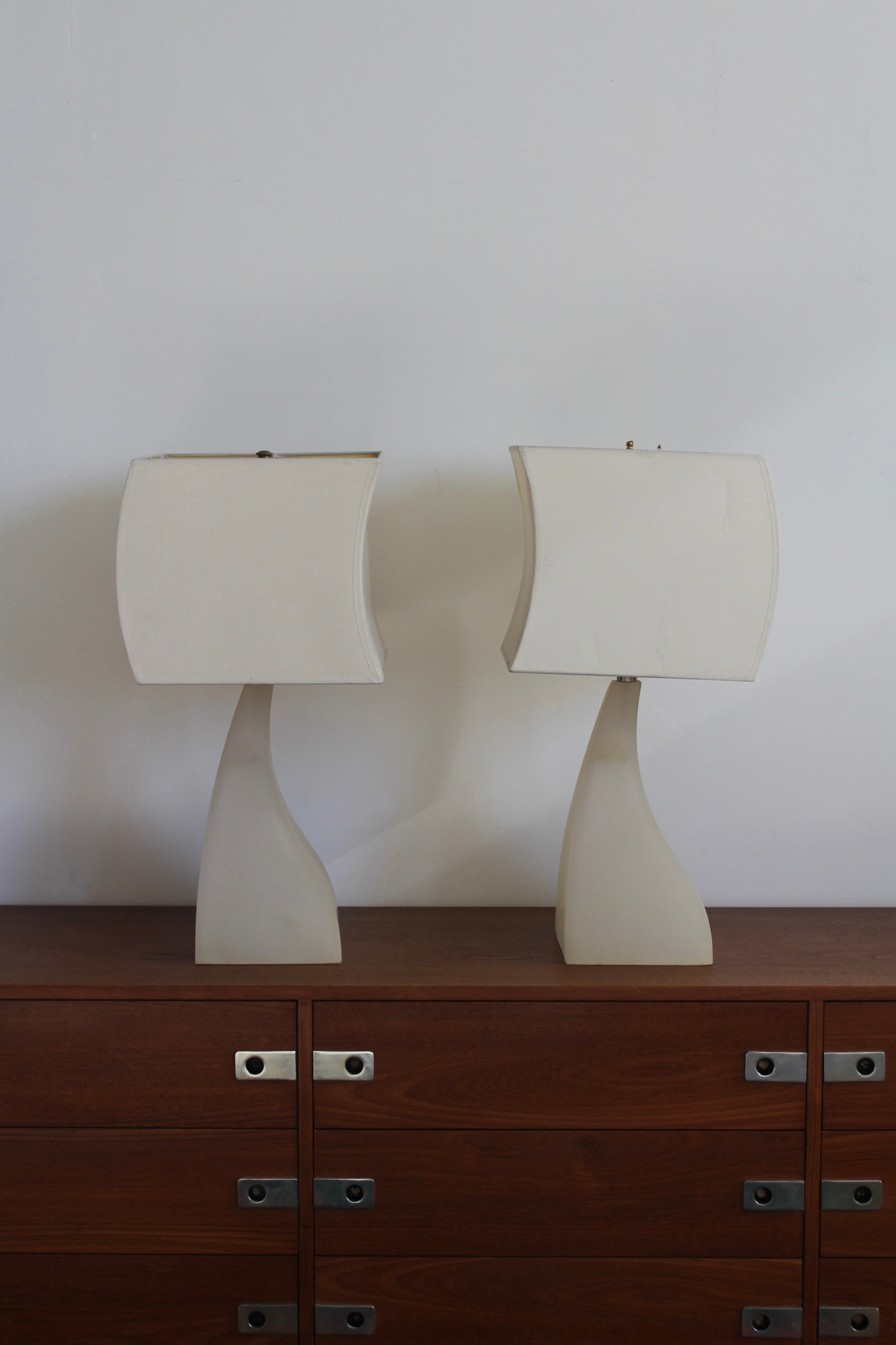 Pair of Lucite Table Lamps, 1970s. Playful organic shaped, opaque lucite base with cotton shade.