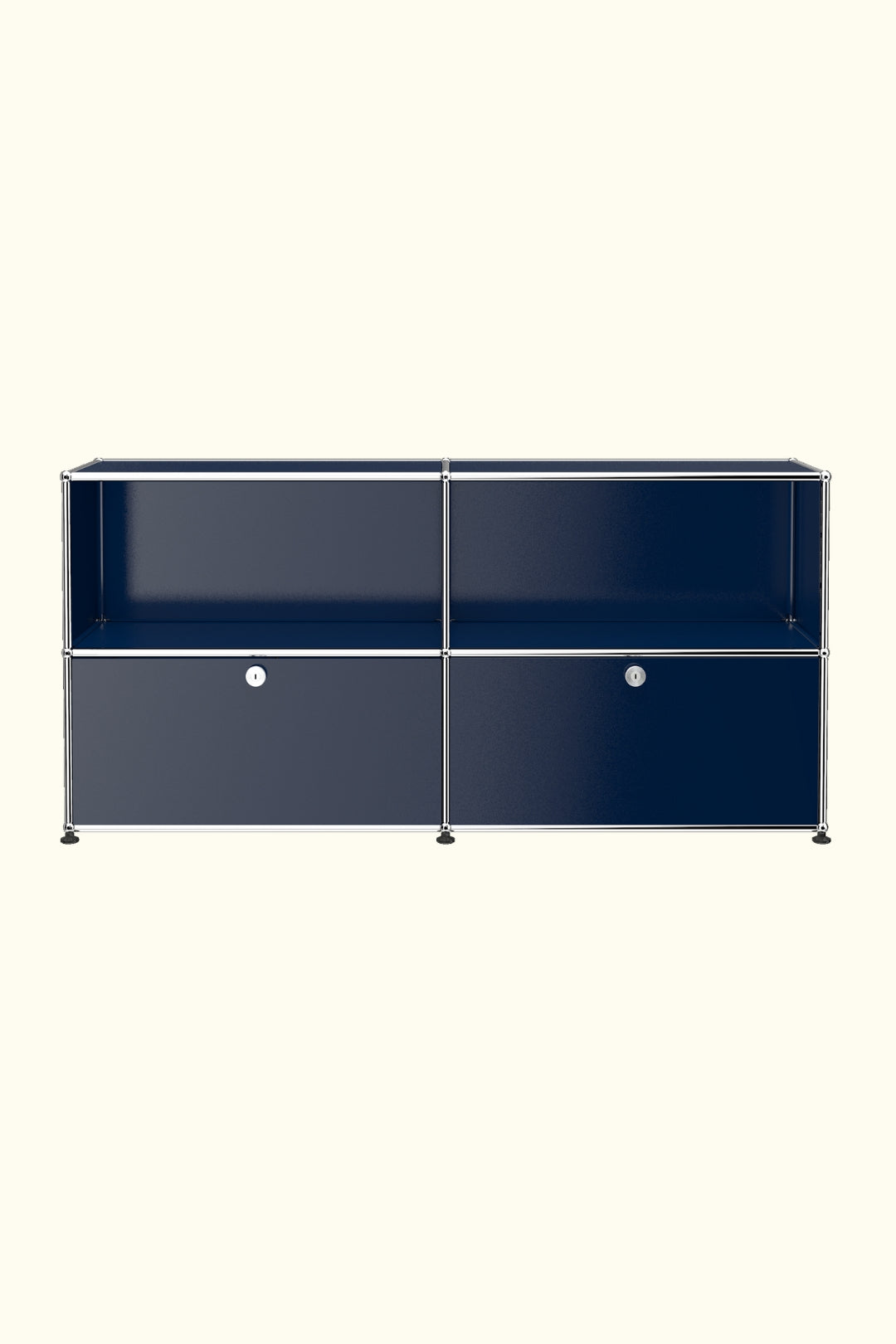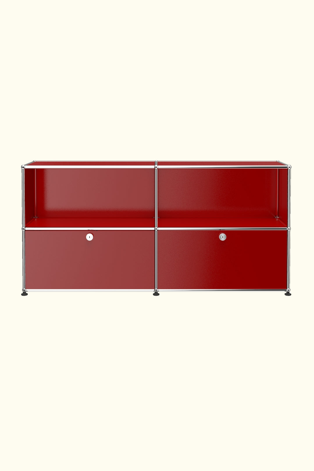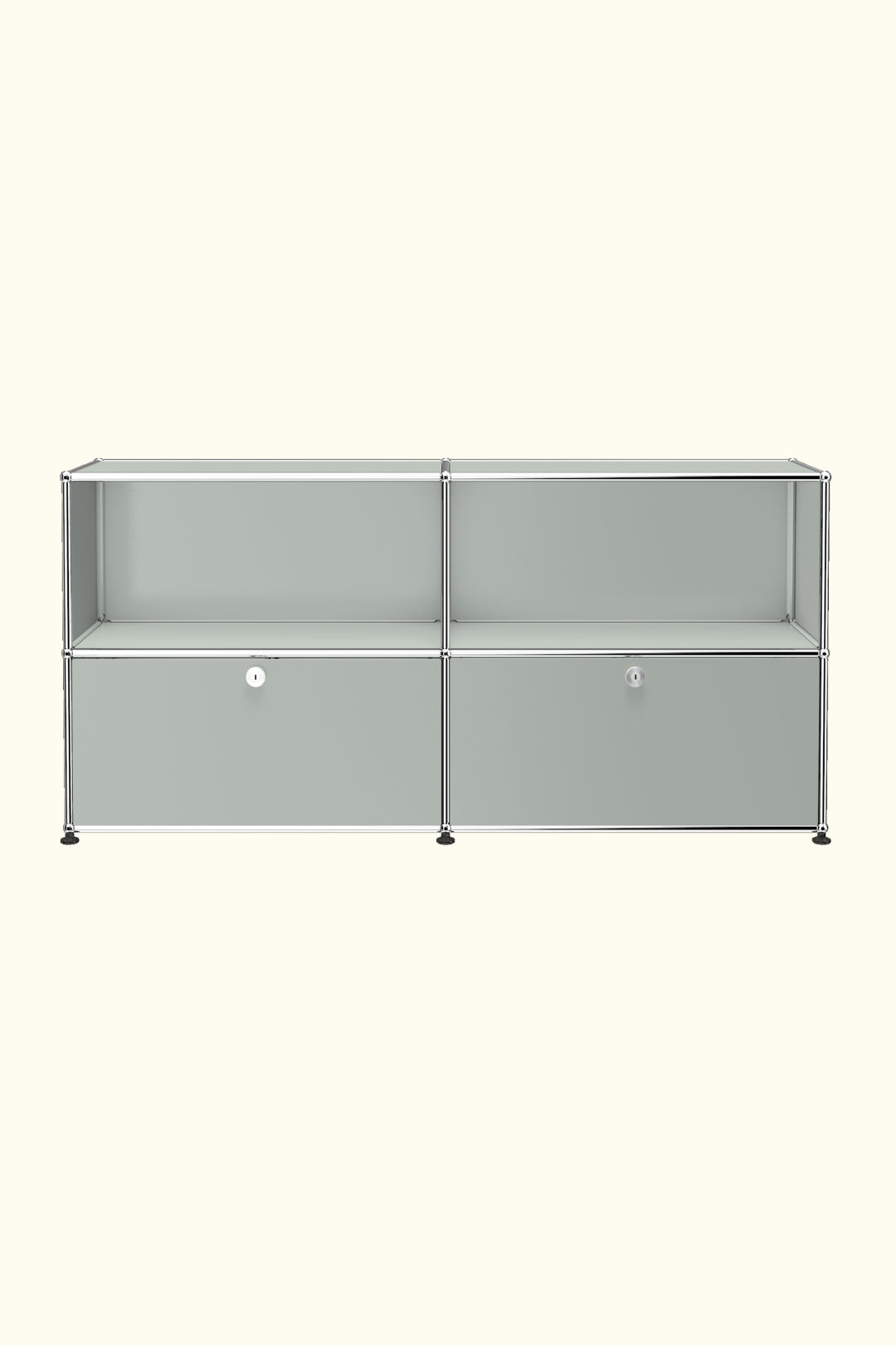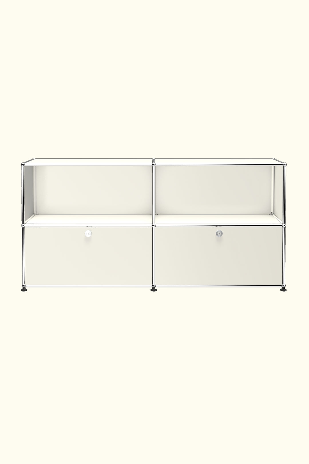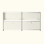 A best-selling file credenza with two open shelves (top) and two extension drawers with letter filing (bottom). The drawers lock with the twist of a coin. The USM Haller system is made of powder-coated steel panels and chromed steel frame. GREENGUARD and Cradle to Cradle Certified®.