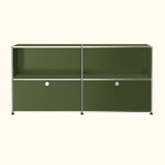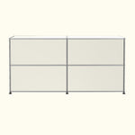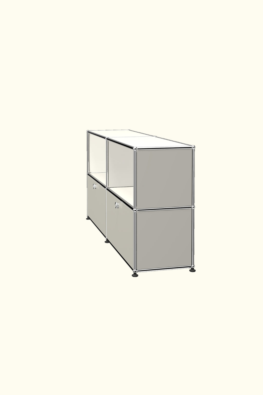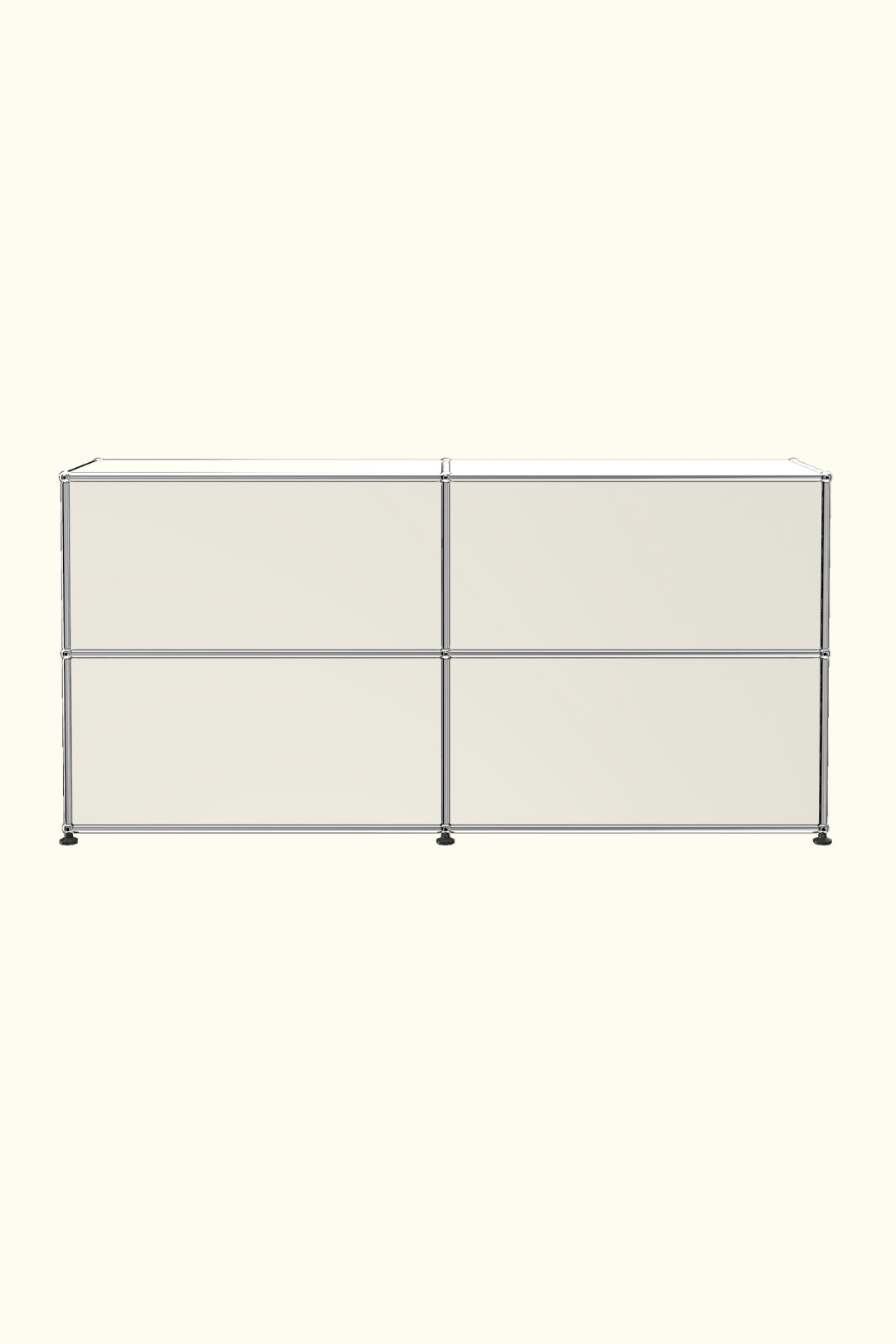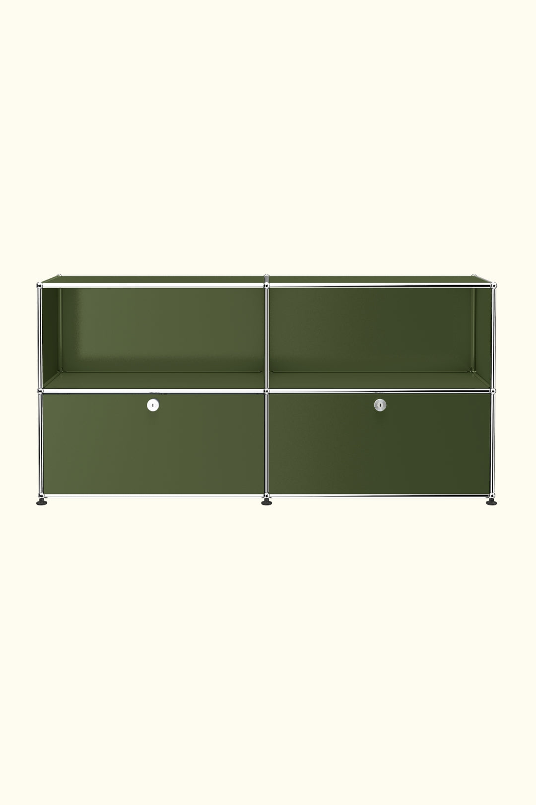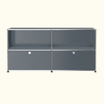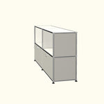 A best-selling file credenza with two open shelves (top) and two extension drawers with letter filing (bottom). The drawers lock with the twist of a coin. The USM Haller system is made of powder-coated steel panels and chromed steel frame. GREENGUARD and Cradle to Cradle Certified®.