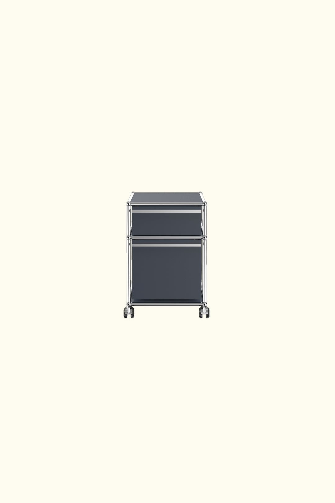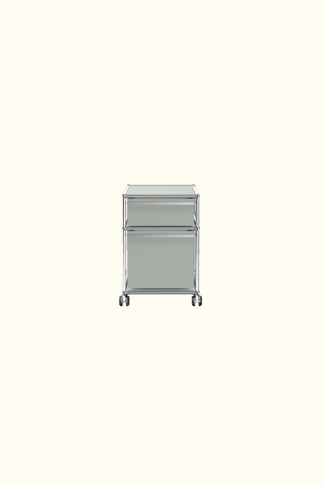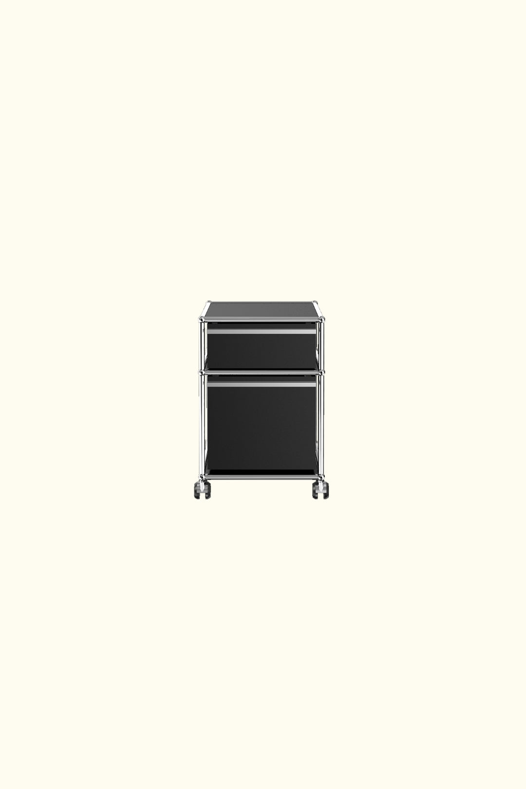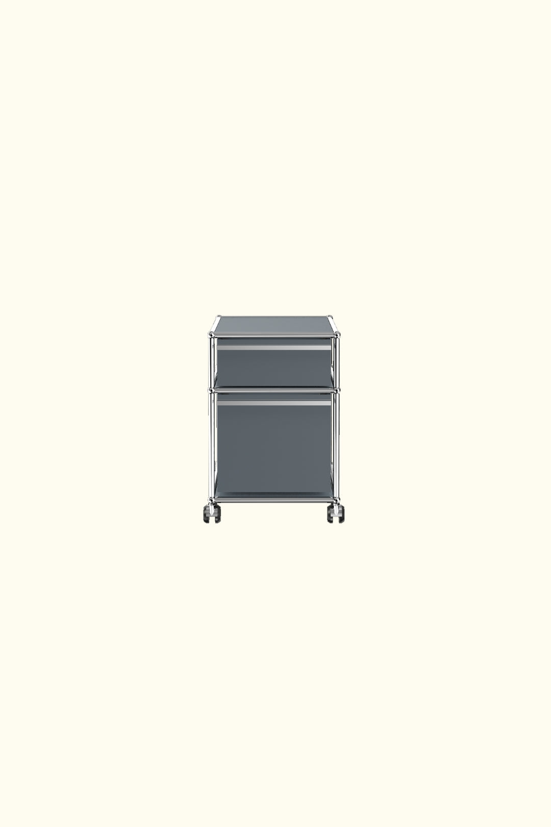 Mobile file pedestal with one 6" drawer and one 14" letter filing drawer and casters. Slides easily under a desk to tuck away. The USM Haller system is made of powder-coated steel panels and chromed steel frame. GREENGUARD and Cradle to Cradle Certified®.