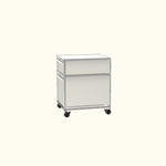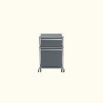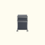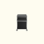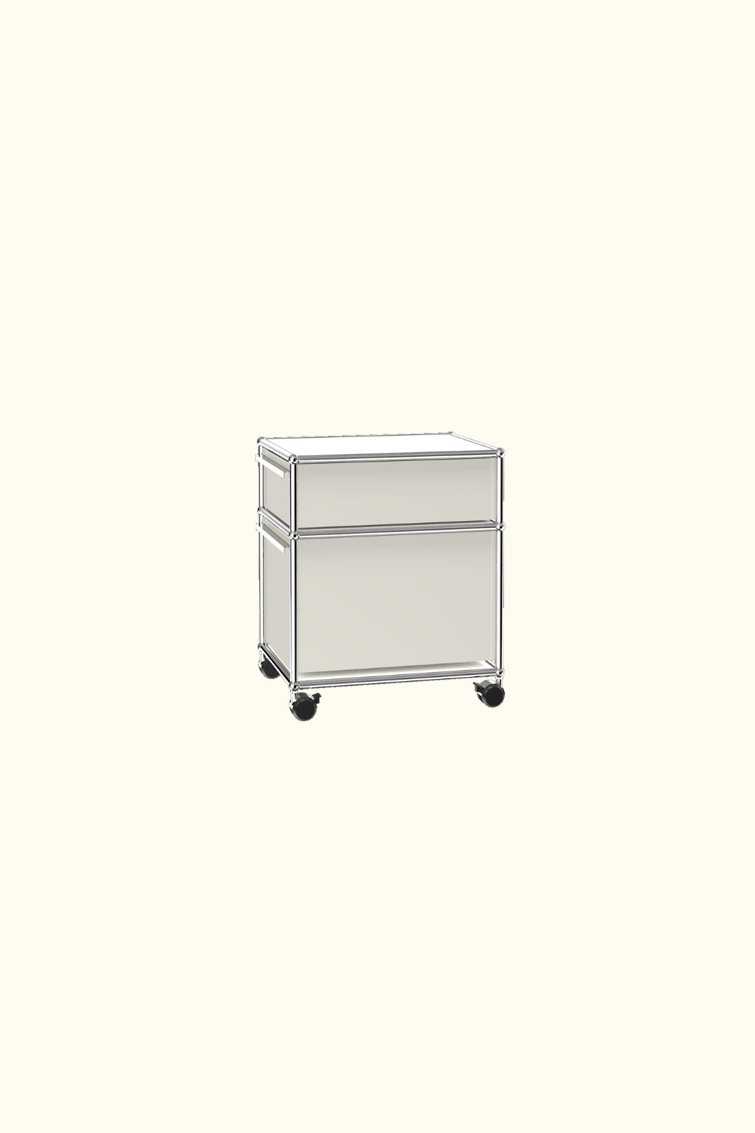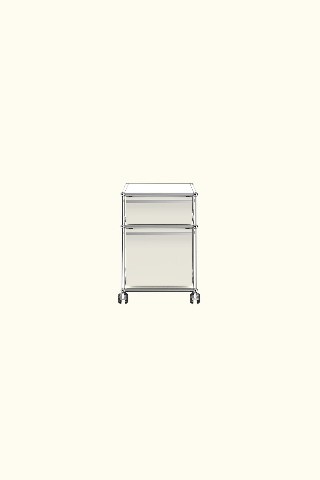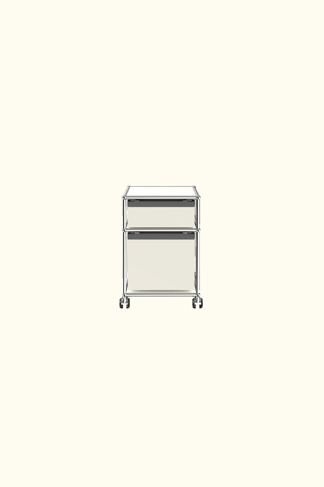 Mobile file pedestal with one 6" drawer and one 14" letter filing drawer and casters. Slides easily under a desk to tuck away. The USM Haller system is made of powder-coated steel panels and chromed steel frame. GREENGUARD and Cradle to Cradle Certified®.