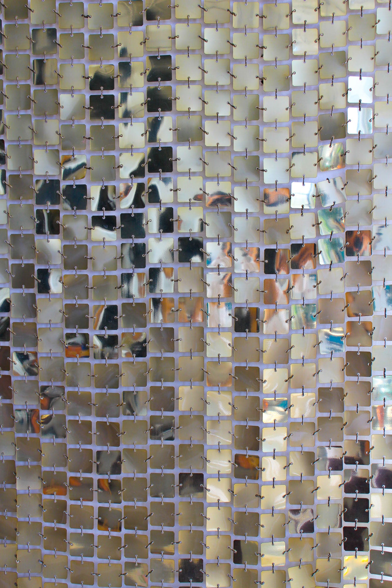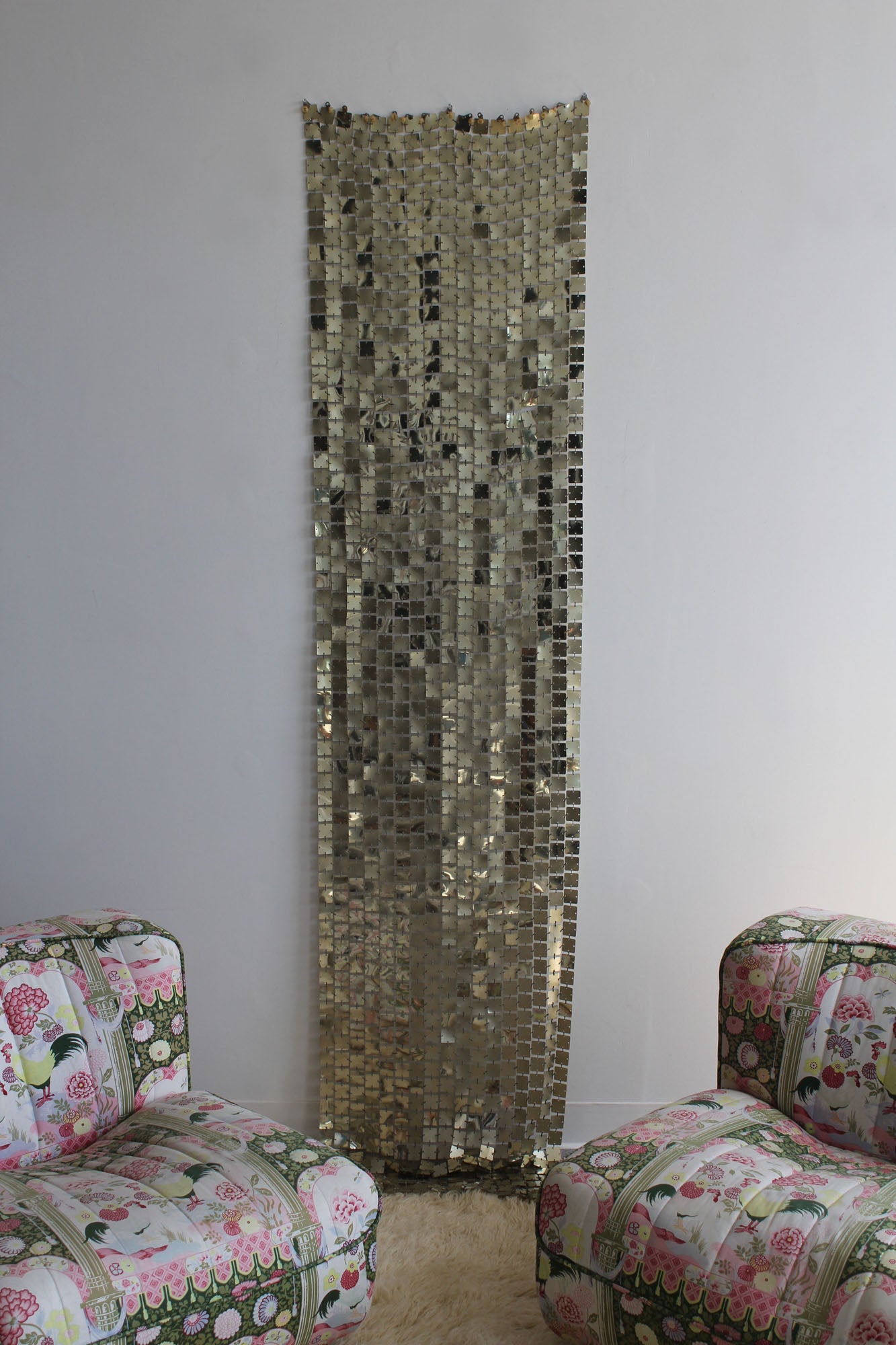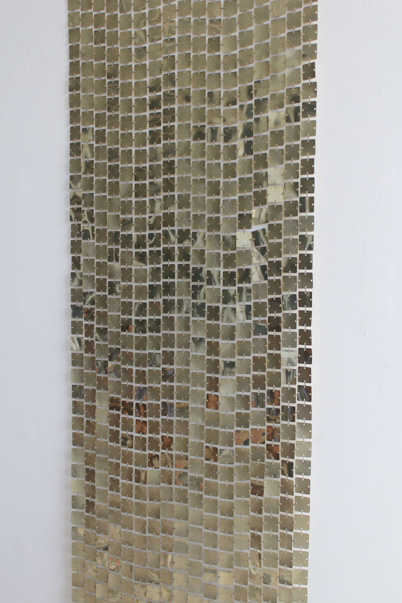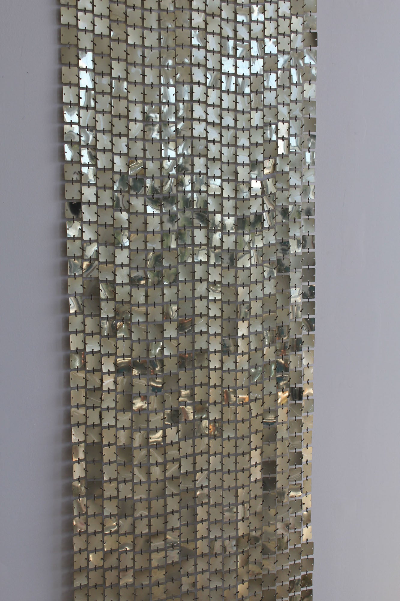 Space Curtain by Paco Rabanne for Software/Baumann AG of Switzerland., 1970s. Made of 1 inch polished aluminium light gold colored discs with plastic connectors. This curtain can be displayed on a wall or as a room divider. The plastic connectors allow the curtain to be adjusted in size and shape.