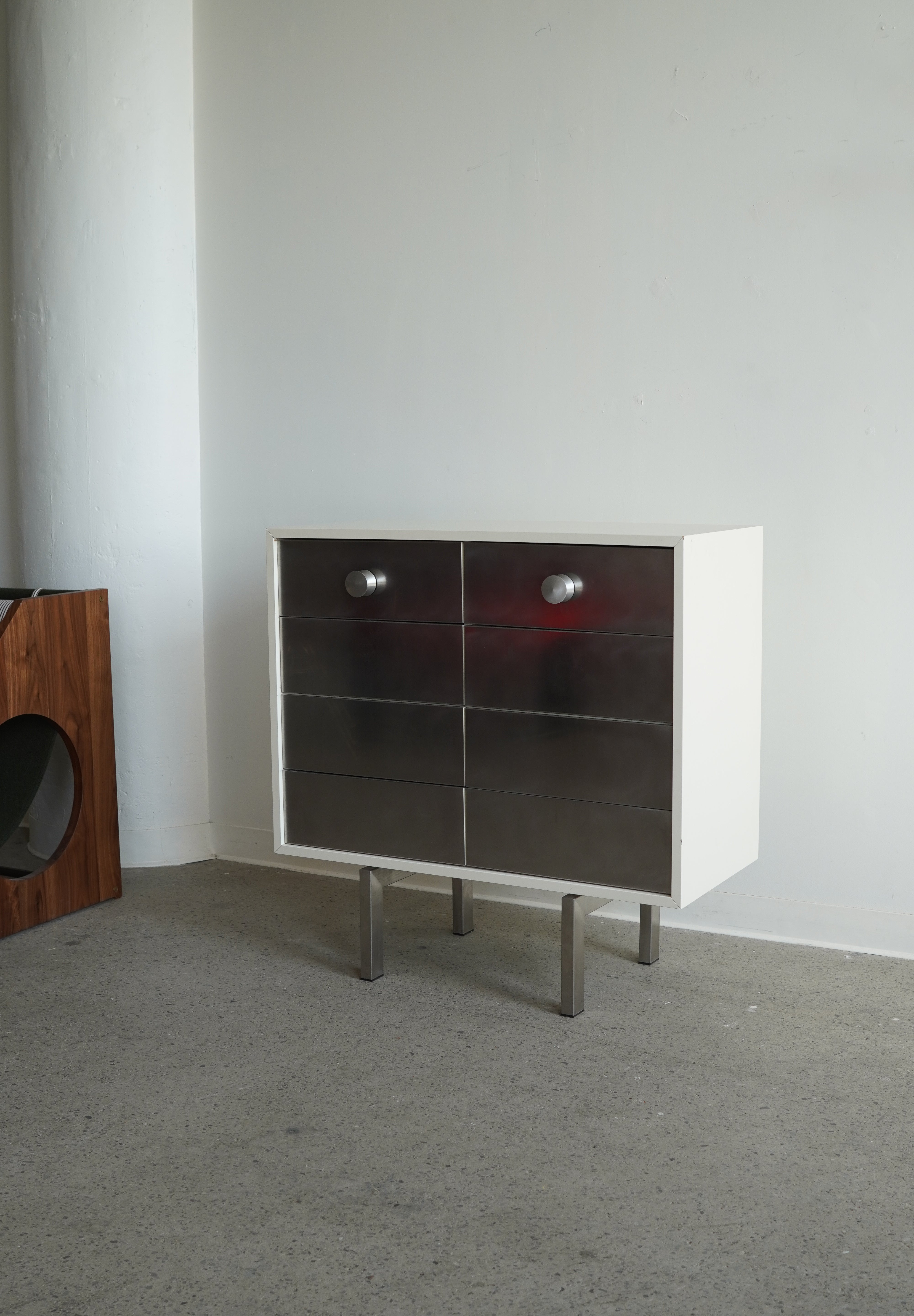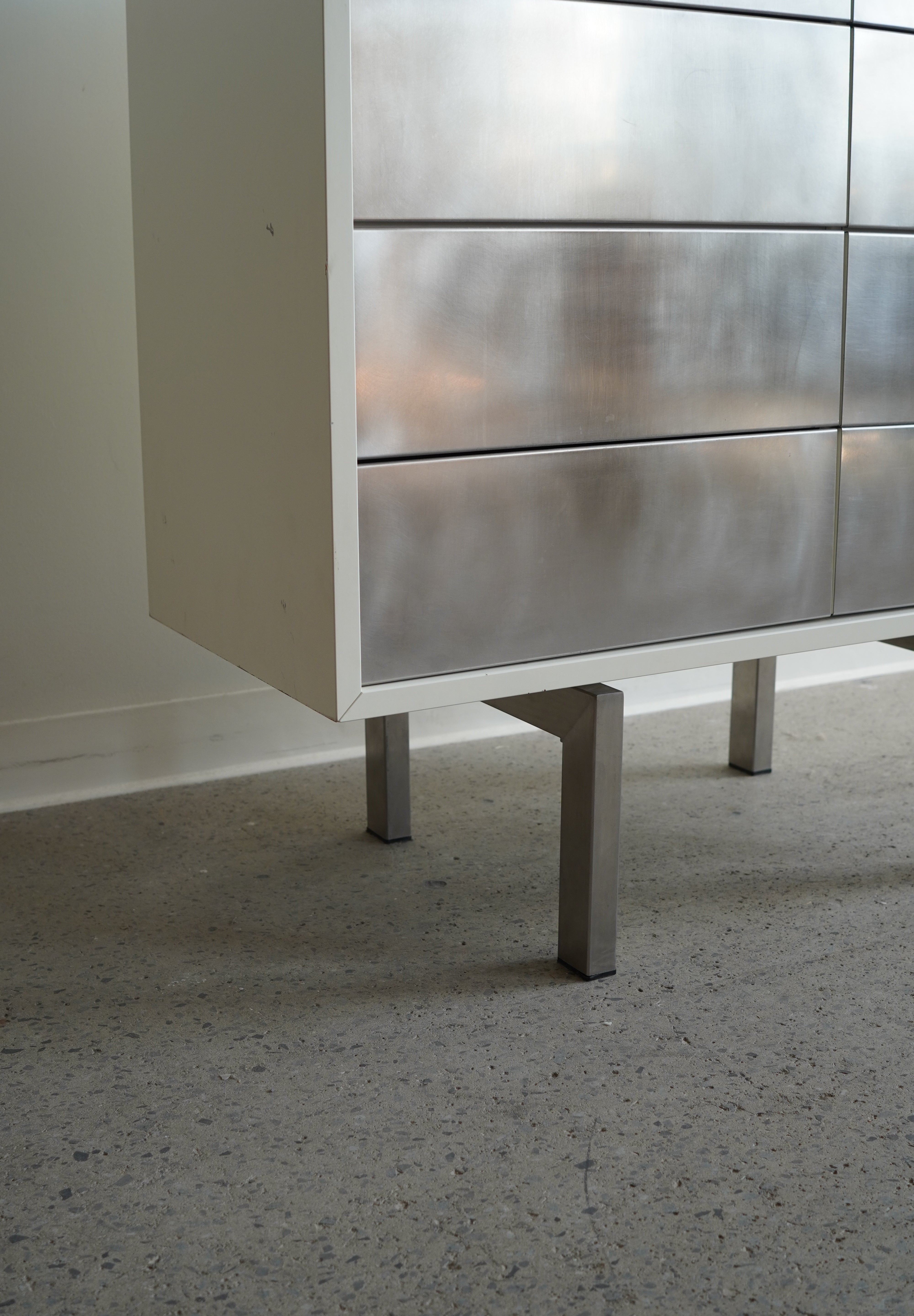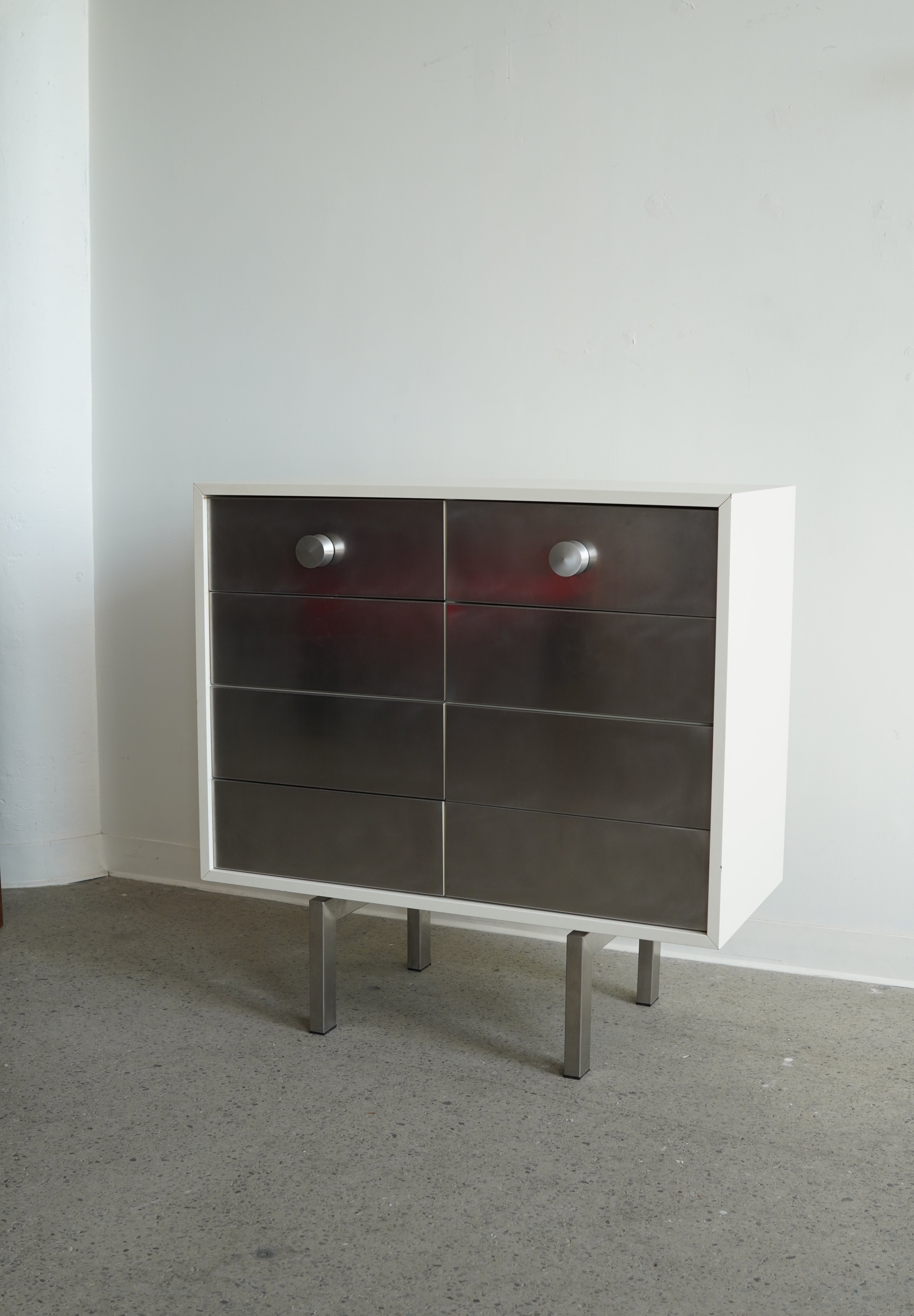 Magnetic Dresser by Pallucco, made in Italy. White lacquered wood frame featuring 8 drawers covered in satin-finished stainless steel and aluminum feet. Two magnetic mobile handles allow the handles to be moved around to the desired drawer to be opened and closed.