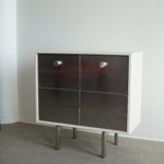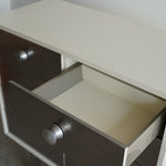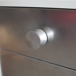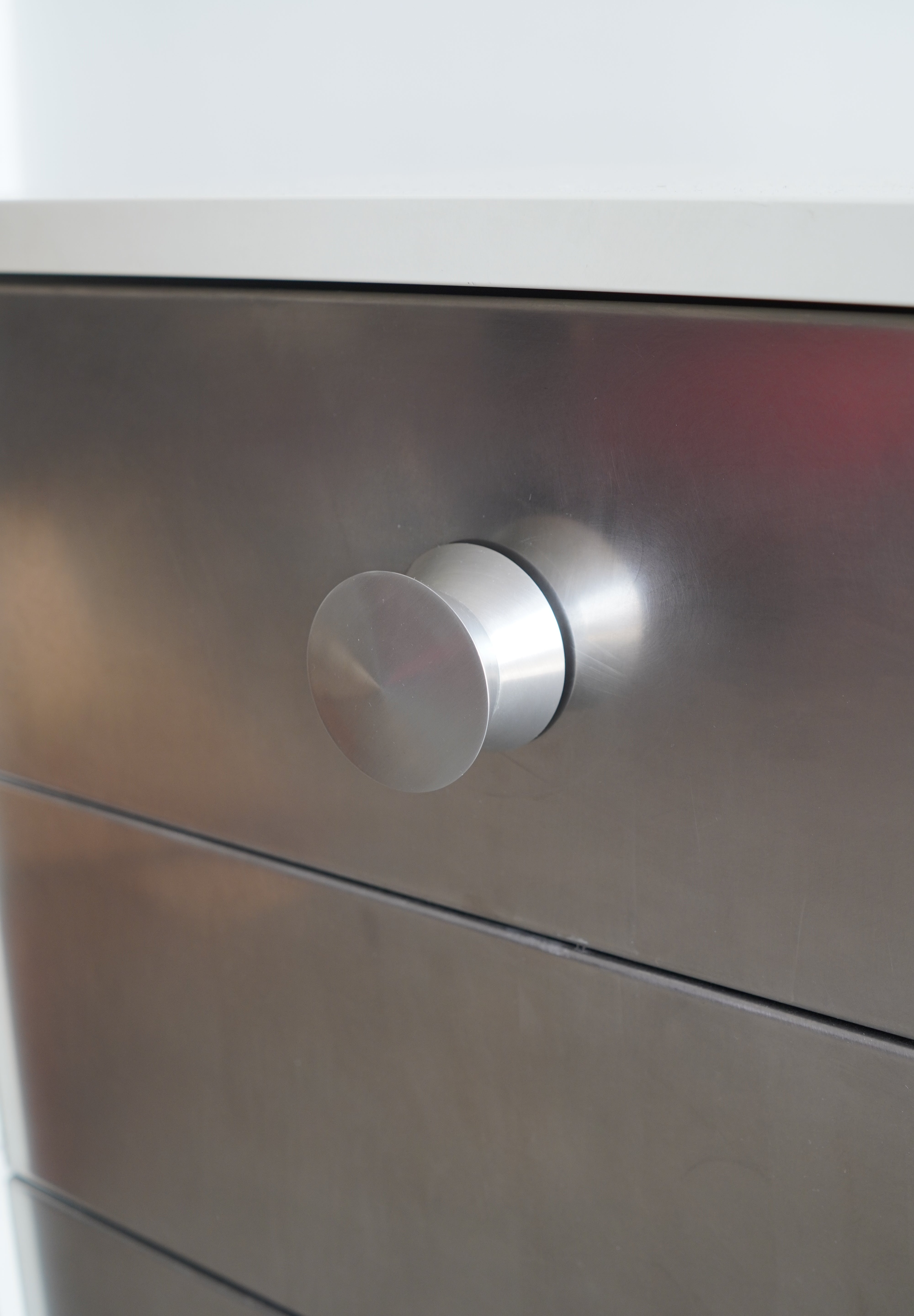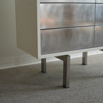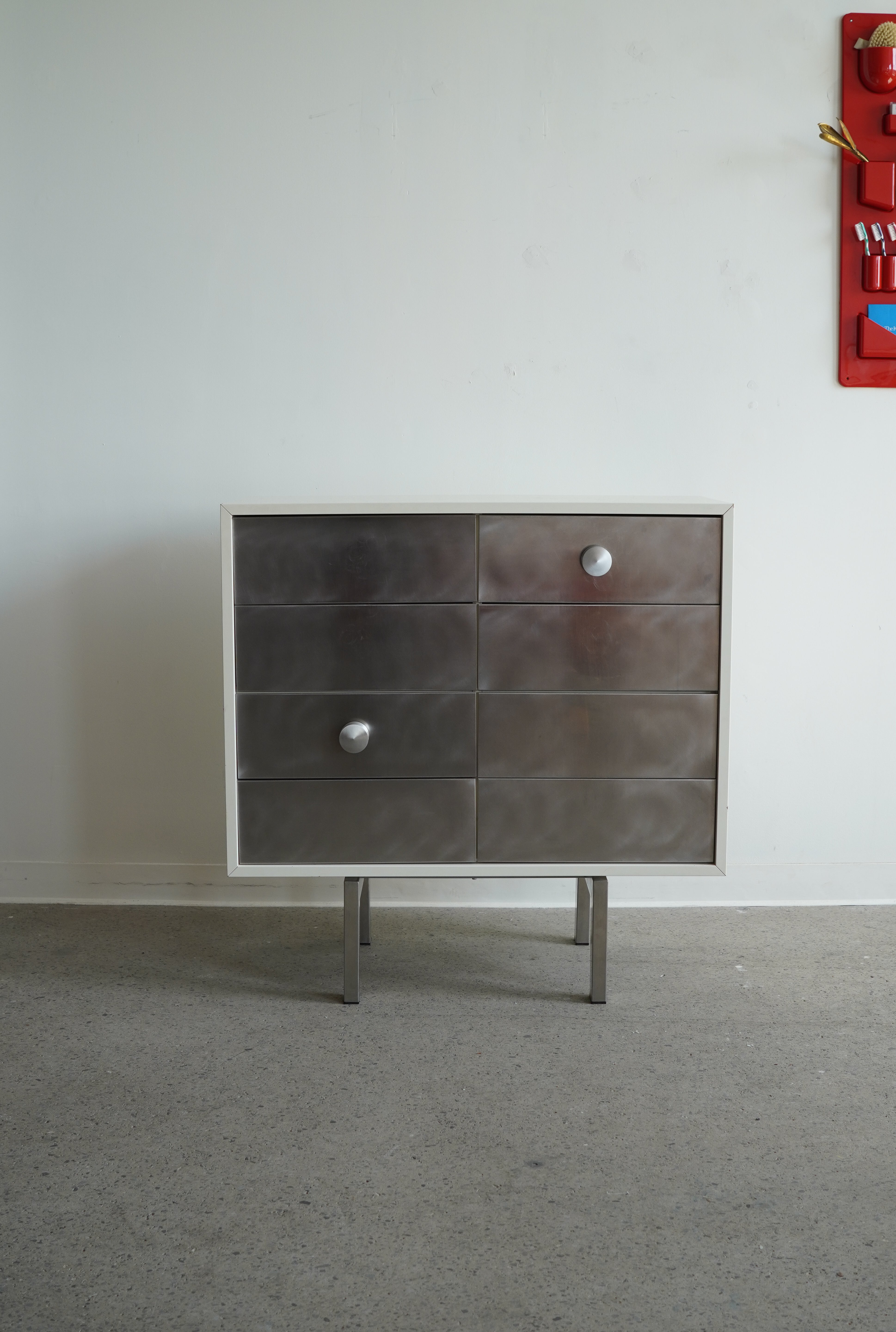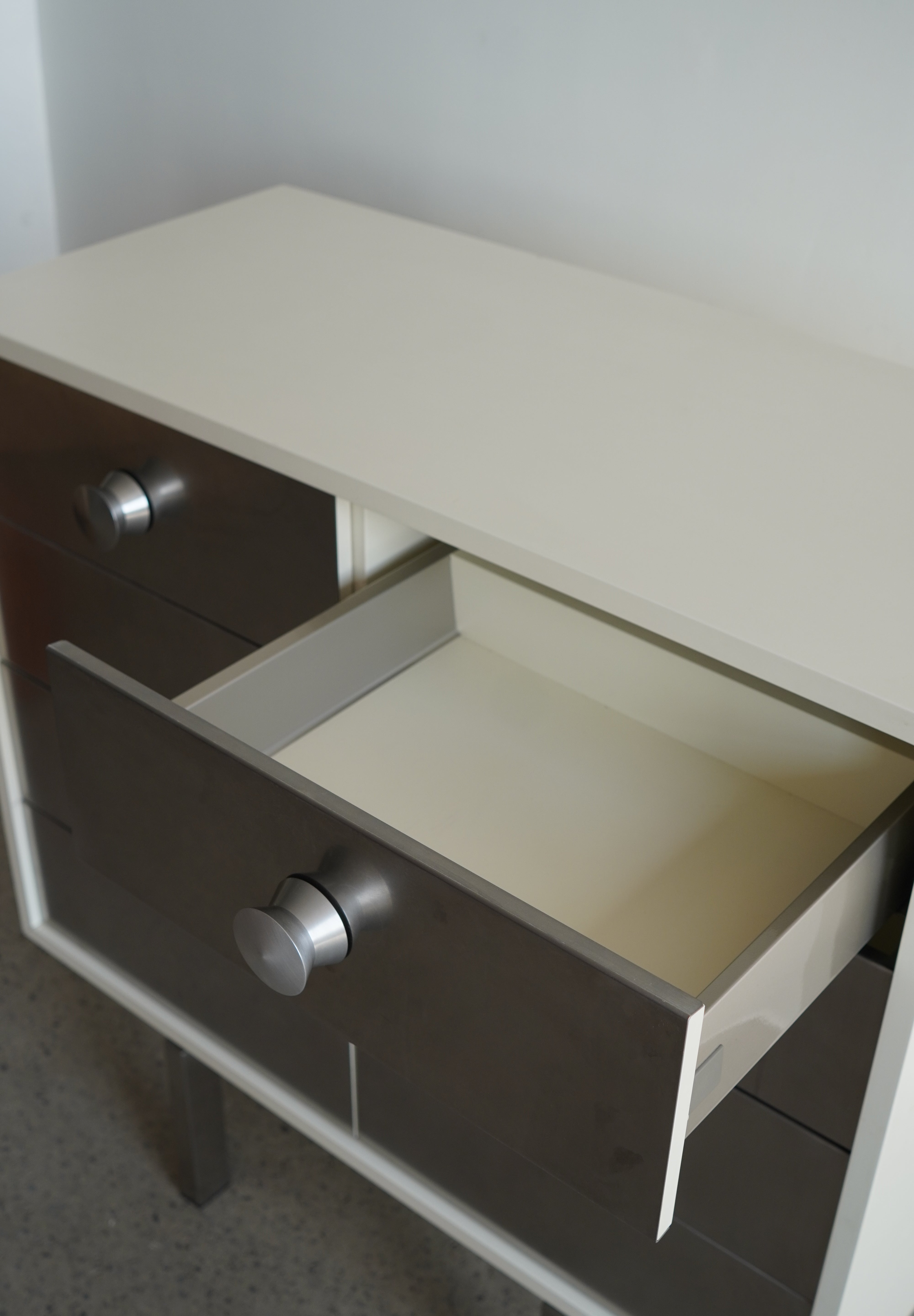 Magnetic Dresser by Pallucco, made in Italy. White lacquered wood frame featuring 8 drawers covered in satin-finished stainless steel and aluminum feet. Two magnetic mobile handles allow the handles to be moved around to the desired drawer to be opened and closed.