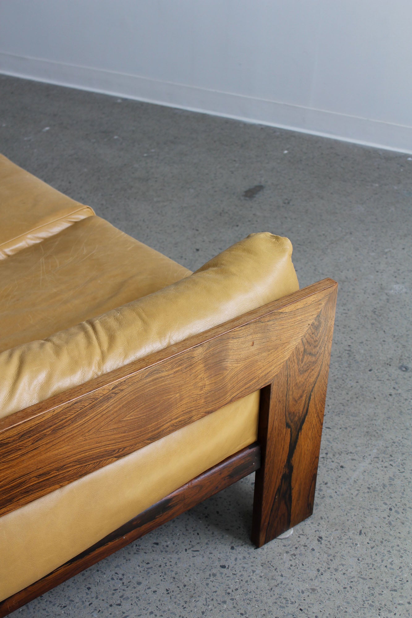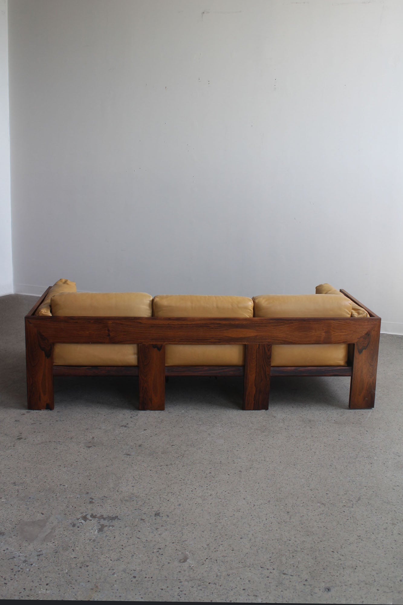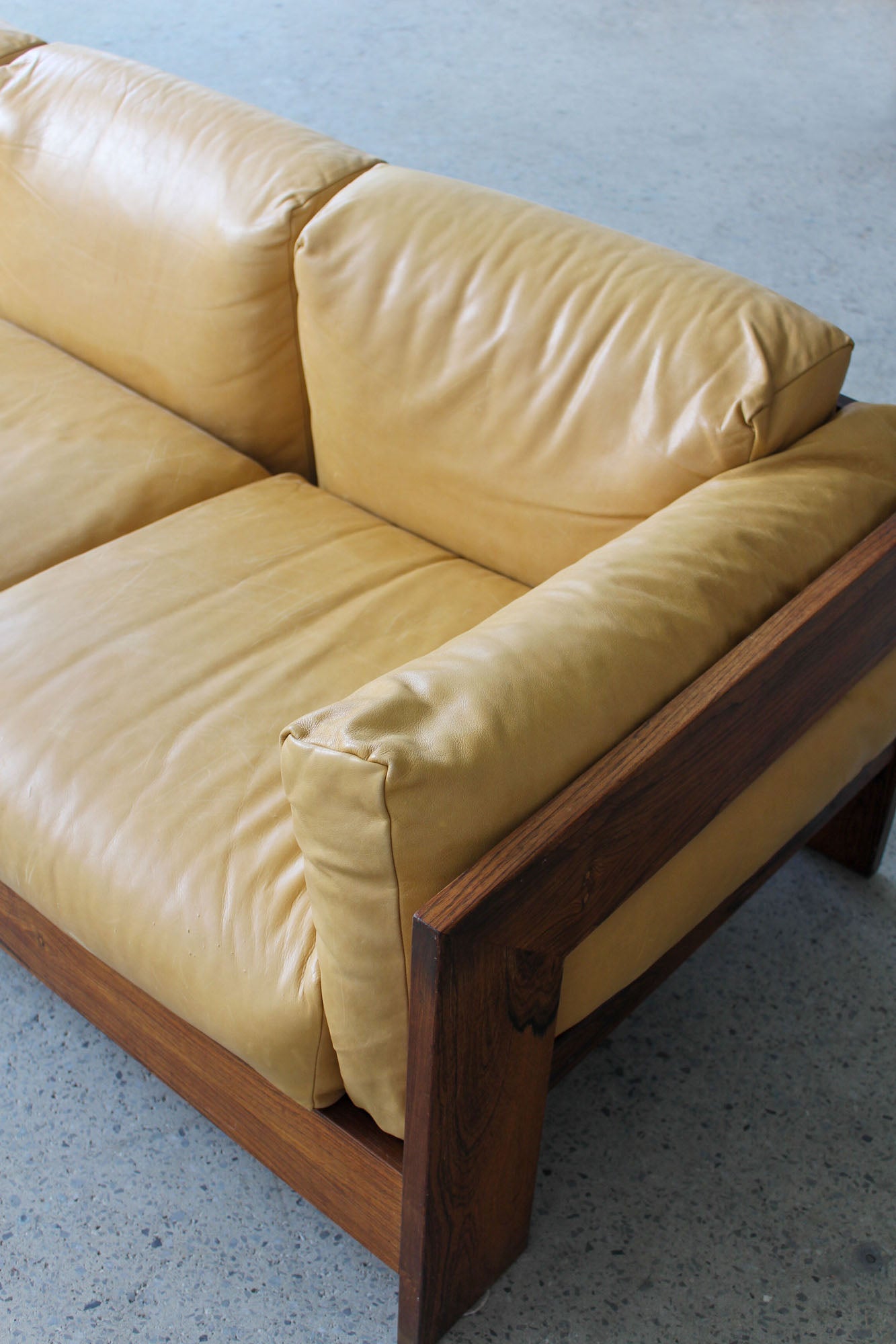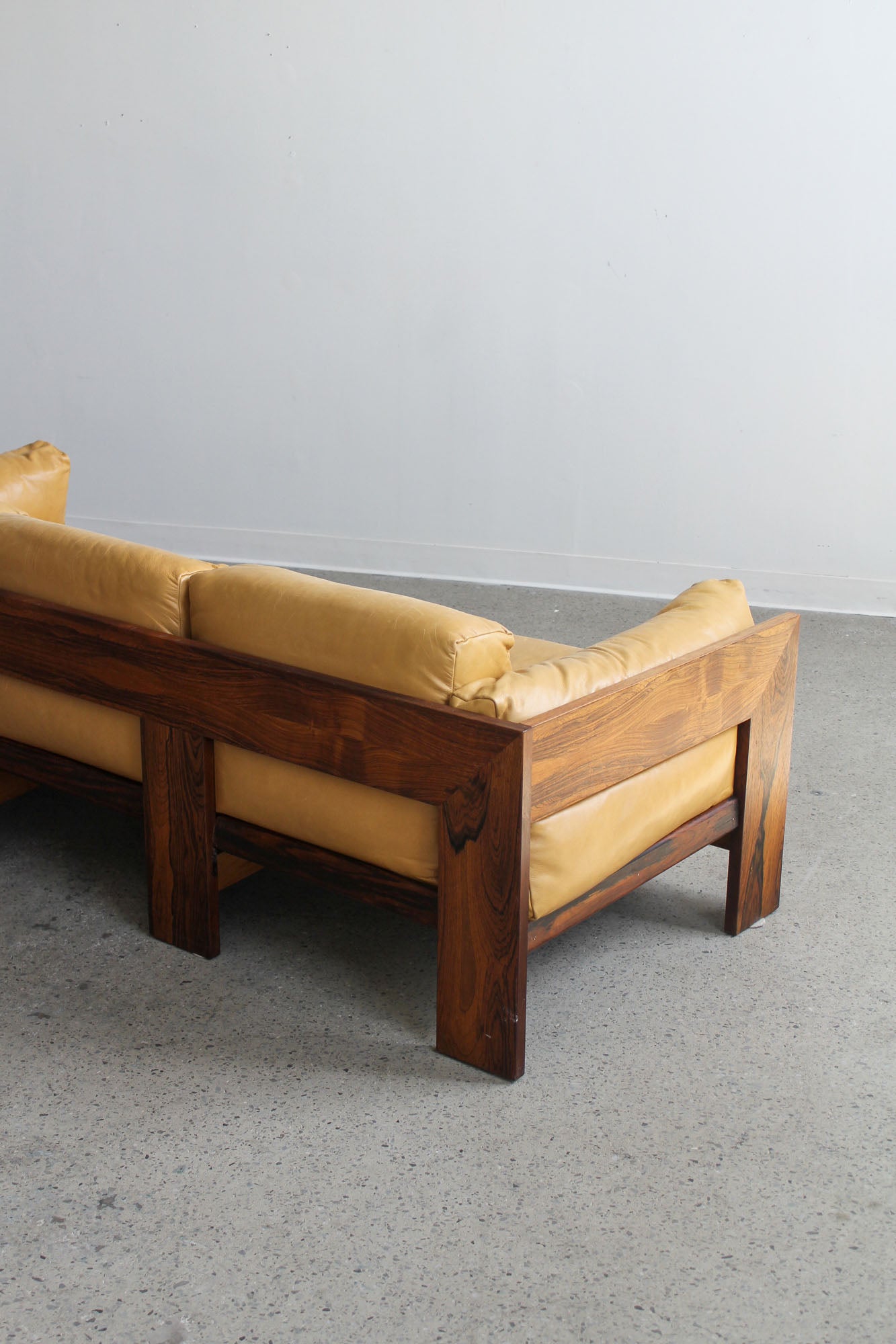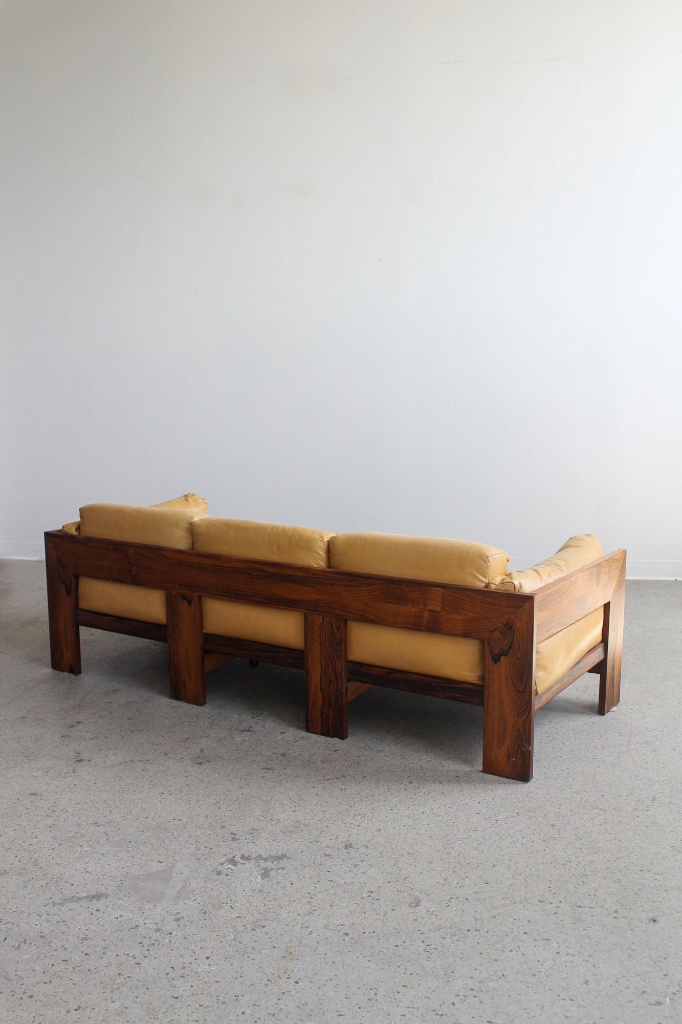 Rosewood and Leather 3-seater Sofa, 1970s. In the manner of Tobia Scarpa - rosewood frame and soft, thick butterscotch colored leather.