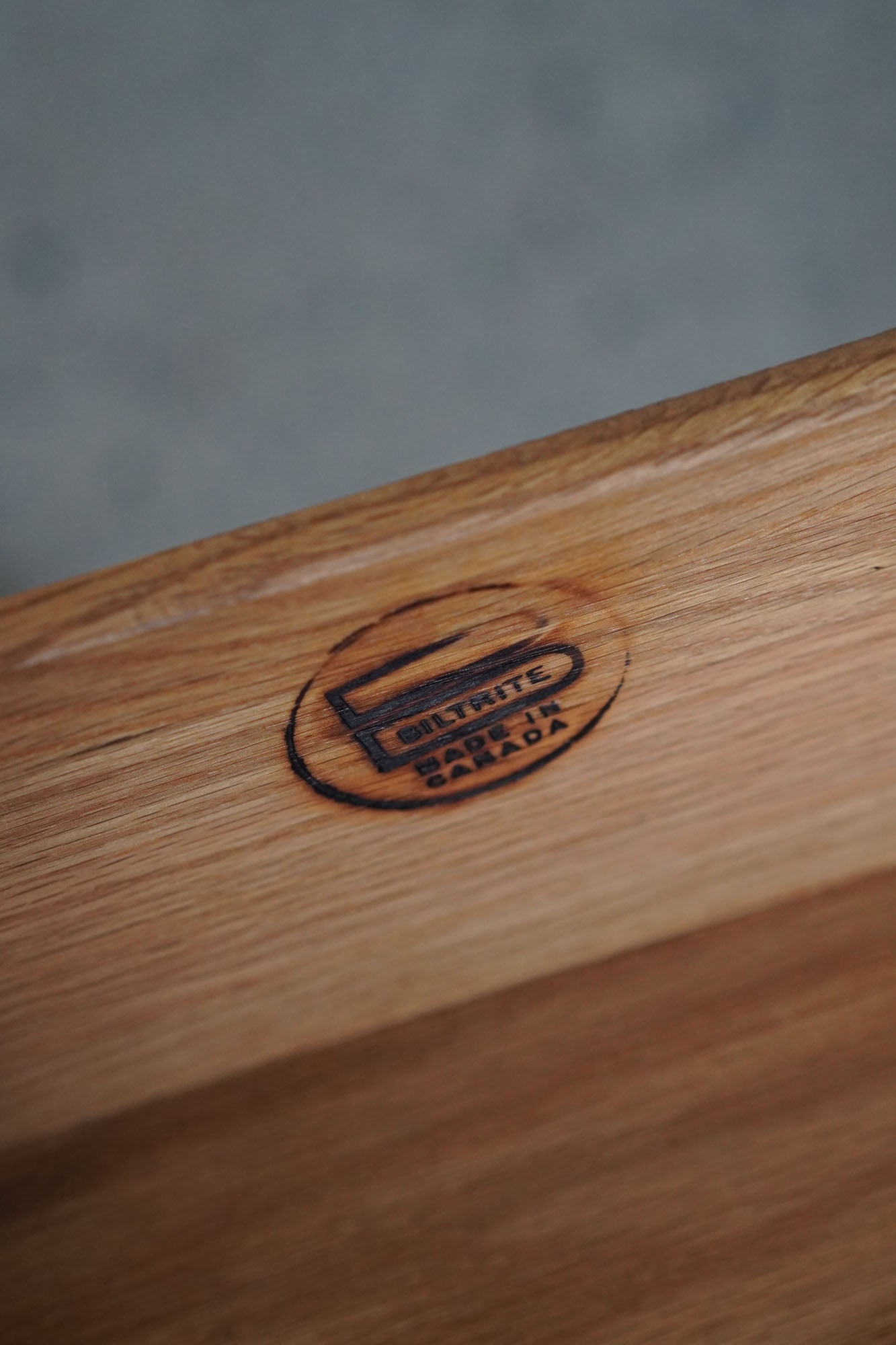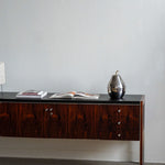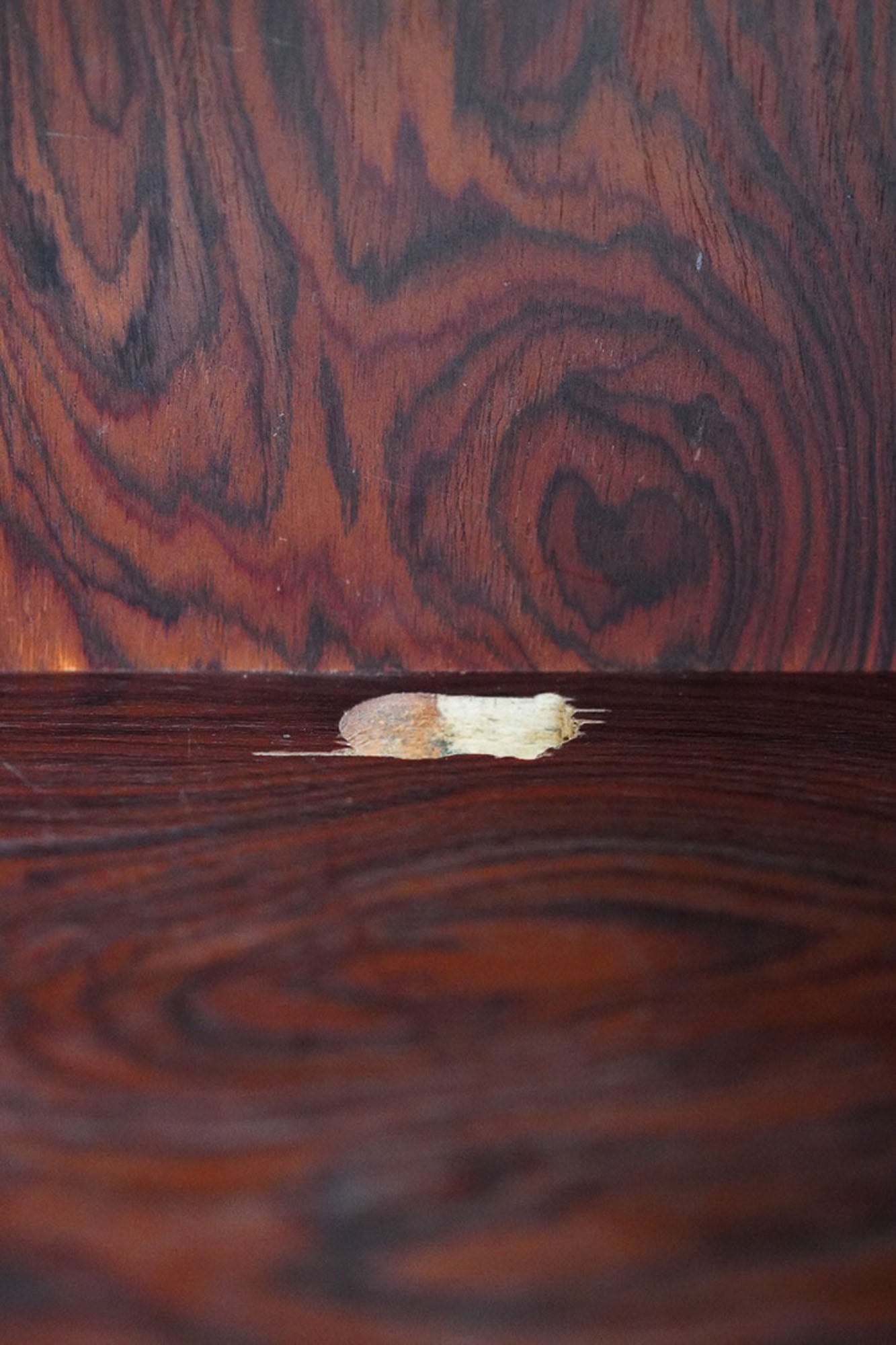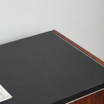In good vintage condition, wear throughout consistent with age. There is a circular cutout made by the previous owner on the inside back of the center storage cabinet for electrical cords.
