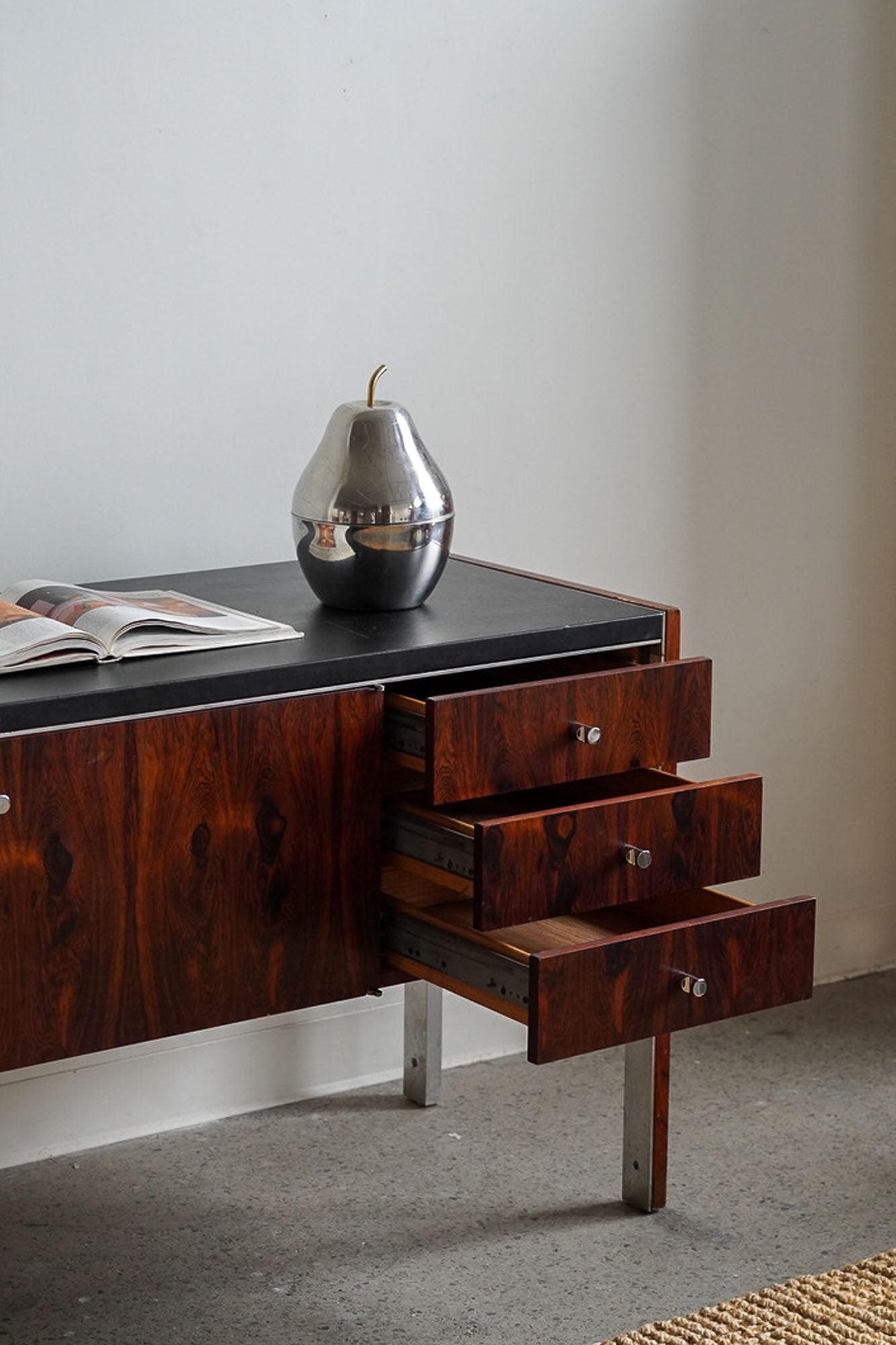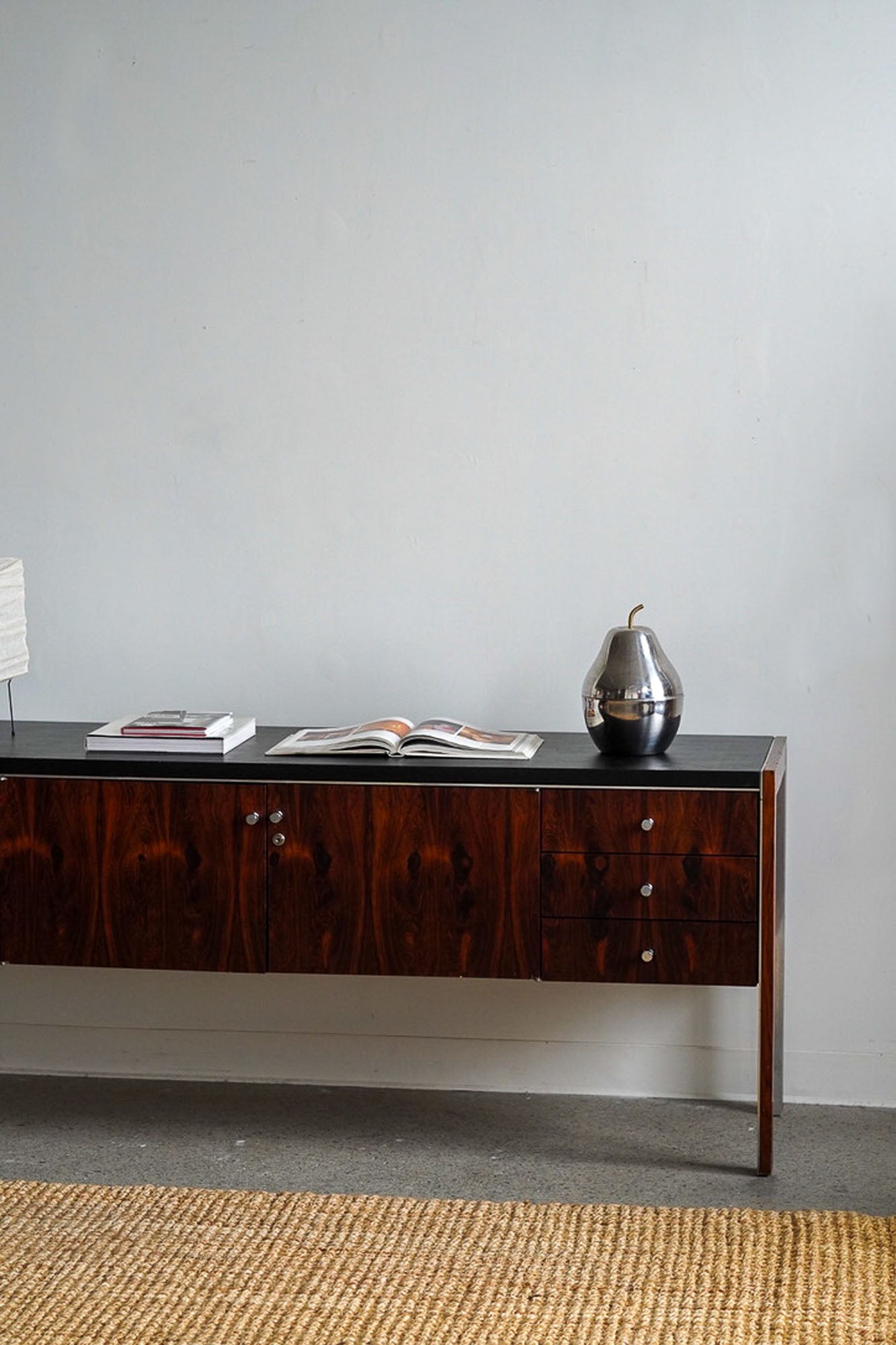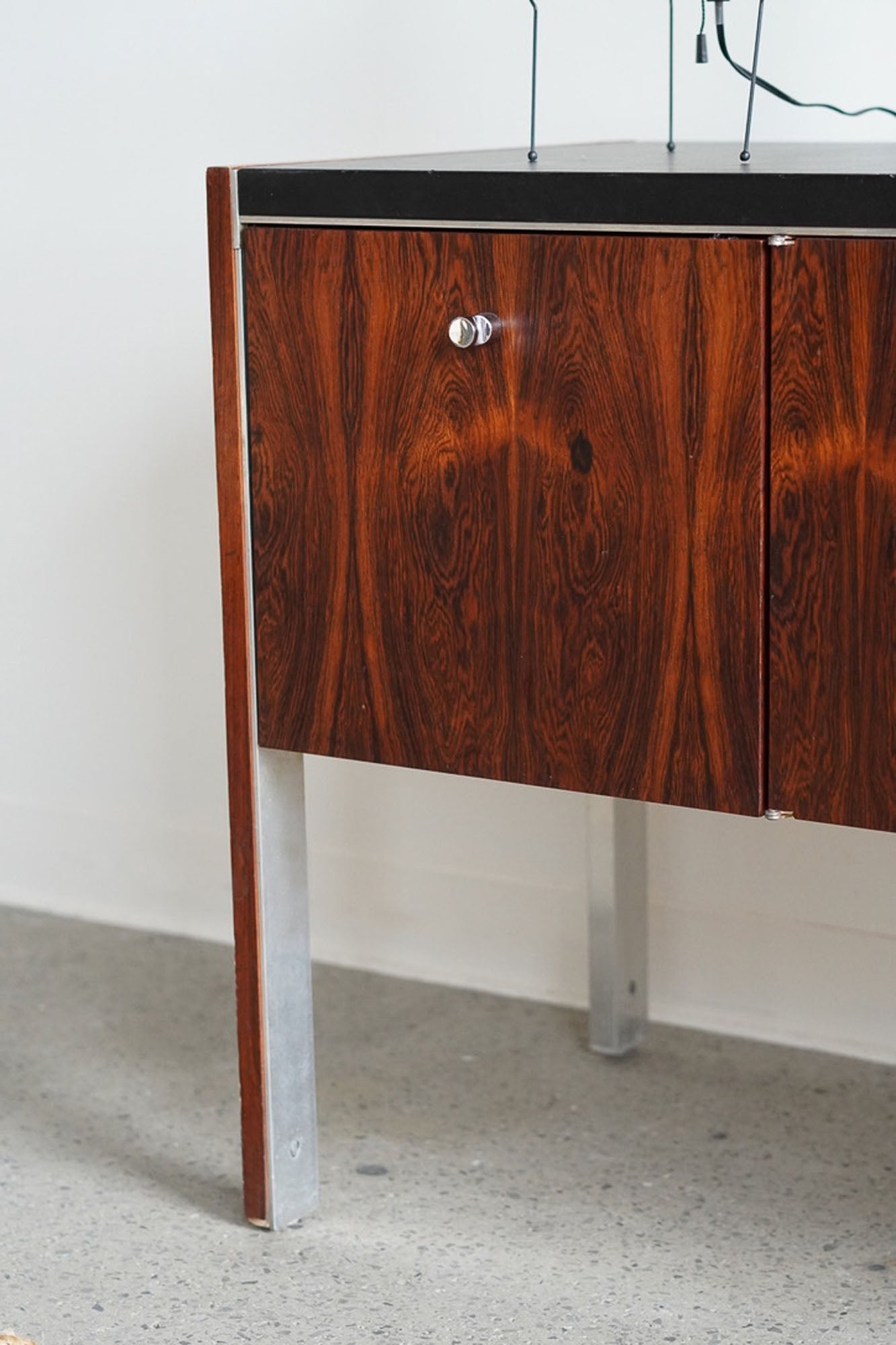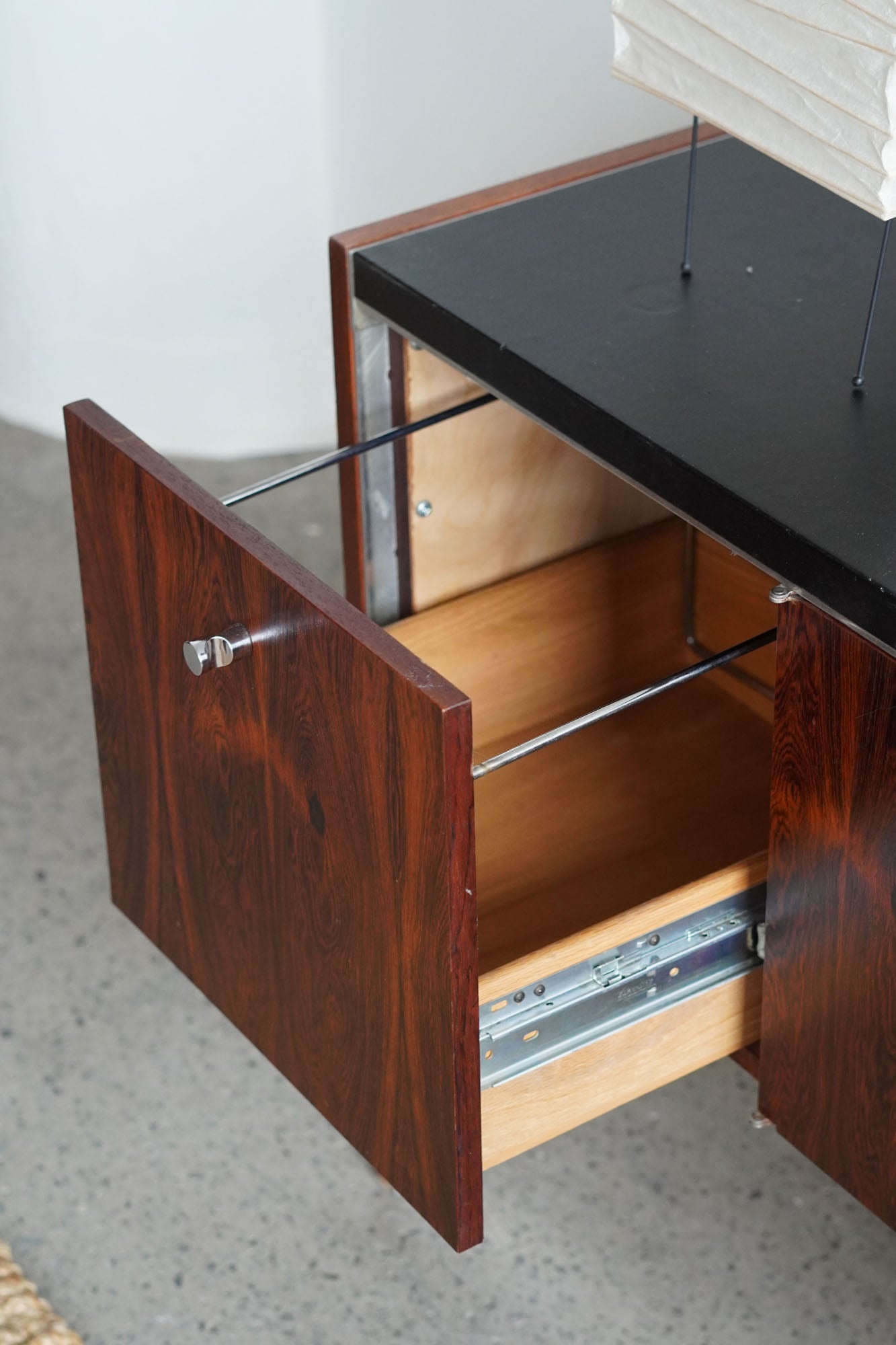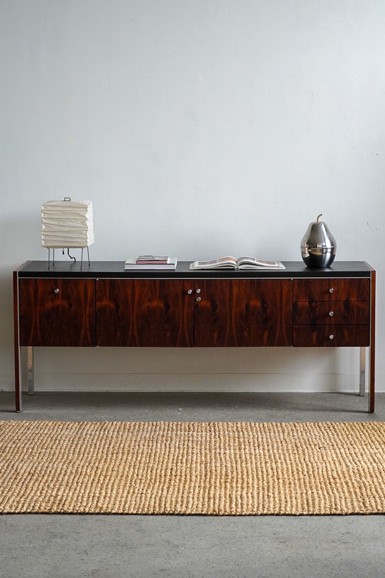 Rosewood Credenza by Herman Miller for Bilrite, made in Canada, 1970s. Brazilian rosewood exterior panels and back, thick leather top and chrome accents.