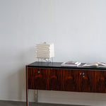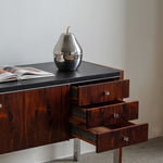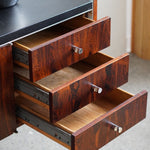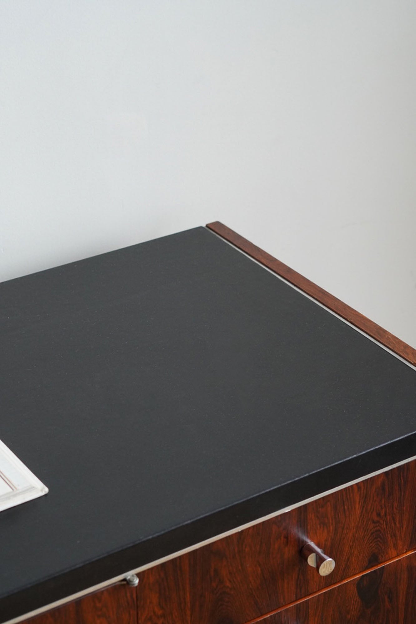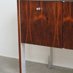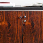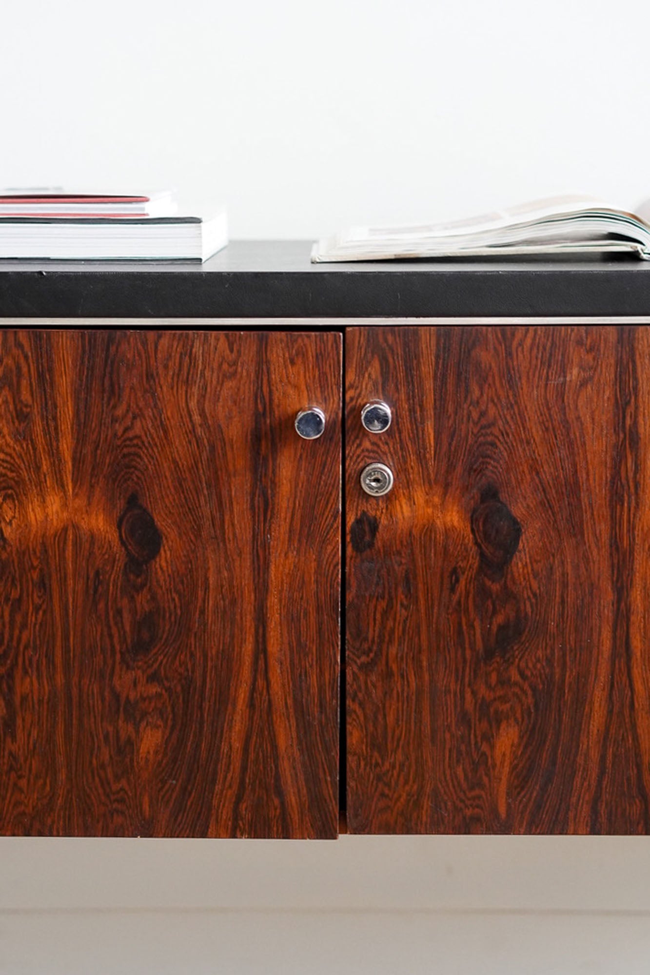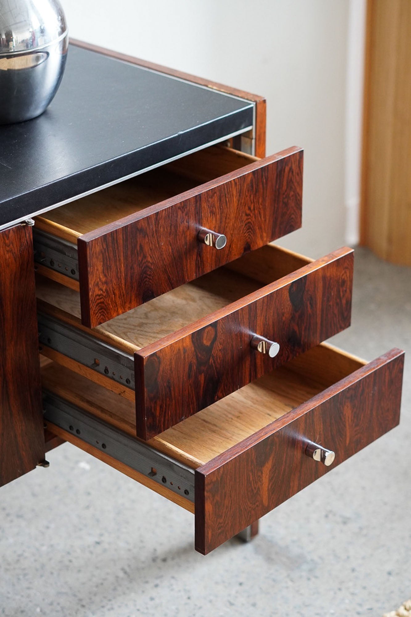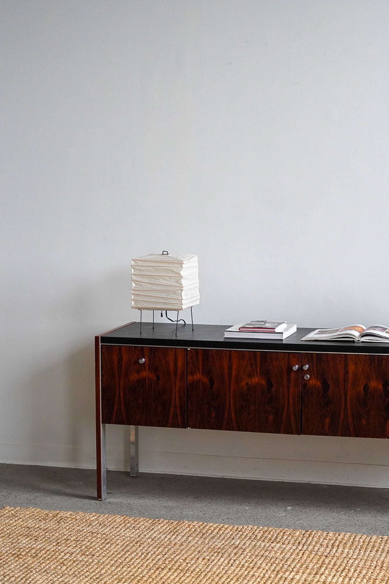 Rosewood Credenza by Herman Miller for Bilrite, made in Canada, 1970s. Brazilian rosewood exterior panels and back, thick leather top and chrome accents.
