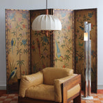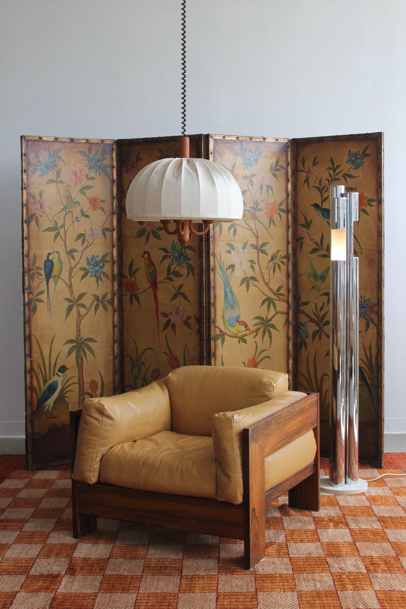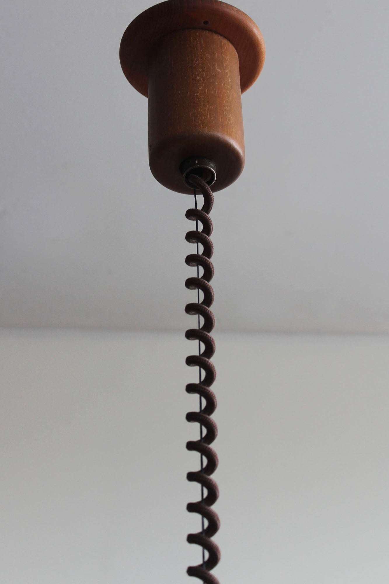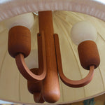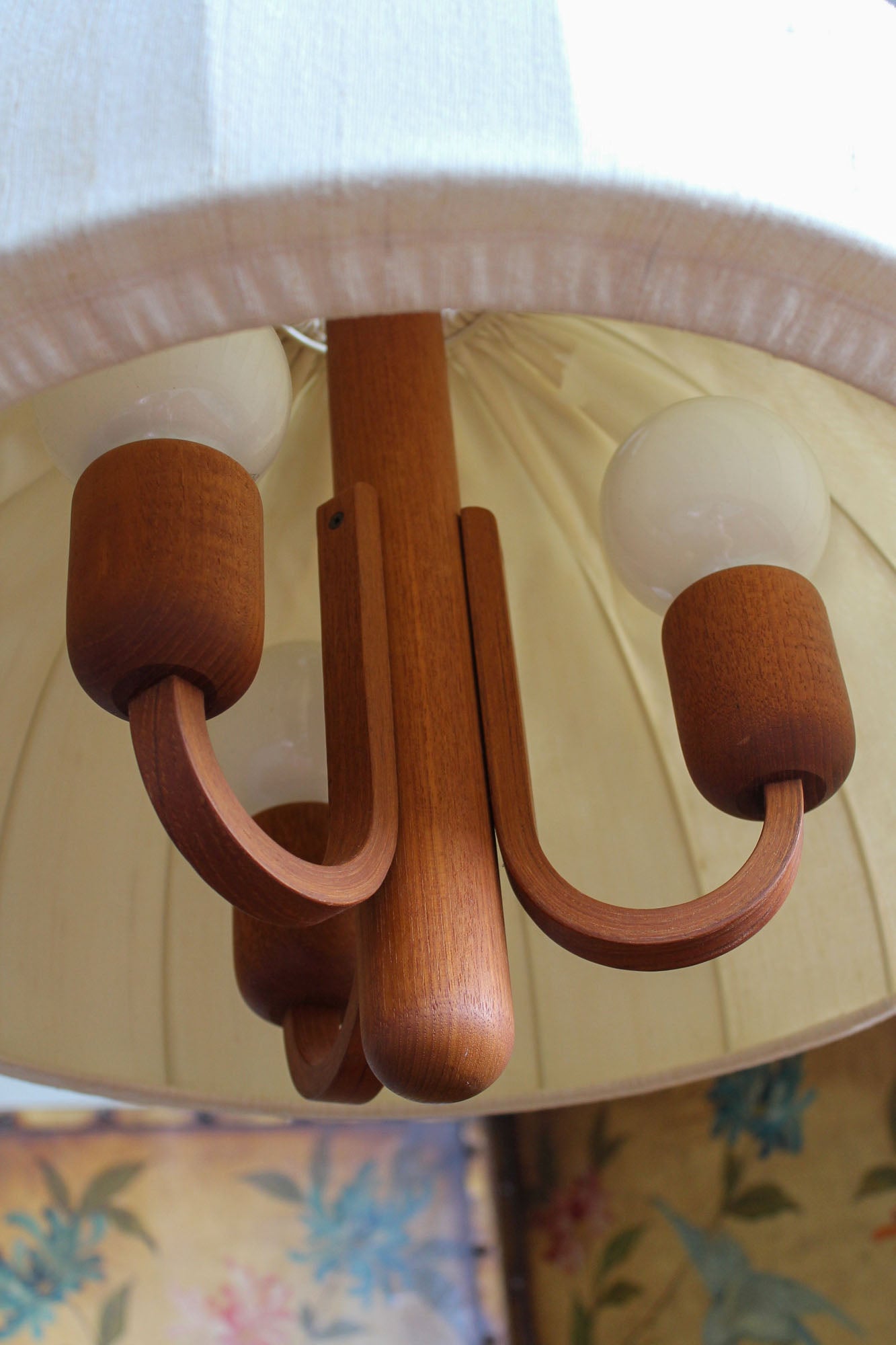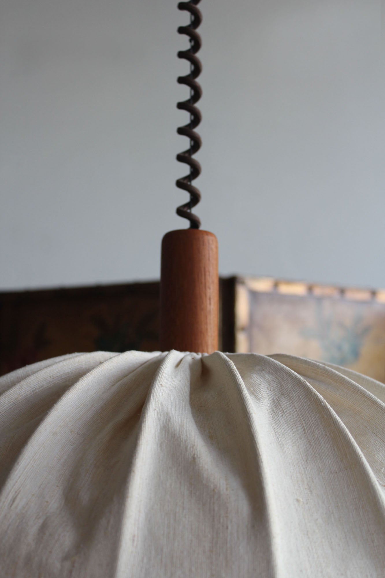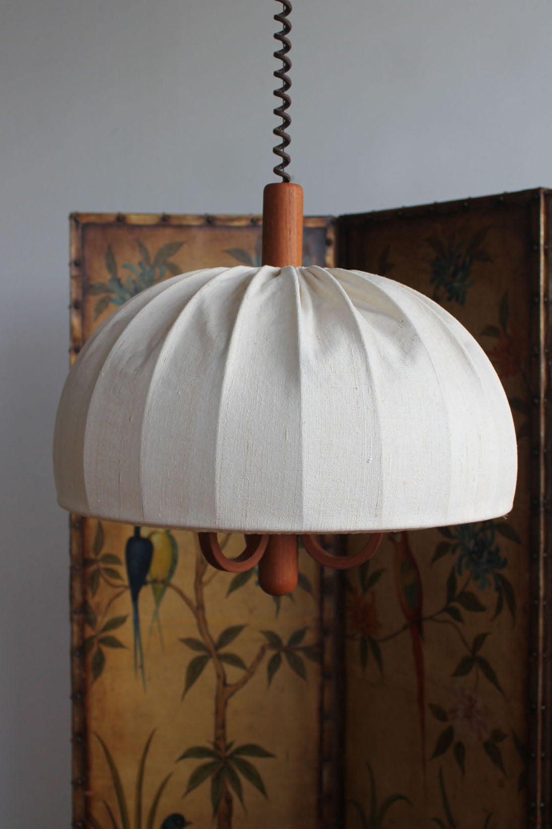 Teak and Linen Pendant Lamp by Domus Germany, 1960s. Pull-pendant lamp with teak details and 3 bulb "Candela" chandelier. Cream linen shade and a brown elevating cord. Can be adjusted from 35" to 60".