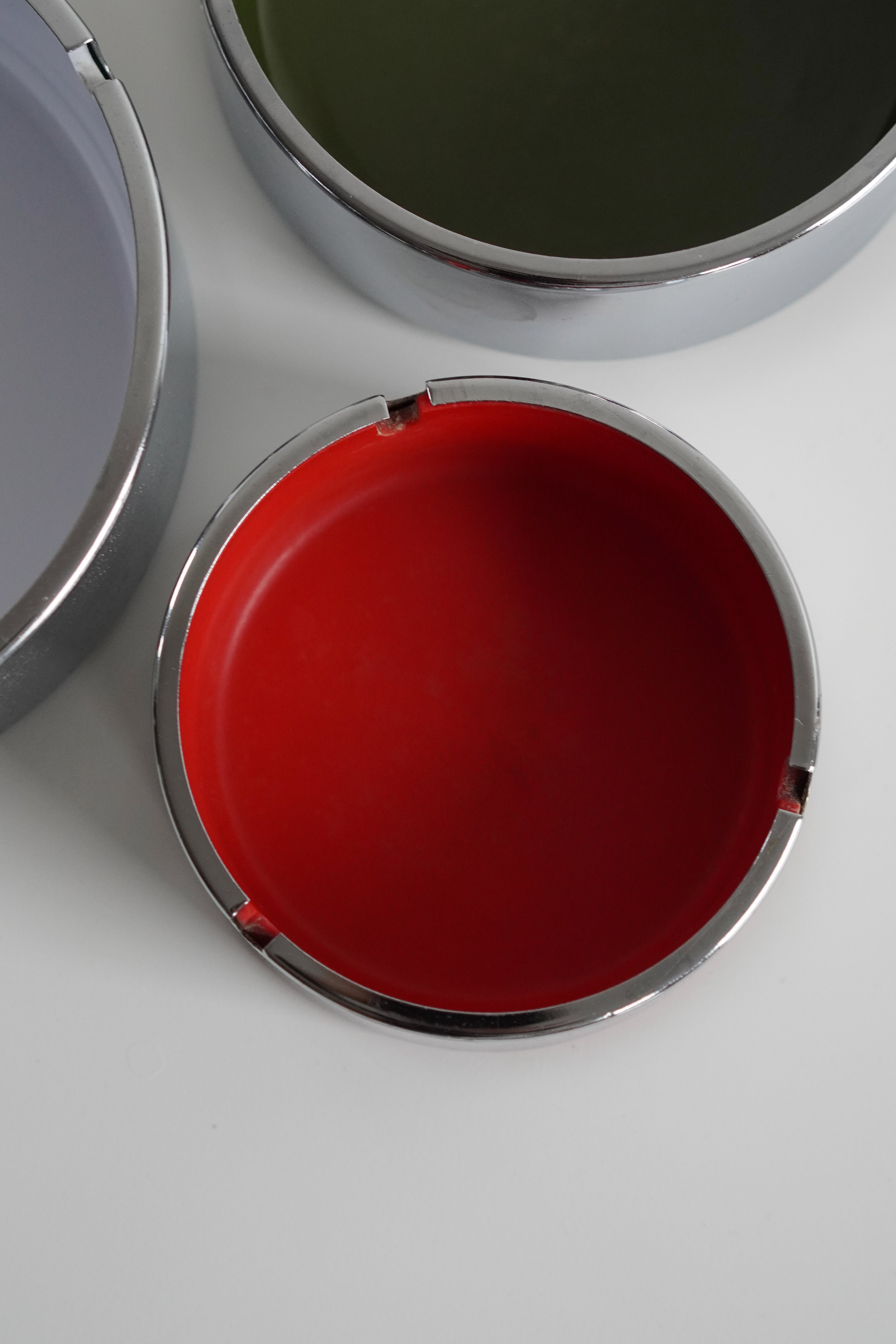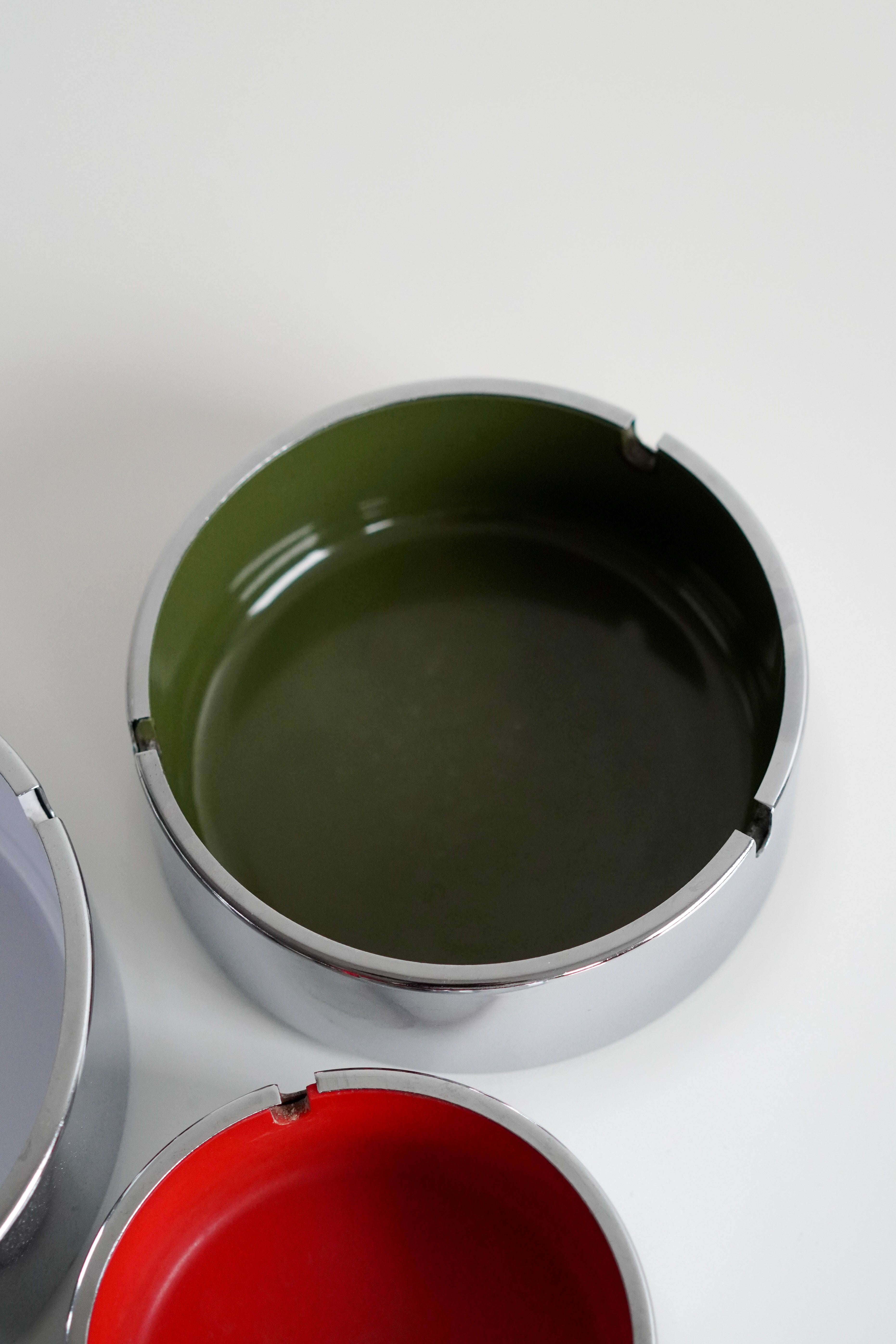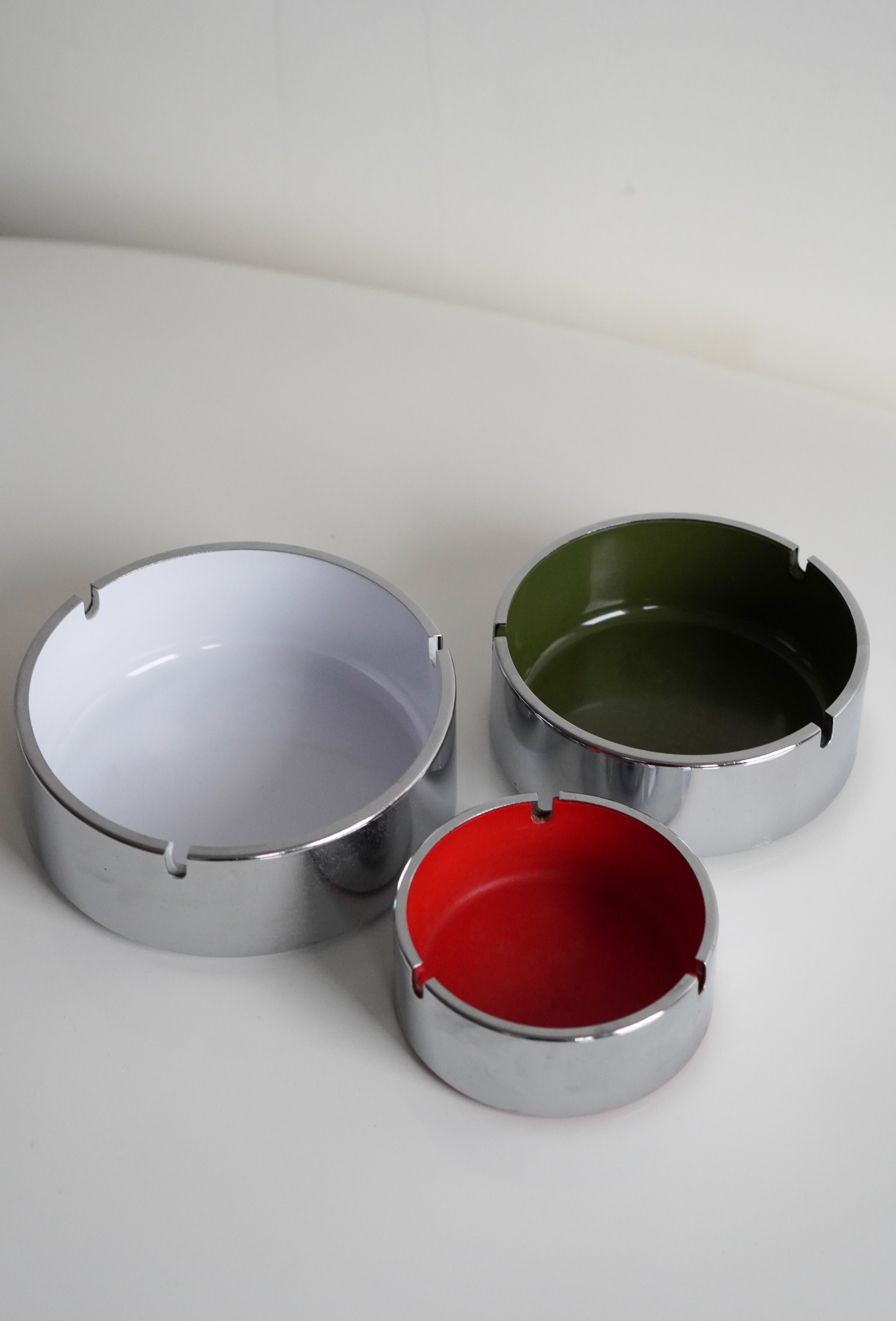 Nesting Ashtray Set by Isamu Kenmochi, made in Japan, 1960s. Set of 3 ashtrays with chrome exterior and melamine colored interior; red, green and white.