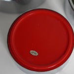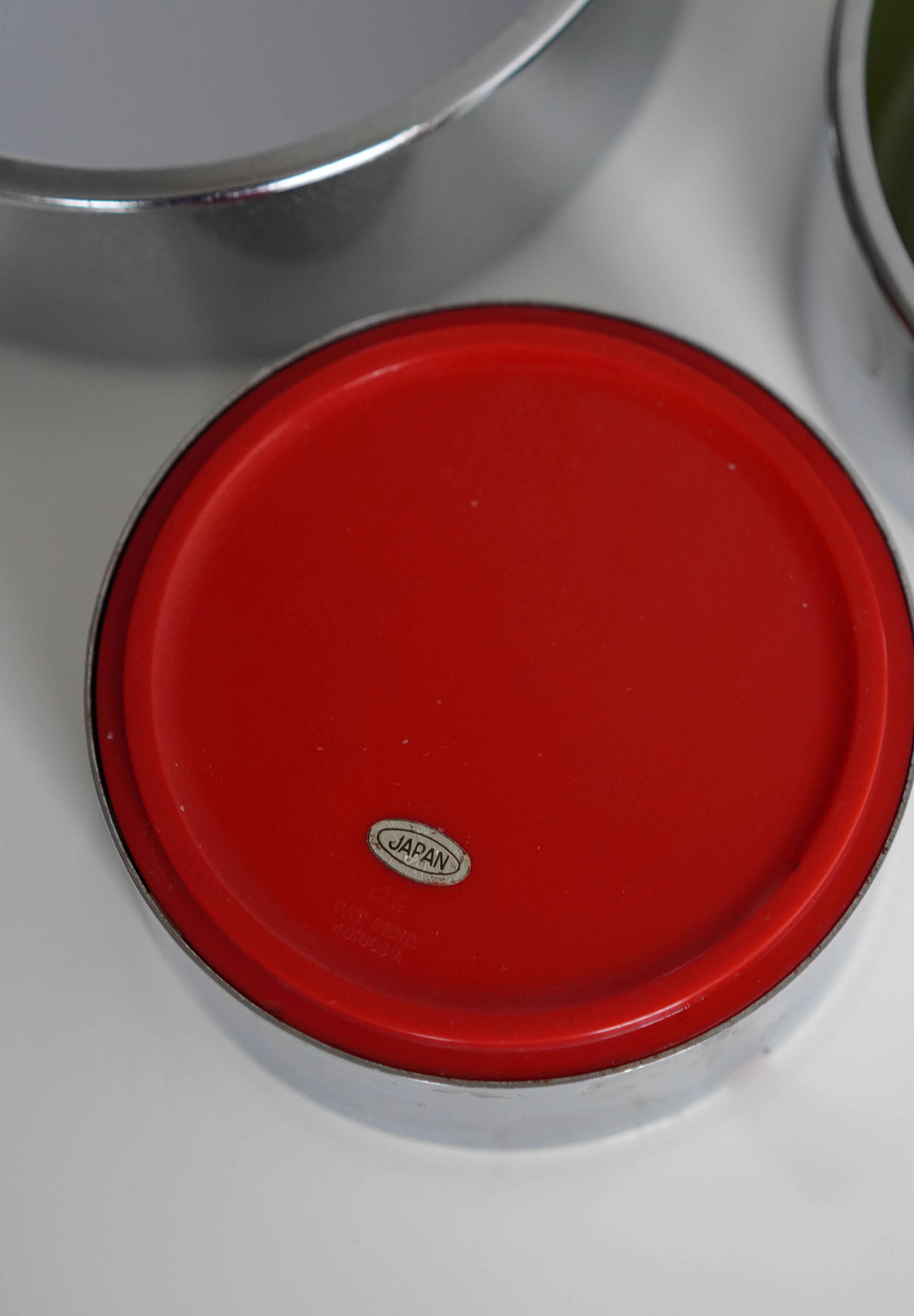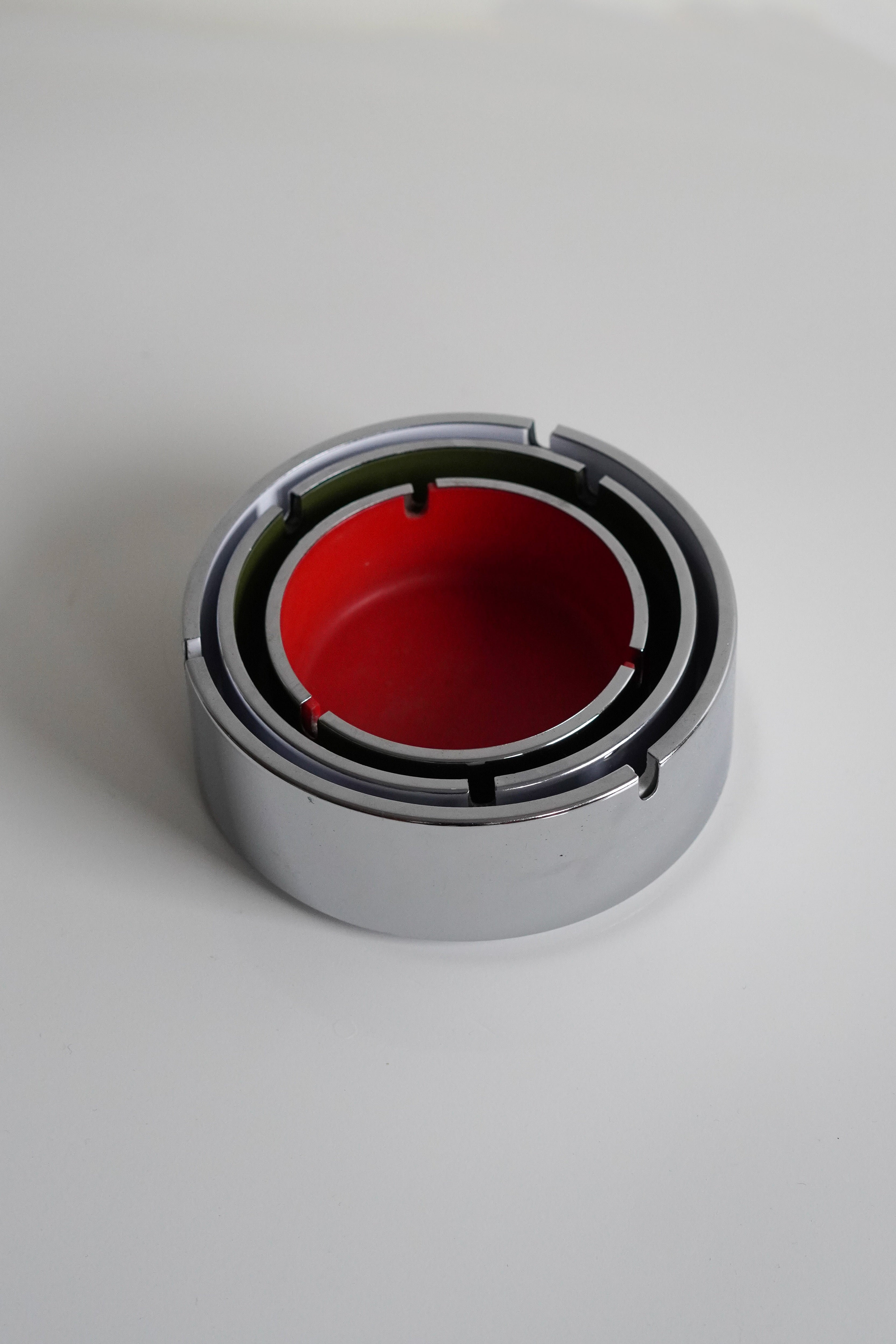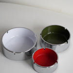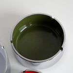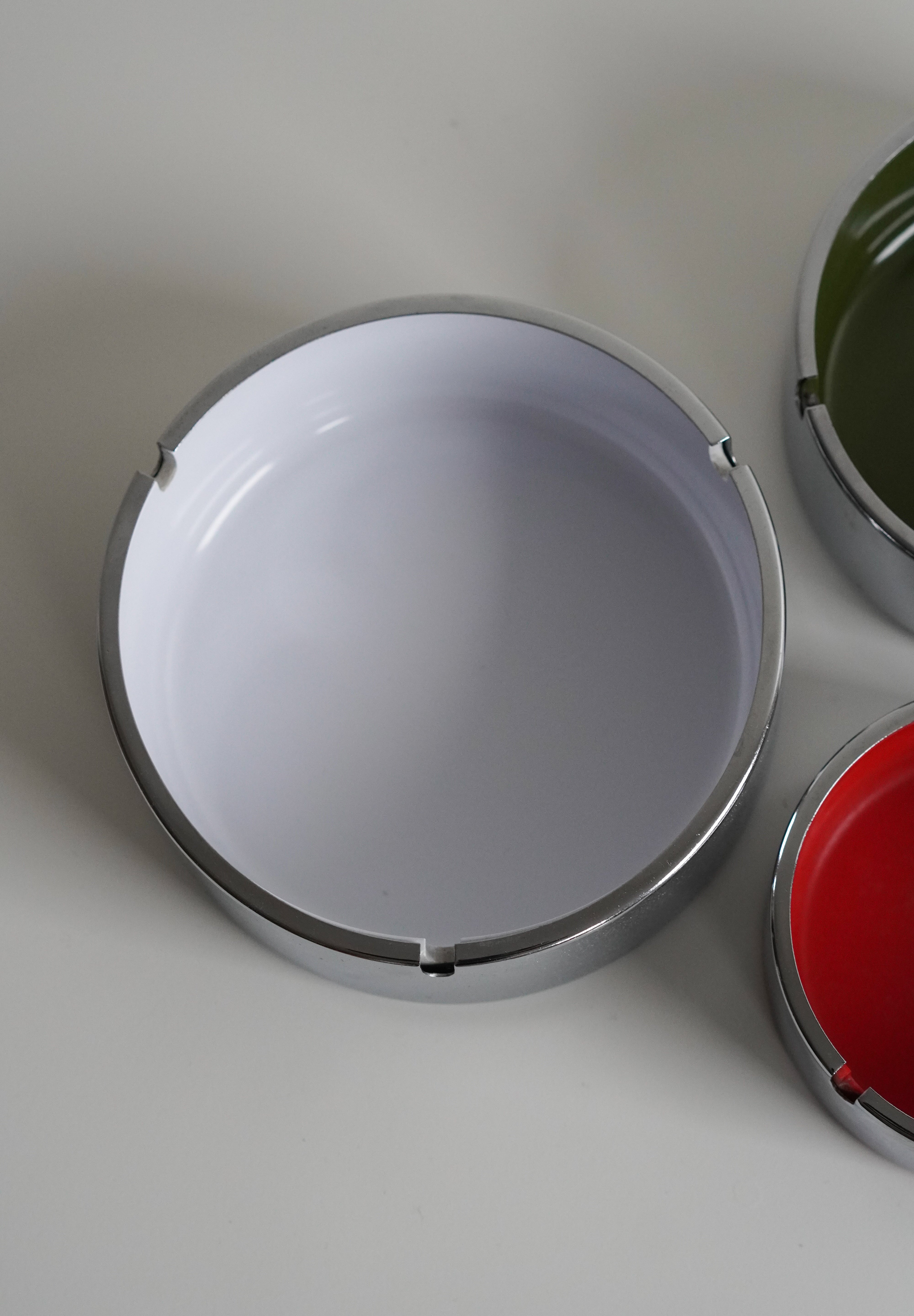 Nesting Ashtray Set by Isamu Kenmochi, made in Japan, 1960s. Set of 3 ashtrays with chrome exterior and melamine colored interior; red, green and white.