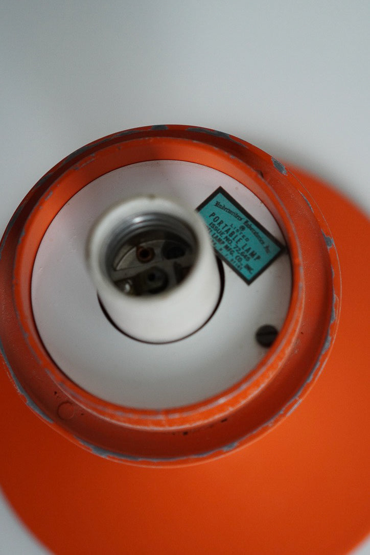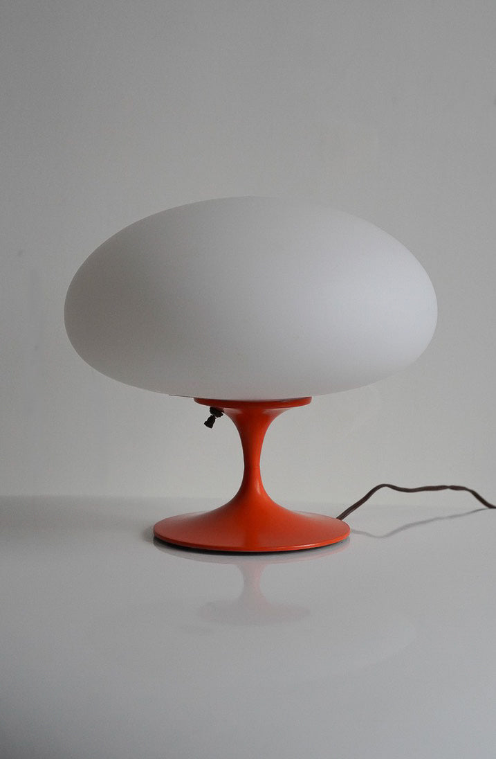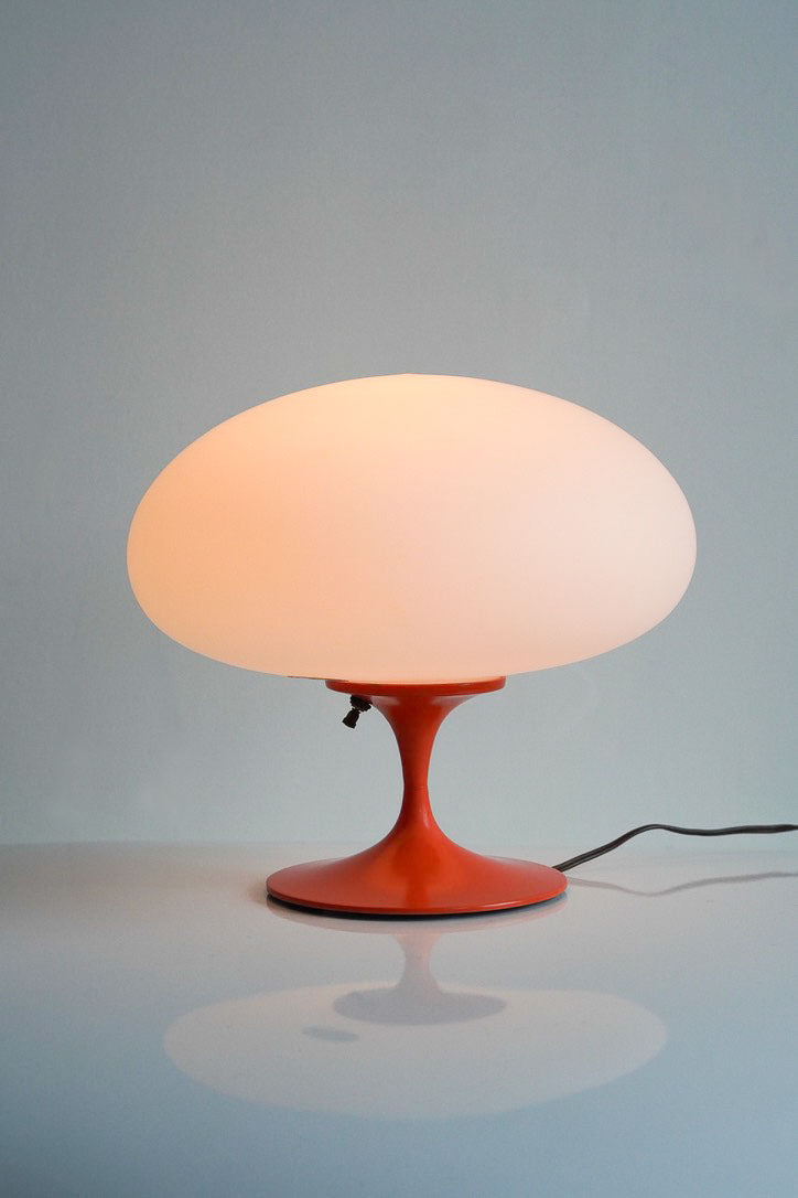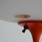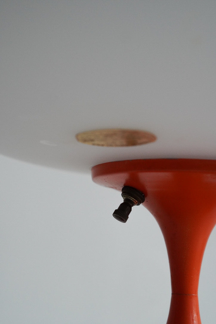 Laurel Lamp Co. Mushroom Table Lamp, 1960s. Hand blown white frosted shade and orange metal base.