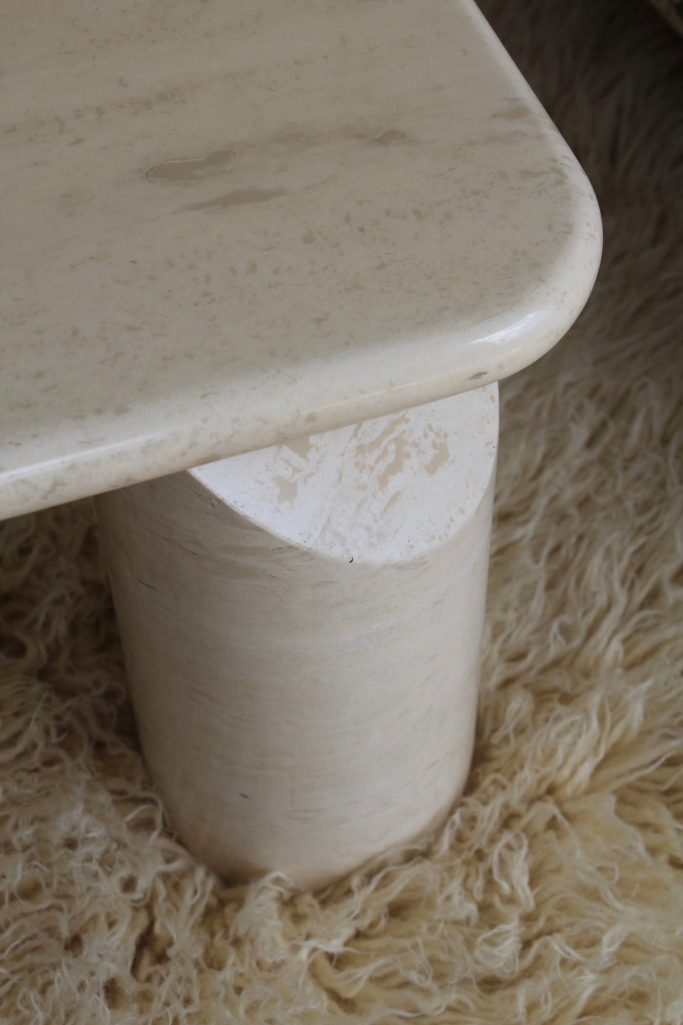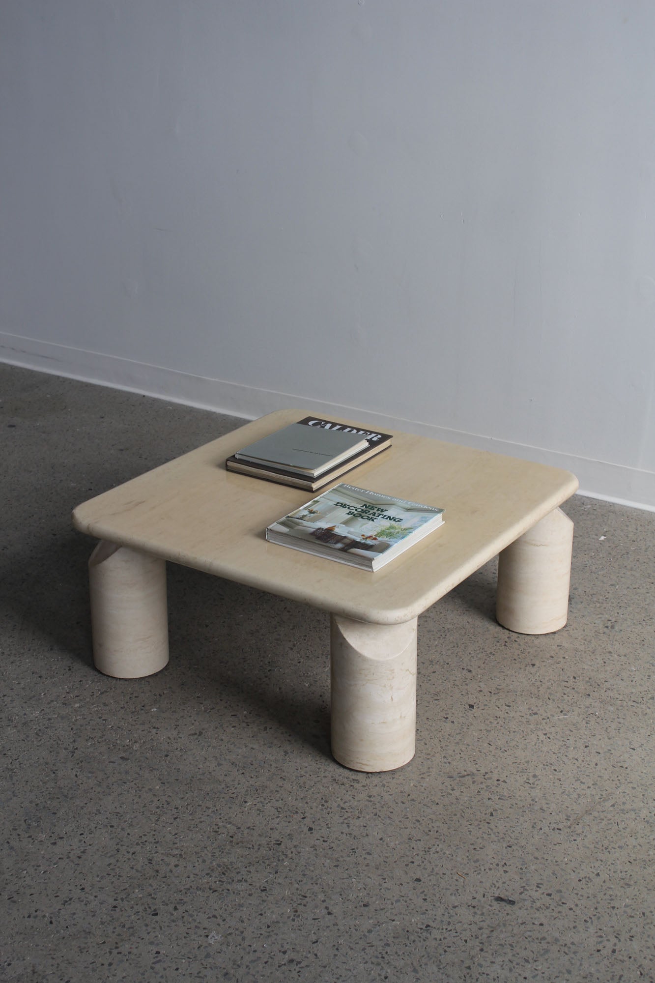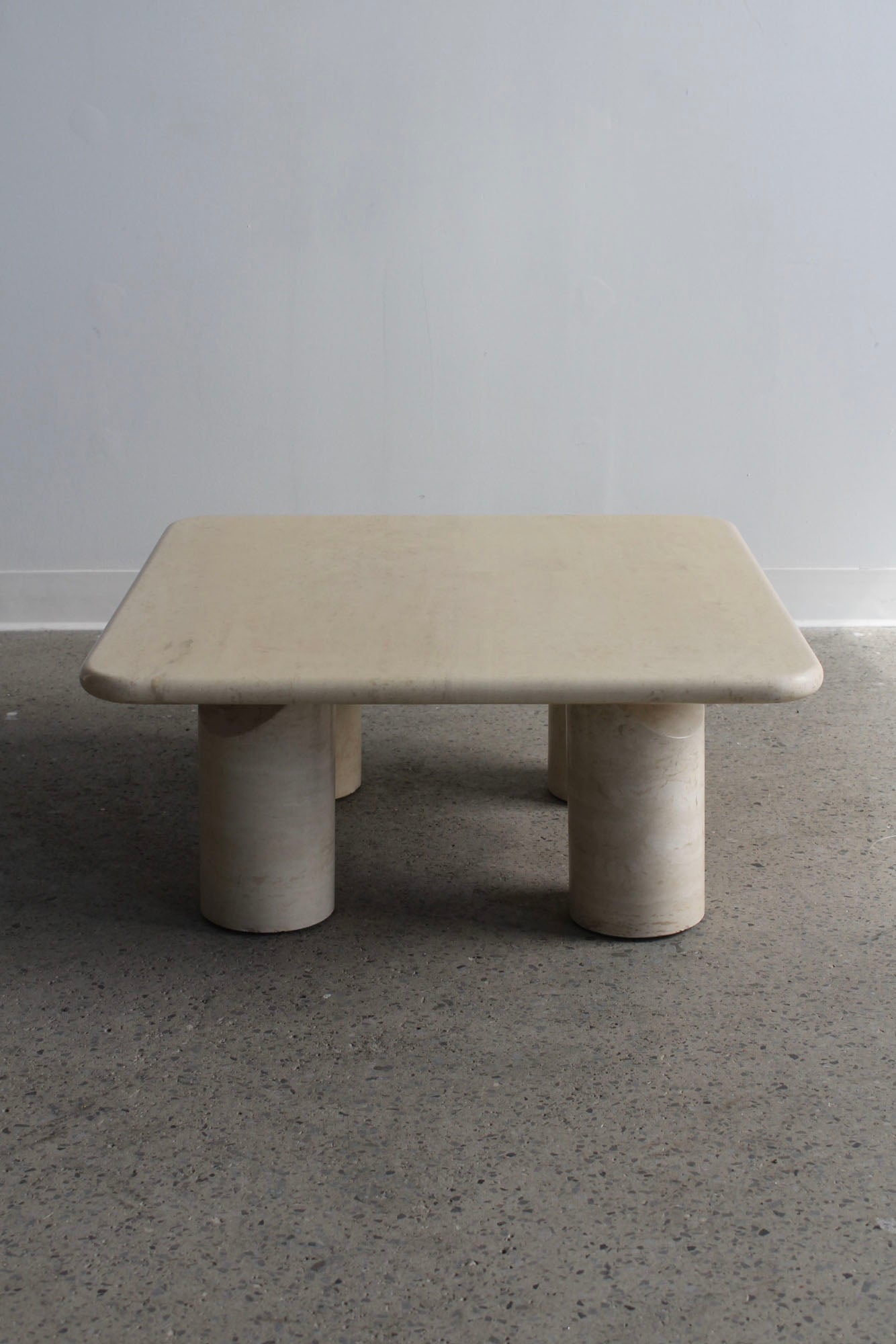 Travertine Coffee Table, 1970s - reminiscent of Mario Bellini's Il Colonnato series. Made of solid travertine; 4 cylindrical bases with an angular cutout on each and a glossed rounded edge square top. Legs can placed as pleased.