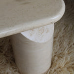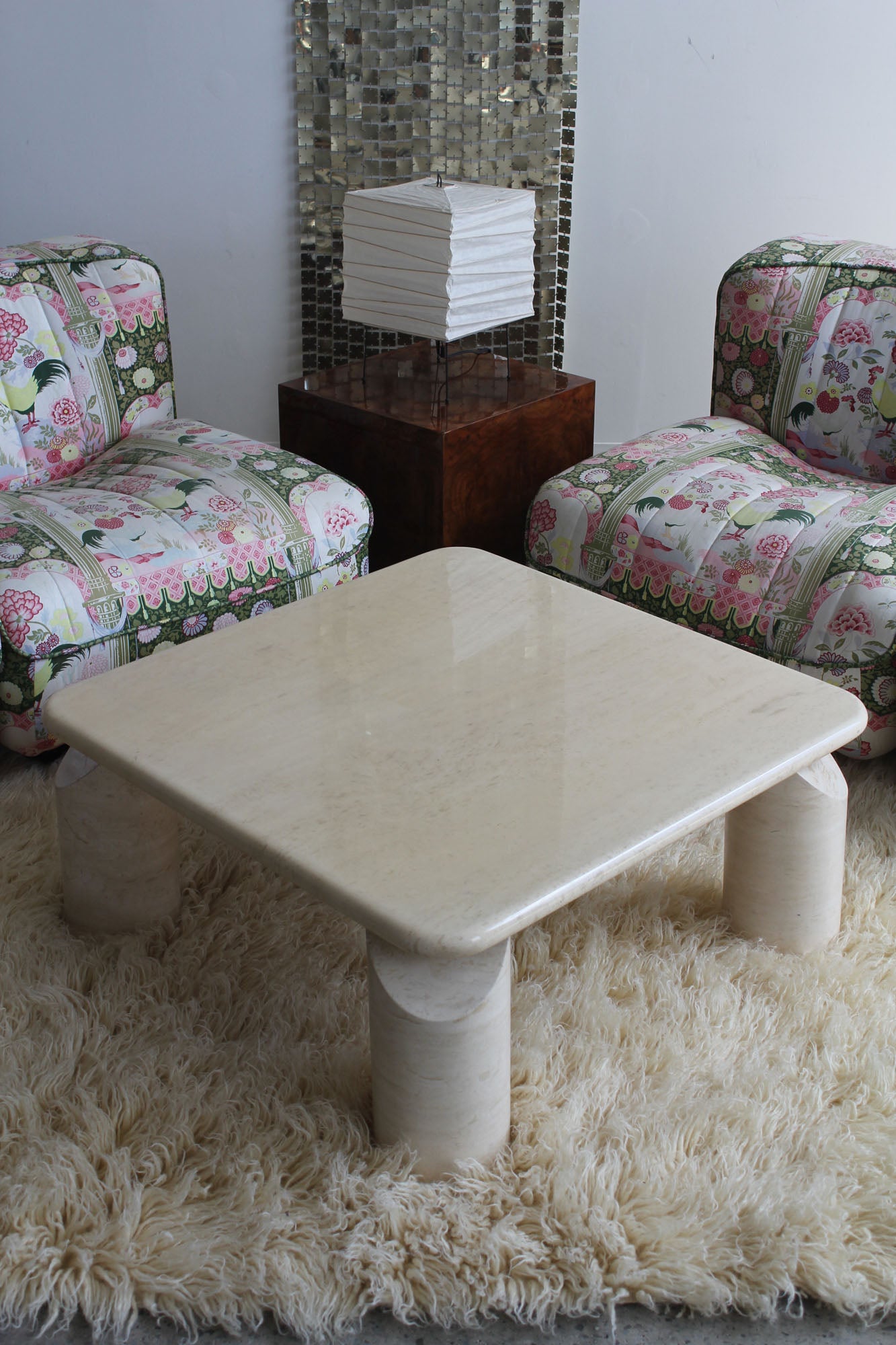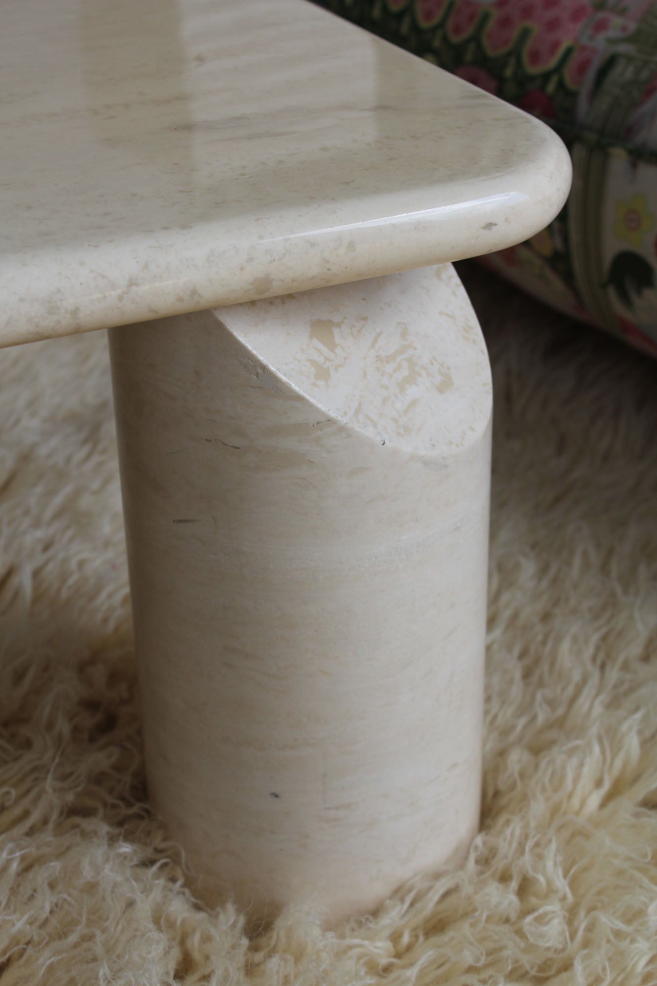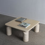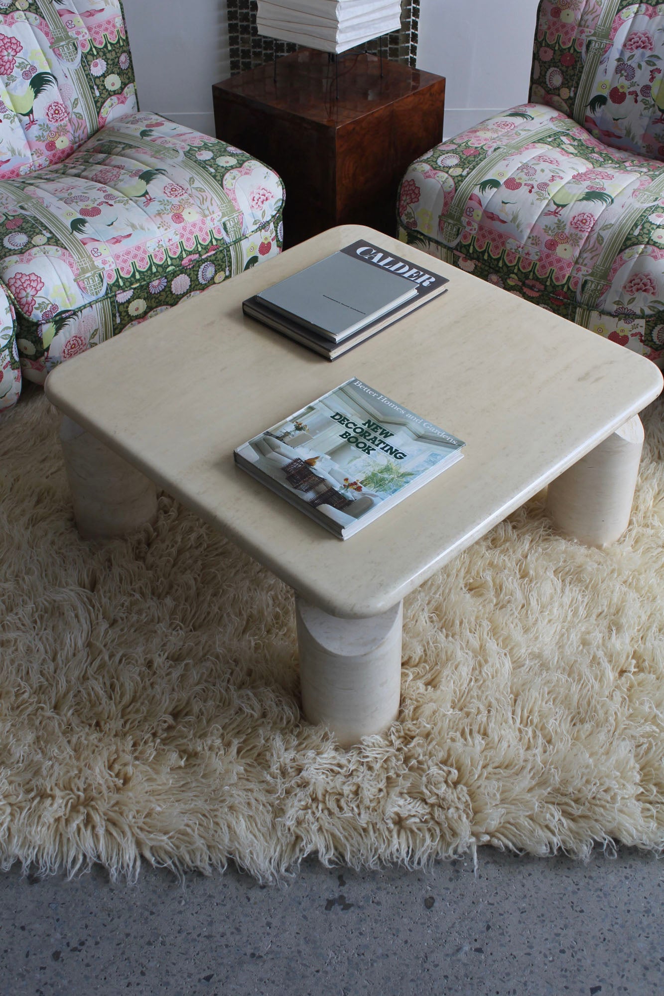 Travertine Coffee Table, 1970s - reminiscent of Mario Bellini's Il Colonnato series. Made of solid travertine; 4 cylindrical bases with an angular cutout on each and a glossed rounded edge square top. Legs can placed as pleased.