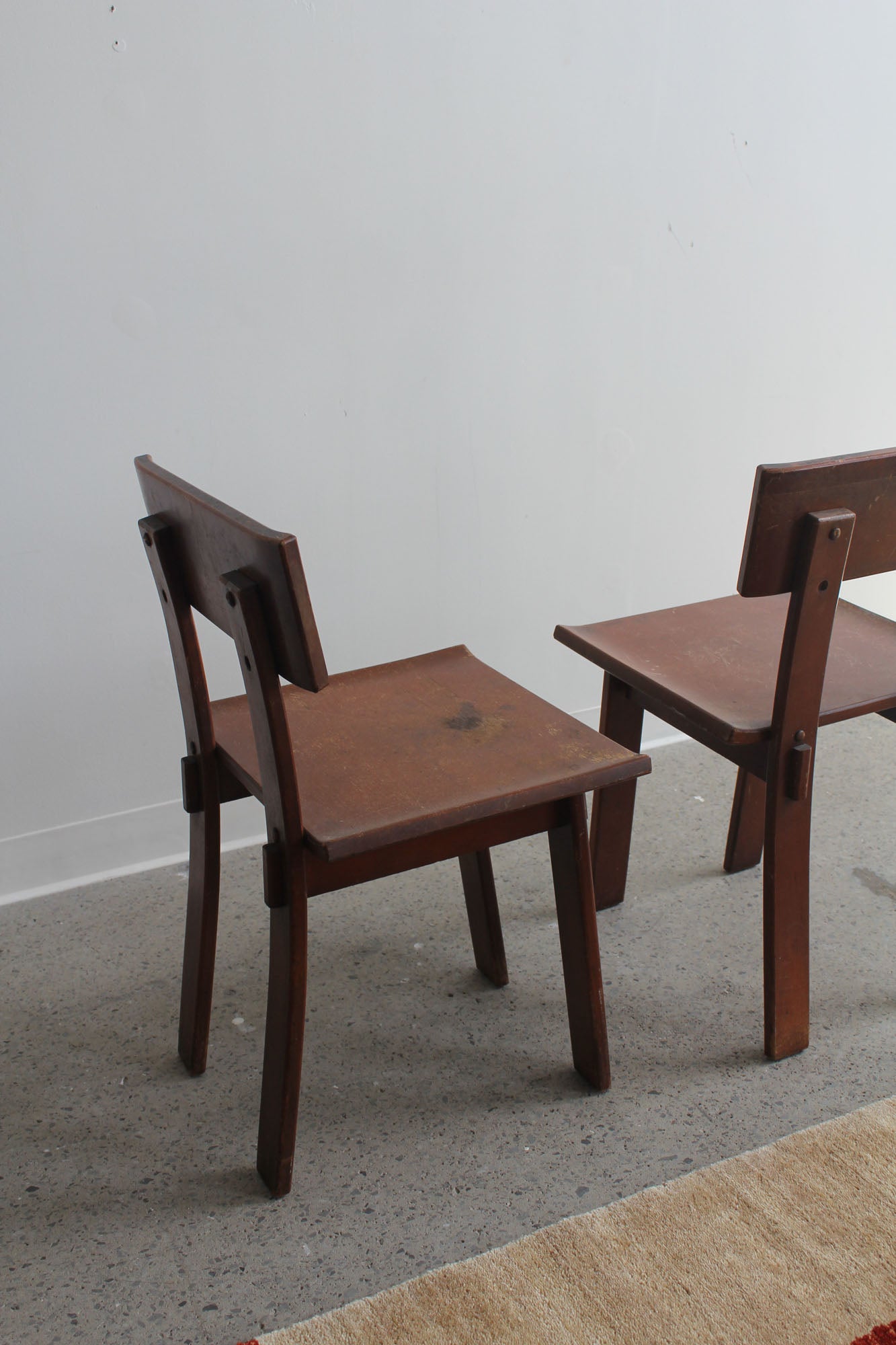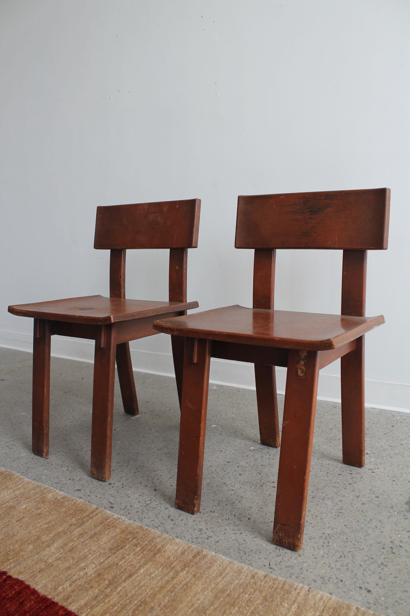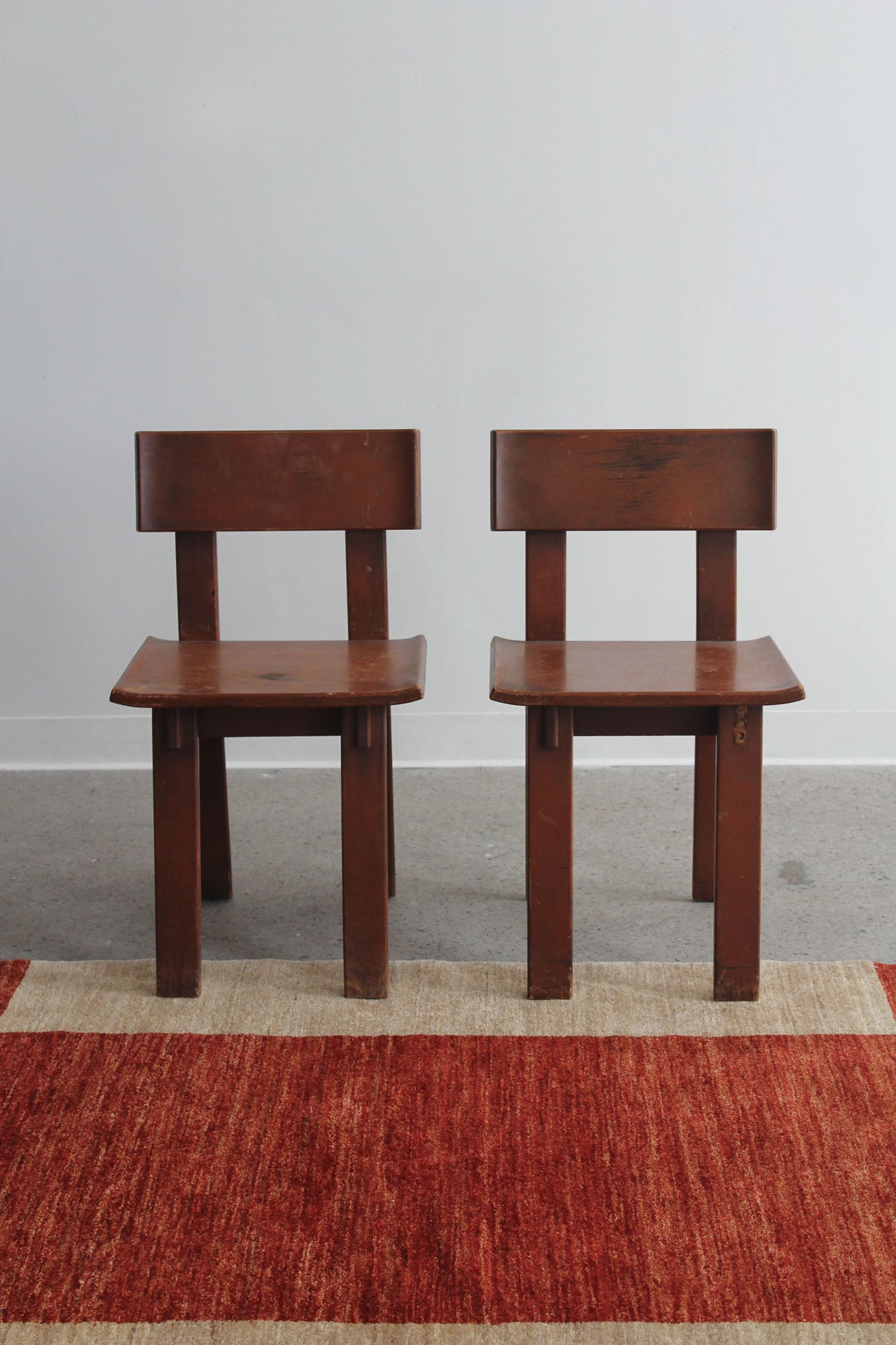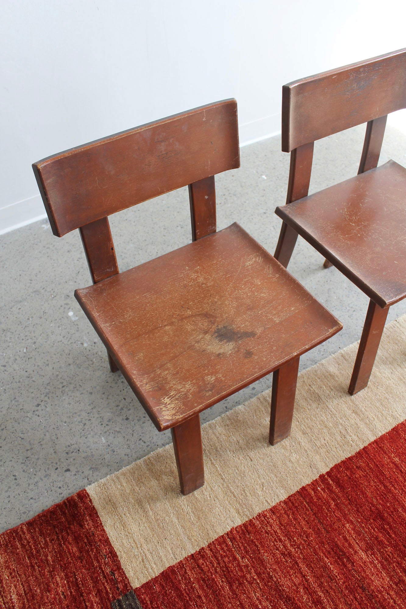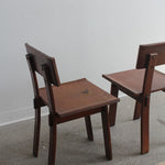 Set of two dining chairs designed by Russel Wright, made by Conant Ball for American Modern, 1930s. Rare set of "American Modern" lacquered maple chairs - signed with branded manufacturer's mark to underside.