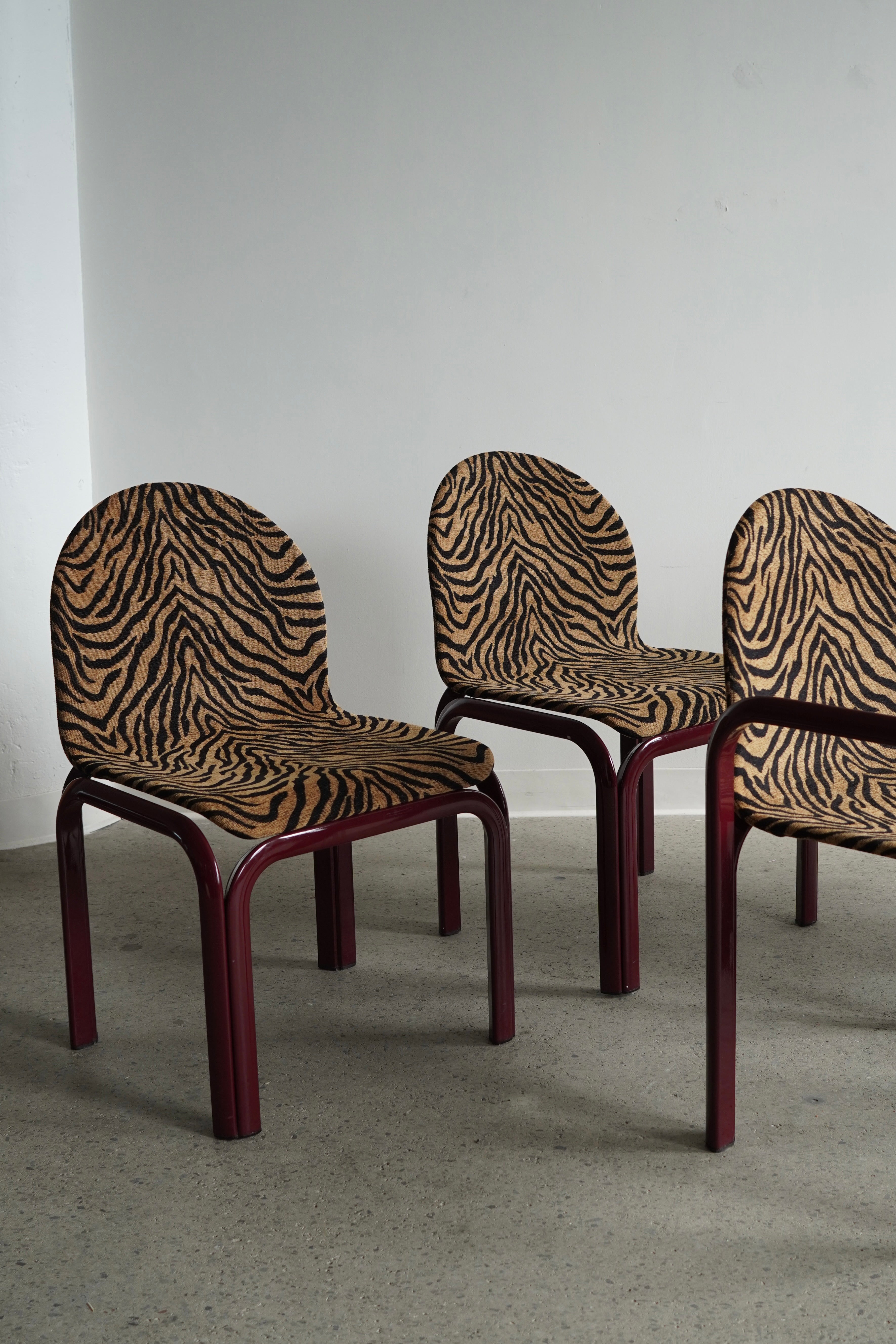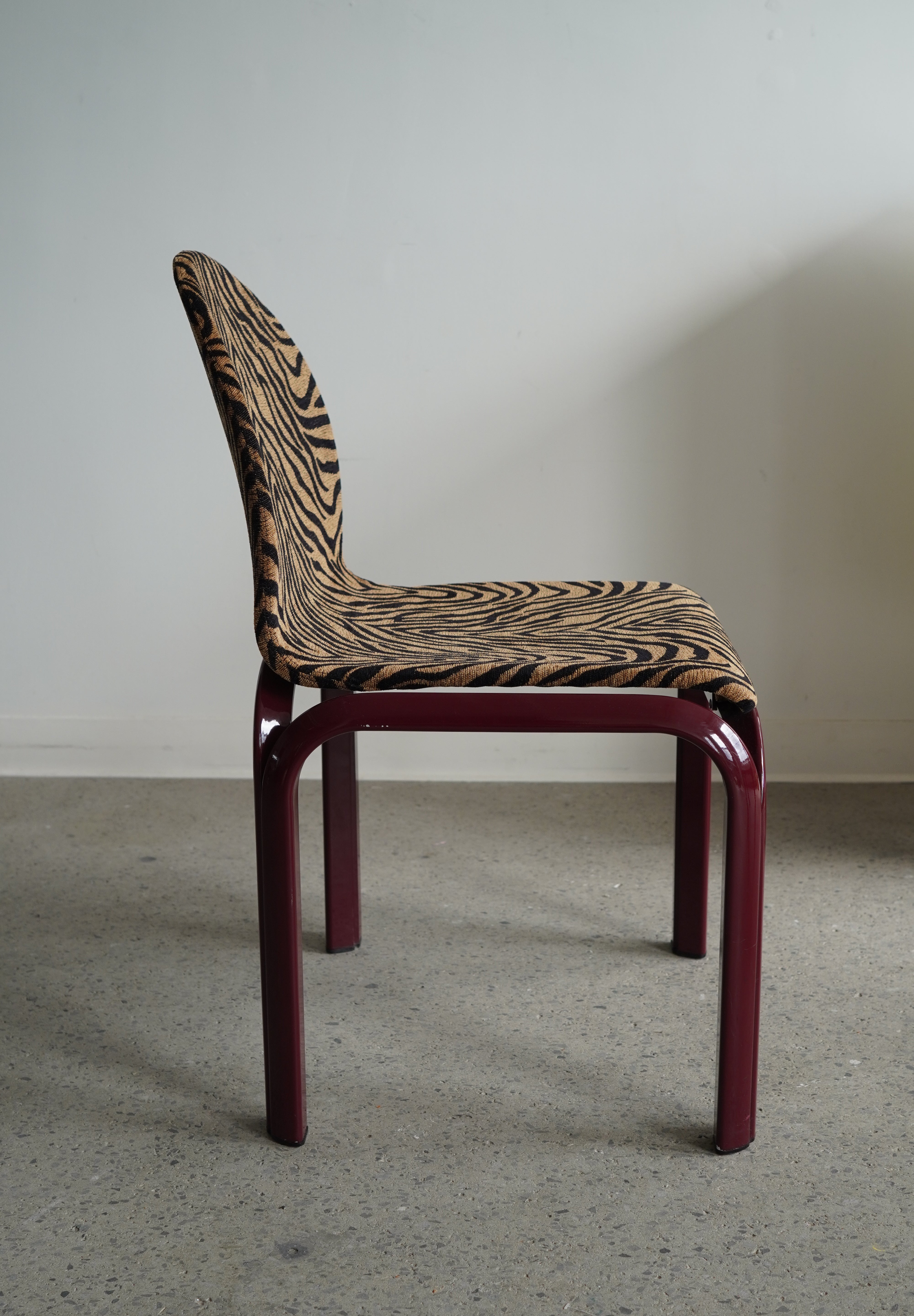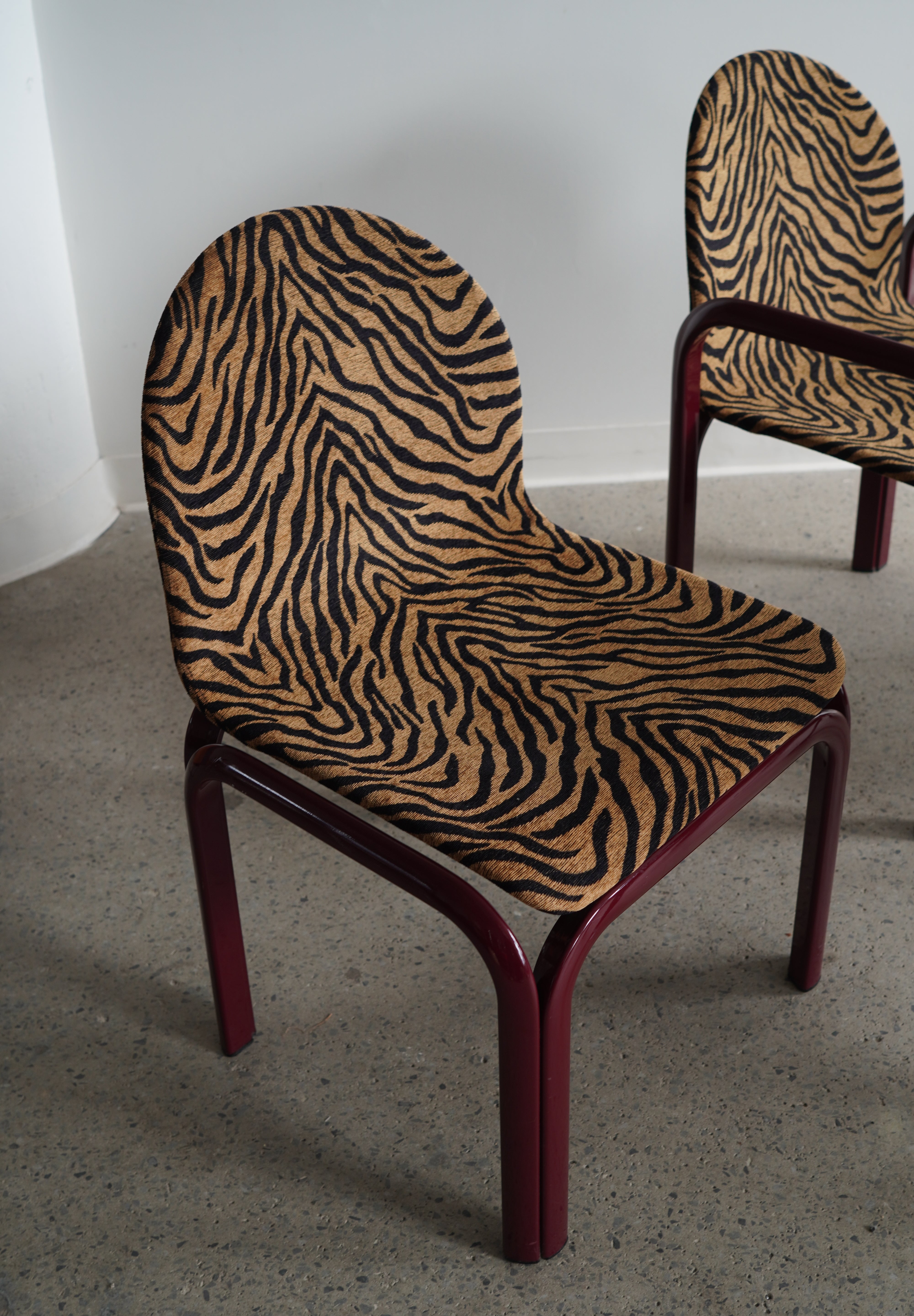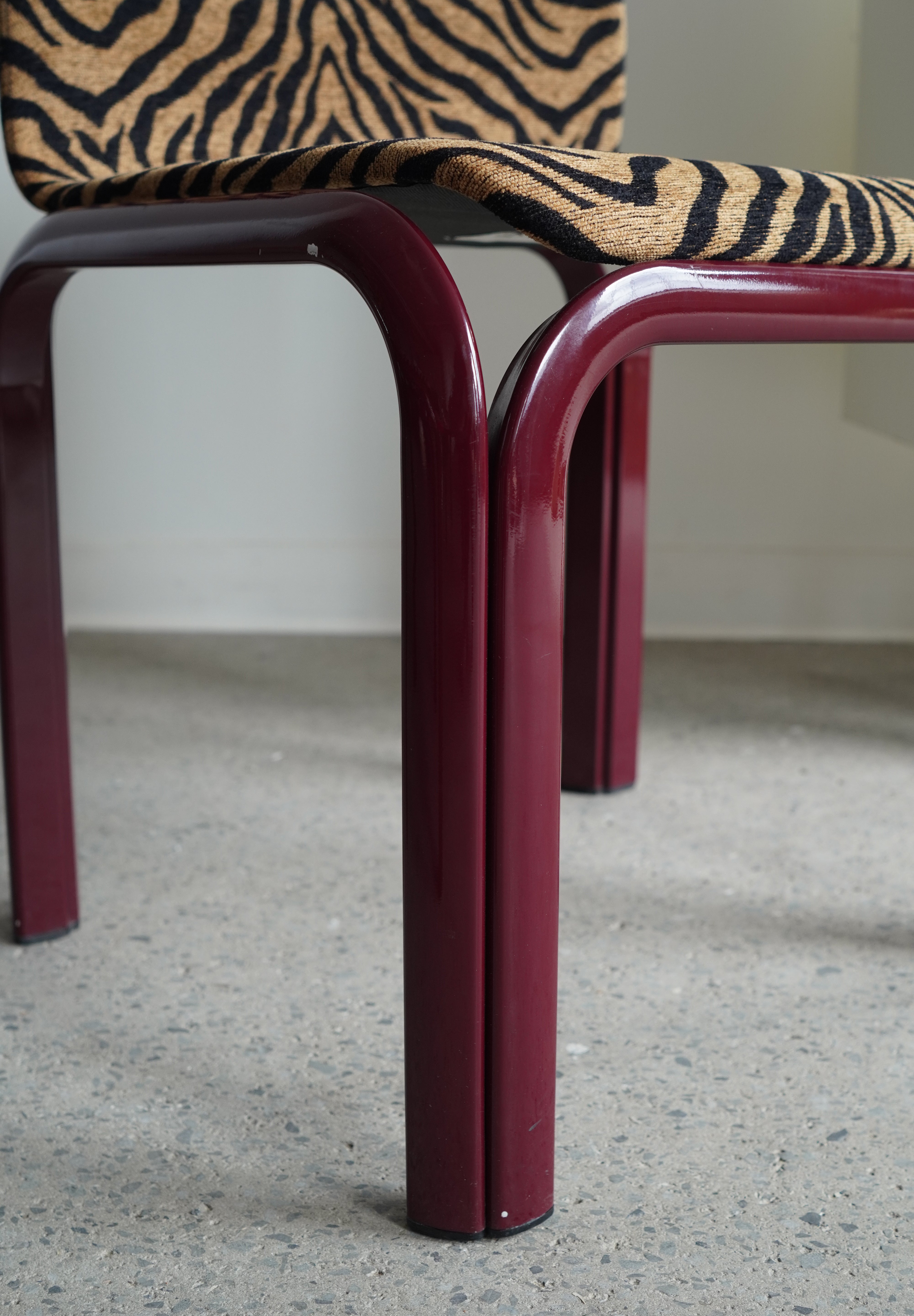 Set of four dining chairs by Gae Aulenti for Knoll, including two model 54A armchairs and two model 54 side chairs, 1970s. Burgundy-plum enamel tubular steel frames and newly reupholstered seats in a bold animal print durable fabric.