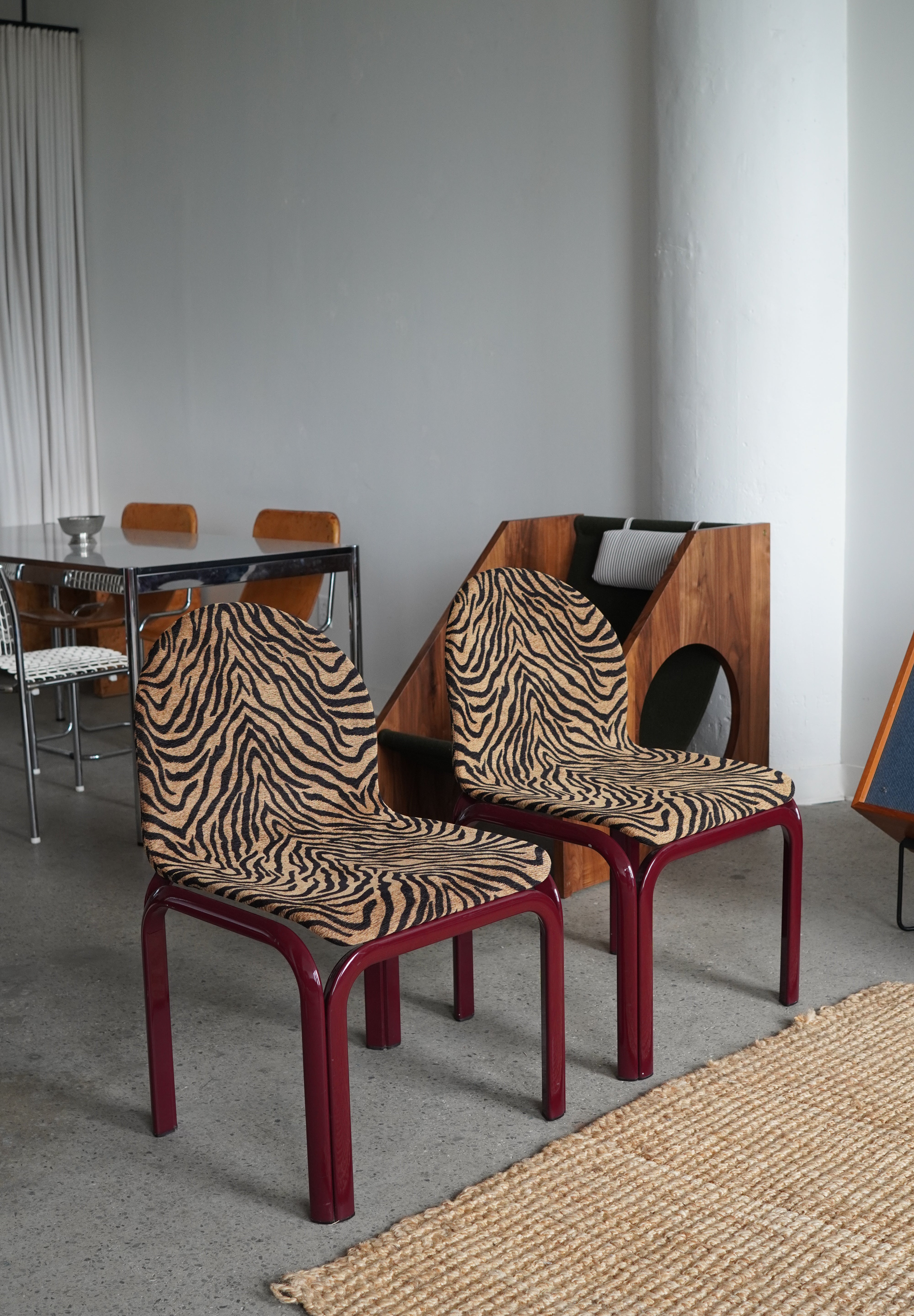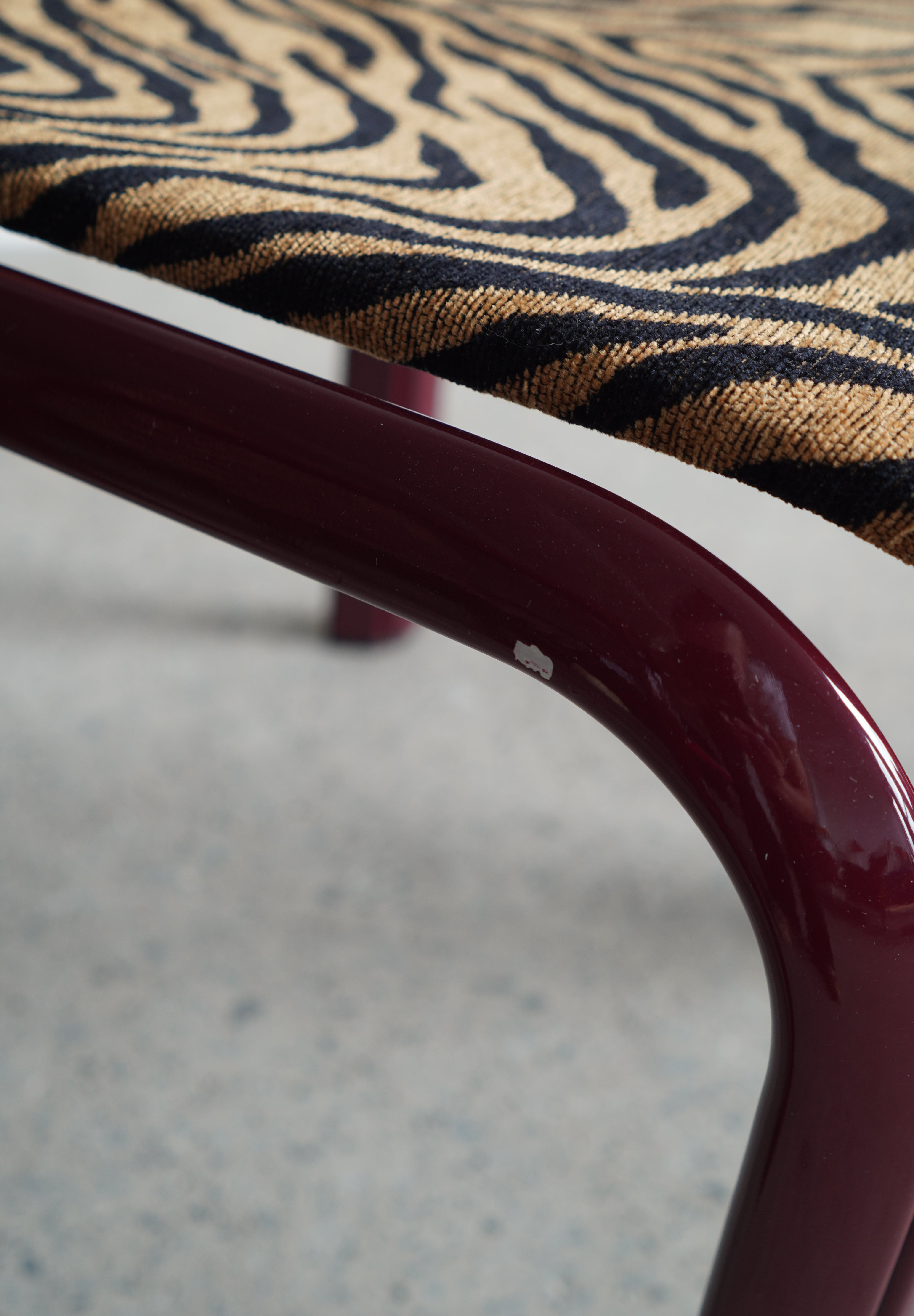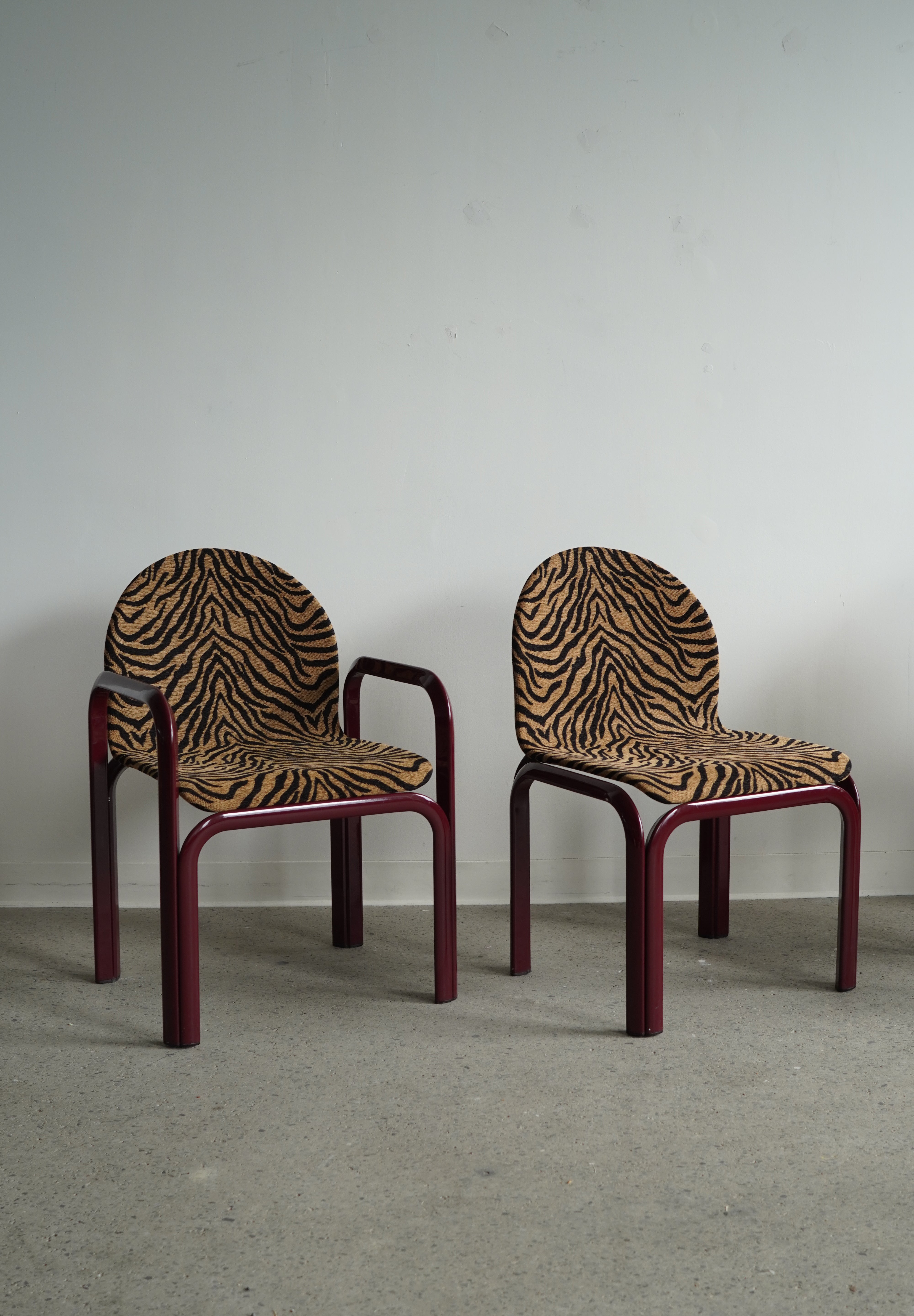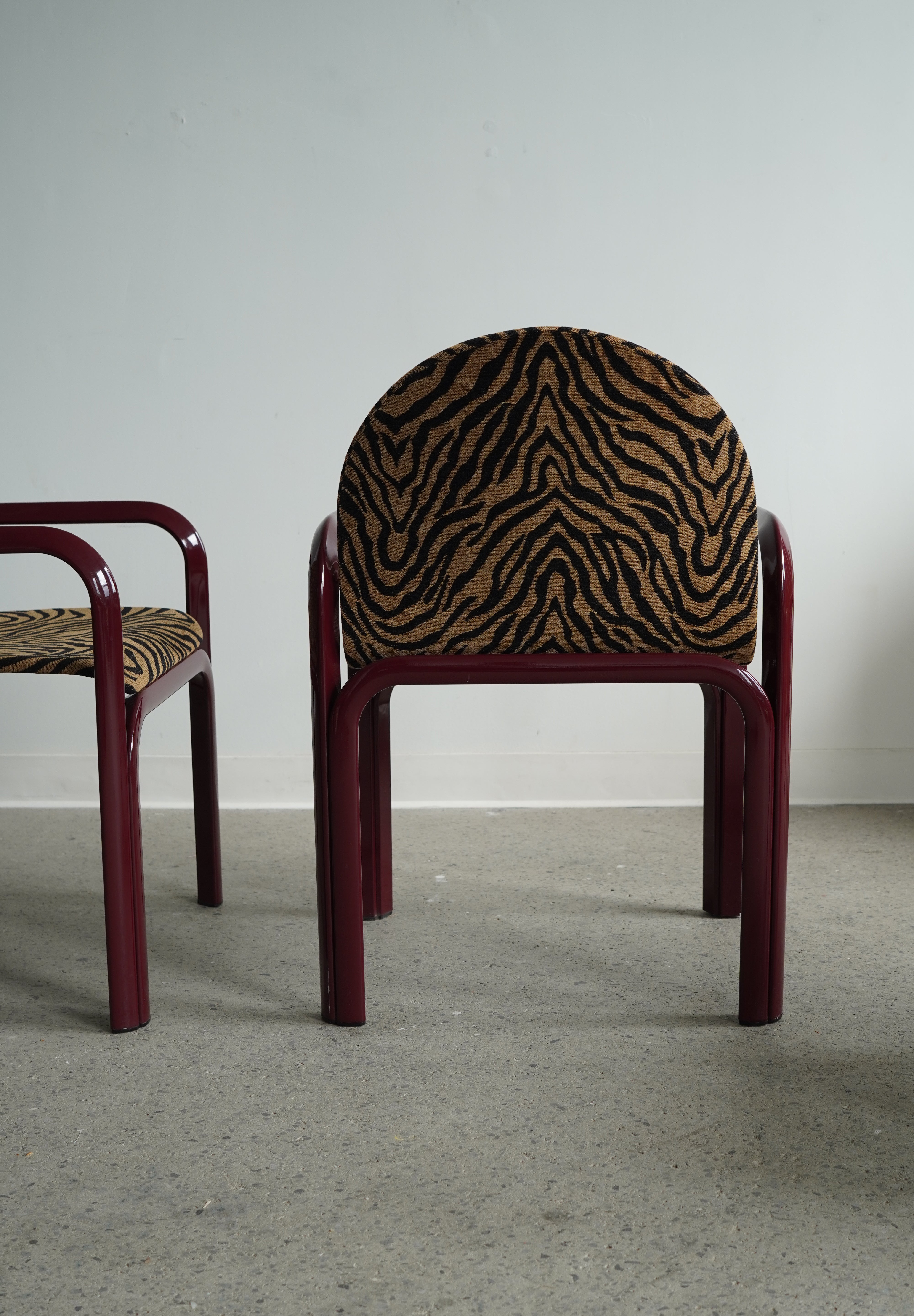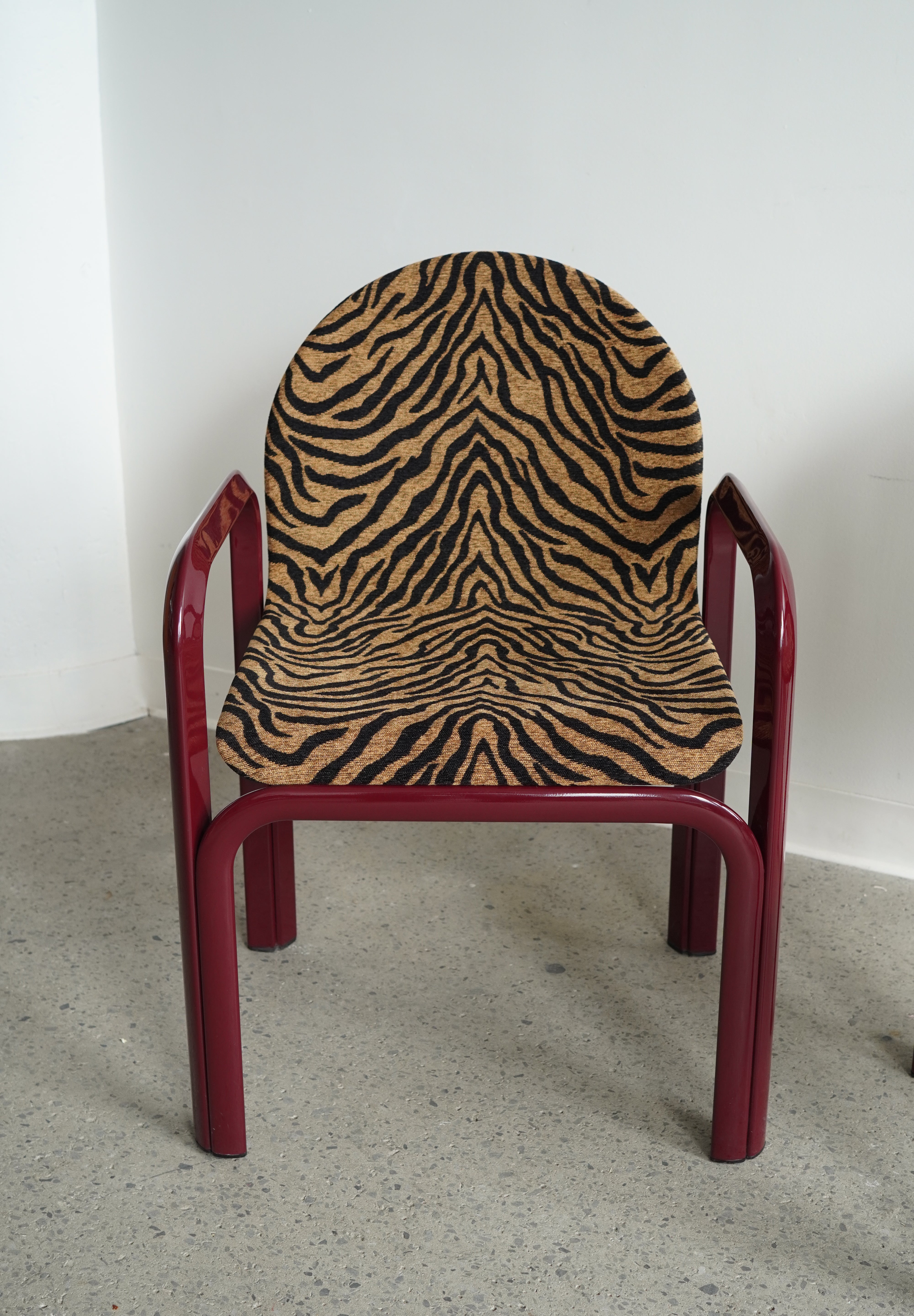 Set of four dining chairs by Gae Aulenti for Knoll, including two model 54A armchairs and two model 54 side chairs, 1970s. Burgundy-plum enamel tubular steel frames and newly reupholstered seats in a bold animal print durable fabric.