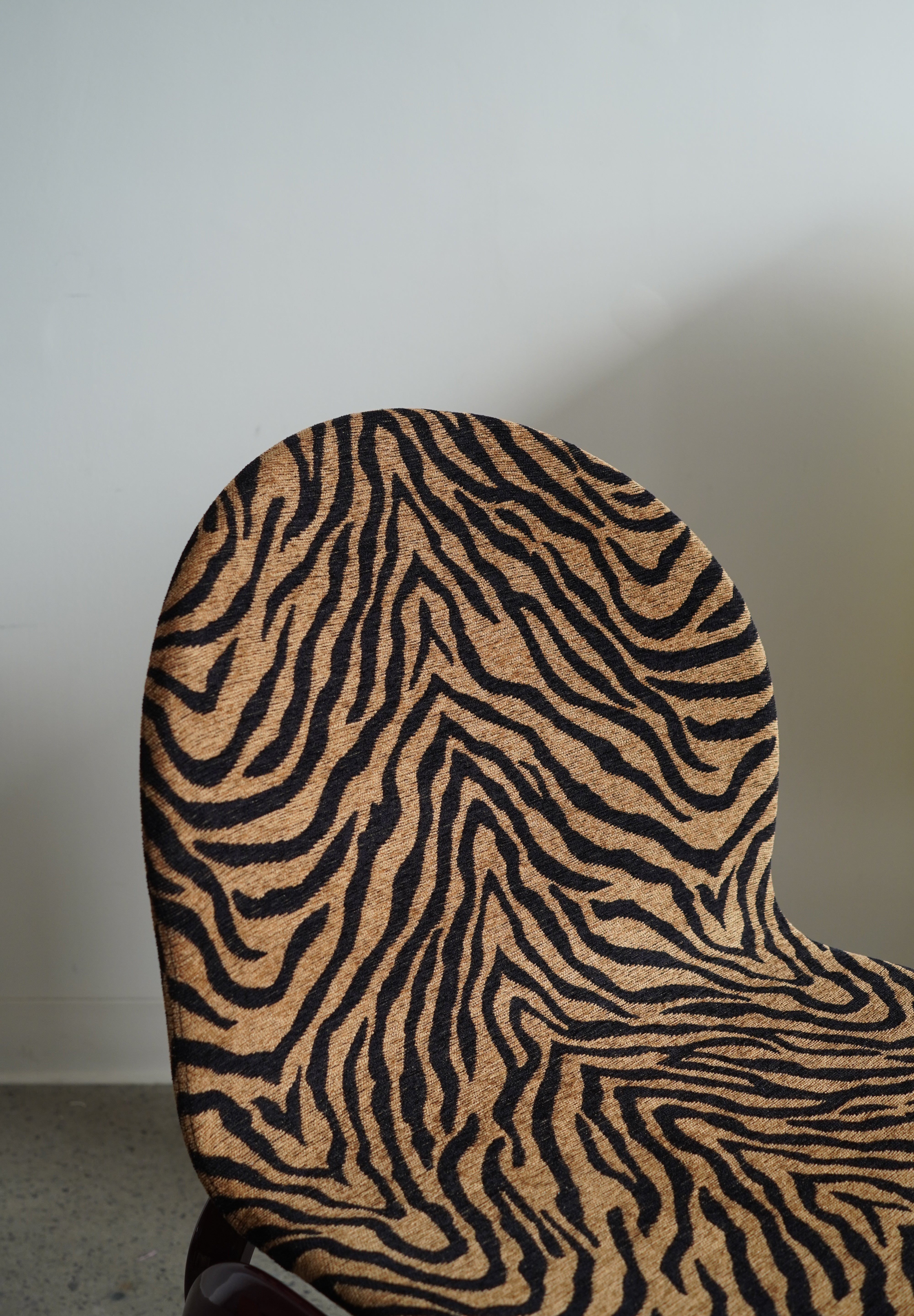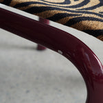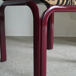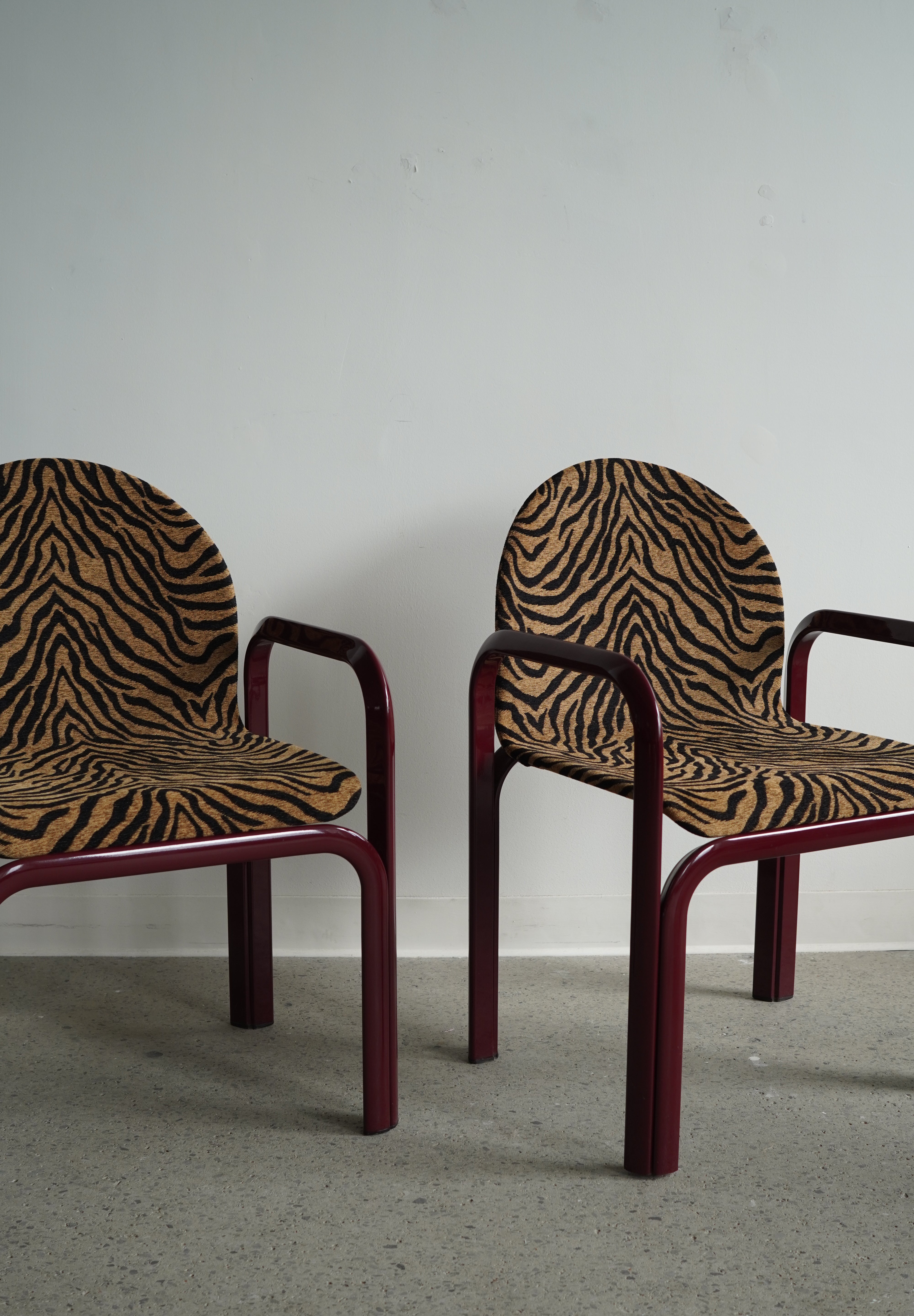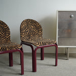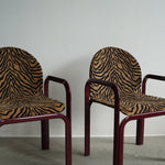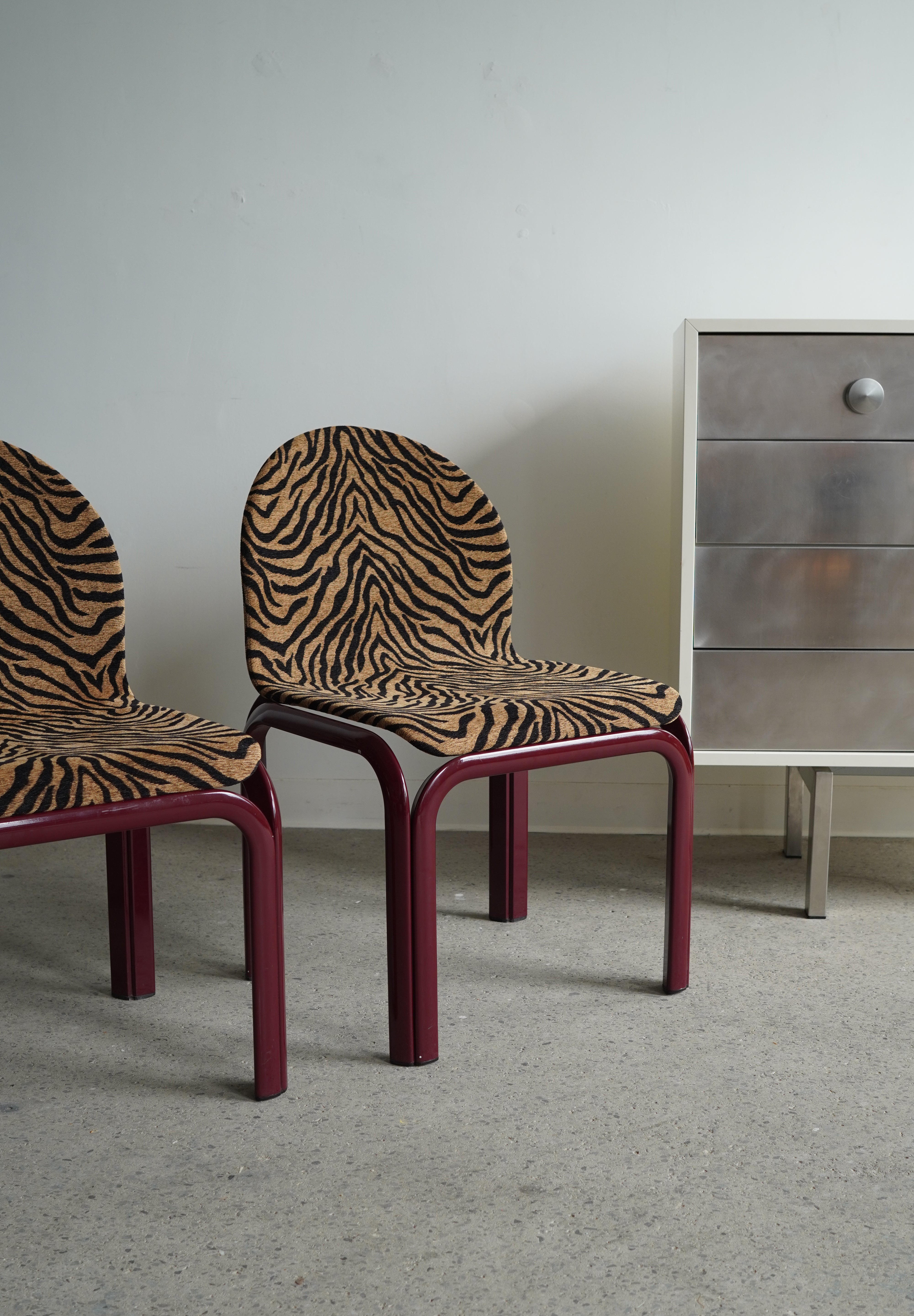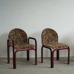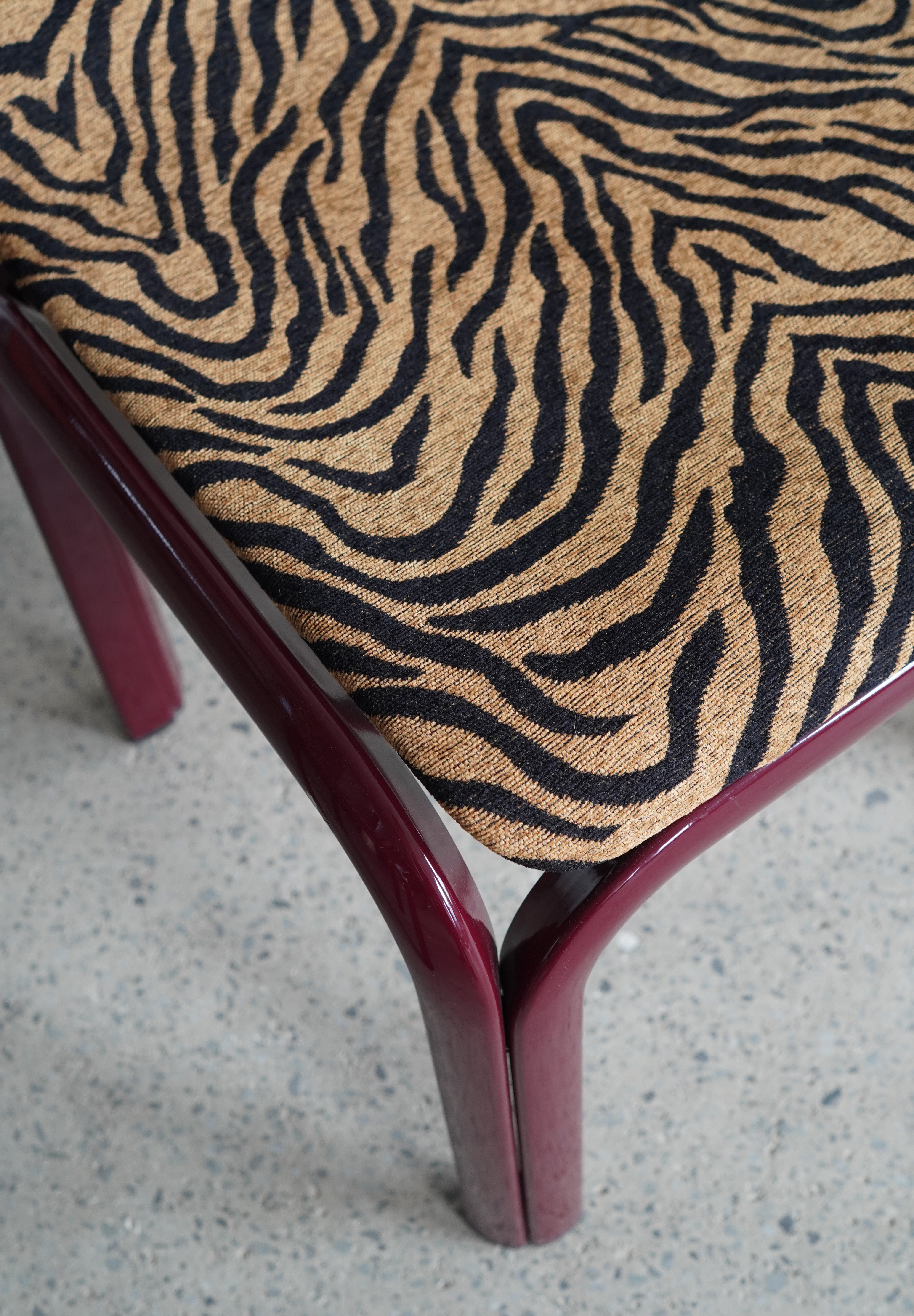 Set of four dining chairs by Gae Aulenti for Knoll, including two model 54A armchairs and two model 54 side chairs, 1970s. Burgundy-plum enamel tubular steel frames and newly reupholstered seats in a bold animal print durable fabric.