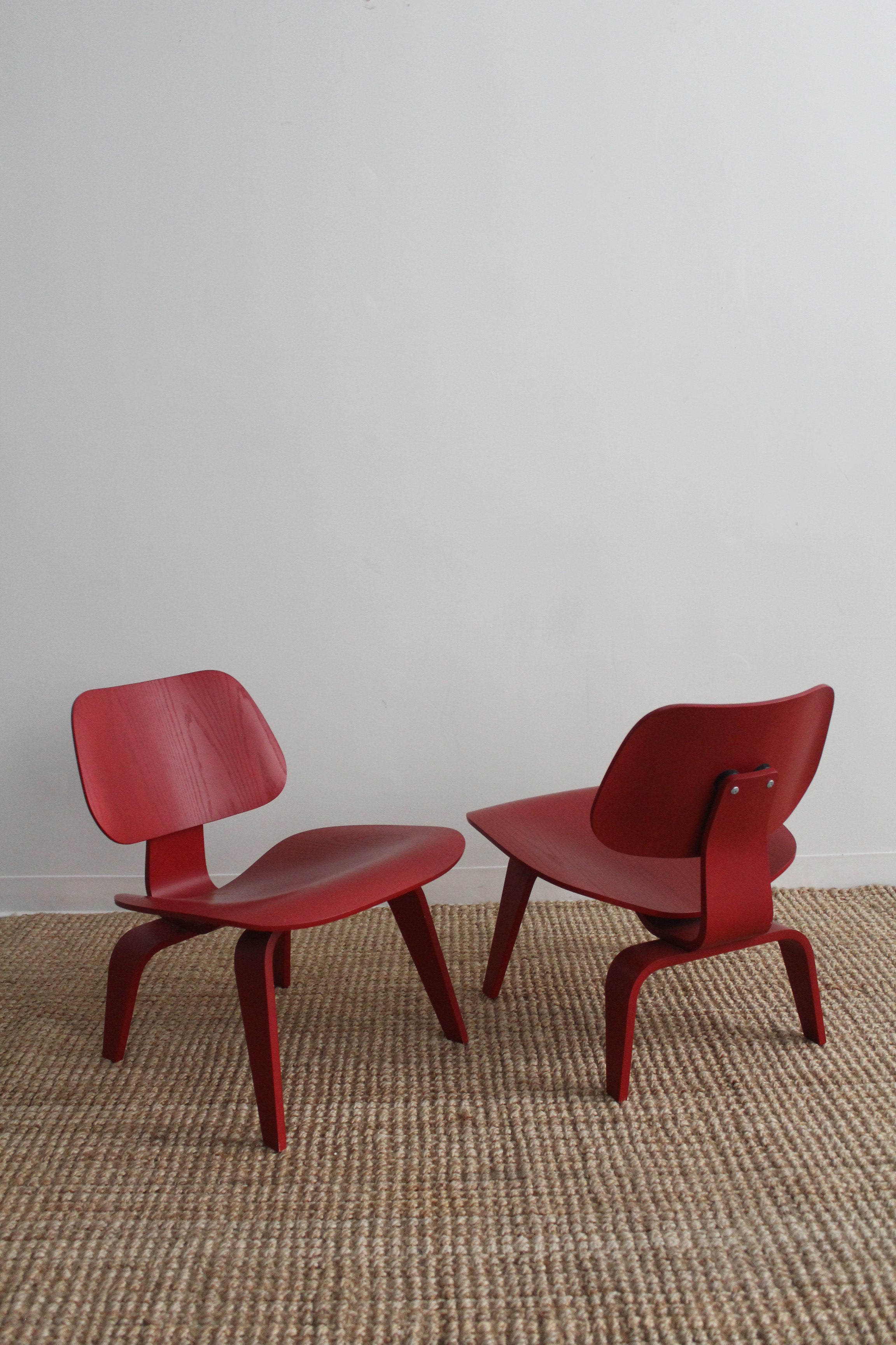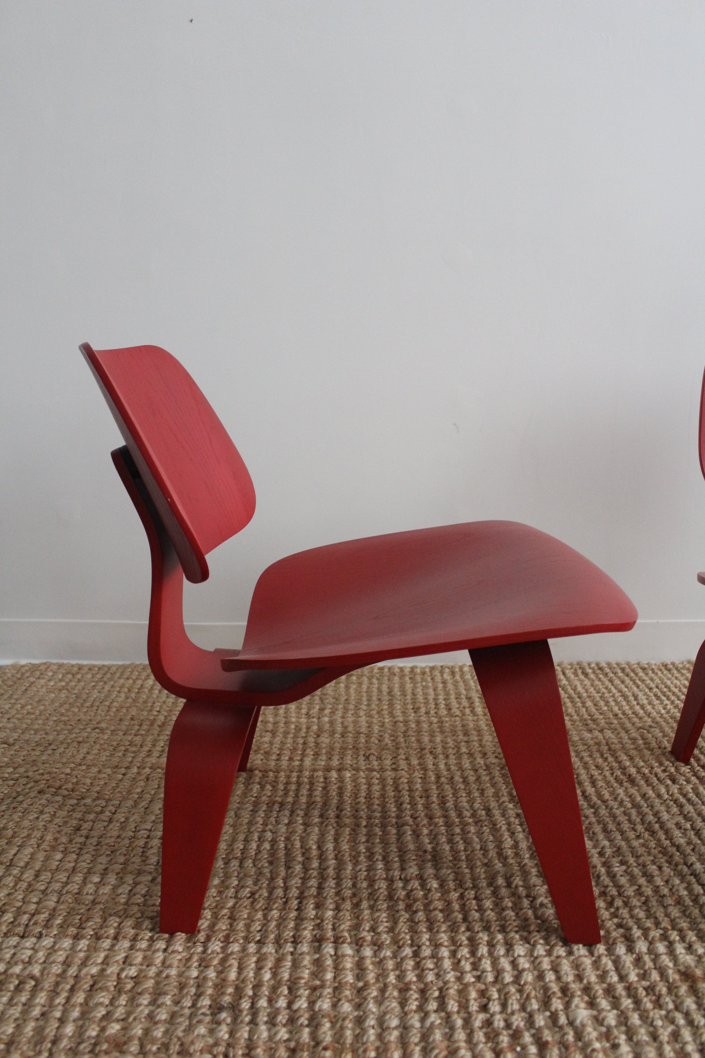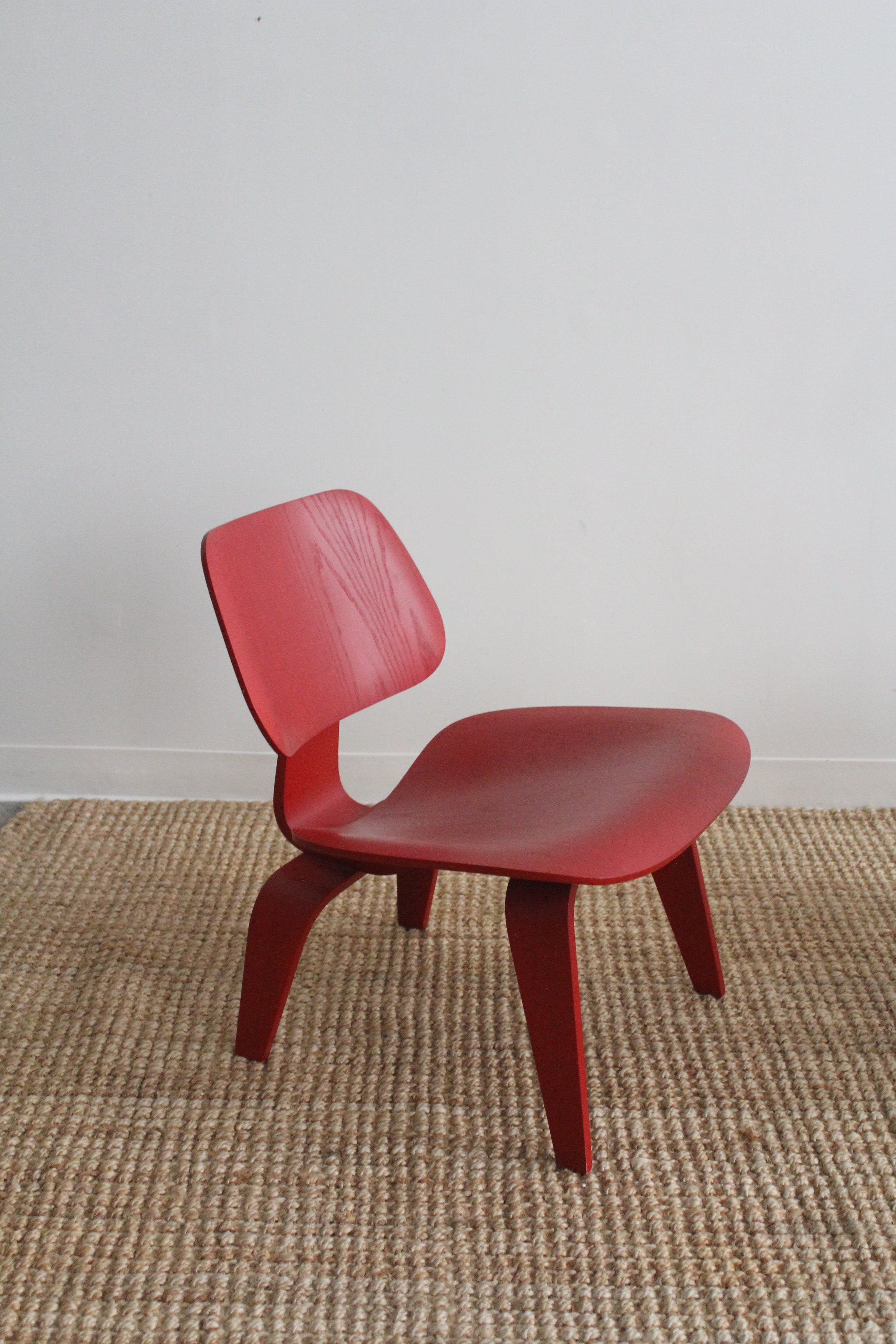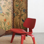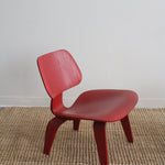 LCW Lounge Chair by Charles and Ray Eames for Herman Miller, 2007. This chair is amongst the most popular of Eames designs. Low-slung lounge chair made of molded plywood stained red, rubber shocks mounts on back.