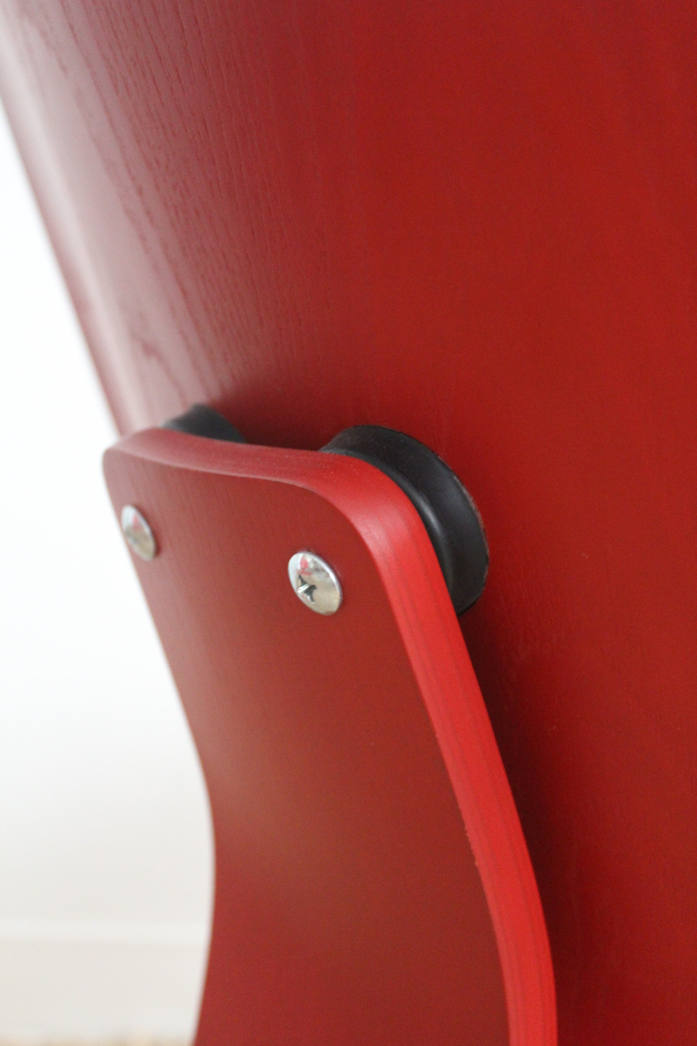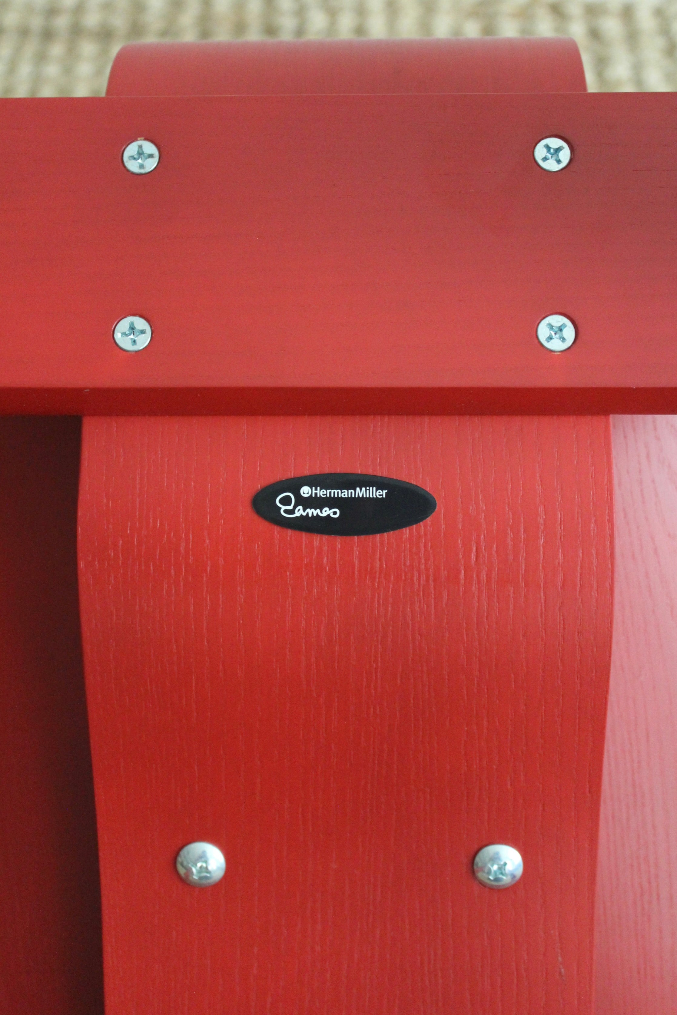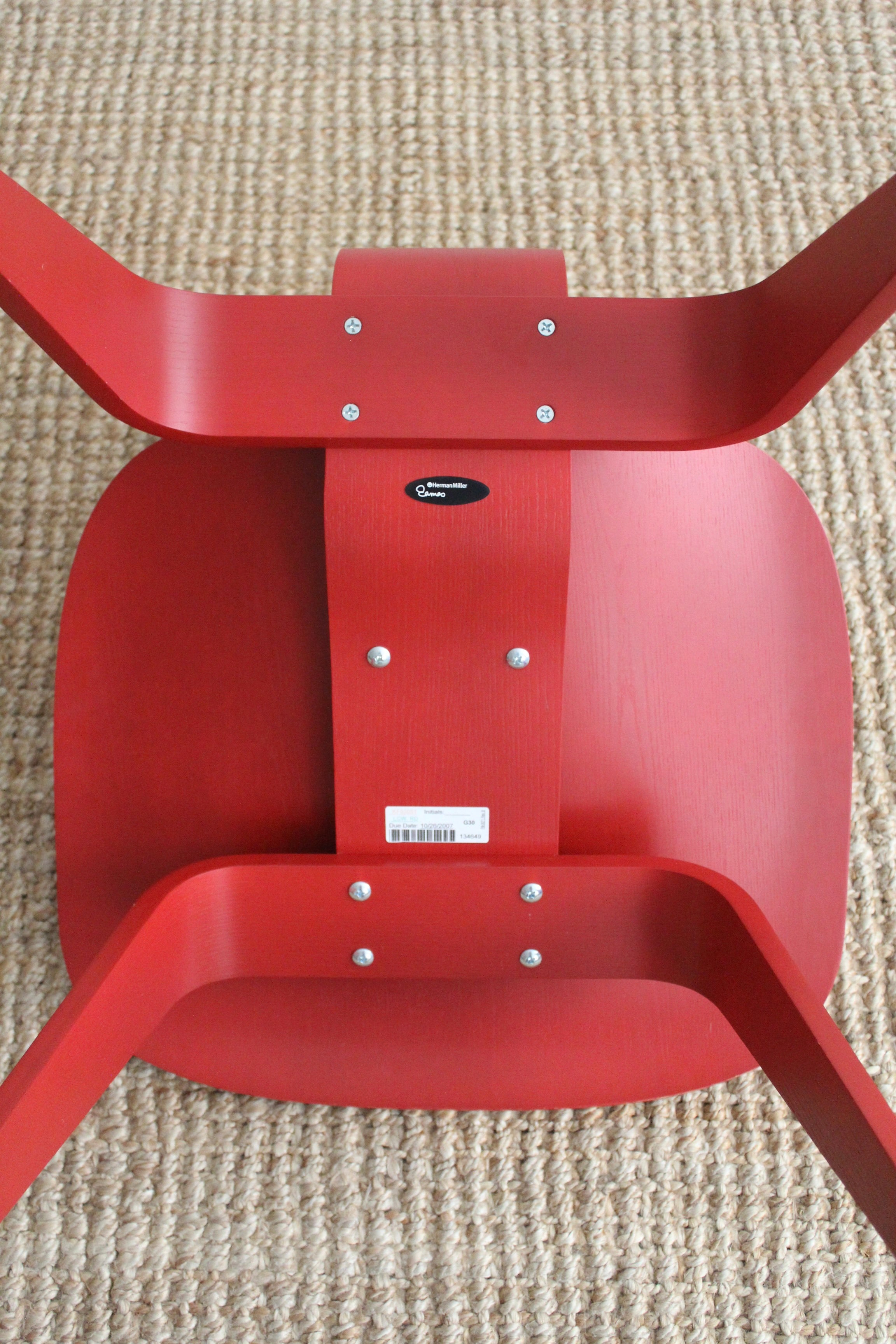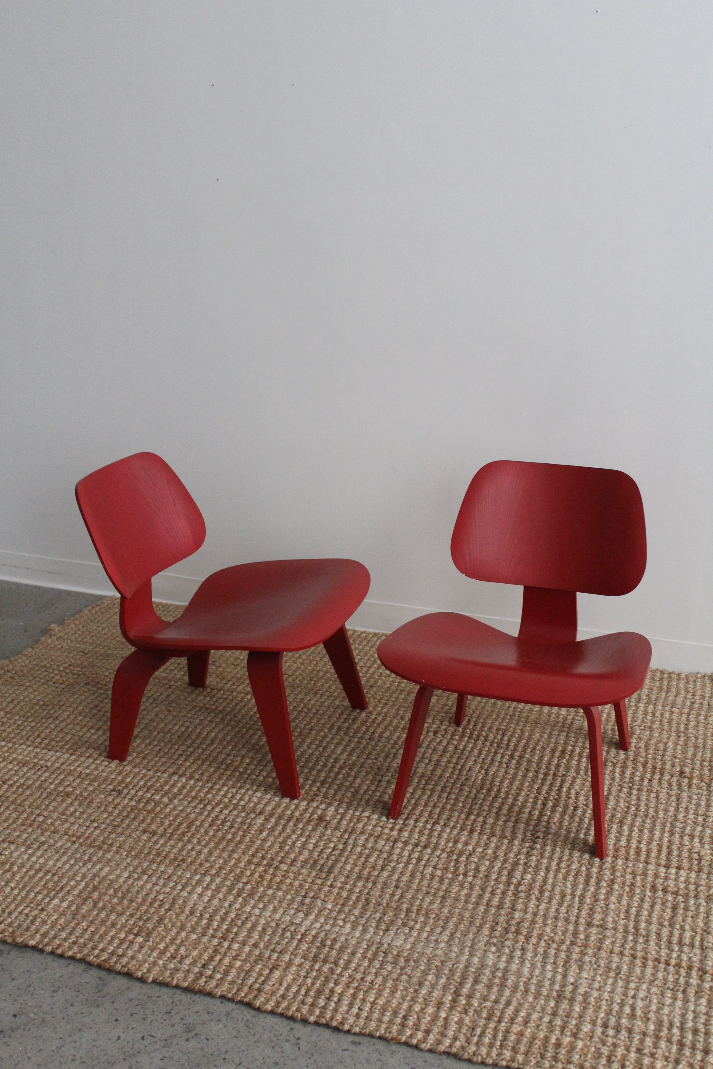 LCW Lounge Chair by Charles and Ray Eames for Herman Miller, 2007. This chair is amongst the most popular of Eames designs. Low-slung lounge chair made of molded plywood stained red, rubber shocks mounts on back.