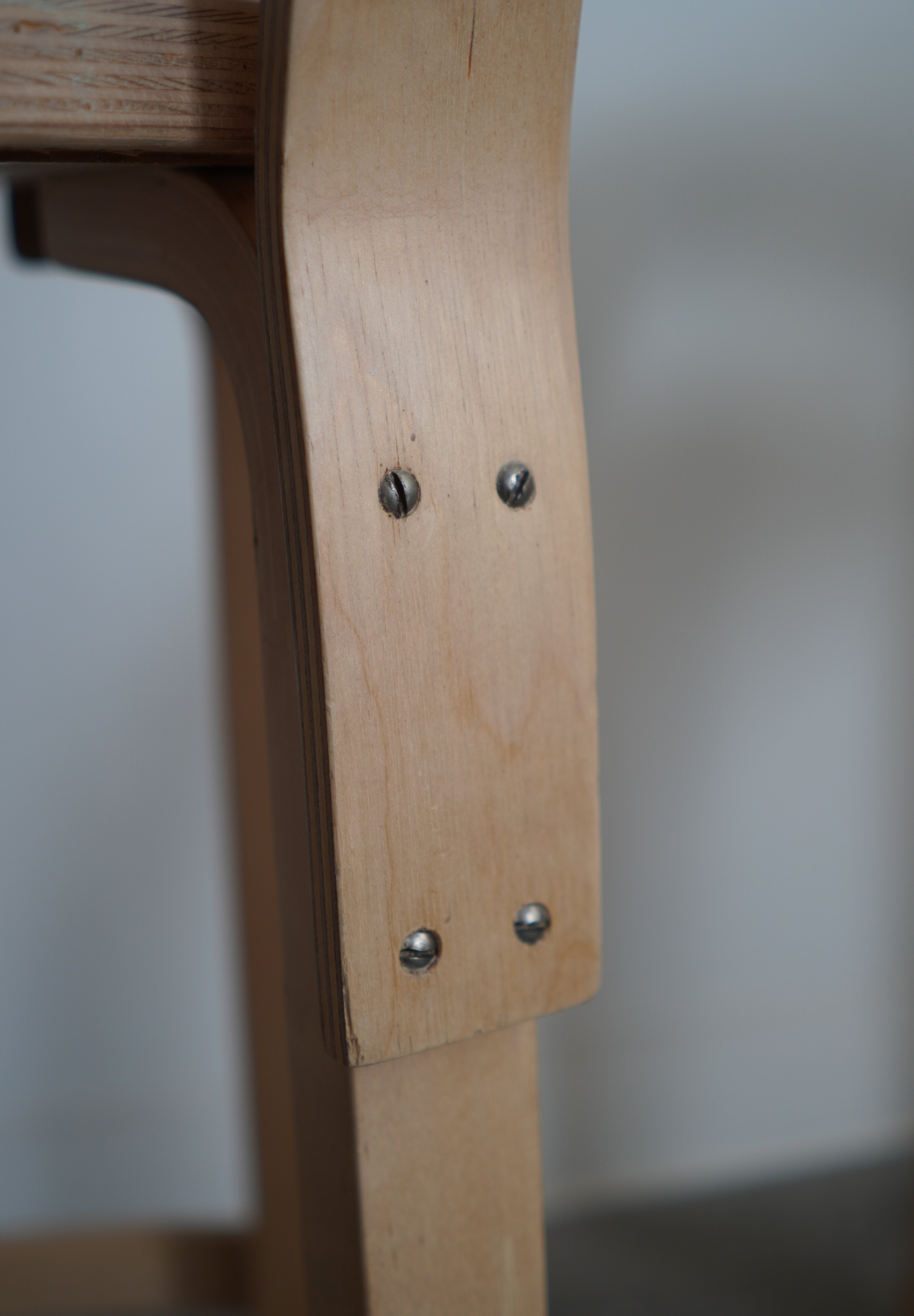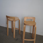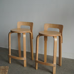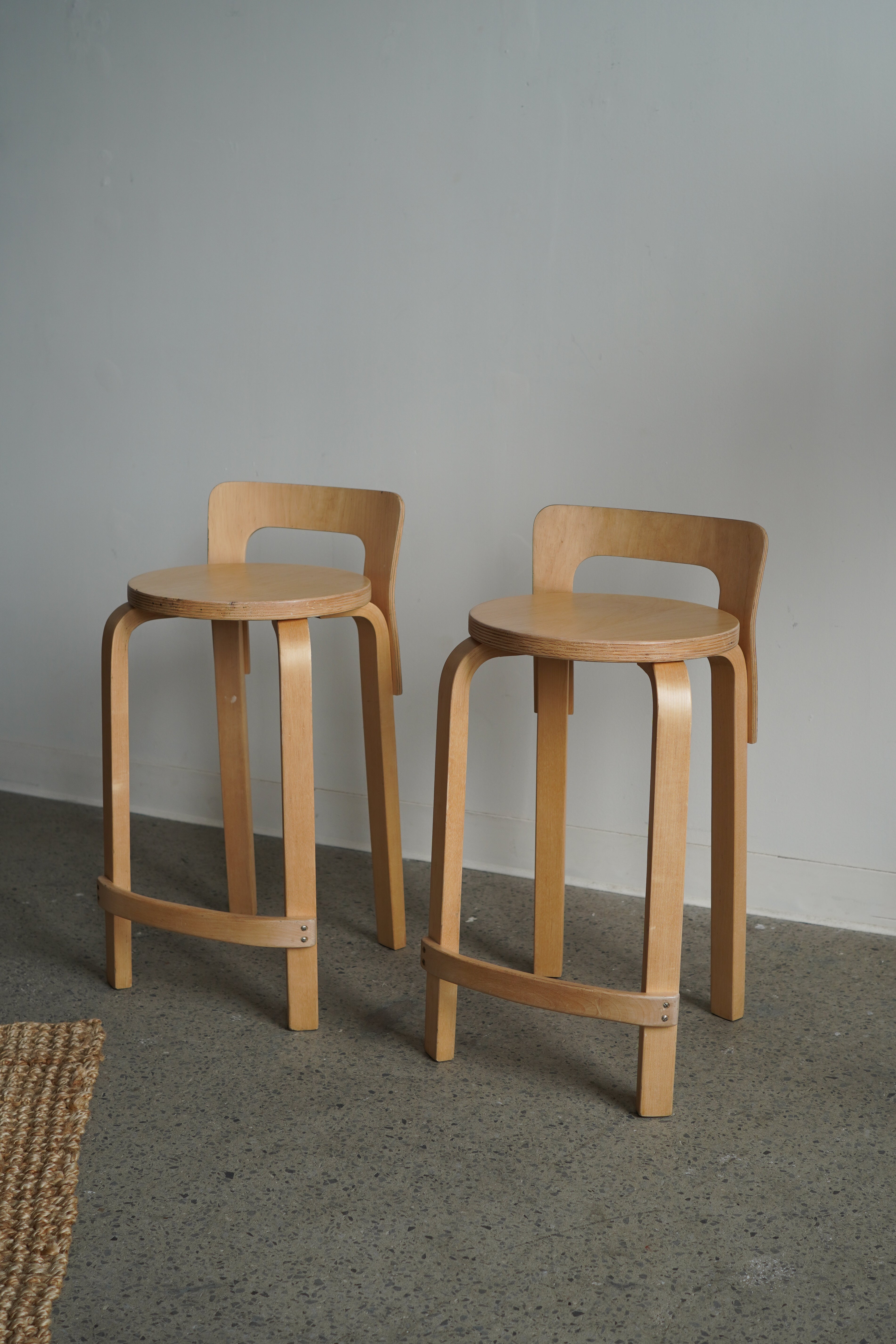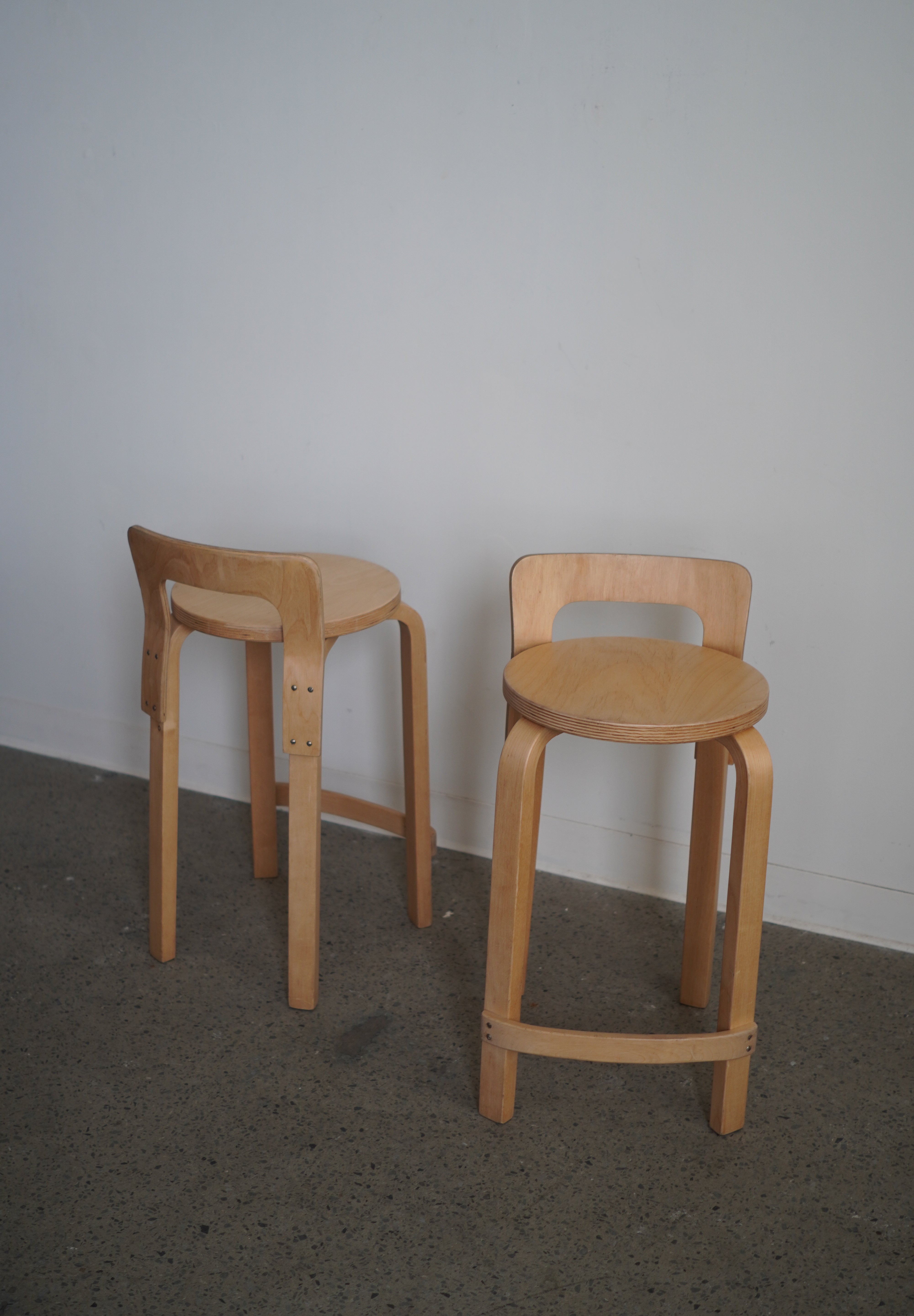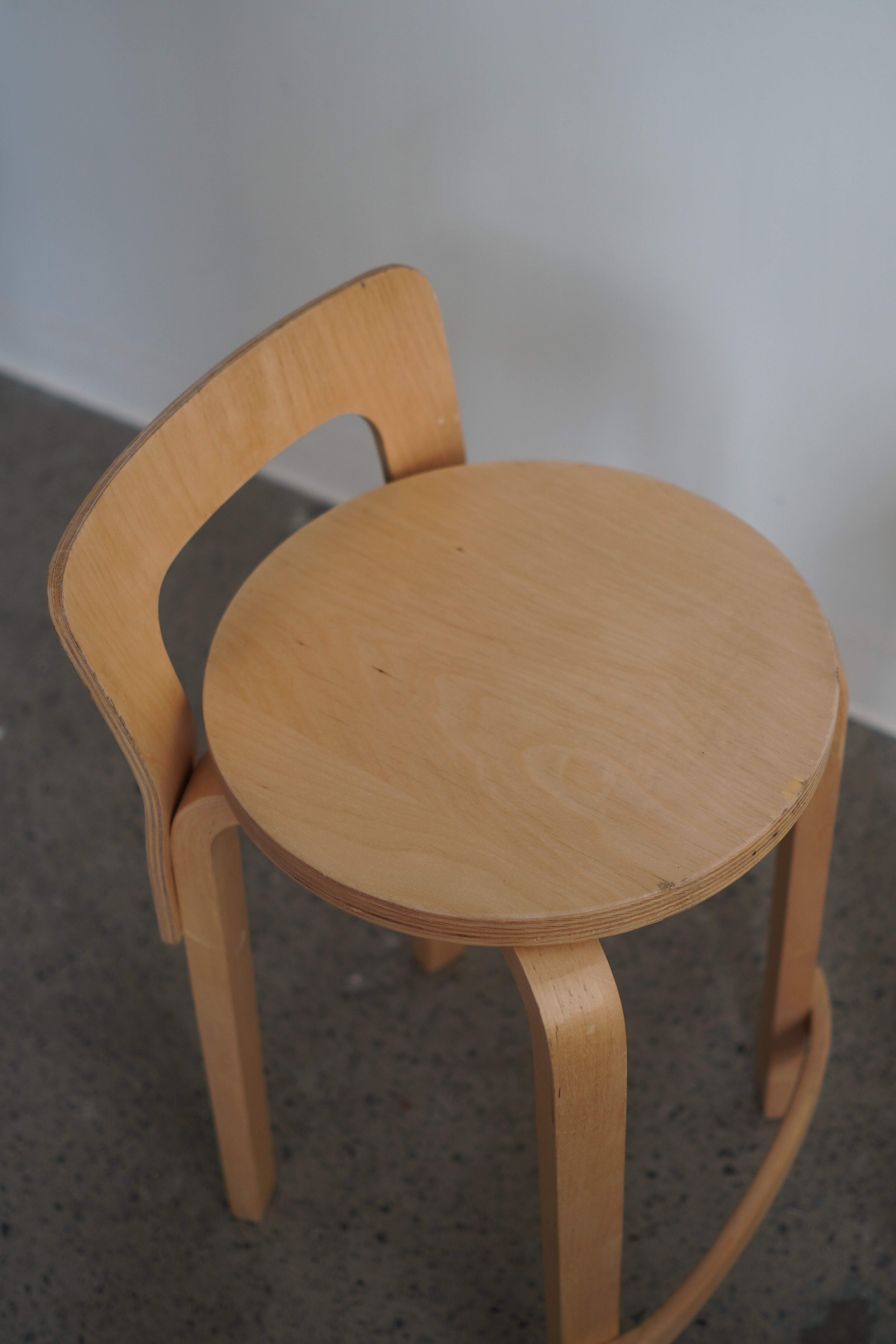 K65 High Chair Stools by Alvar Aalto for Artek, 1970s. The long-legged high chair is the optimum height for high-top tables and bar counters. Its low seat back offers just the right amount of back support, and its curved rail serves as the perfect foot rest. High Chair K65 has been part of the Artek range since the 1930s.