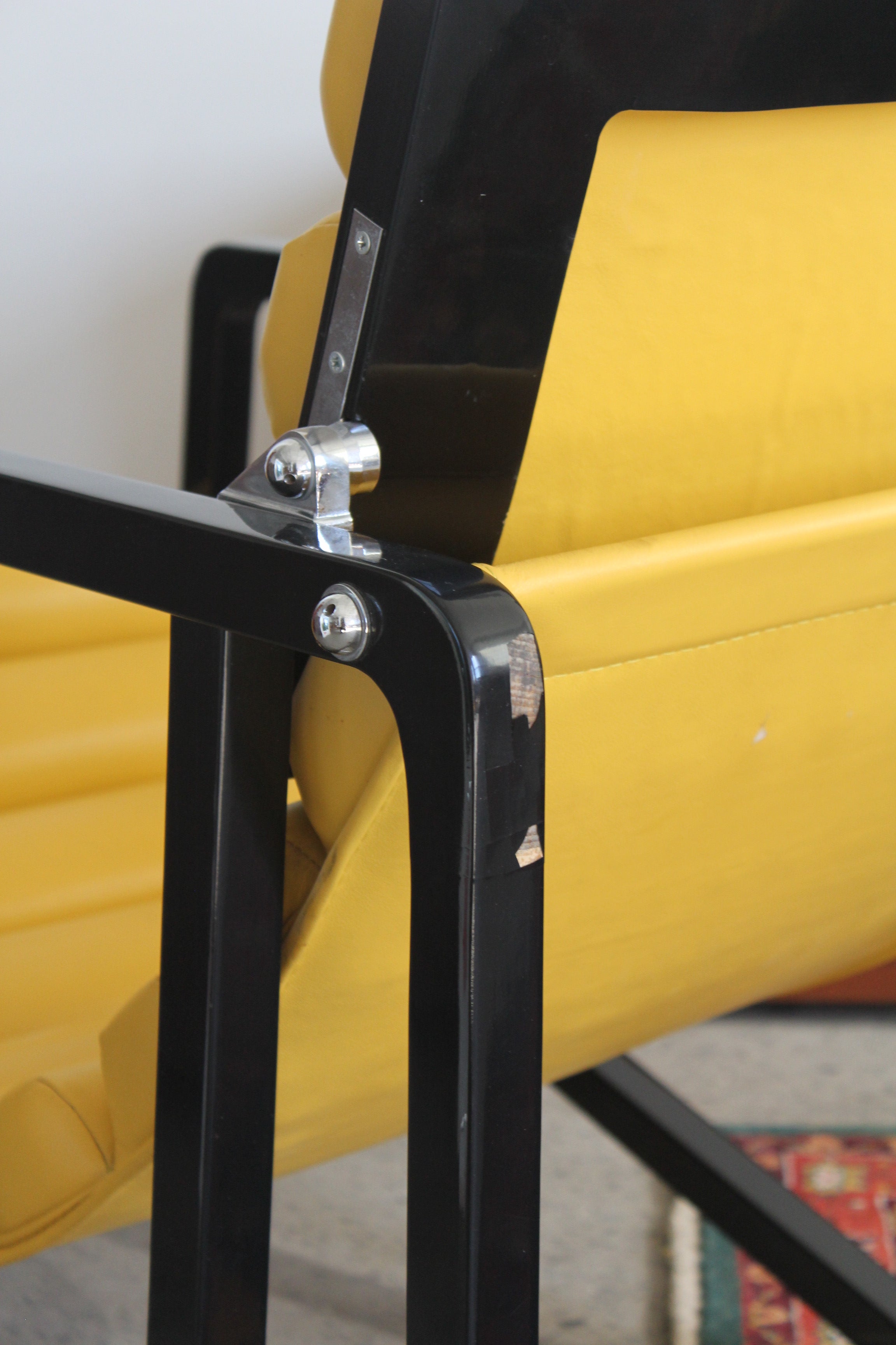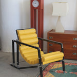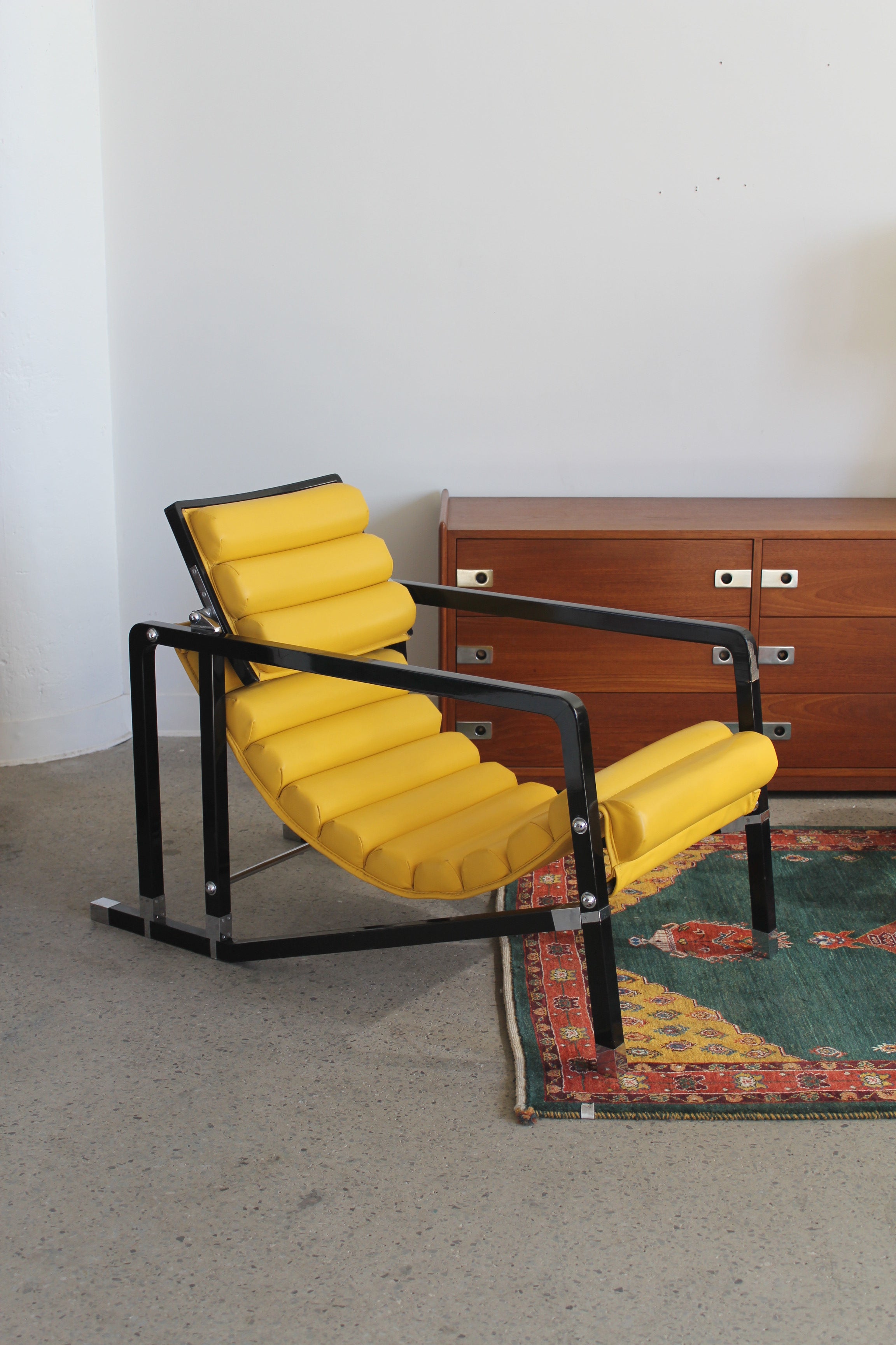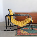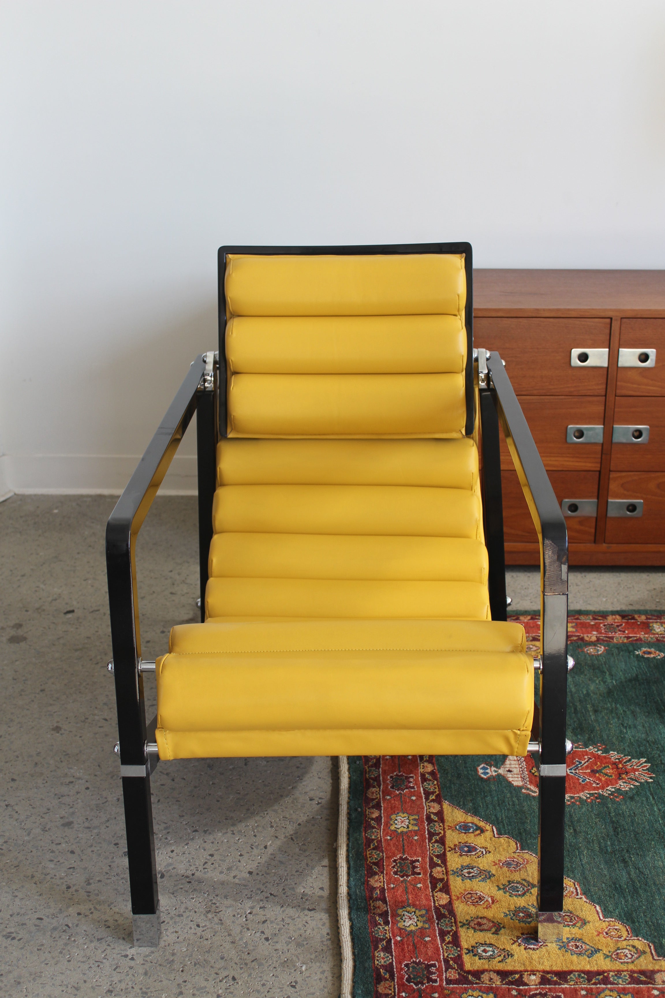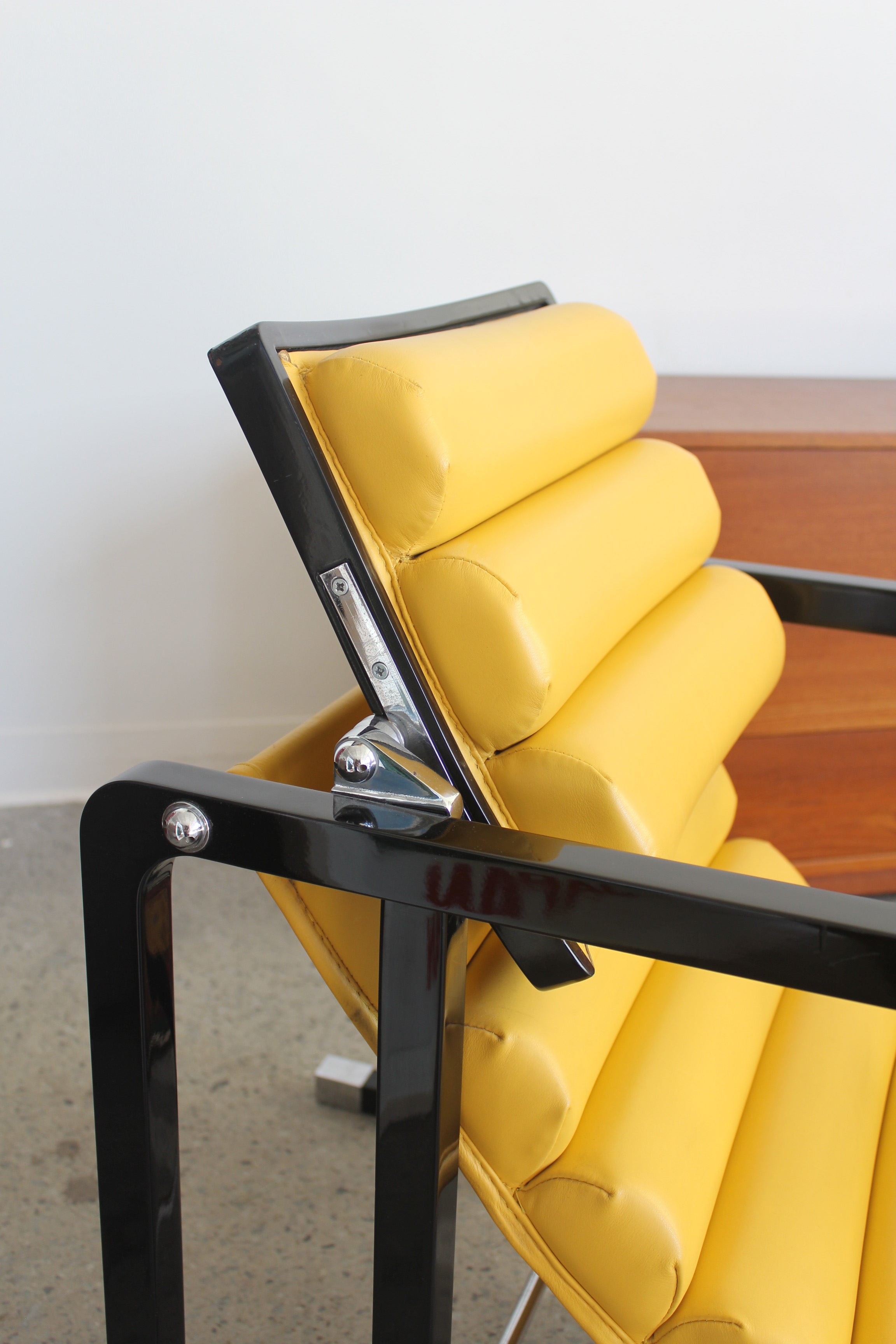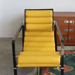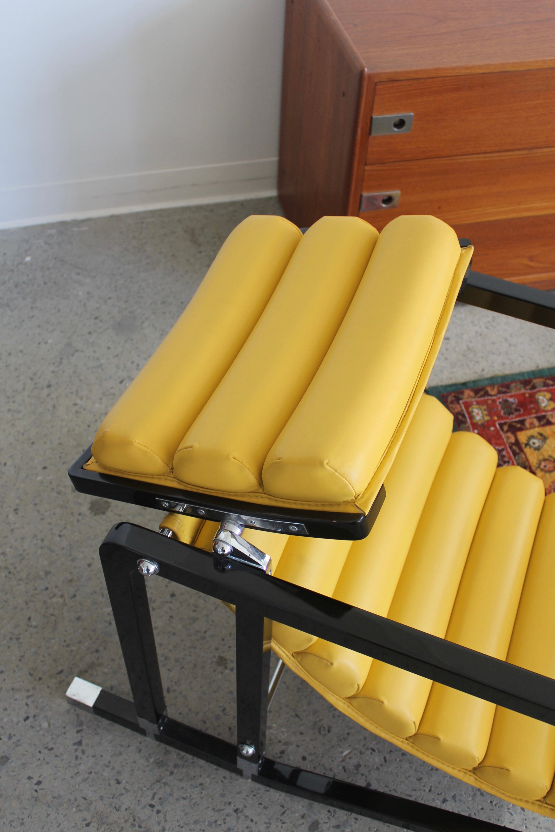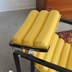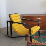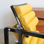Transat Lounge Chair by Eileen Gray for ECART International, 1980s. Black lacquered beech structure with an ajustable headrest, yellow leather upholstery, chrome joints and foot caps. This iconic design was inspired by the deckchairs used on ocean liner ships and was used on the terrace of Eileen's house E1027 at Roquebrune Cap Martin.