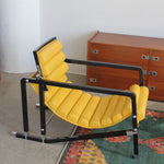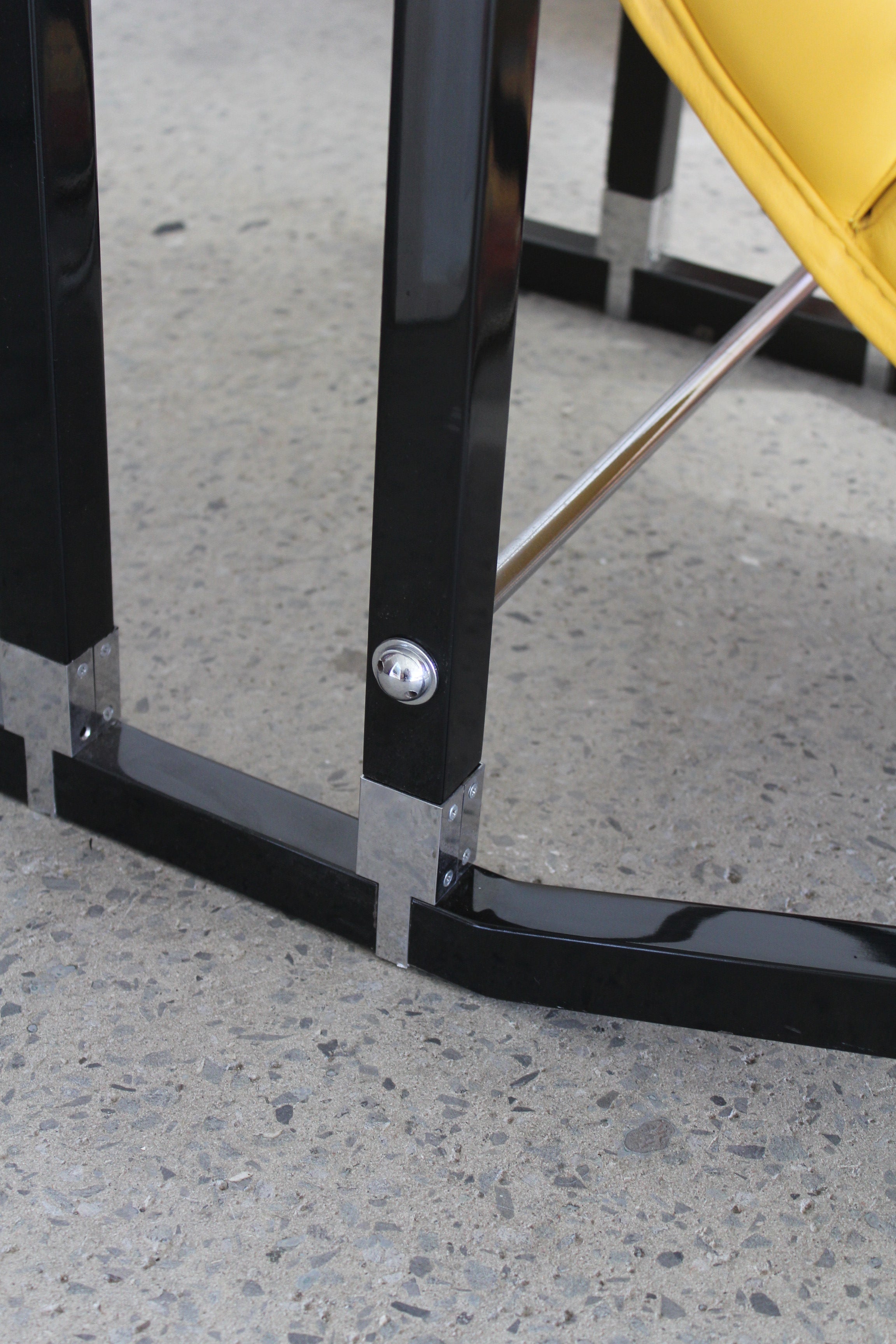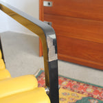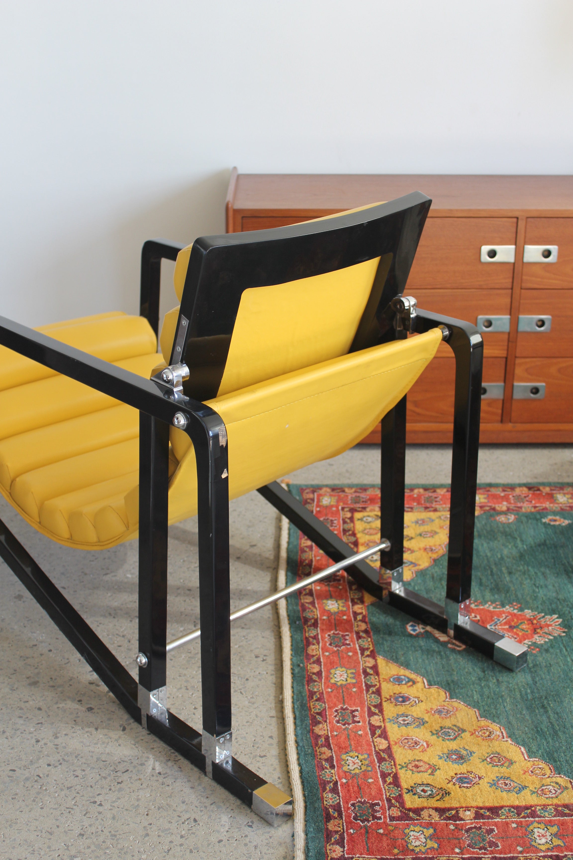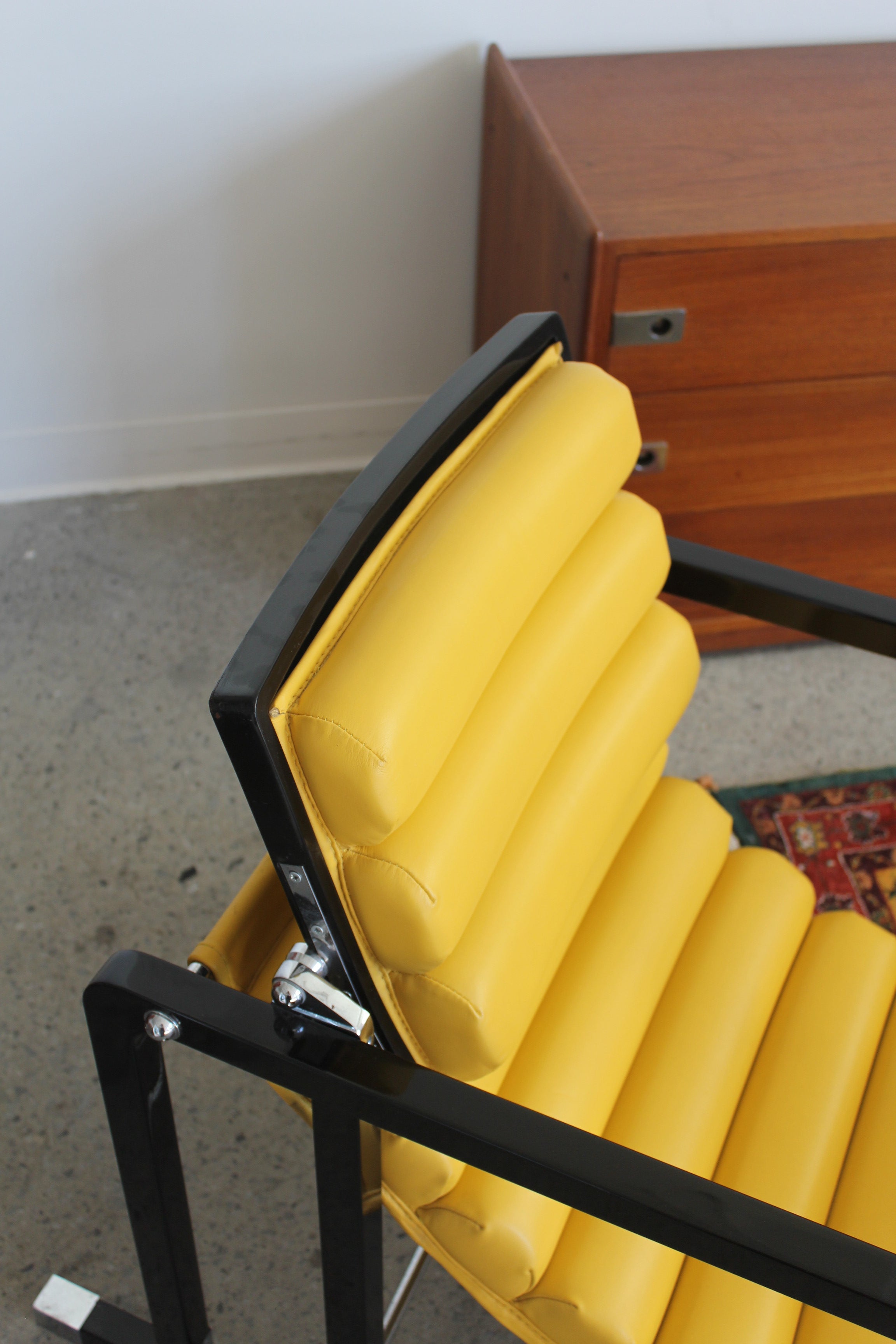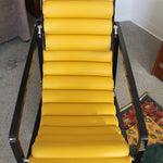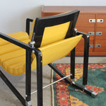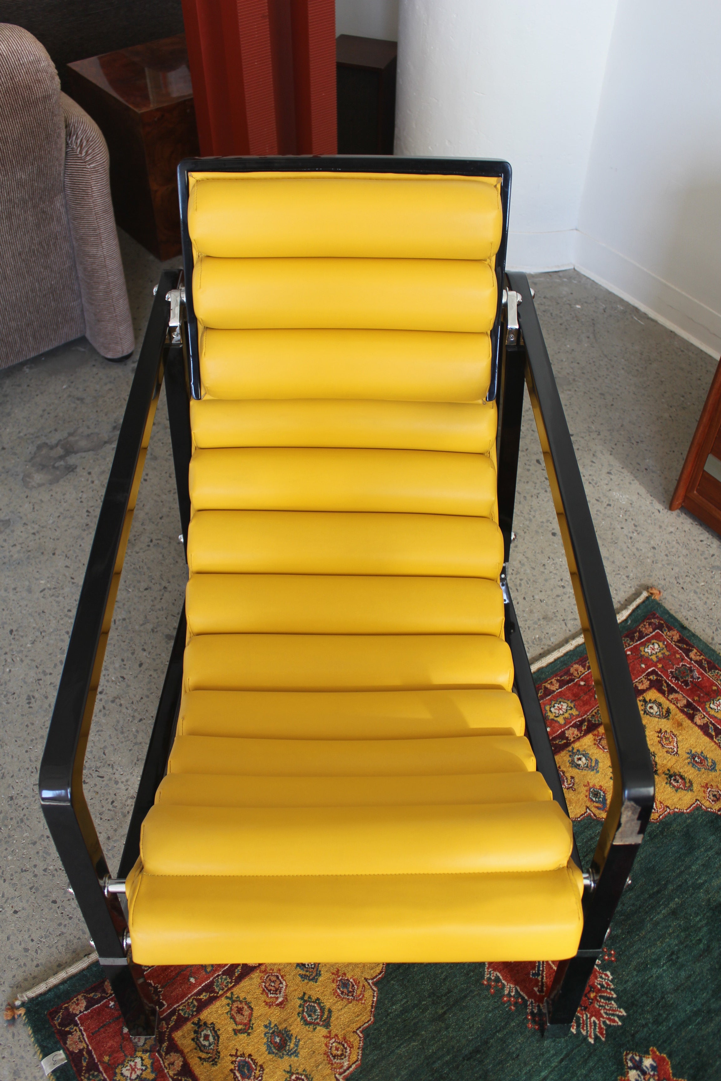 Transat Lounge Chair by Eileen Gray for ECART International, 1980s. Black lacquered beech structure with an ajustable headrest, yellow leather upholstery, chrome joints and foot caps. This iconic design was inspired by the deckchairs used on ocean liner ships and was used on the terrace of Eileen's house E1027 at Roquebrune Cap Martin.