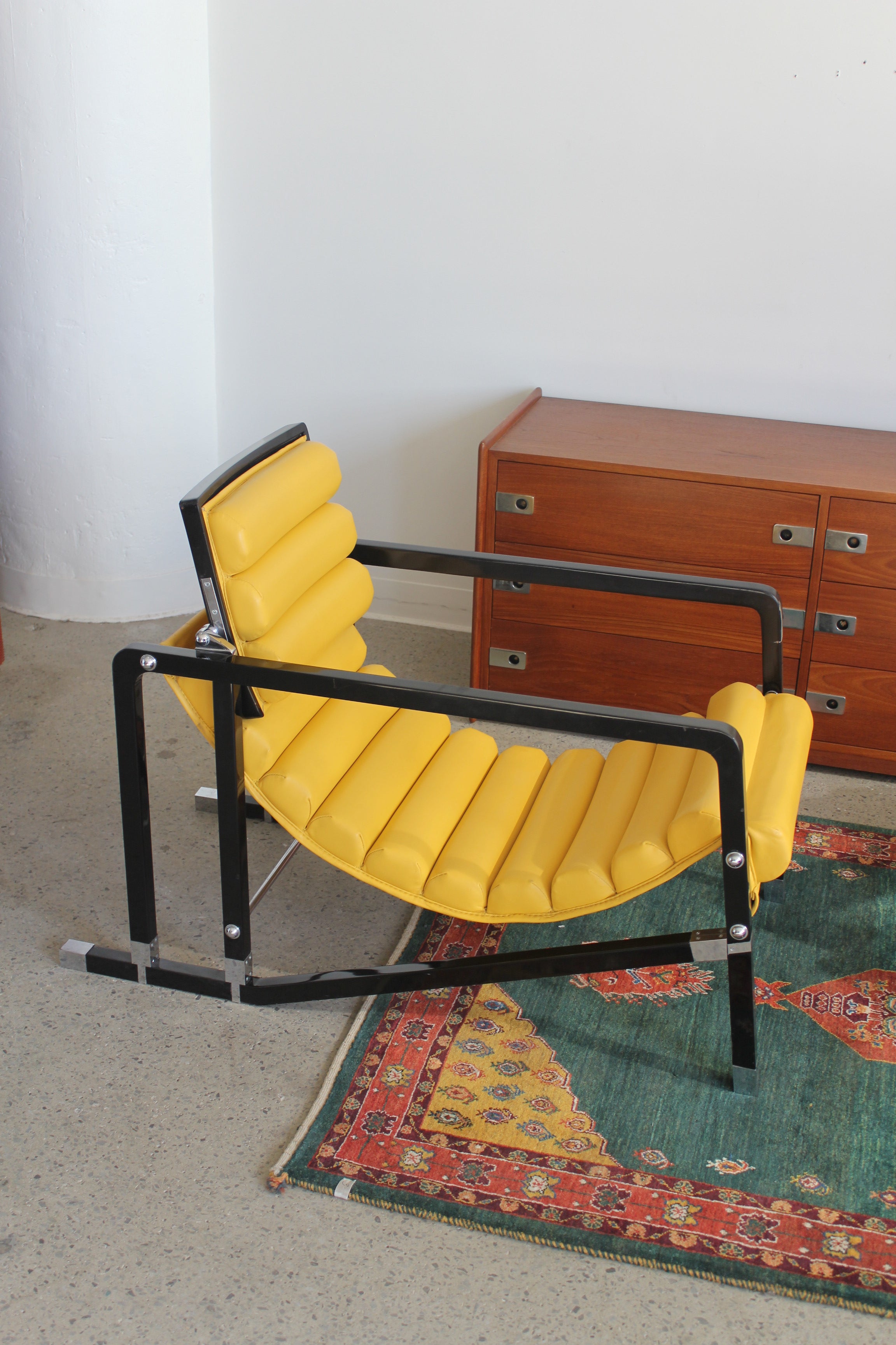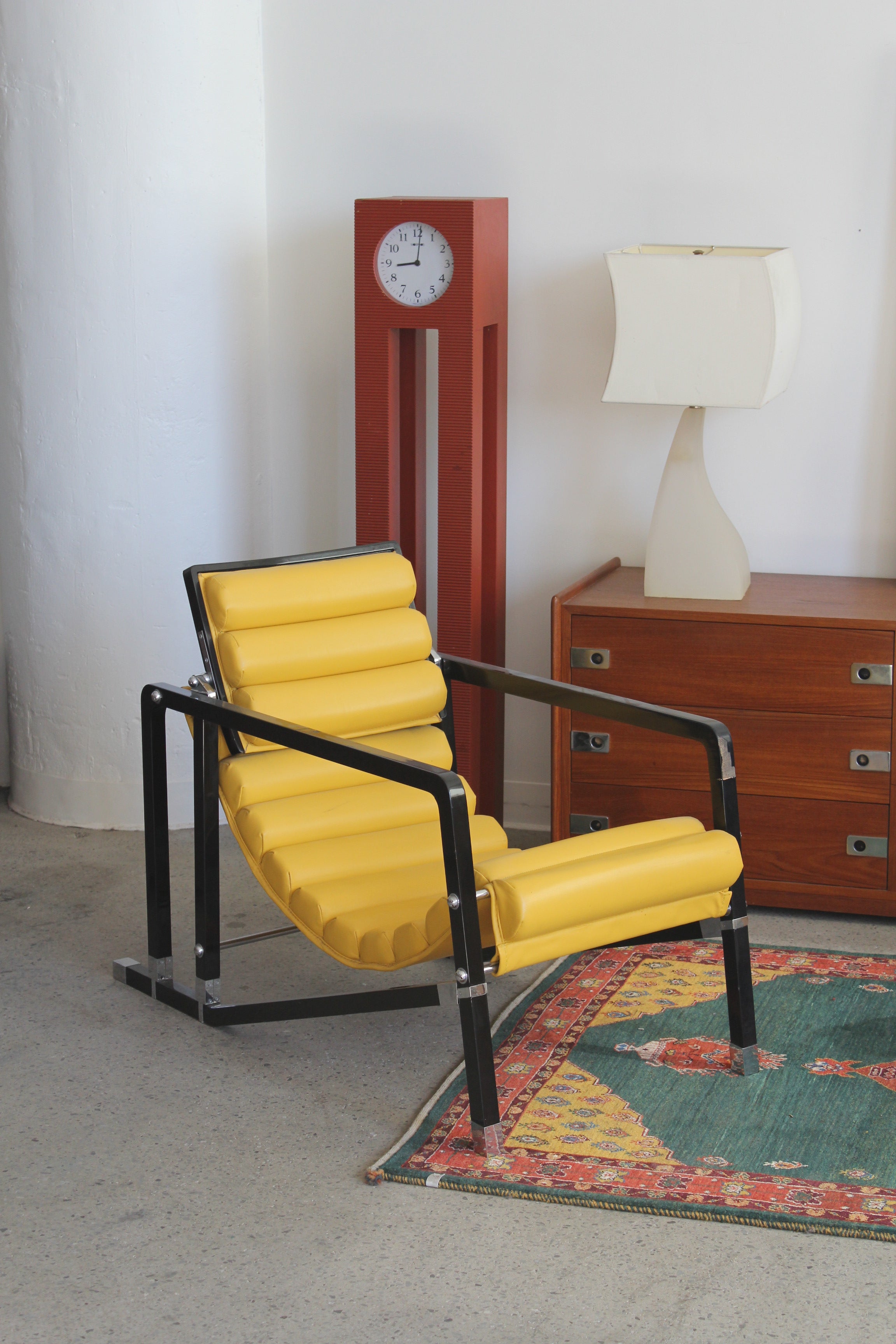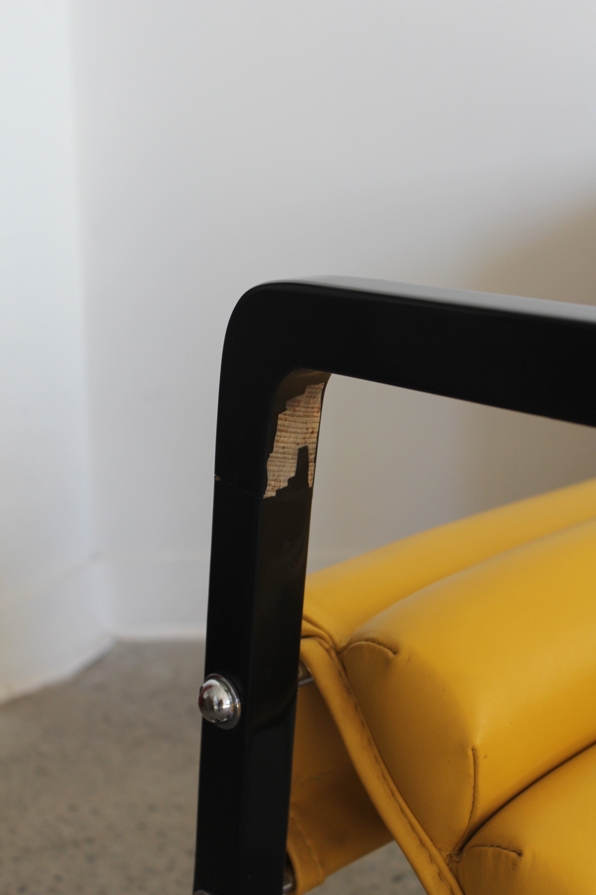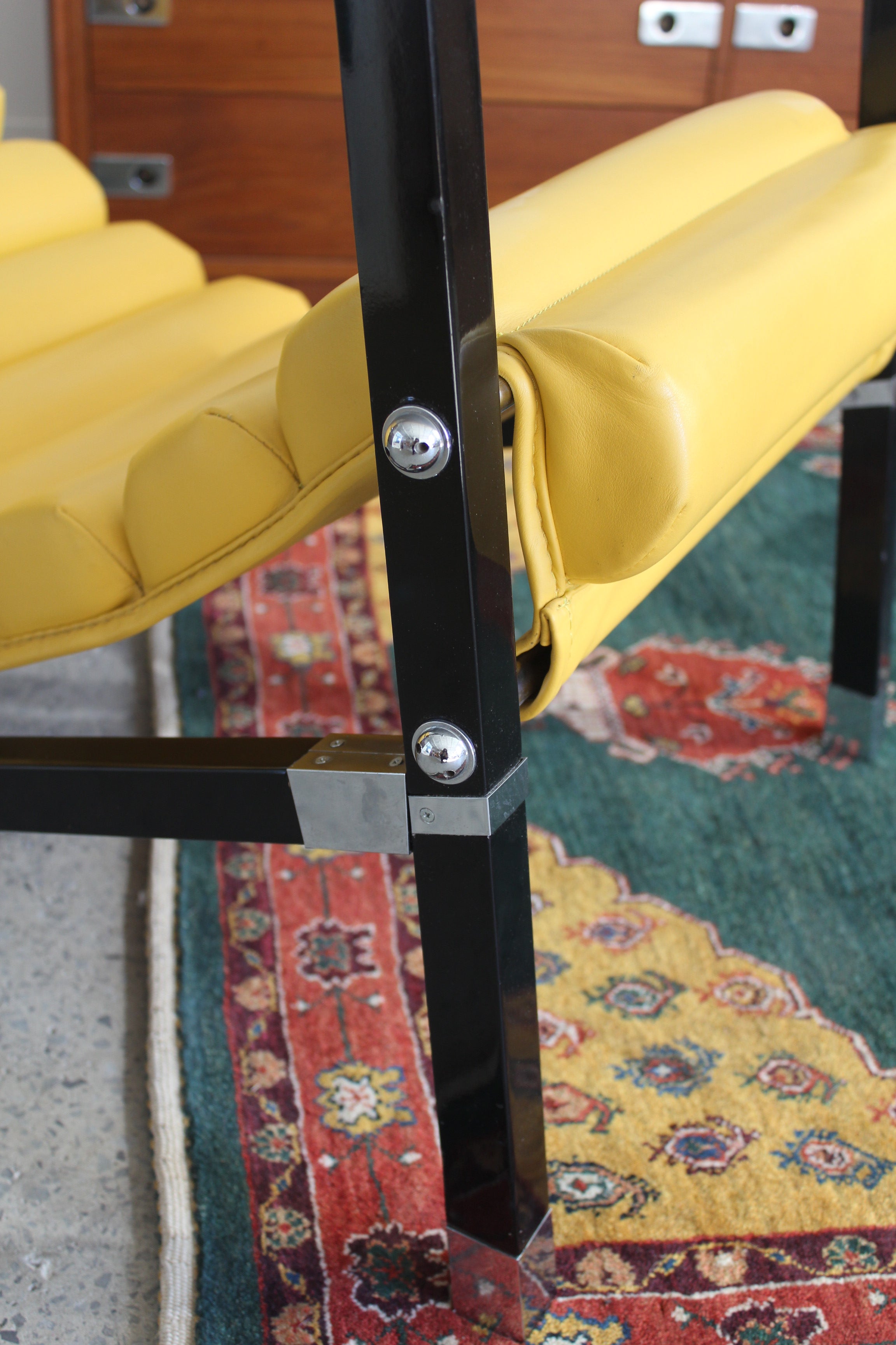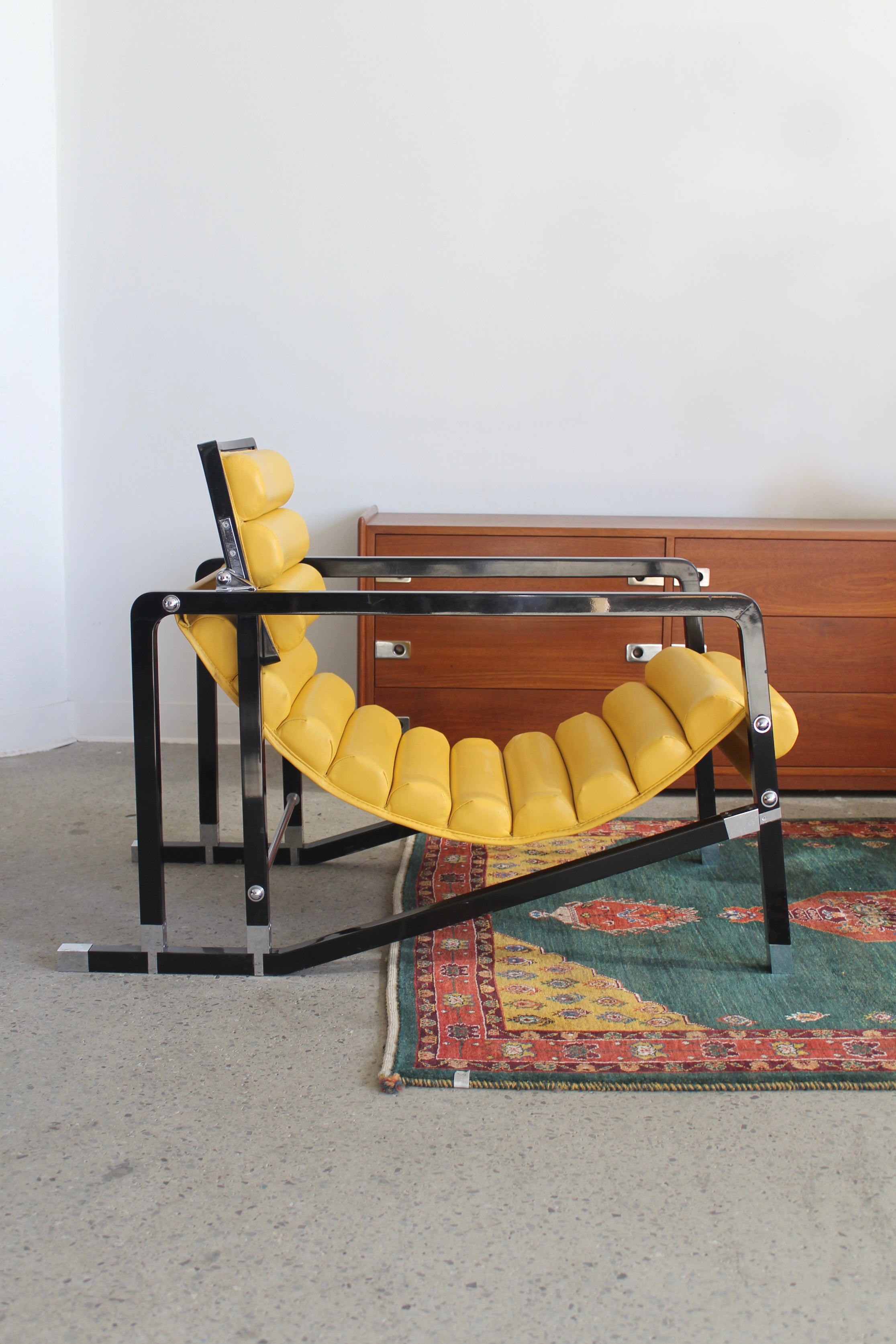 Transat Lounge Chair by Eileen Gray for ECART International, 1980s. Black lacquered beech structure with an ajustable headrest, yellow leather upholstery, chrome joints and foot caps. This iconic design was inspired by the deckchairs used on ocean liner ships and was used on the terrace of Eileen's house E1027 at Roquebrune Cap Martin.