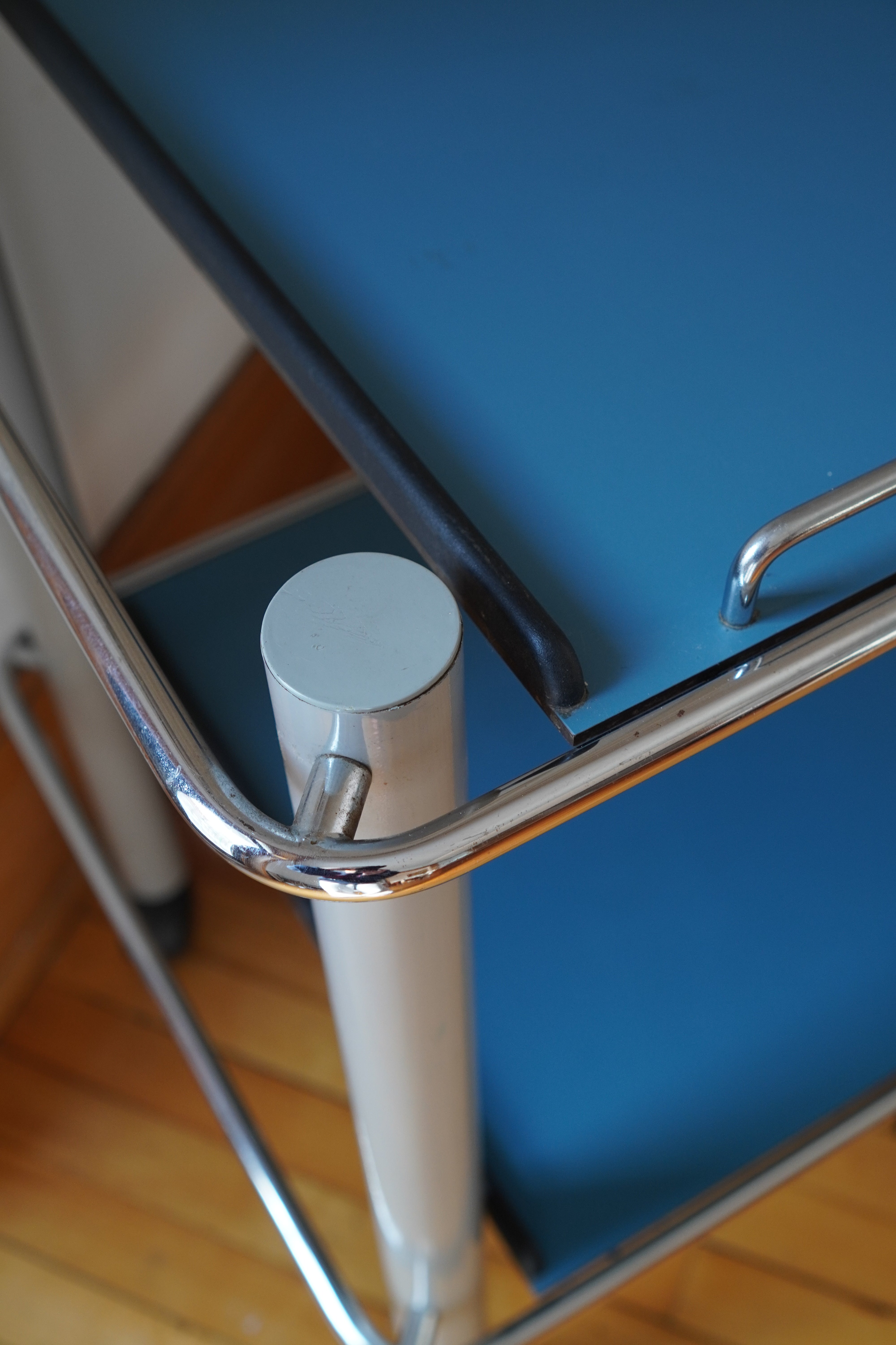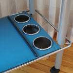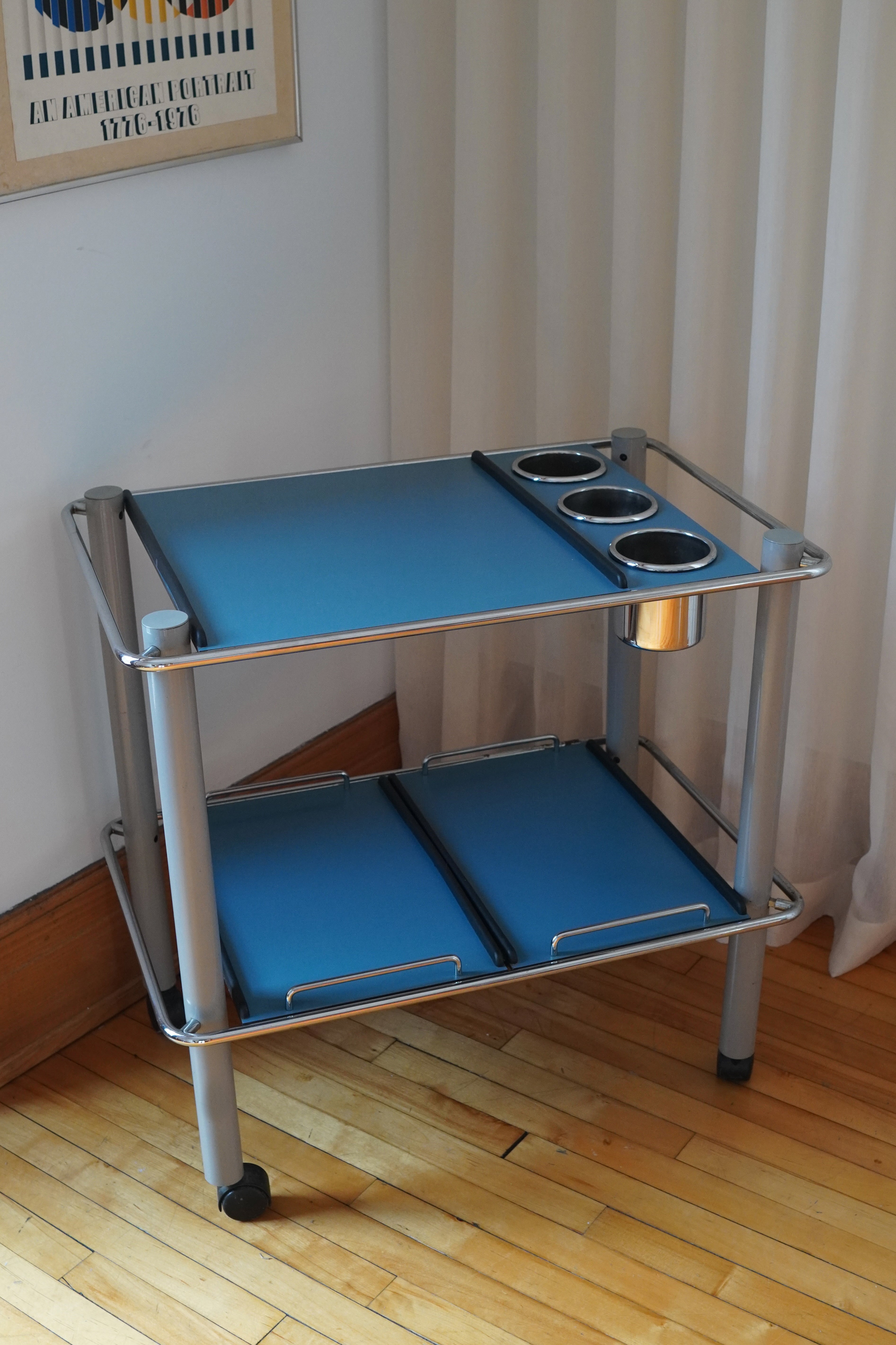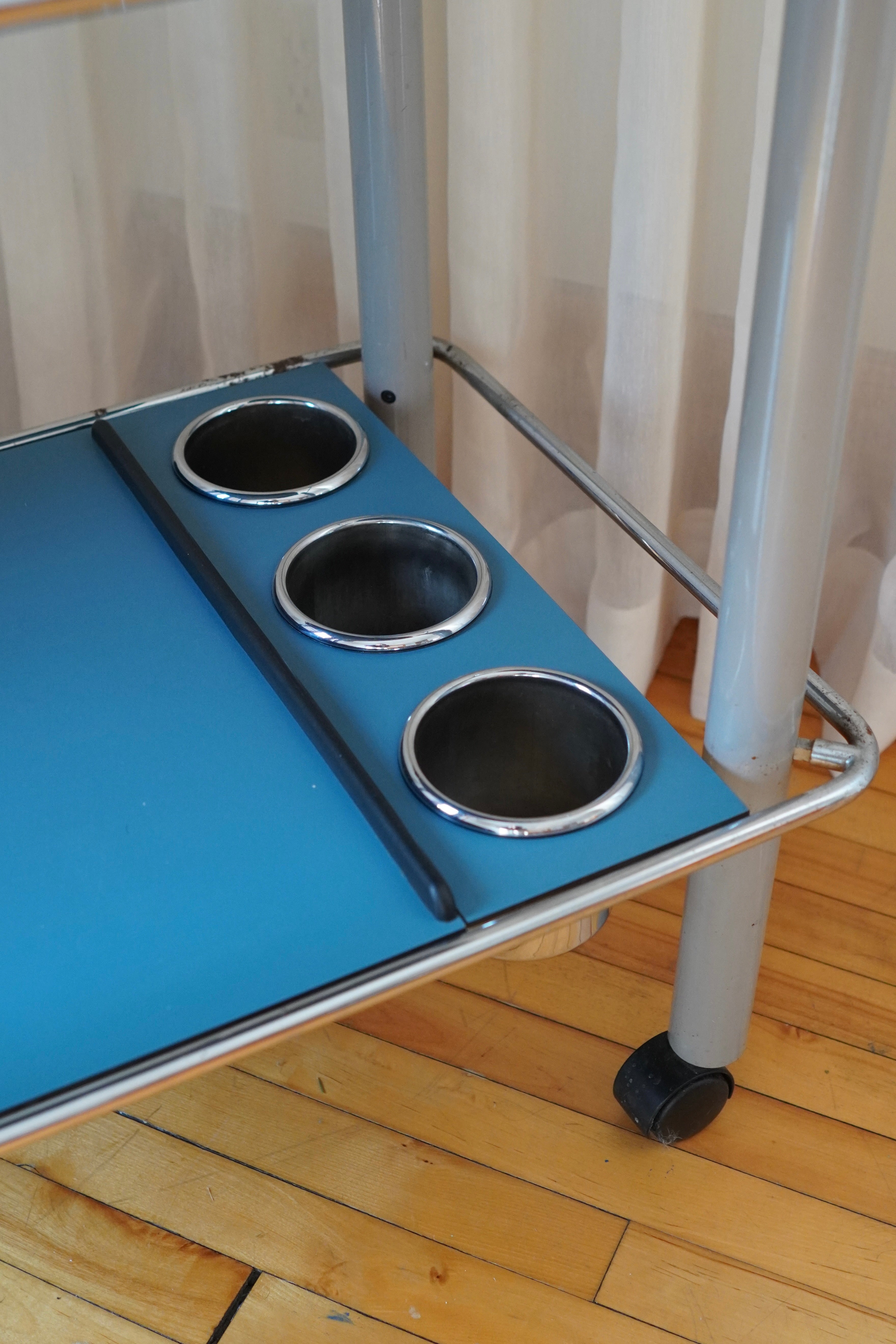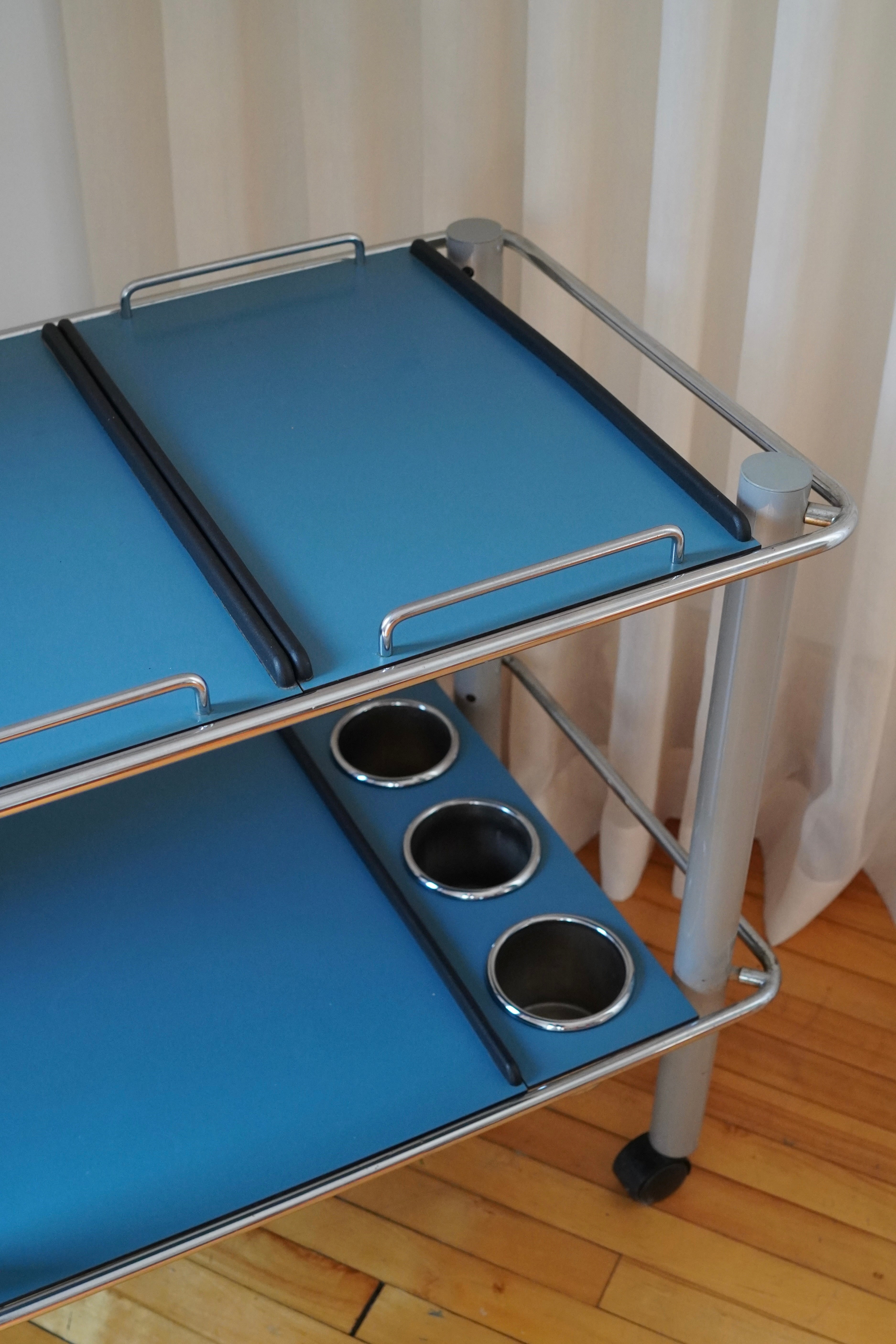 Serving Trolley by Bieffeplast Padova, made in Italy, 1970s. Very rare bar cart made of lacquered stainless steel; blue trays with grey legs, chrome accents and castor wheels. Includes two narrow trays, one larger tray and a bottle holders - trays are removable and interchangeable.