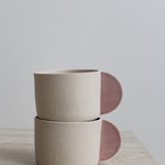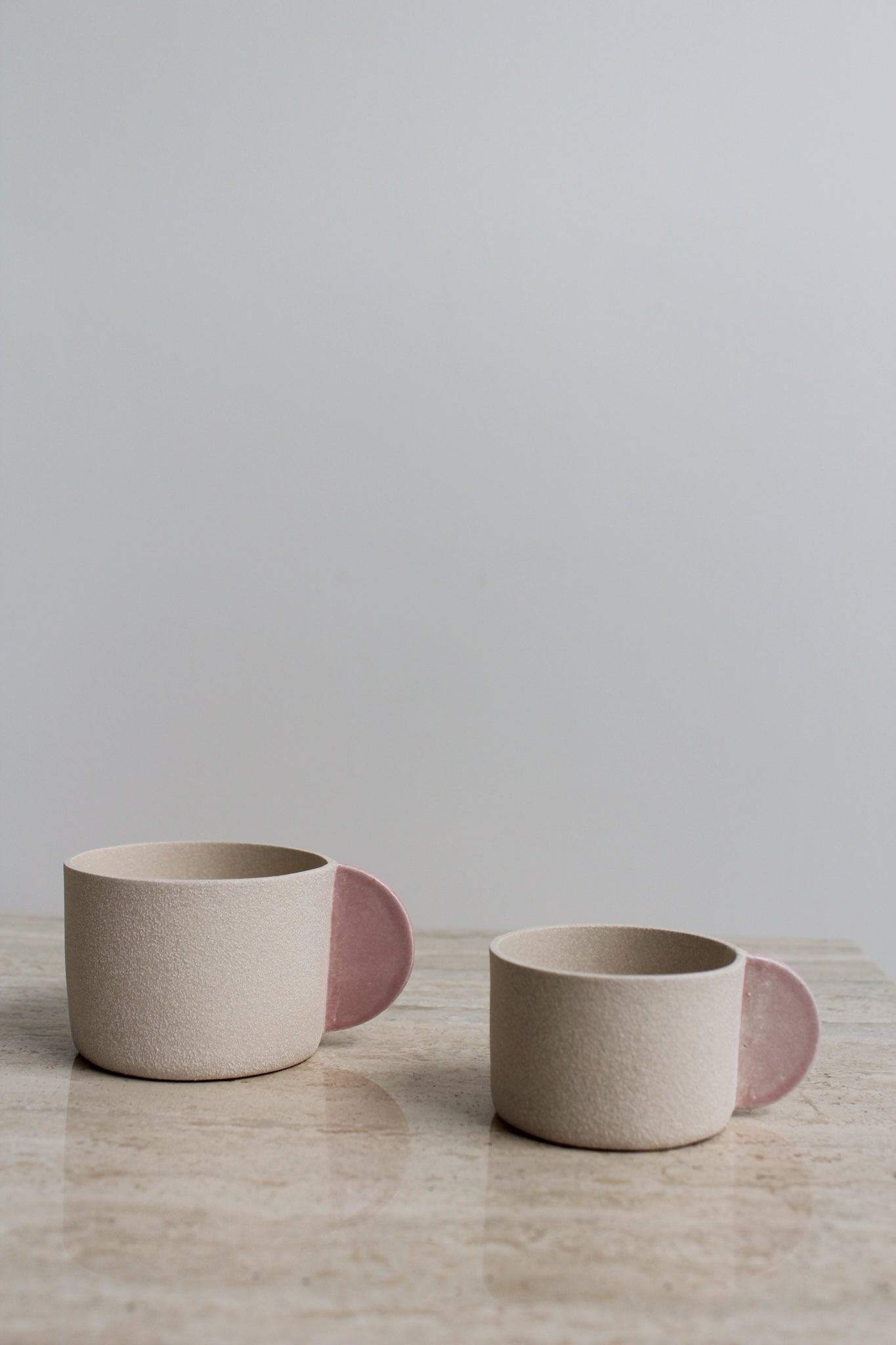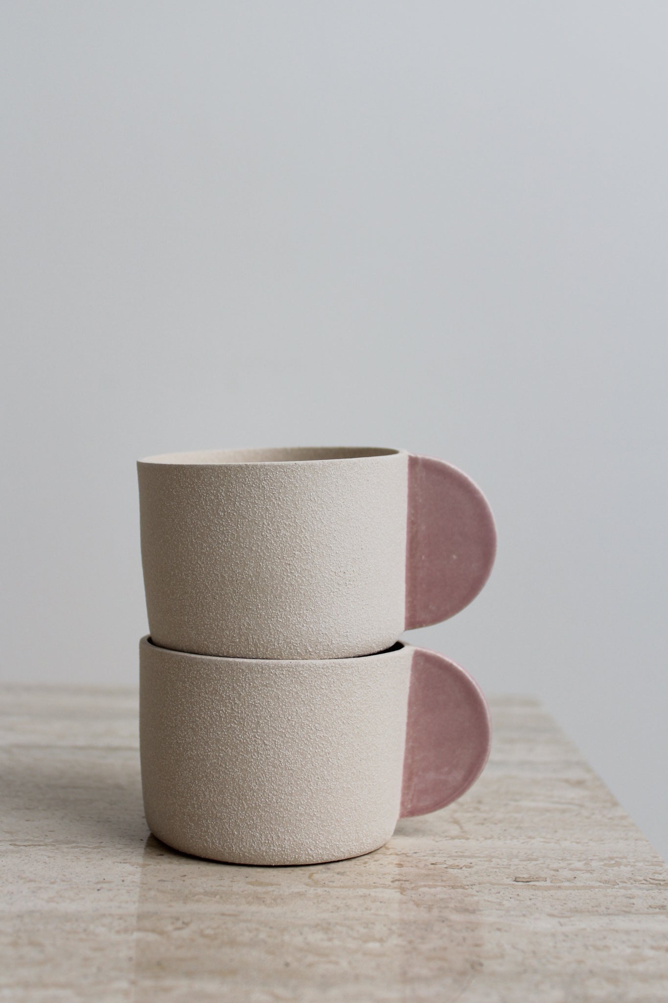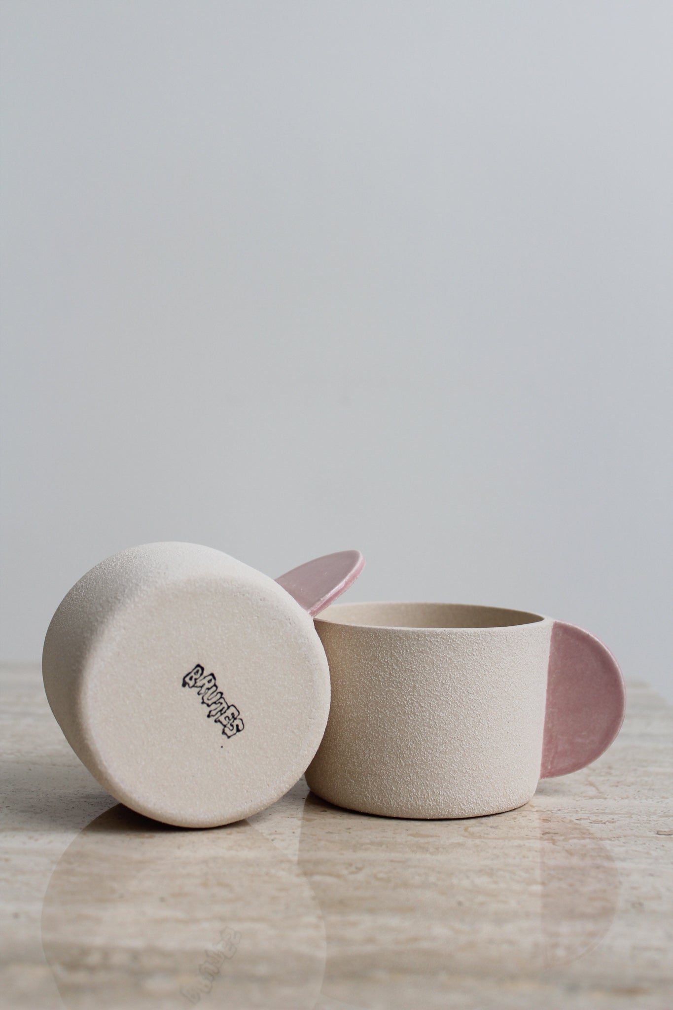 Grès texturé beige, avec glaçure transparente brillante à l'intérieur et anse en forme de demi-cercle rose émaillée. Chaque tasse porte le estampillage BRUTES sur la base.