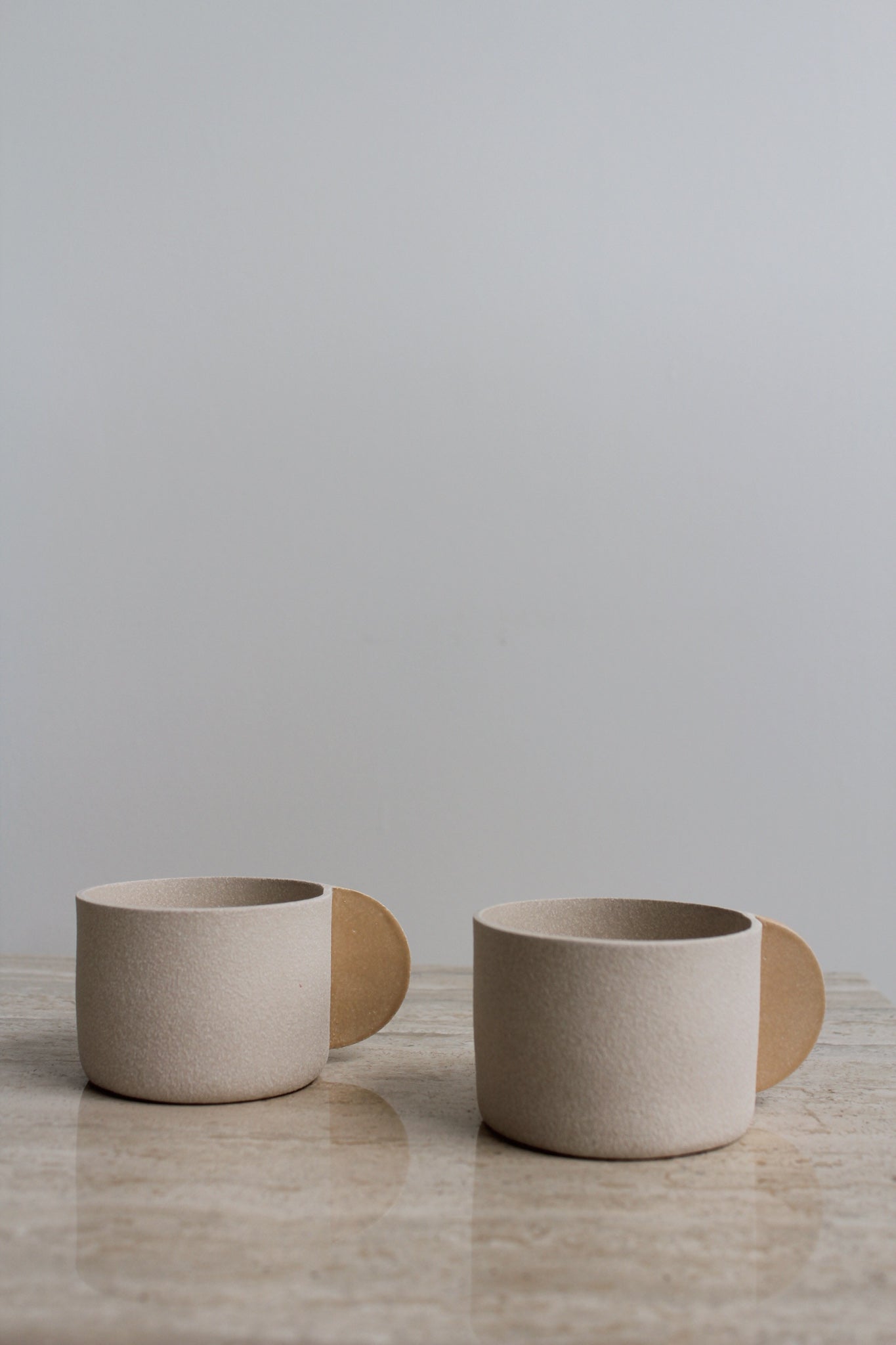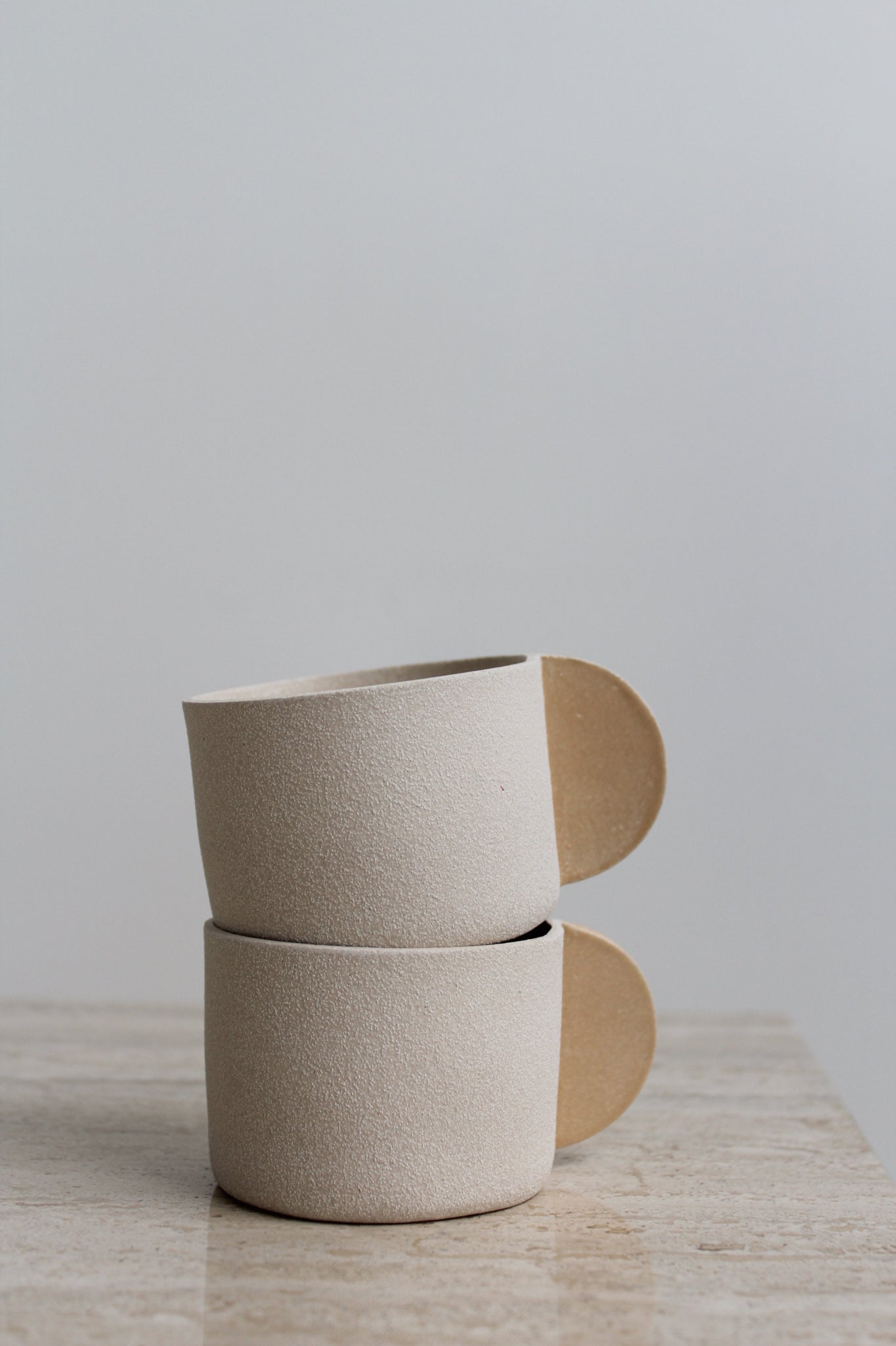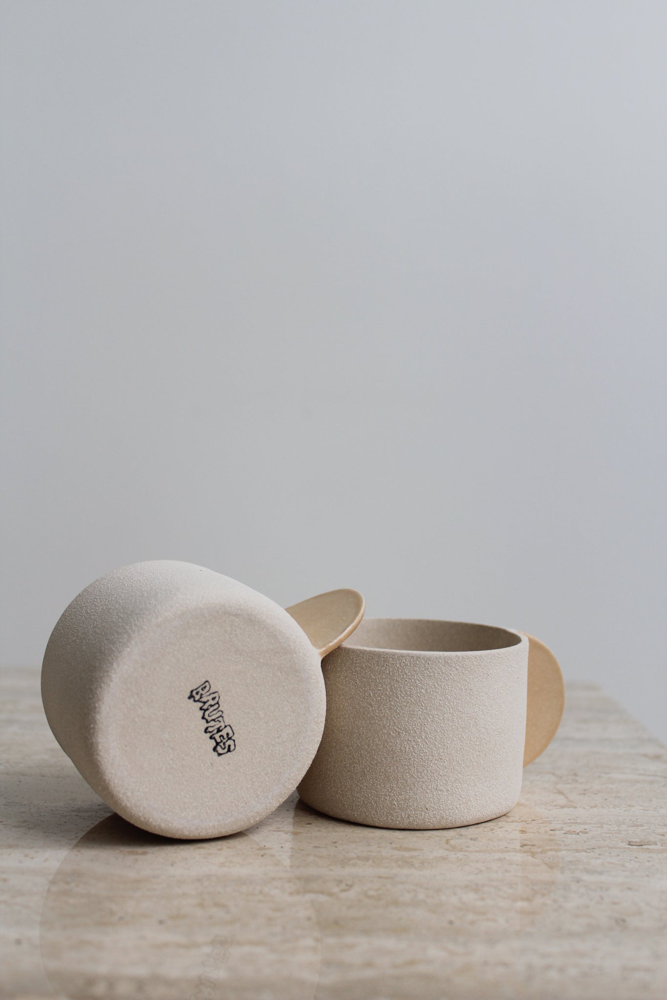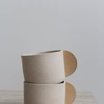 Grès texturé beige, avec glaçure transparente brillante à l'intérieur et anse en forme de demi-cercle couleur pêche émaillée. Chaque tasse porte le estampillage BRUTES sur la base.