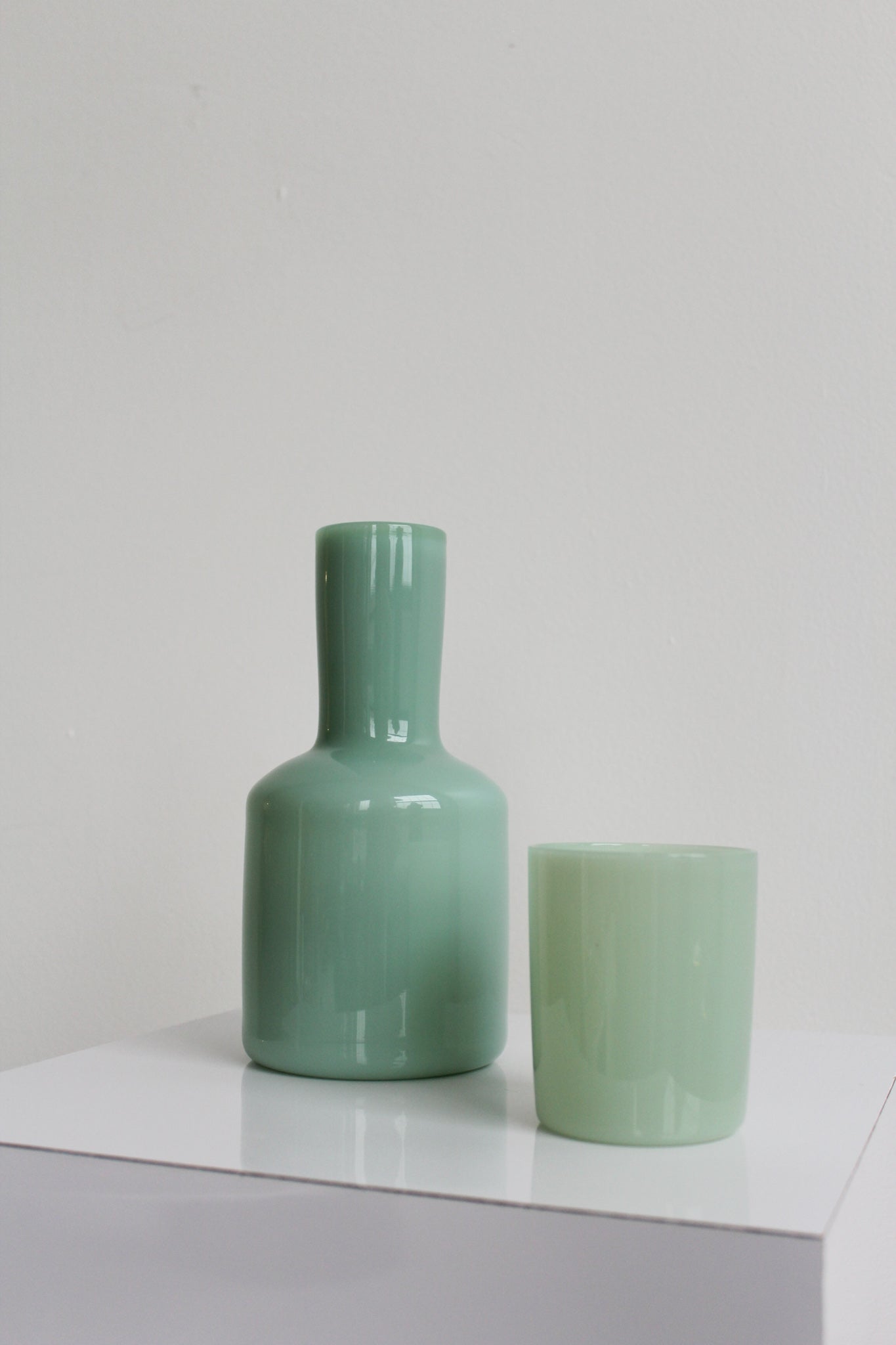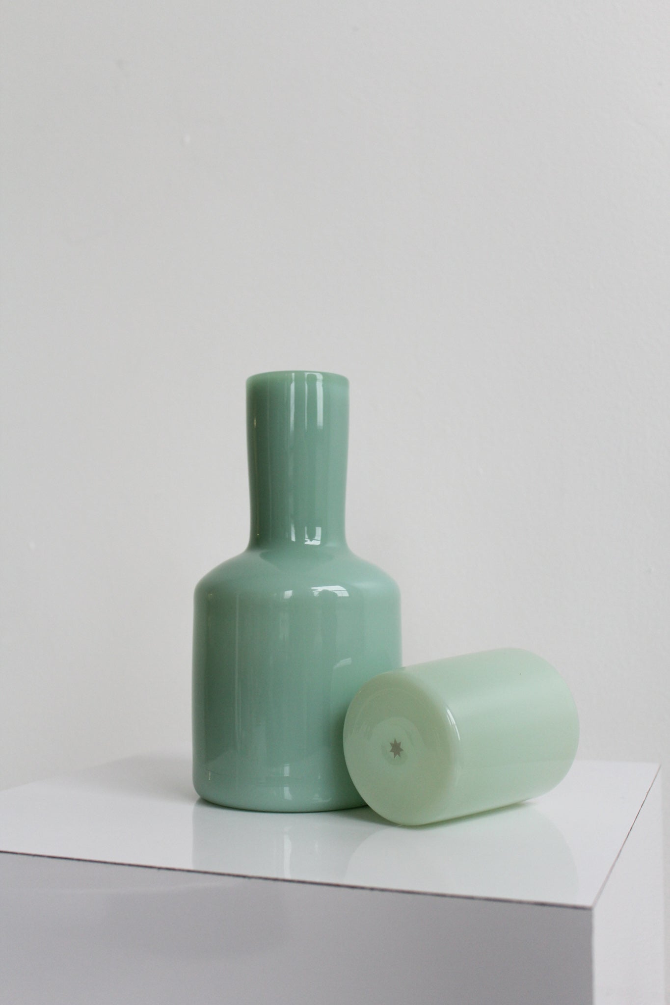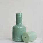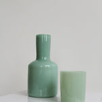 La carafe et le gobelet J’ai Soif en menthe opaque de Maison Balzac sont inspirés des ensembles de carafe traditionnels posés sur les tables de chevet en France.