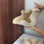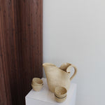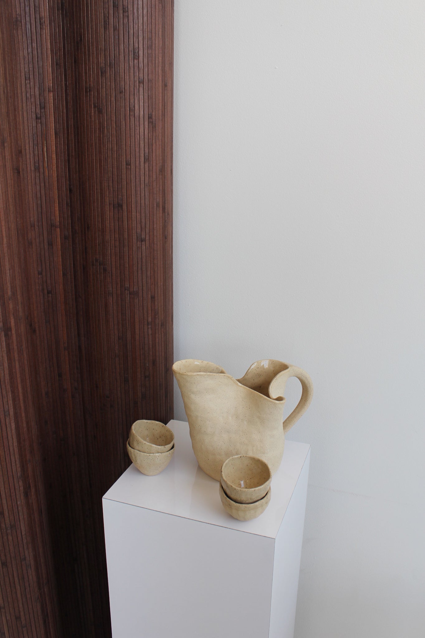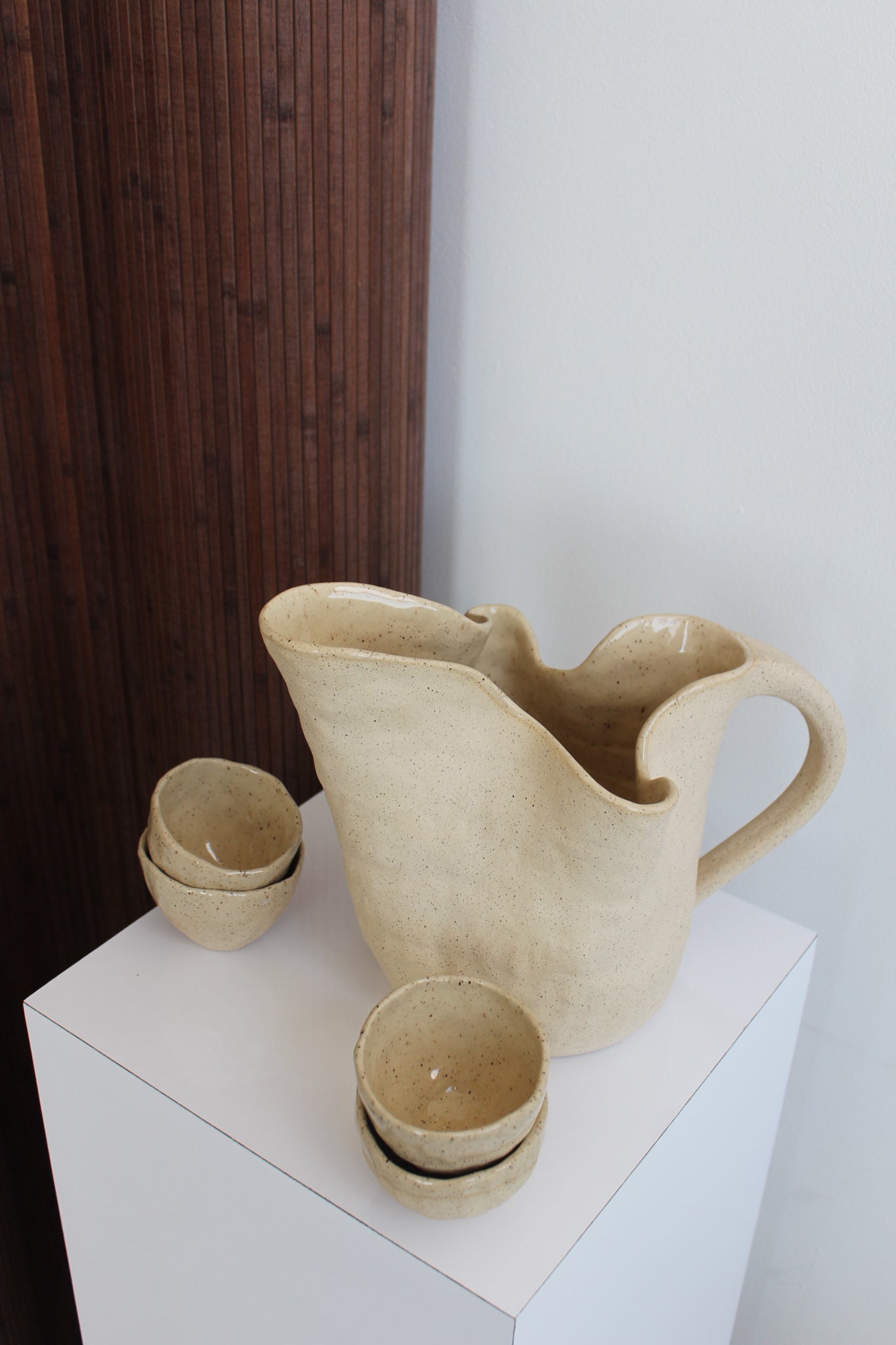 Pichet Philodendron par Maison Sevigny. Ce pichet illustre une grande virtuosité dans le travail du grès avec sa forme organique et unique et sa poignée majestueuse - inspirée de la feuille de philodendron. Quatre tasses assorties incluses.