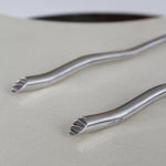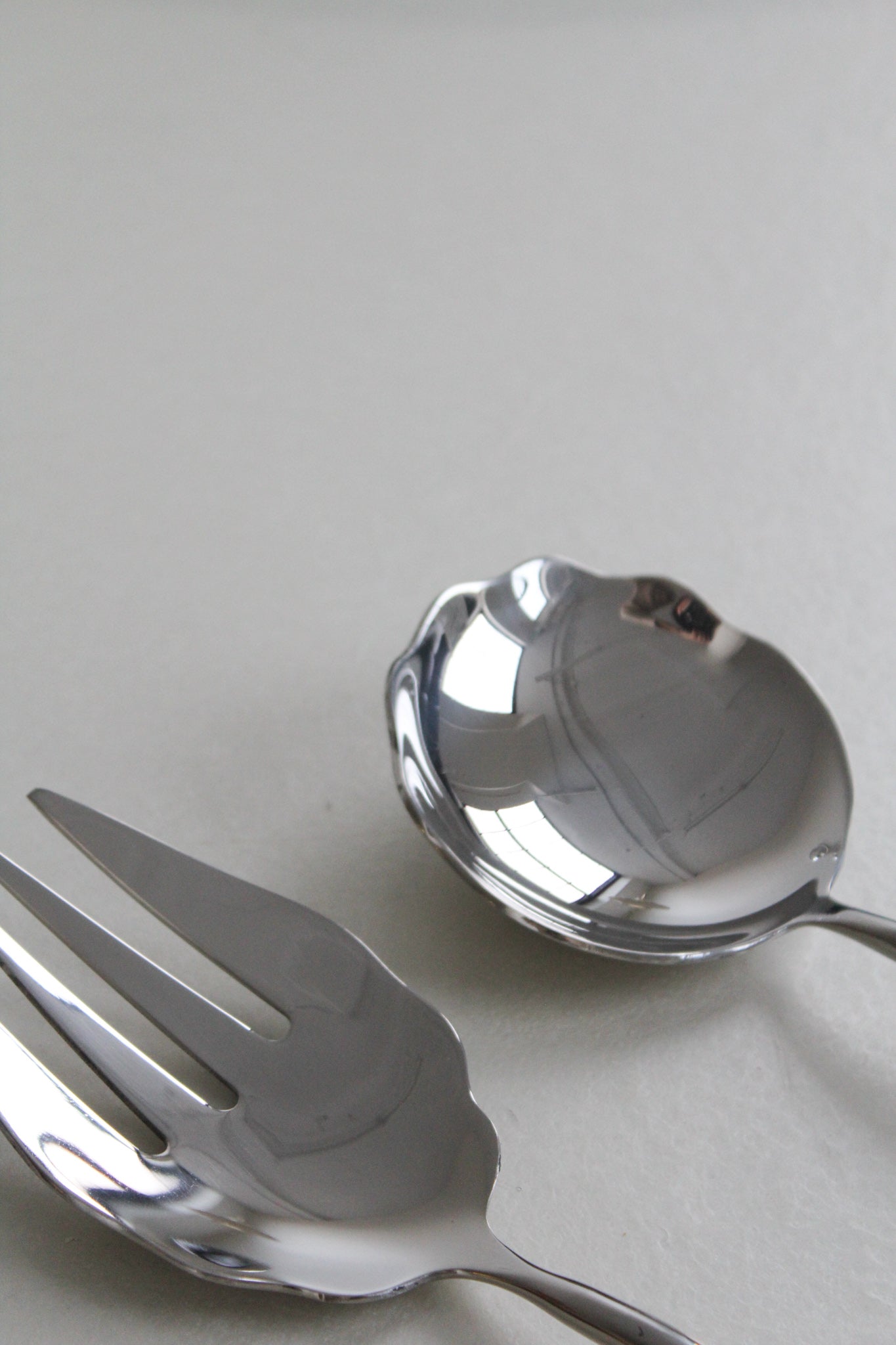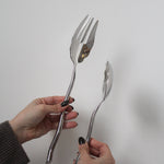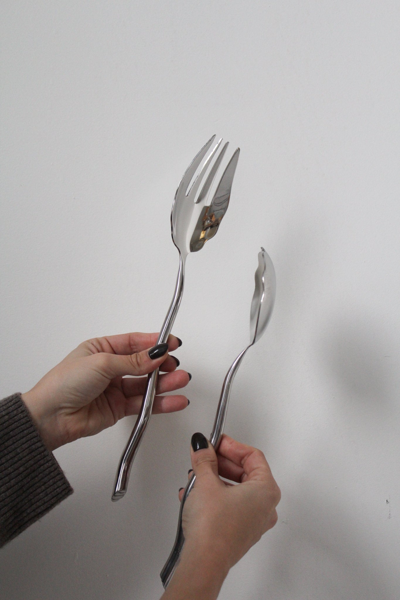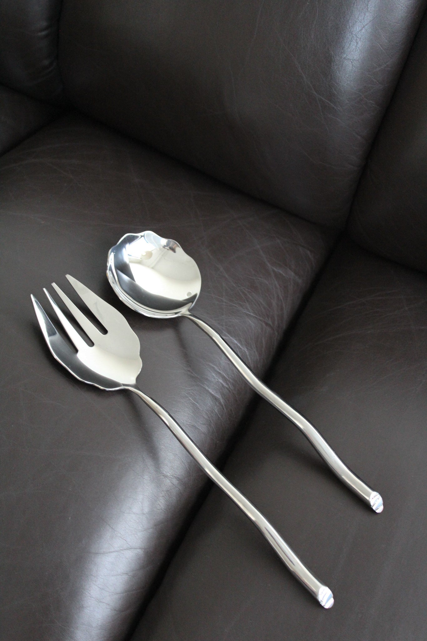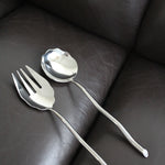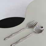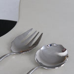 Ensemble de service en acier inoxydable par Izabel Lam. Grand ensemble de service à salade sculptural avec motif festonné. Manches ondulés moulés en acier inoxydable.