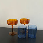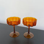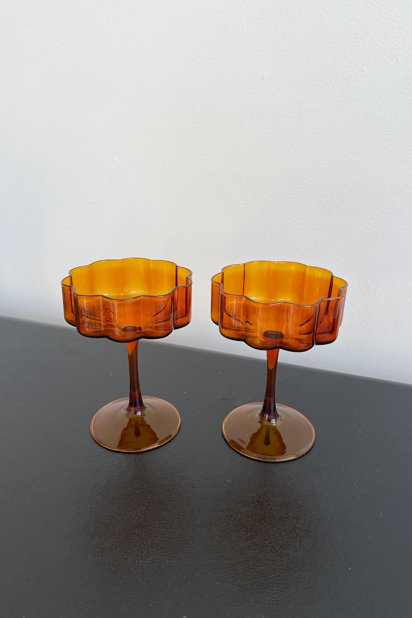 Ensemble de deux coupes ondulées faites à la main en couleur ambre par Fazeek. Présentent un pied allongé et un bol large aux bords ondulés. Le contenant idéal pour servir vos cocktails ou desserts préférés.