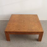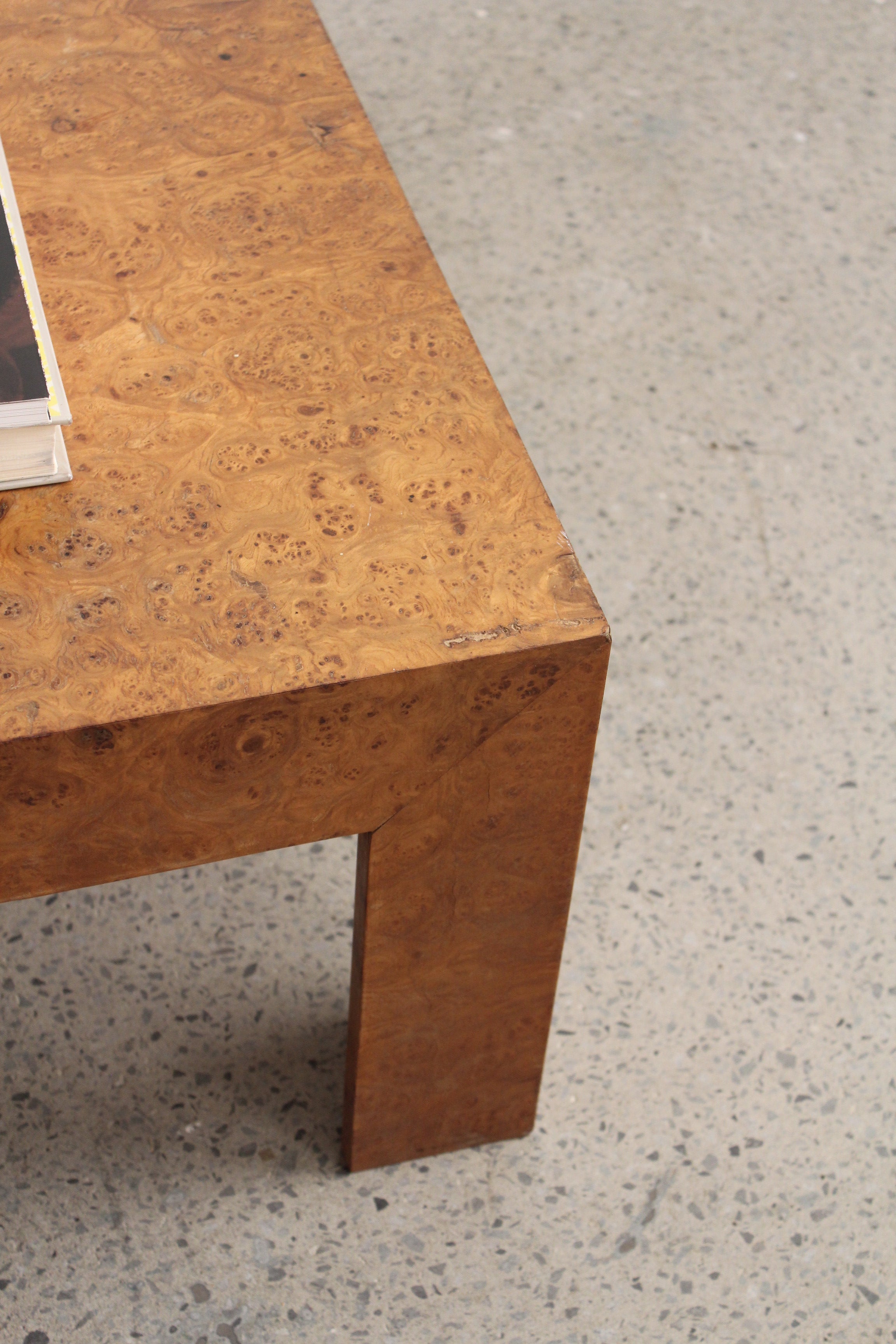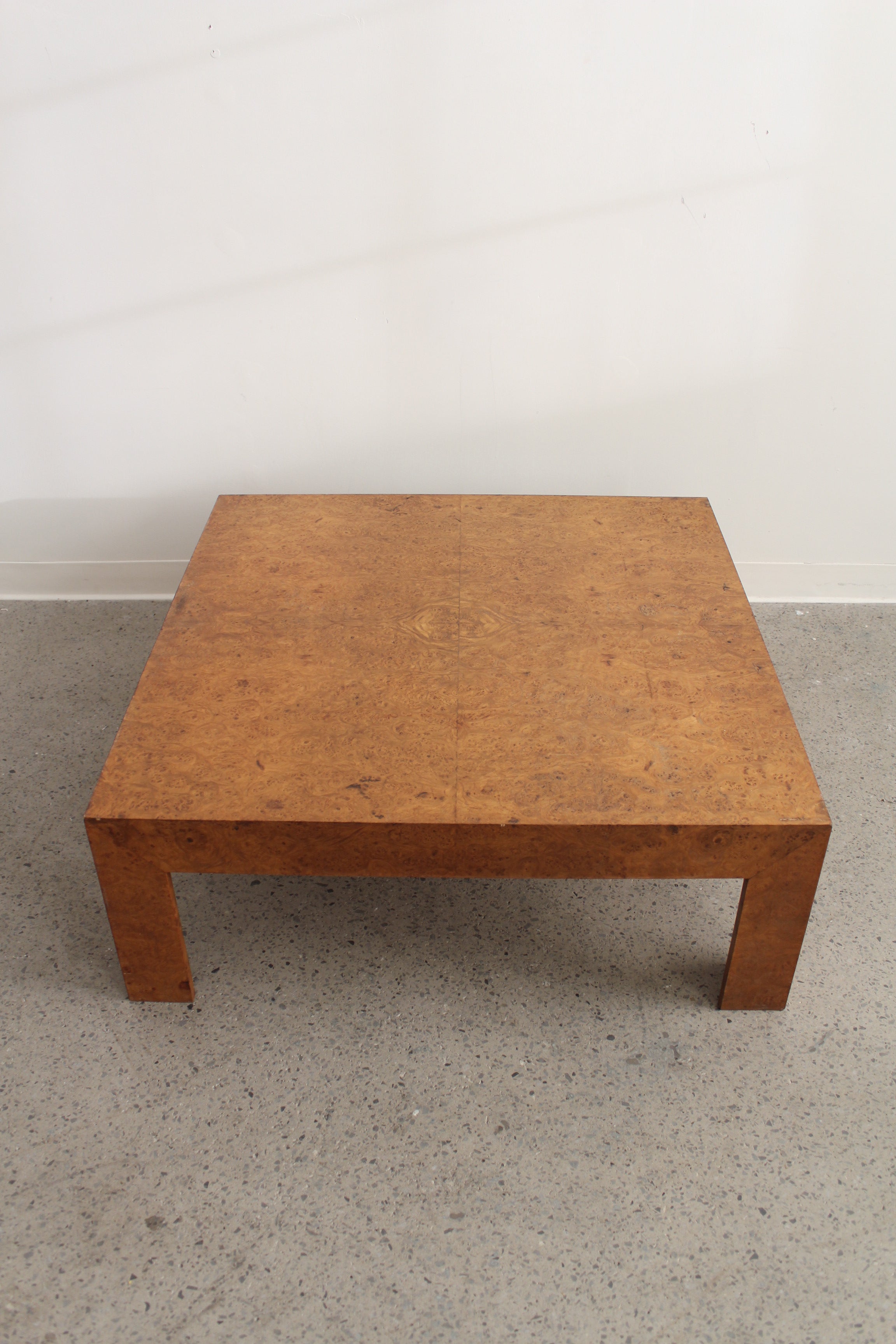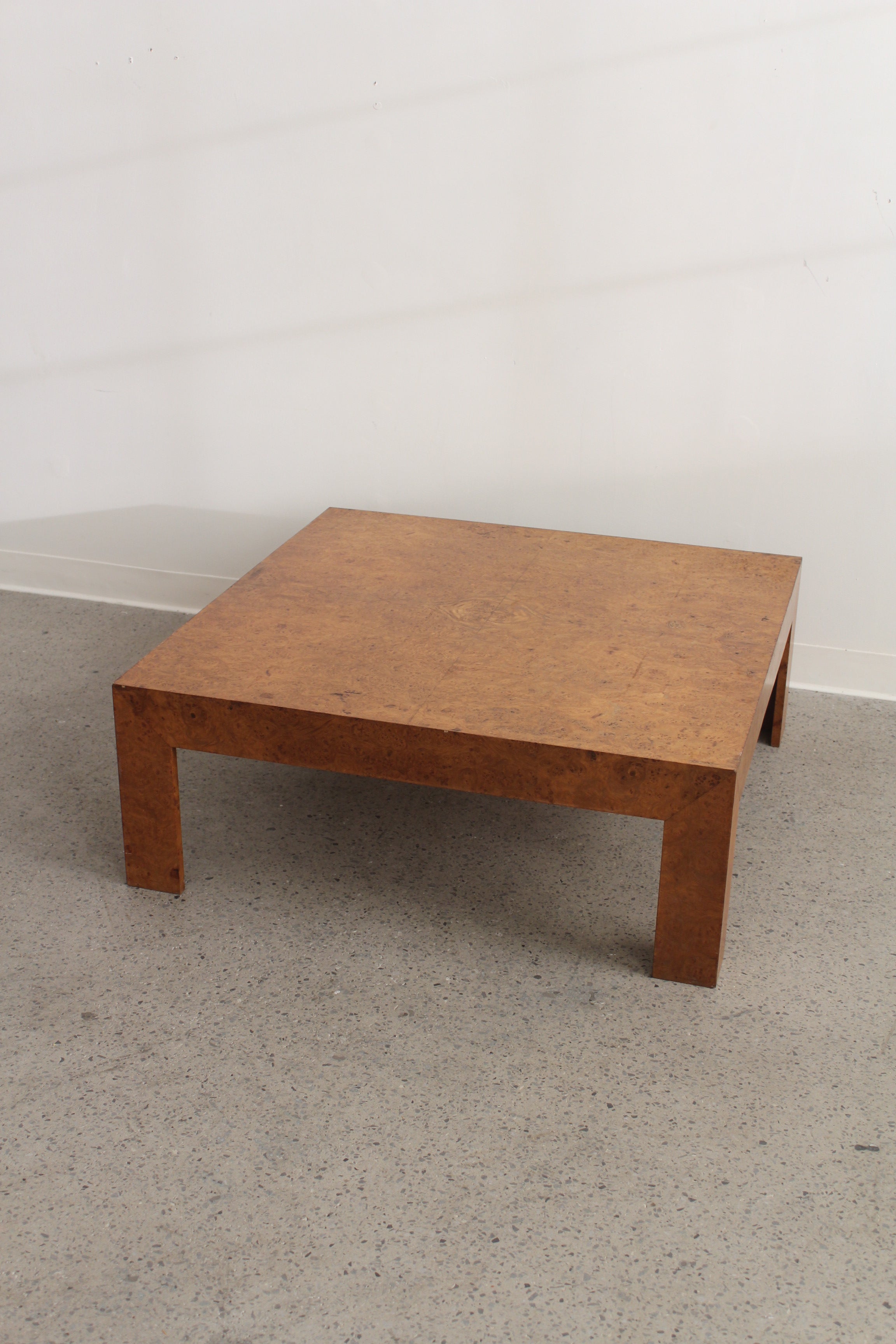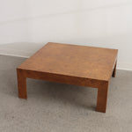 Table basse en ronce de bois dans le style de Milo Baughman, années 1970. Grande table basse carrée de style Parsons avec placage de ronce.