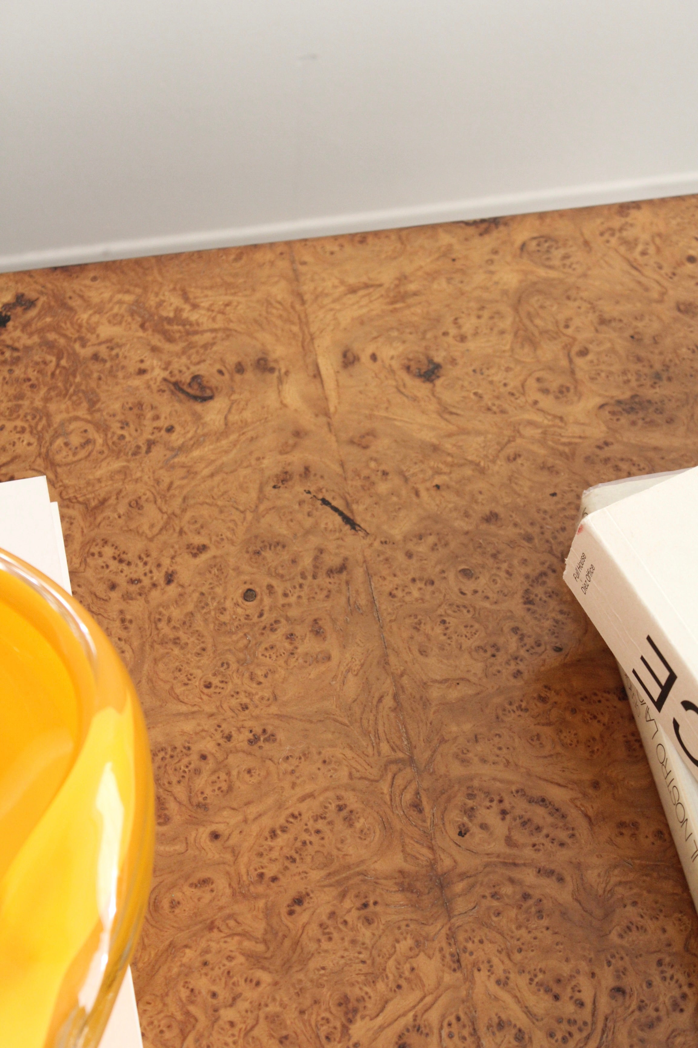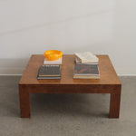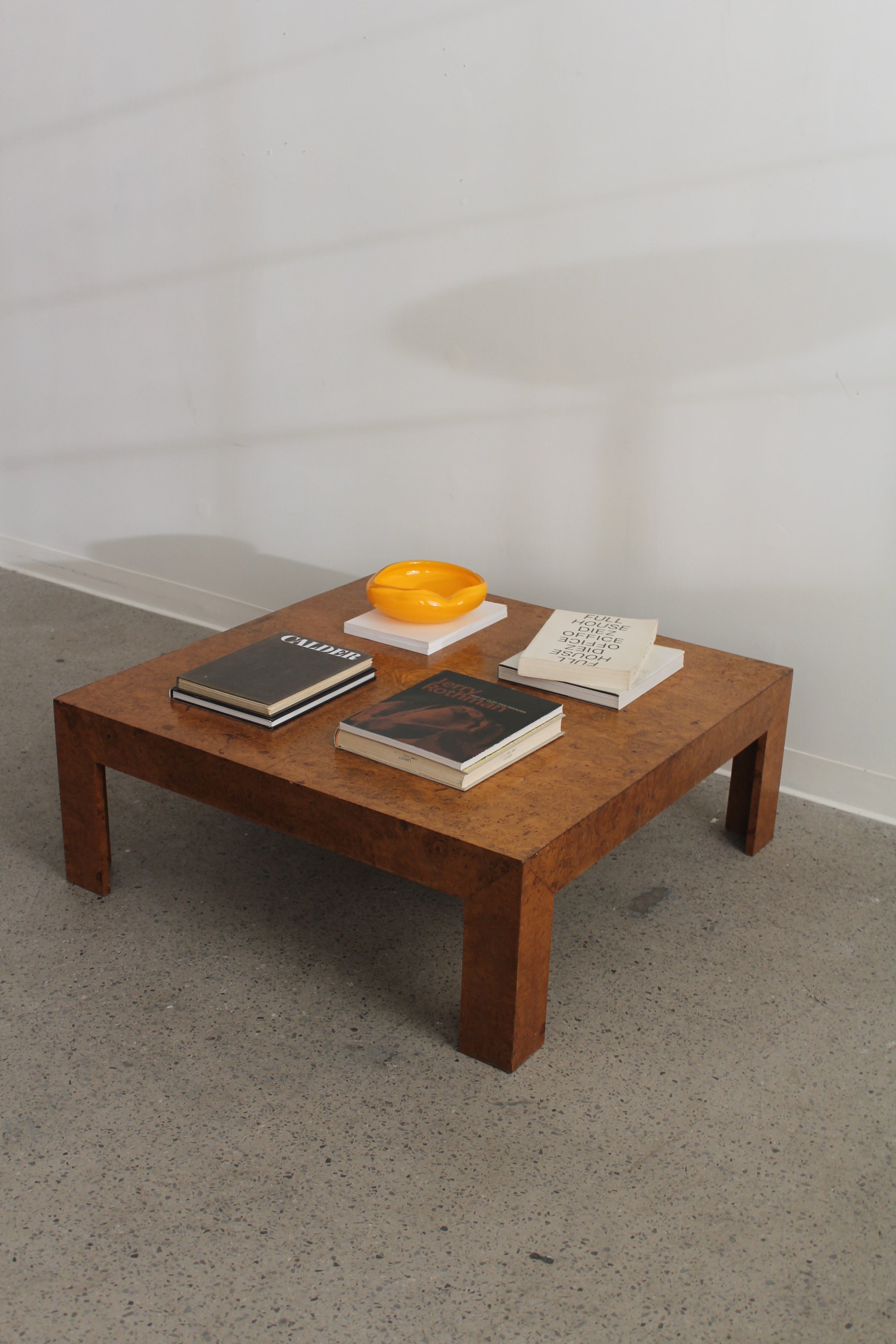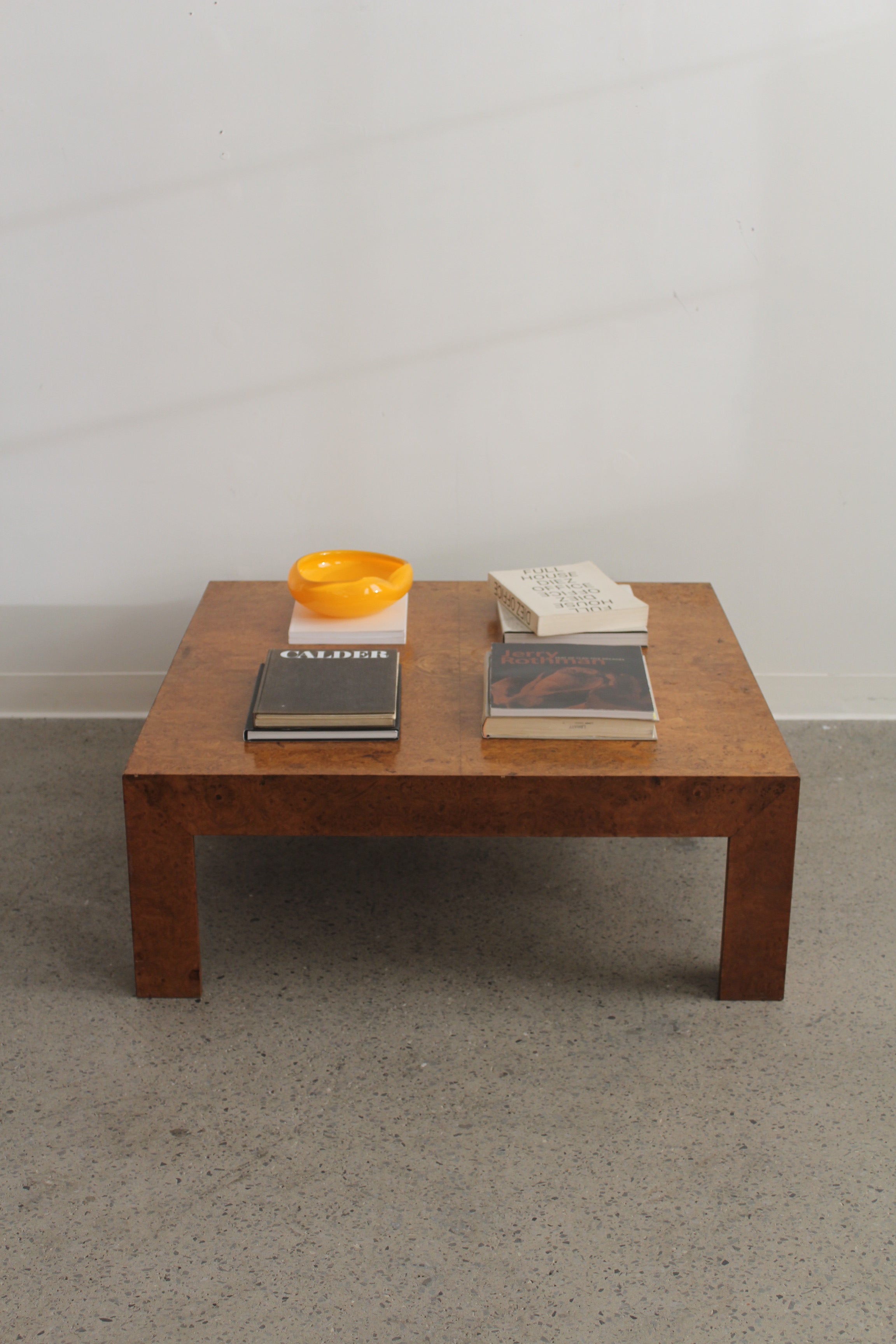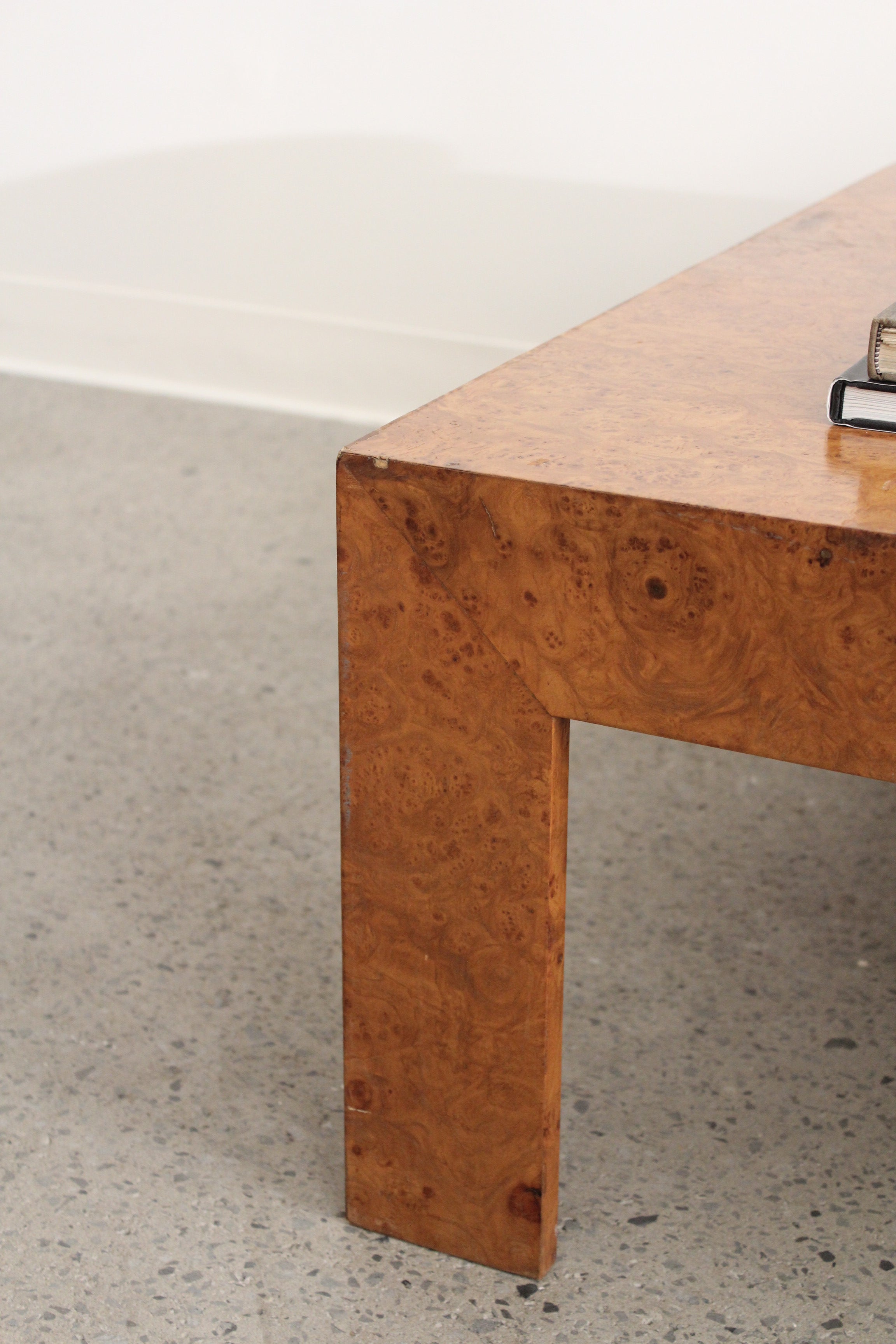 Table basse en ronce de bois dans le style de Milo Baughman, années 1970. Grande table basse carrée de style Parsons avec placage de ronce.