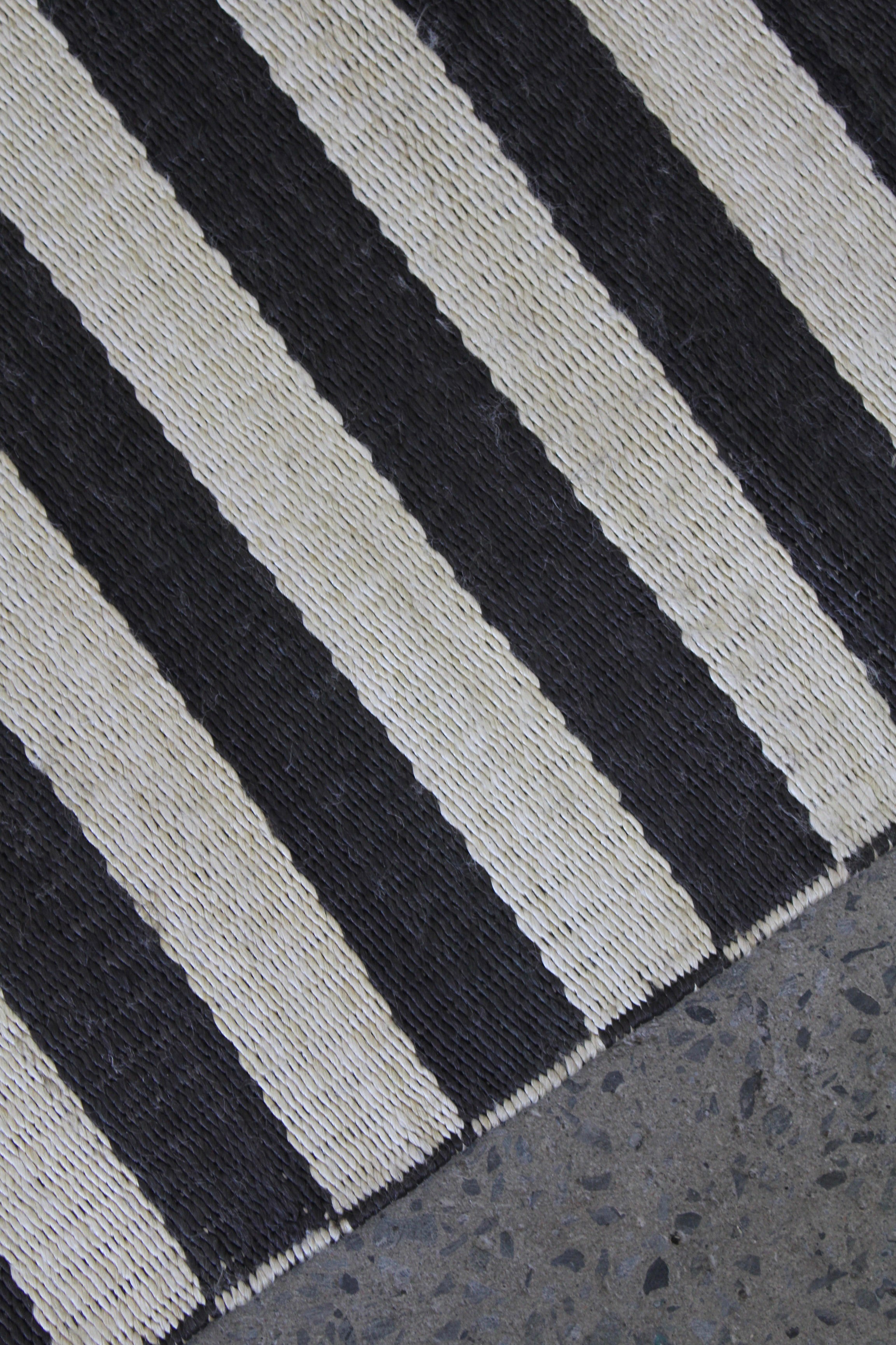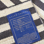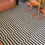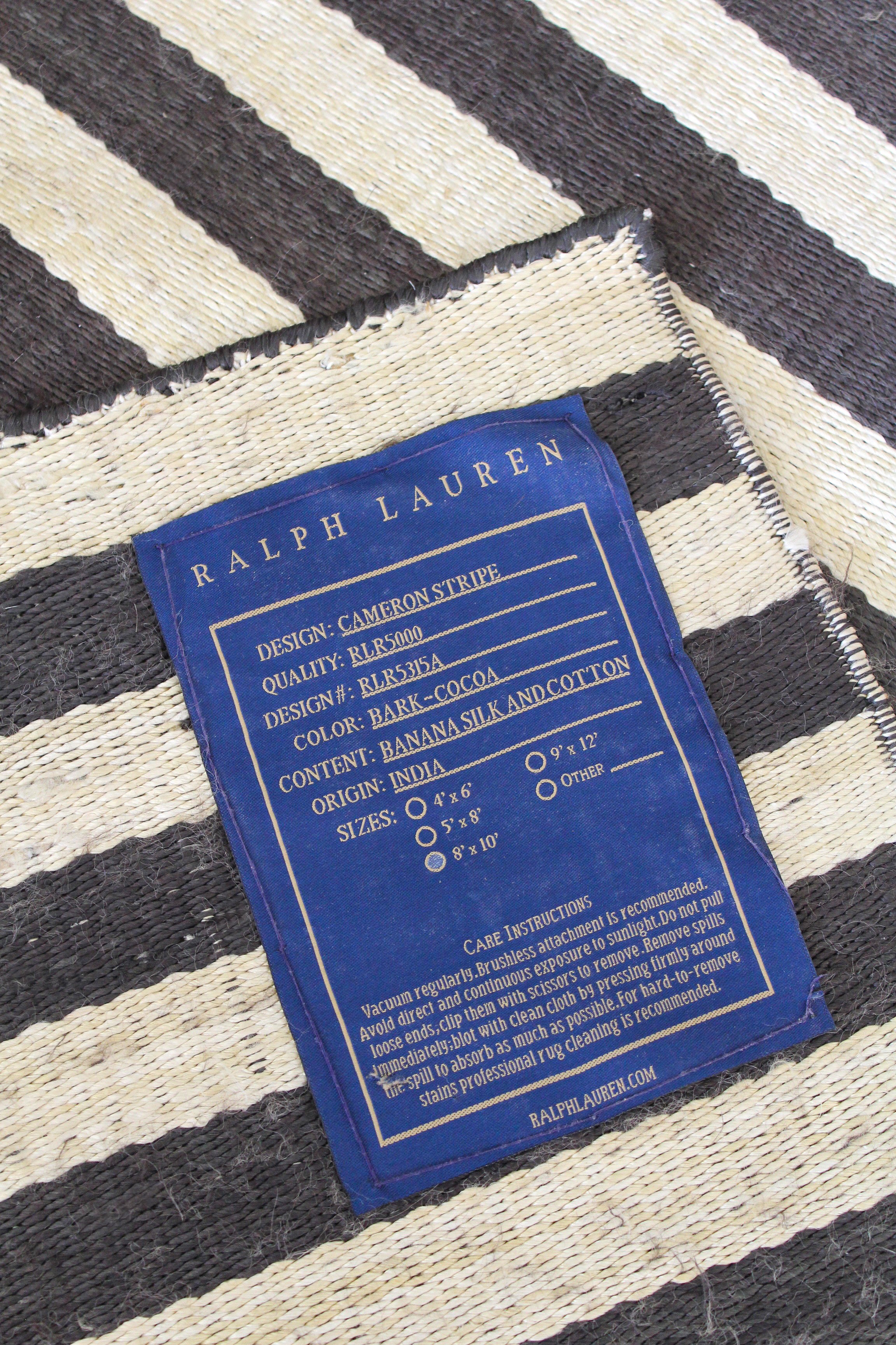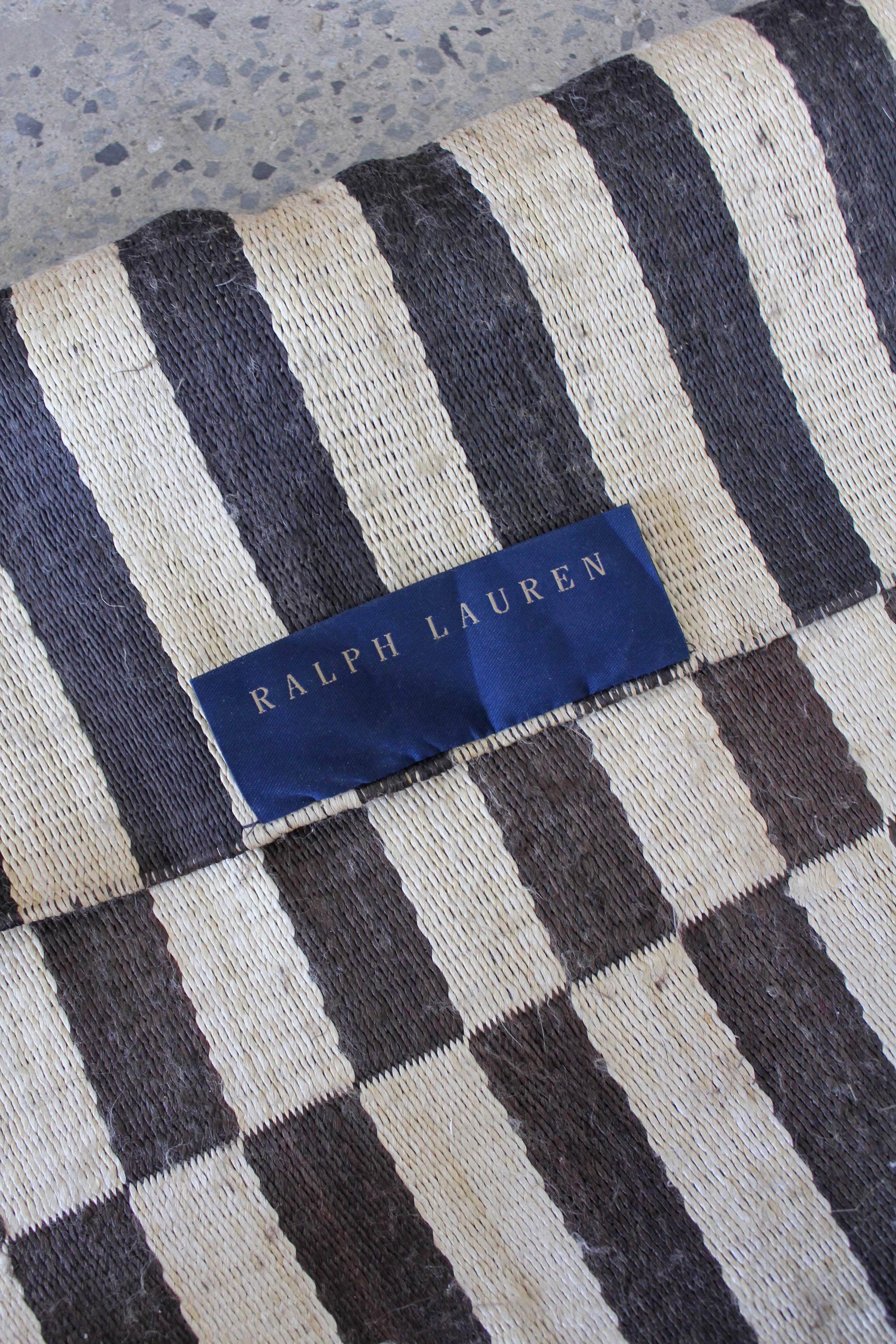 Tapis Cameron par Ralph Lauren Home, années 2000. Motif rayé Art déco noir et blanc inspiré de la fascination de l’époque pour les objets d’art classiques égyptiens. Tapis tissé à plat en soie de bananier et coton, tissé à la main en Inde. Ce modèle n’est plus produit en soie de bananier et est désormais uniquement fabriqué en viscose.