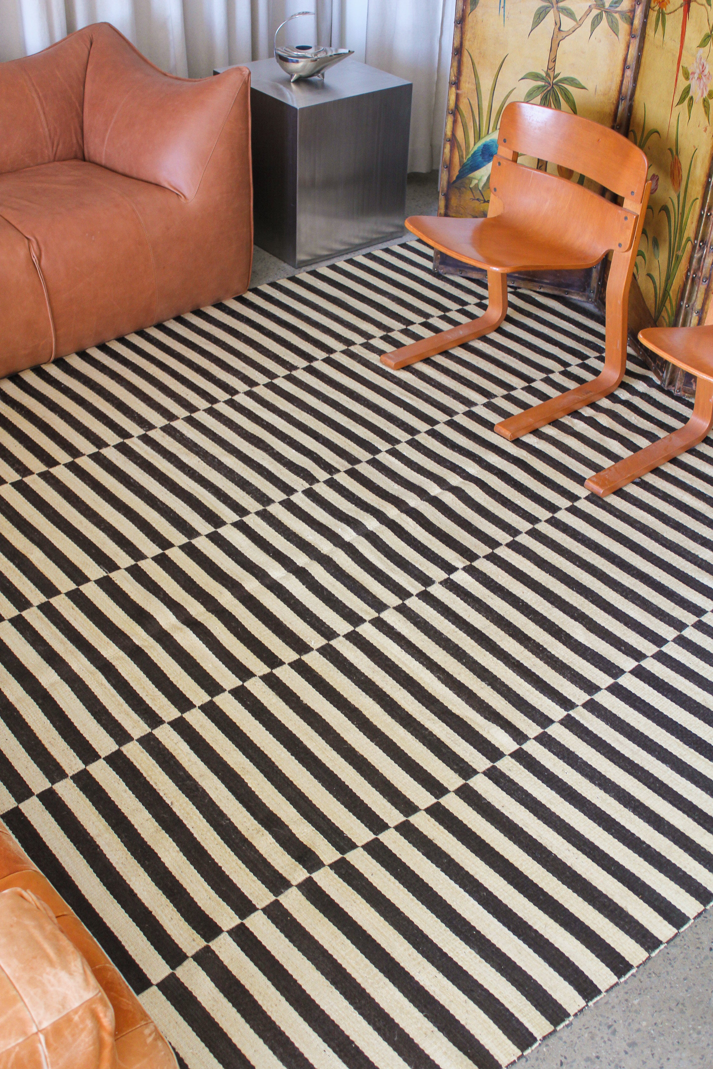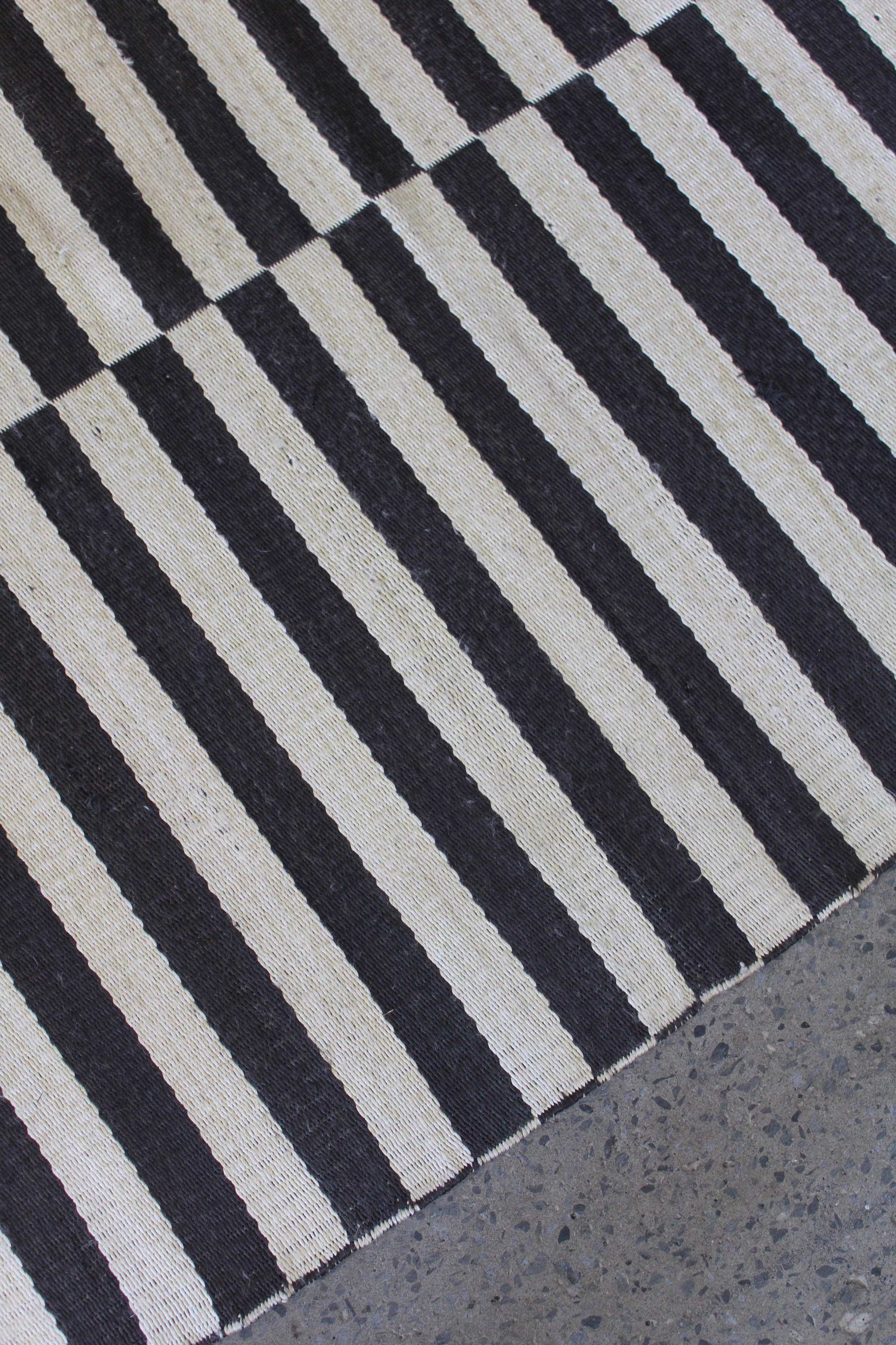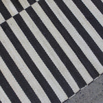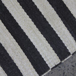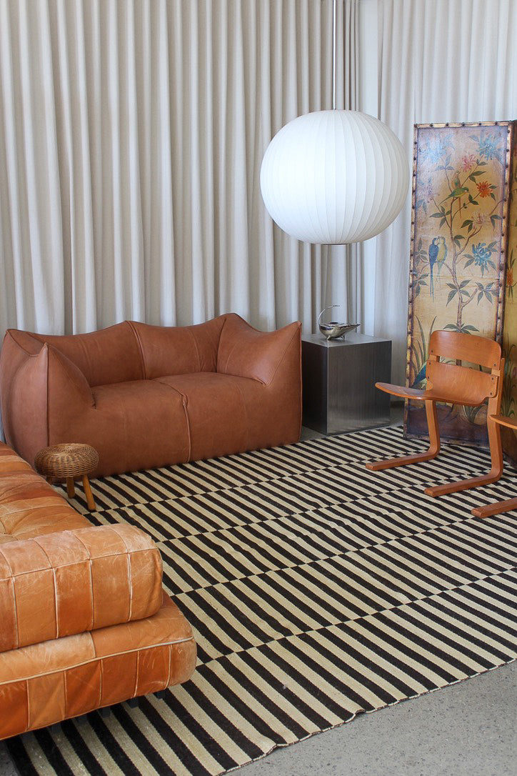 Tapis Cameron par Ralph Lauren Home, années 2000. Motif rayé Art déco noir et blanc inspiré de la fascination de l’époque pour les objets d’art classiques égyptiens. Tapis tissé à plat en soie de bananier et coton, tissé à la main en Inde. Ce modèle n’est plus produit en soie de bananier et est désormais uniquement fabriqué en viscose.