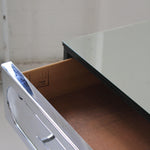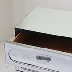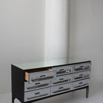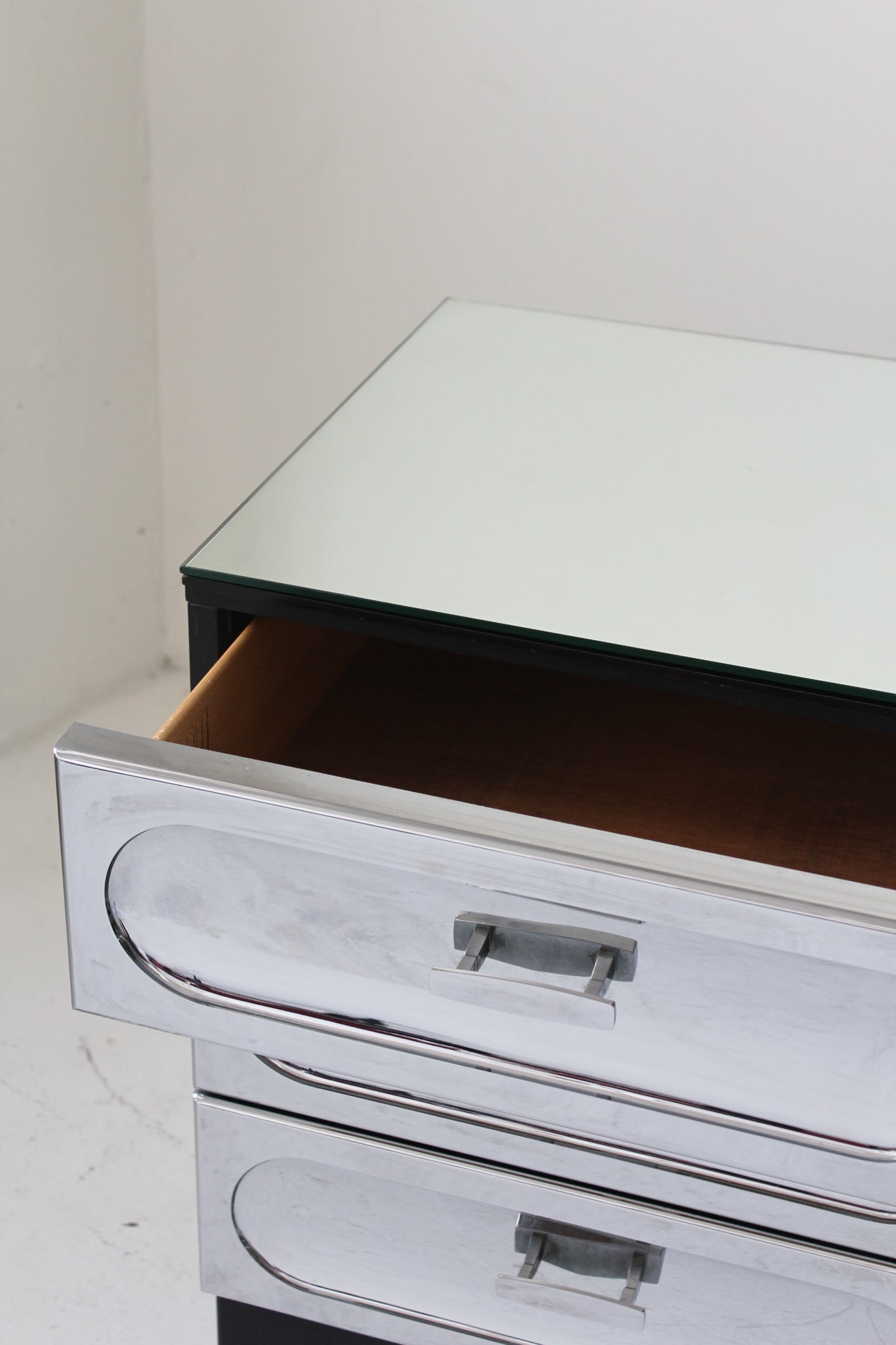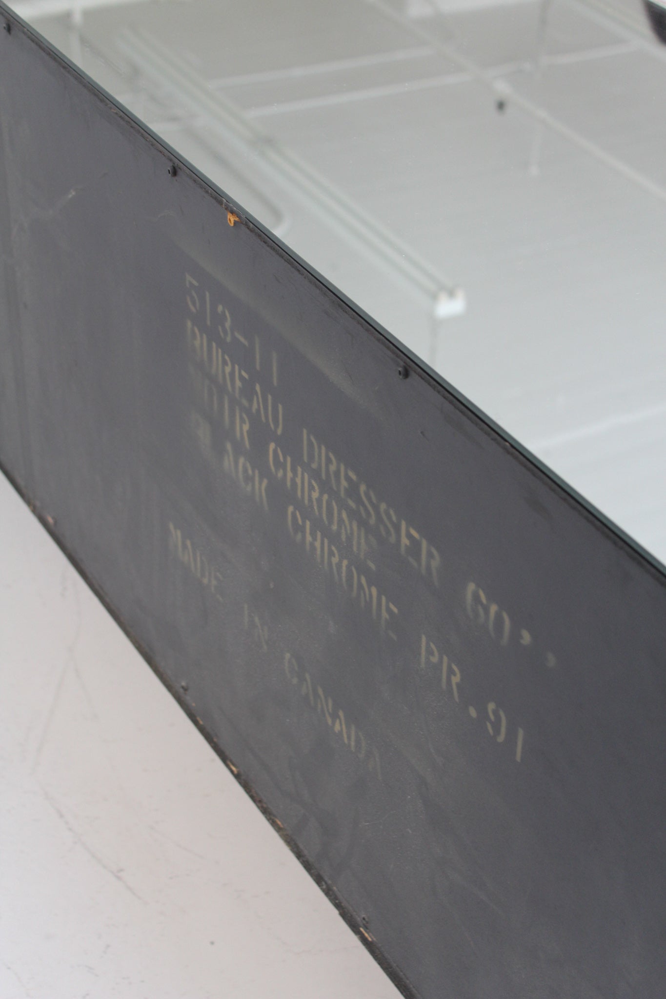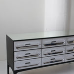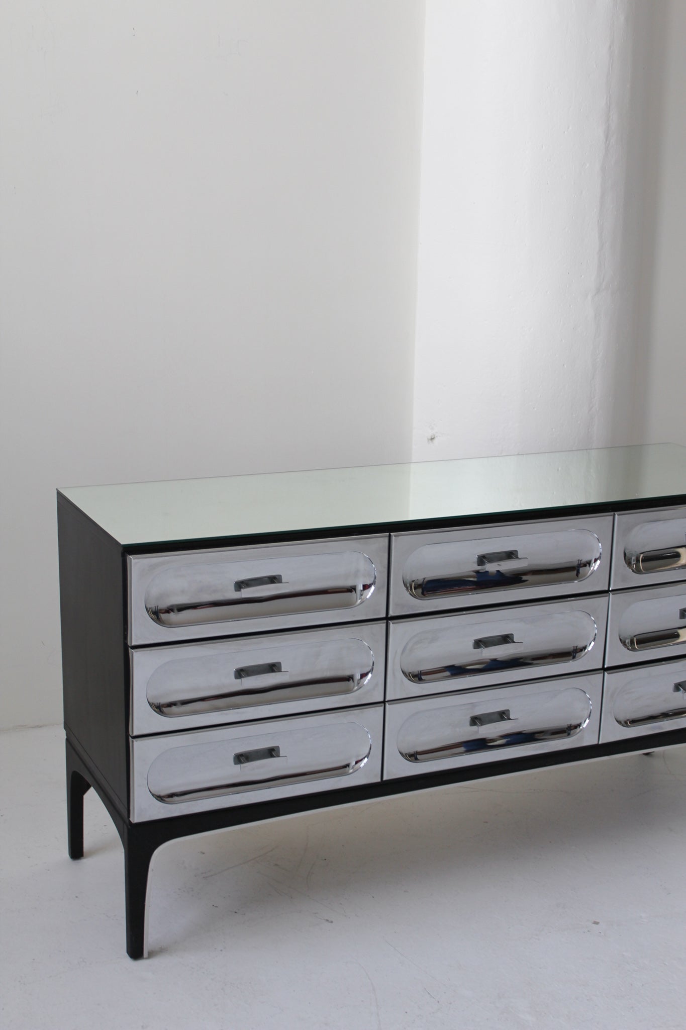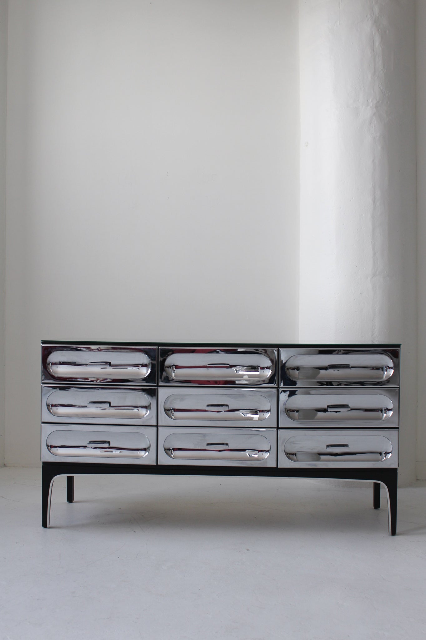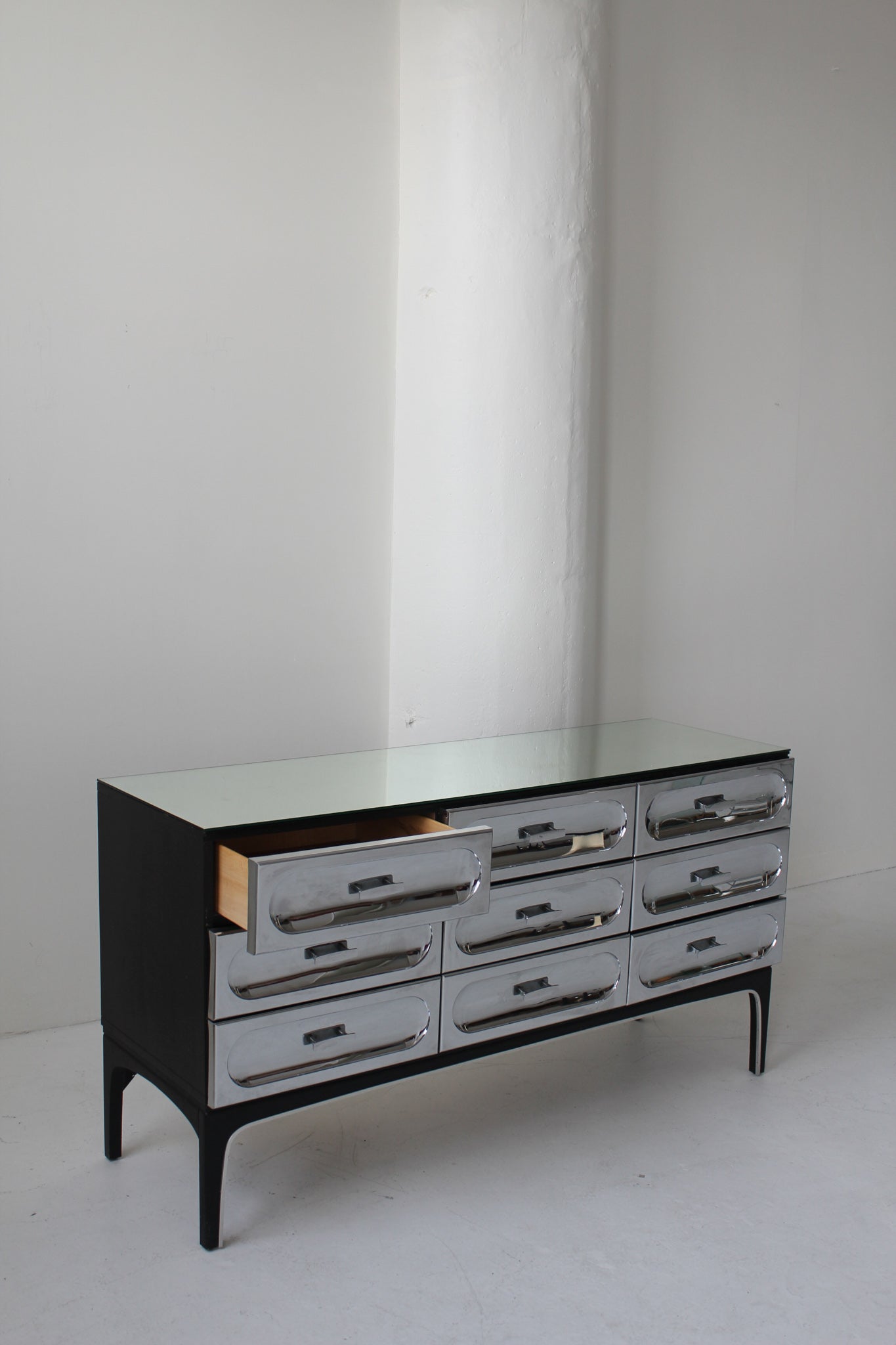 Commode à neuf tiroirs par Henri Vallières, fabriquée au Québec, années 1960. Pièce estampillée et extrêmement rare composée de façades et poignées en plastique chromé, structure en bois et dessus amovible en miroir.