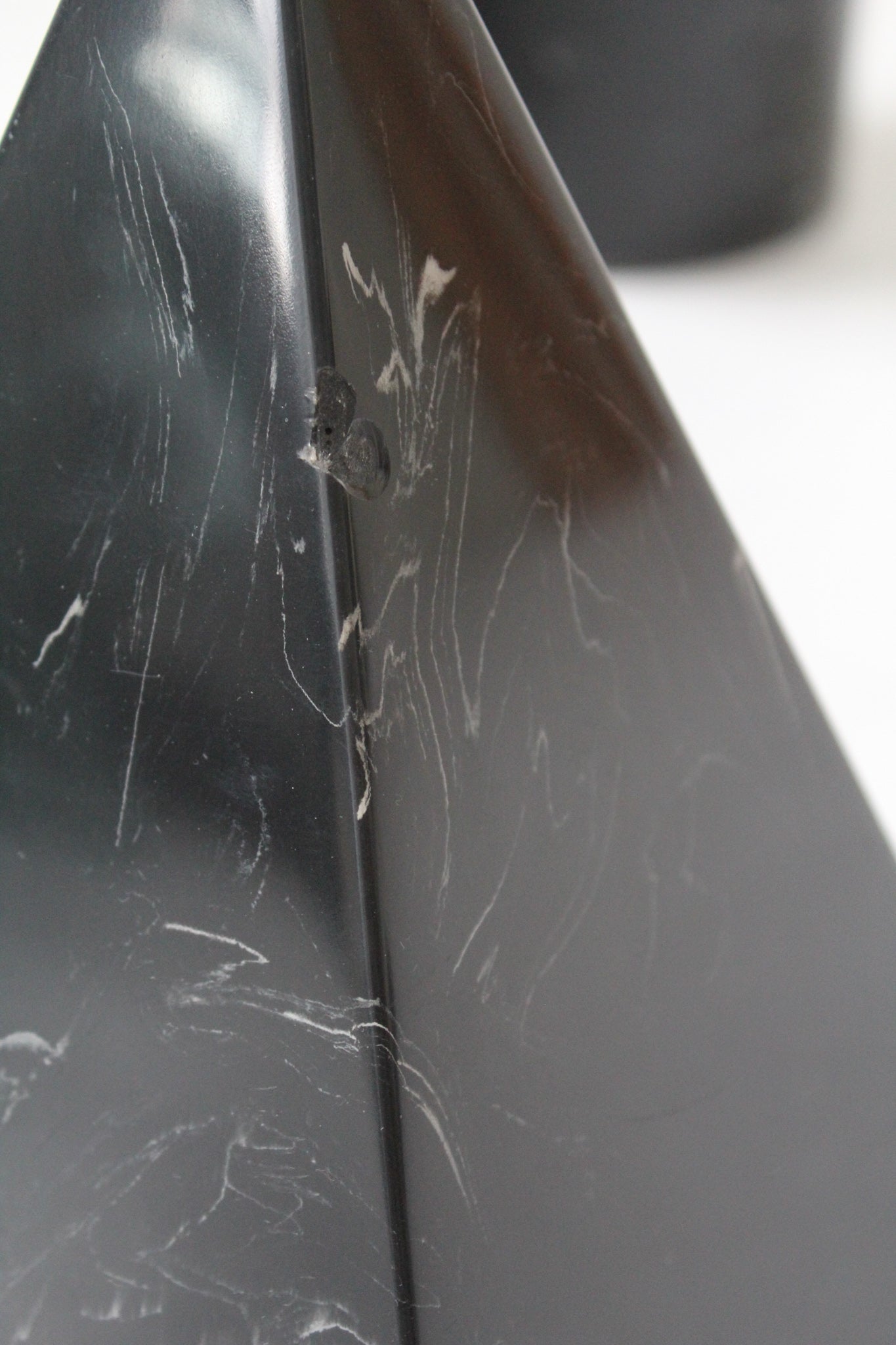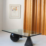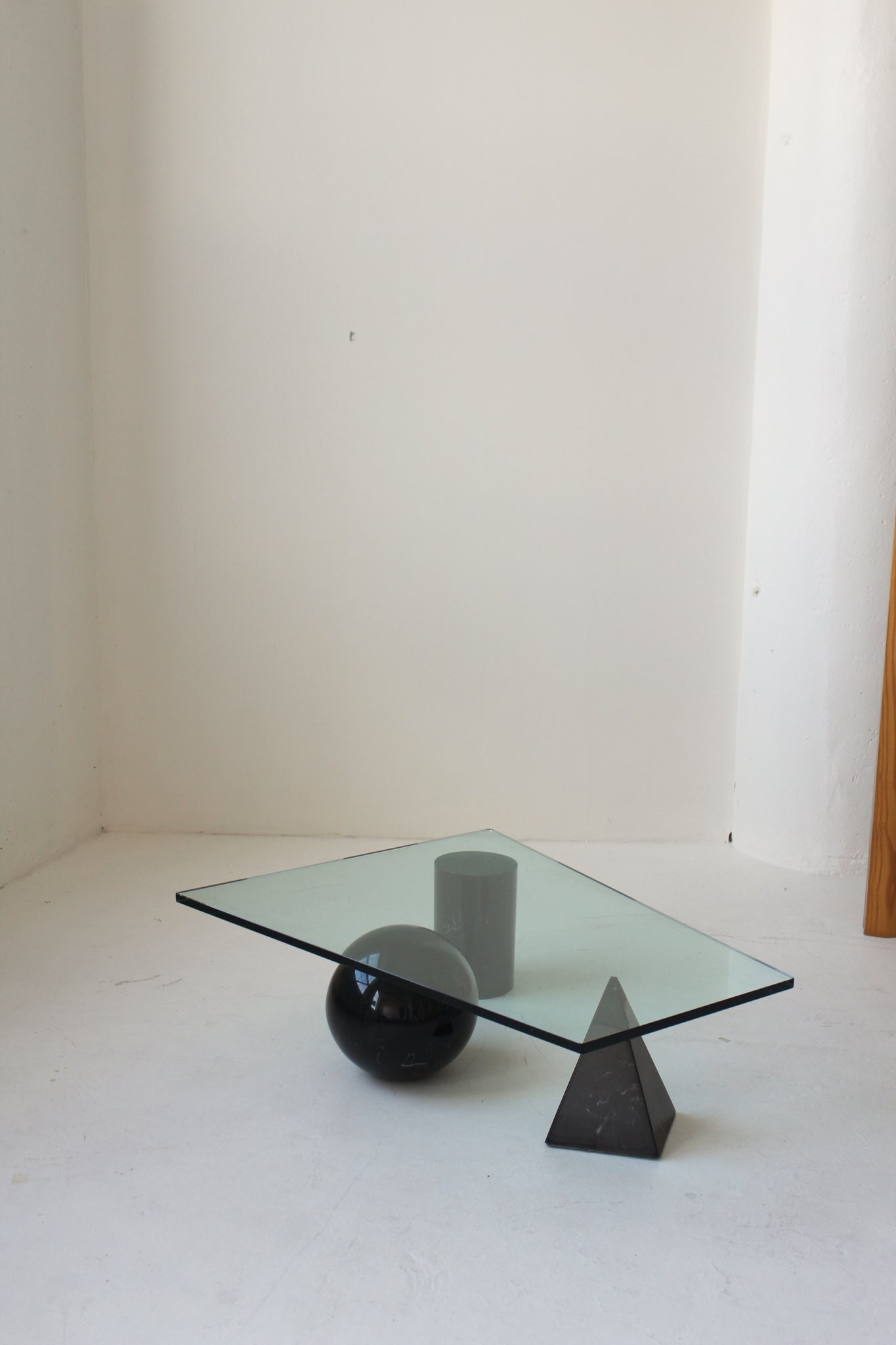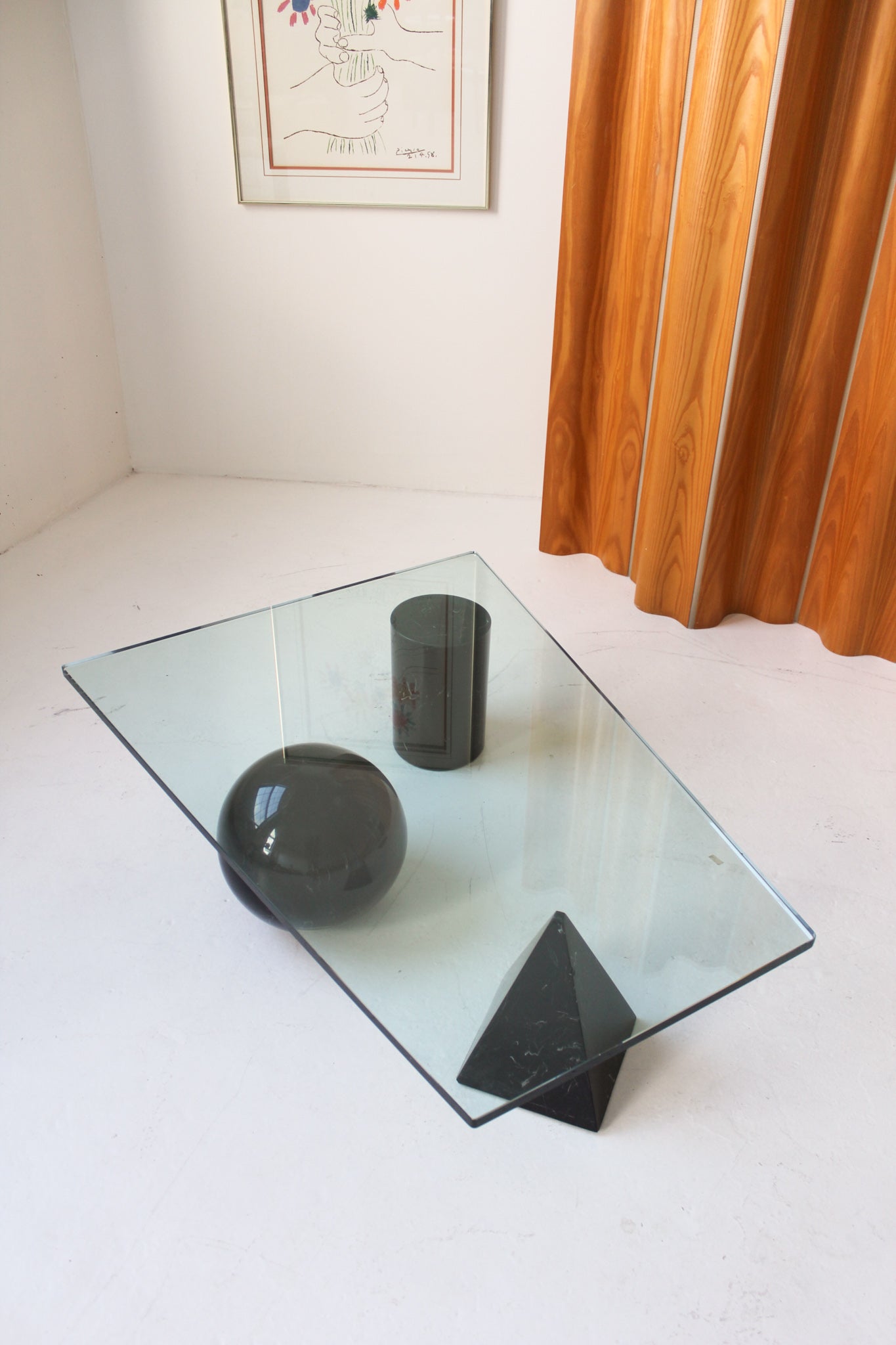 Table basse géométrique, années 1970. Plateau en verre épais avec trois bases sculpturales effet marbre noir et blanc : une pyramide, une sphère et un cylindre. Les trois formes ne sont pas fixées et peuvent être disposées librement.