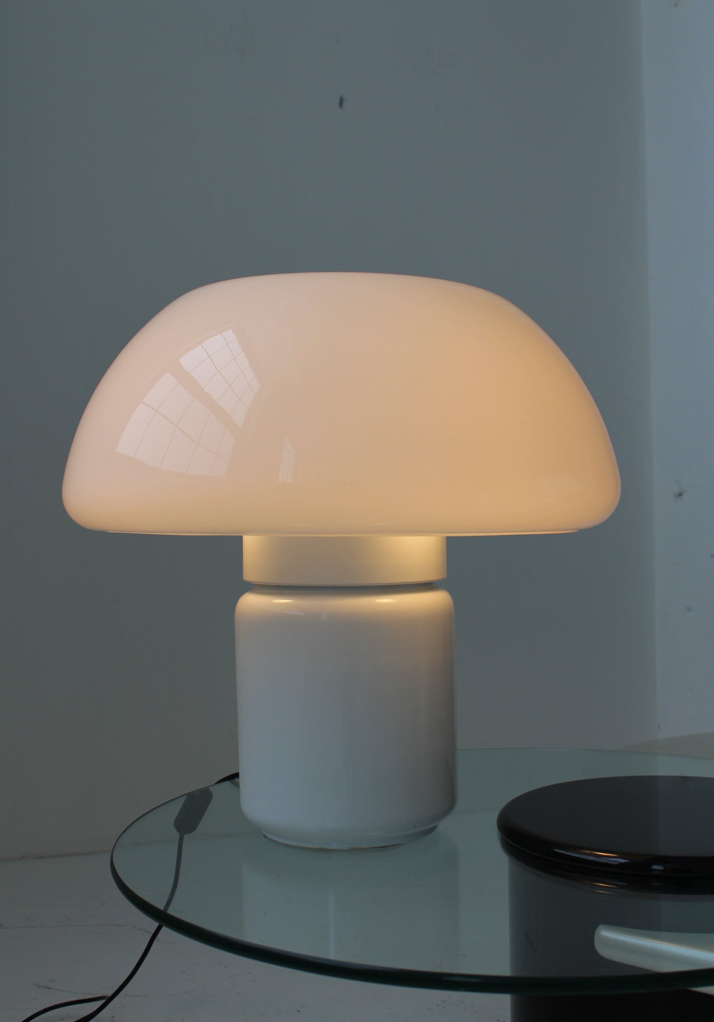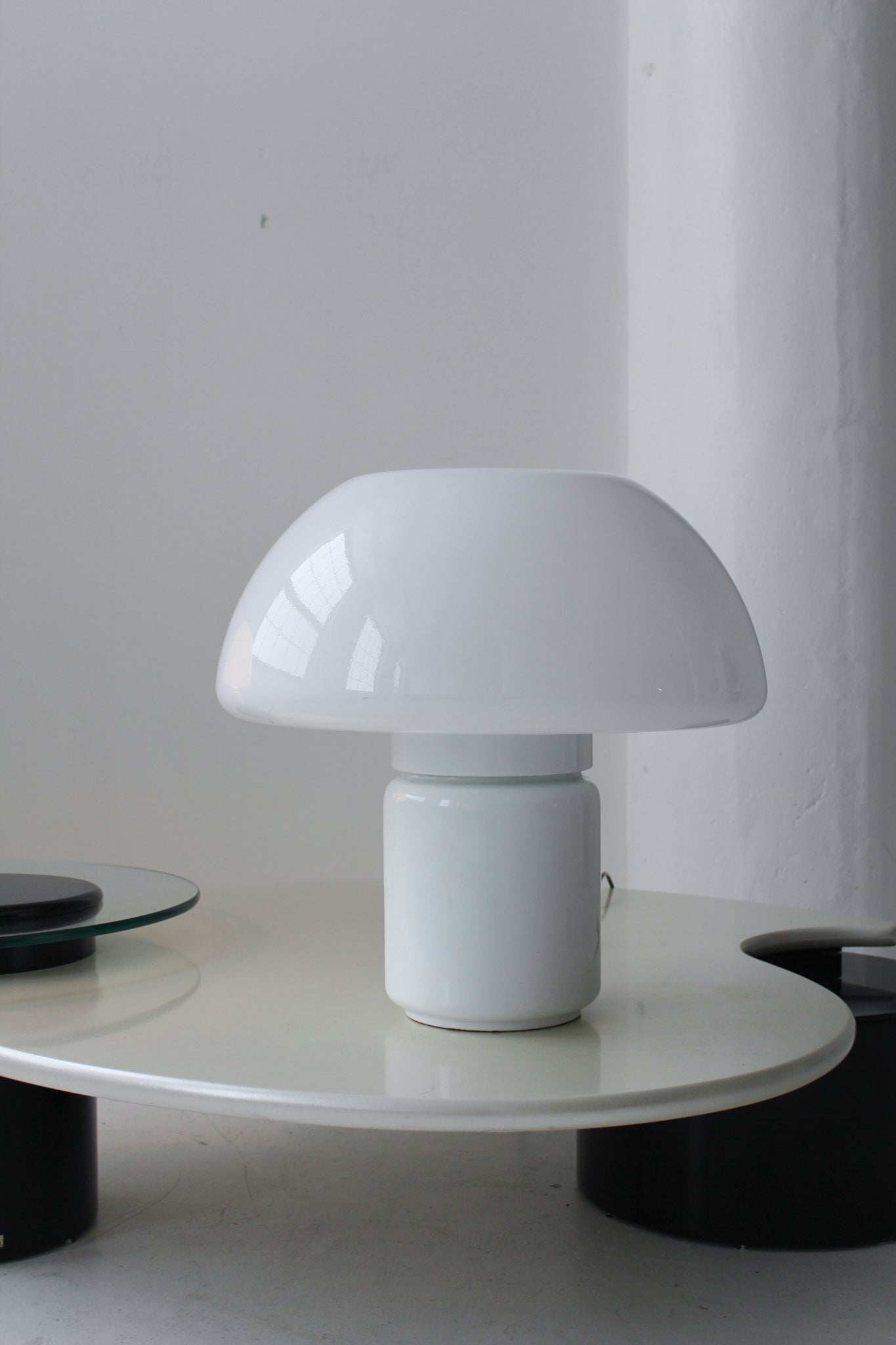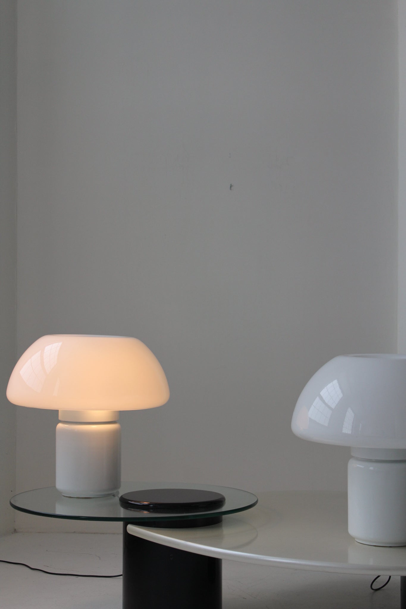 Lampe de table Model 625 par Elio Martinelli pour Martinelli Luce, 1968. Abat-jour en acrylique blanc et base en métal émaillé blanc.