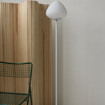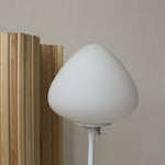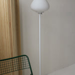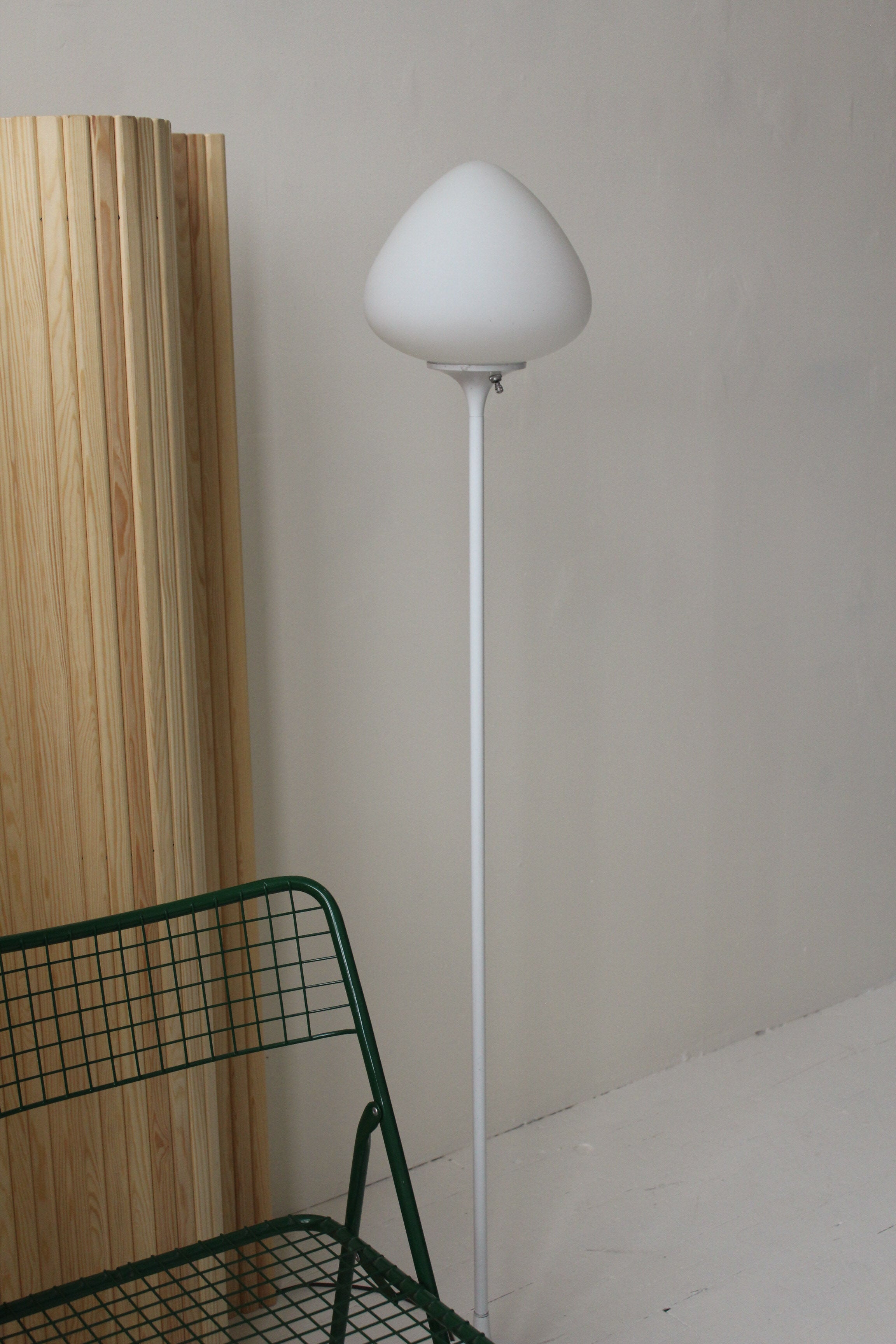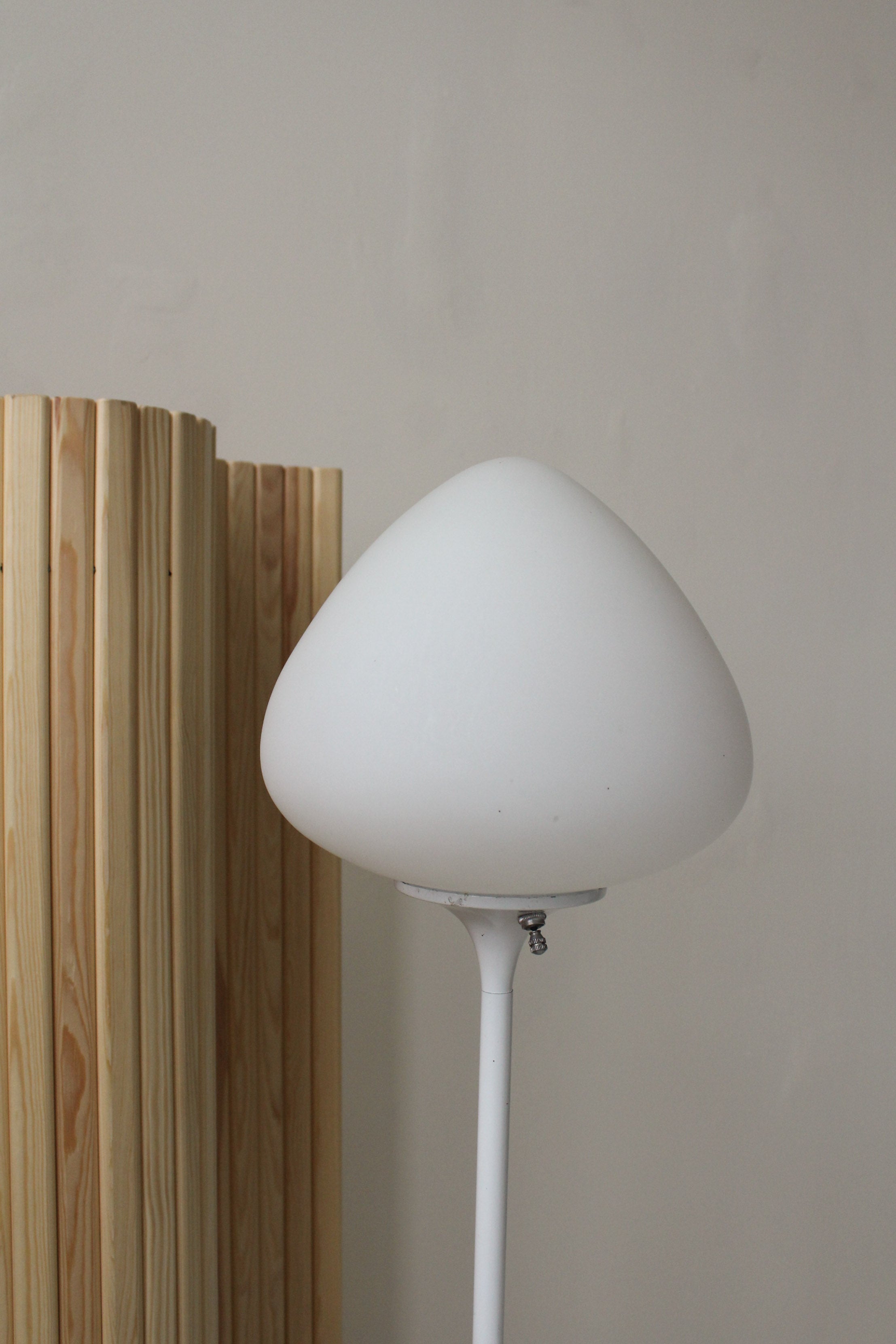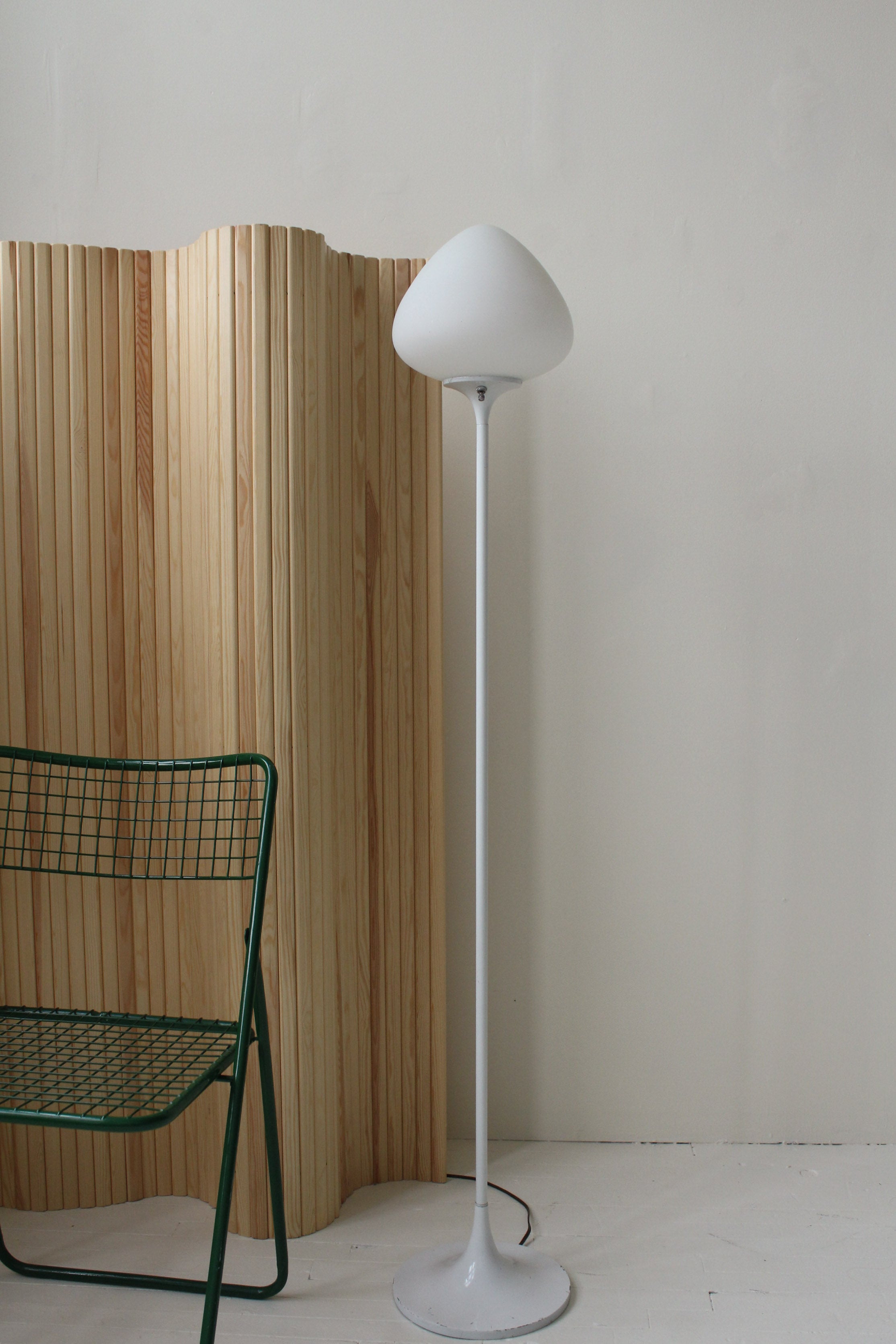 Lampe de sol blanche avec abat-jour givré en forme de gland et base en métal, par Laurel Lamp Company.