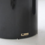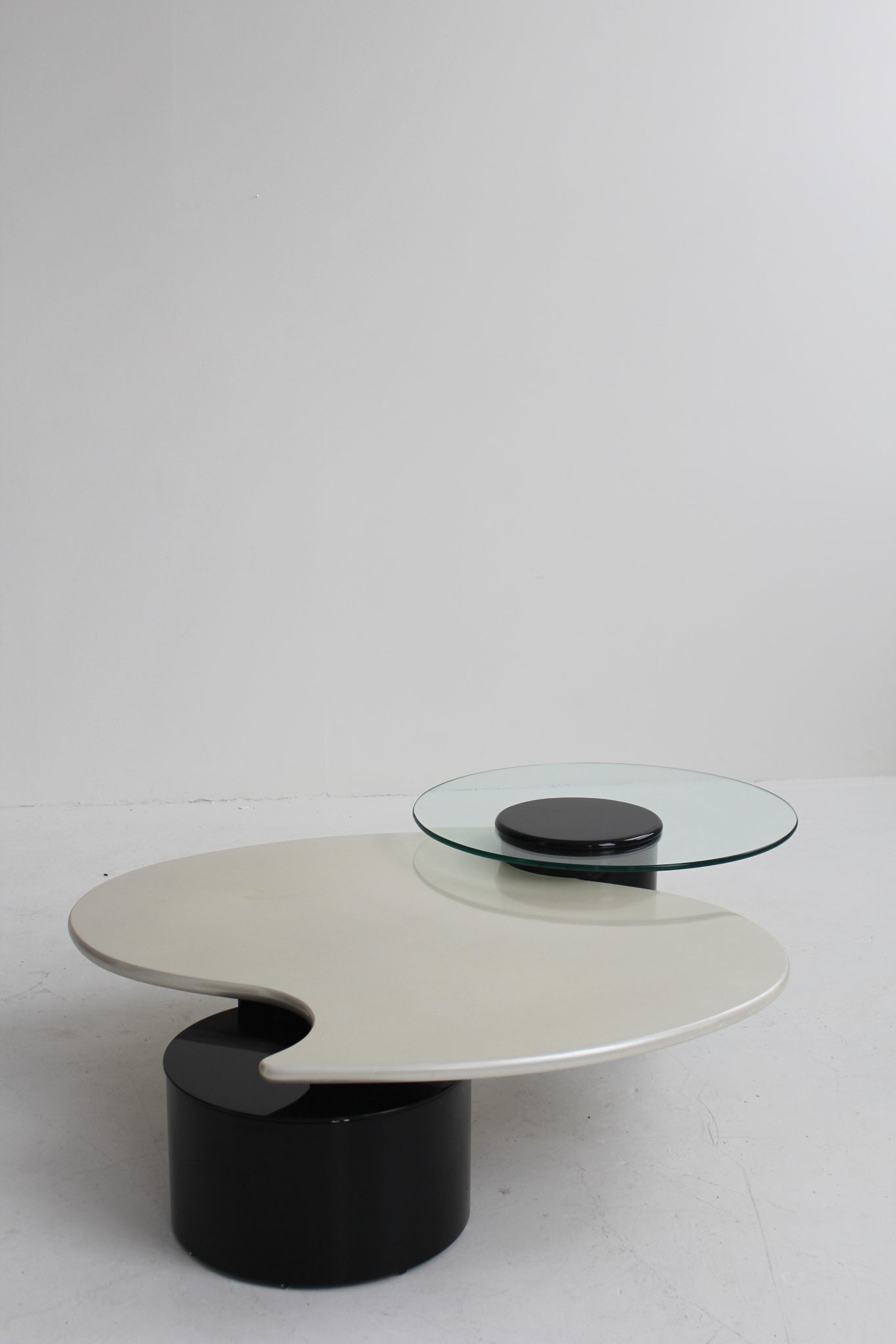 Table basse à 3 niveaux par le designer canadien Roger Rougier, années 1980. Deux colonnes en stratifié noir et plateau en stratifié à fini nacré. Plateau tournant en verre pouvant pivoter vers l'extérieur ou être complètement retiré.