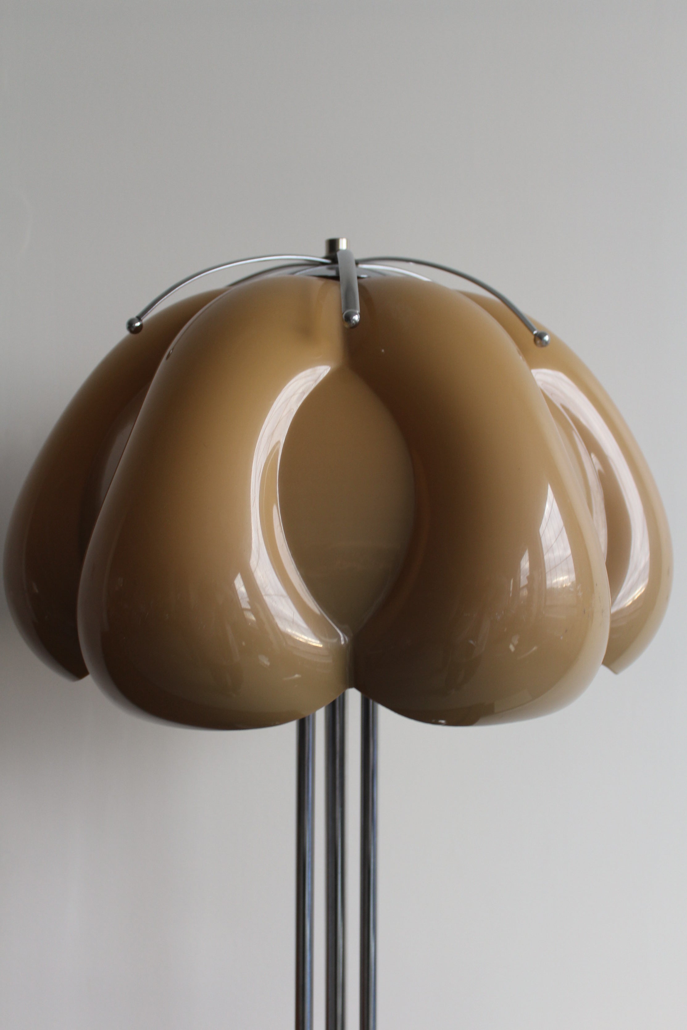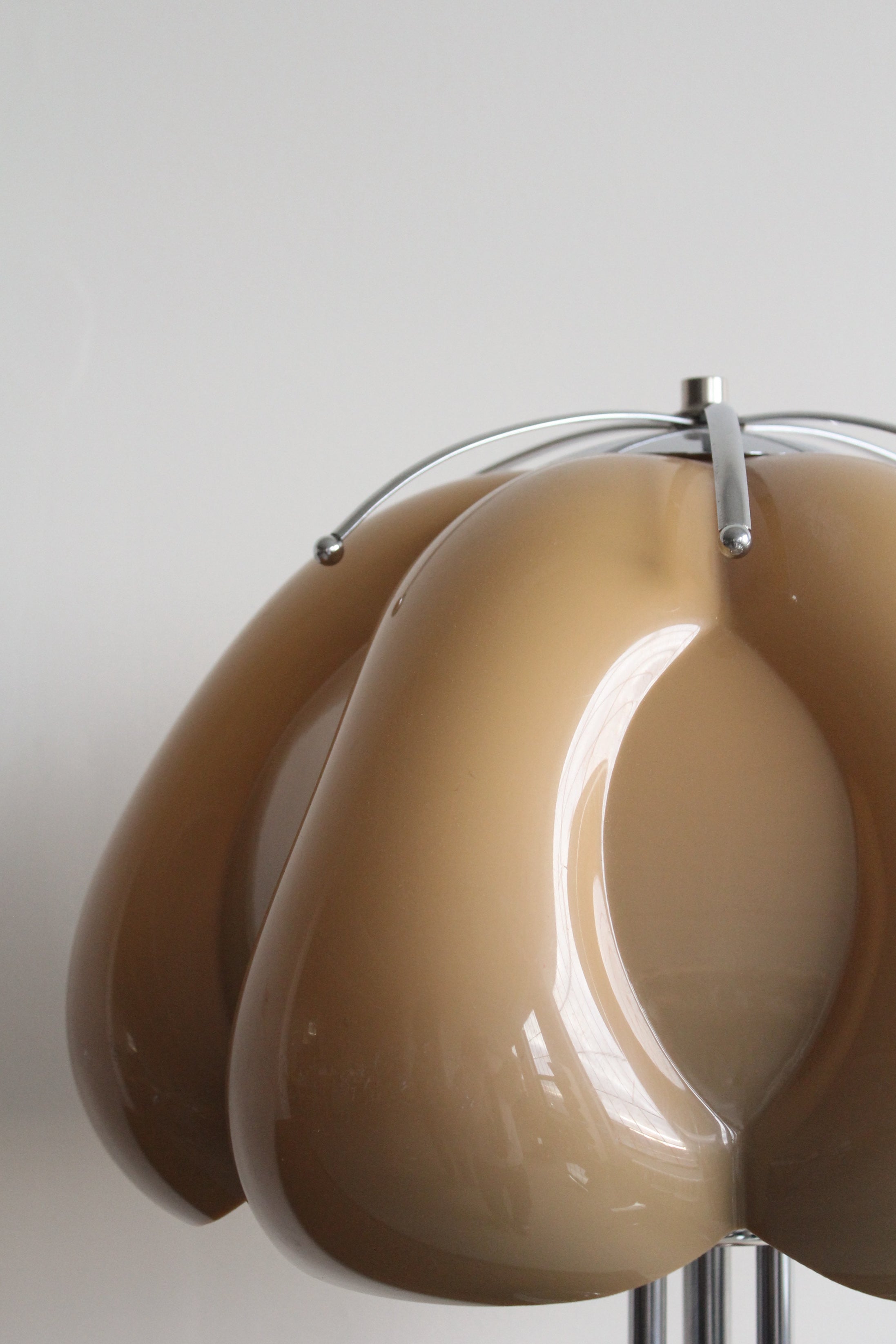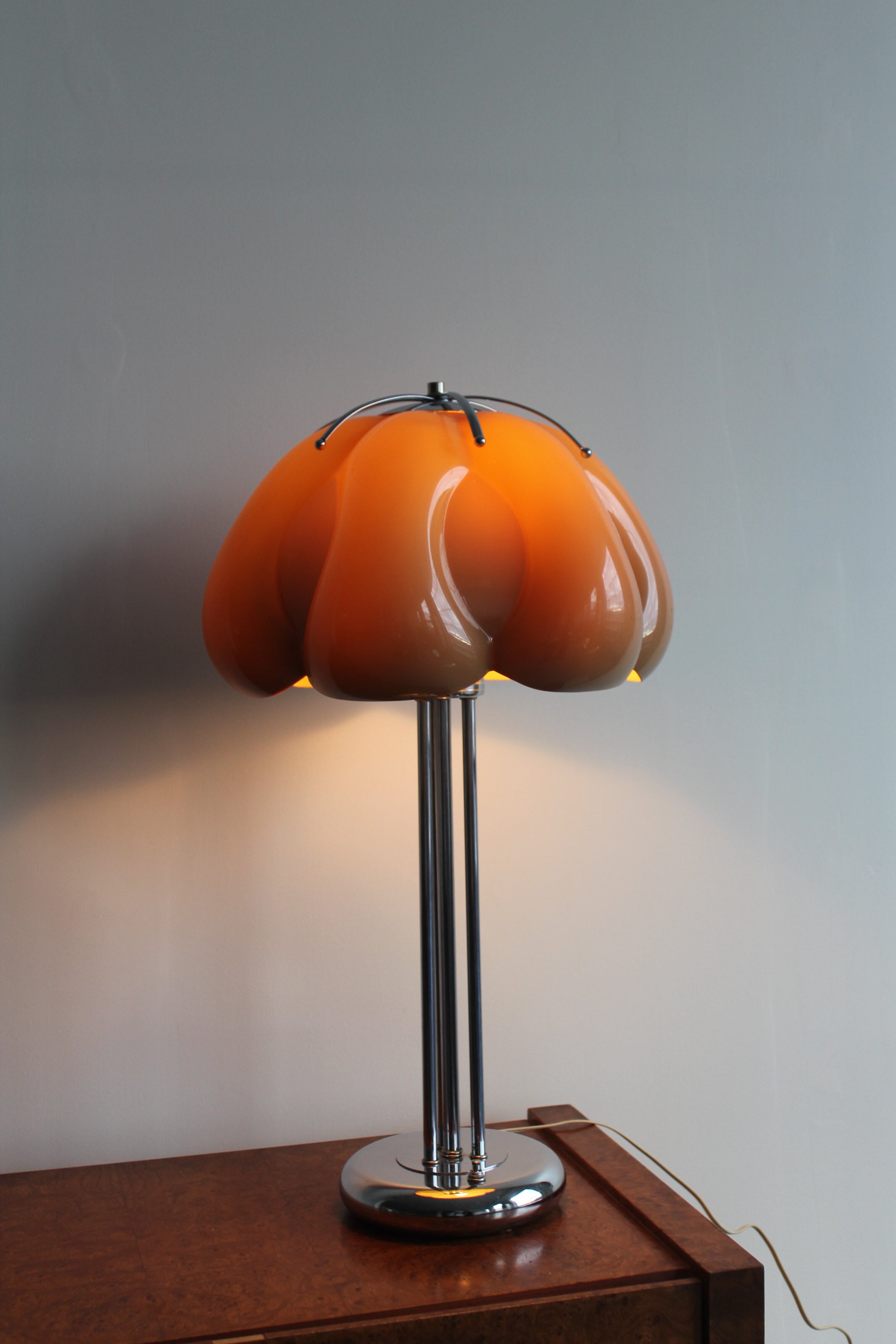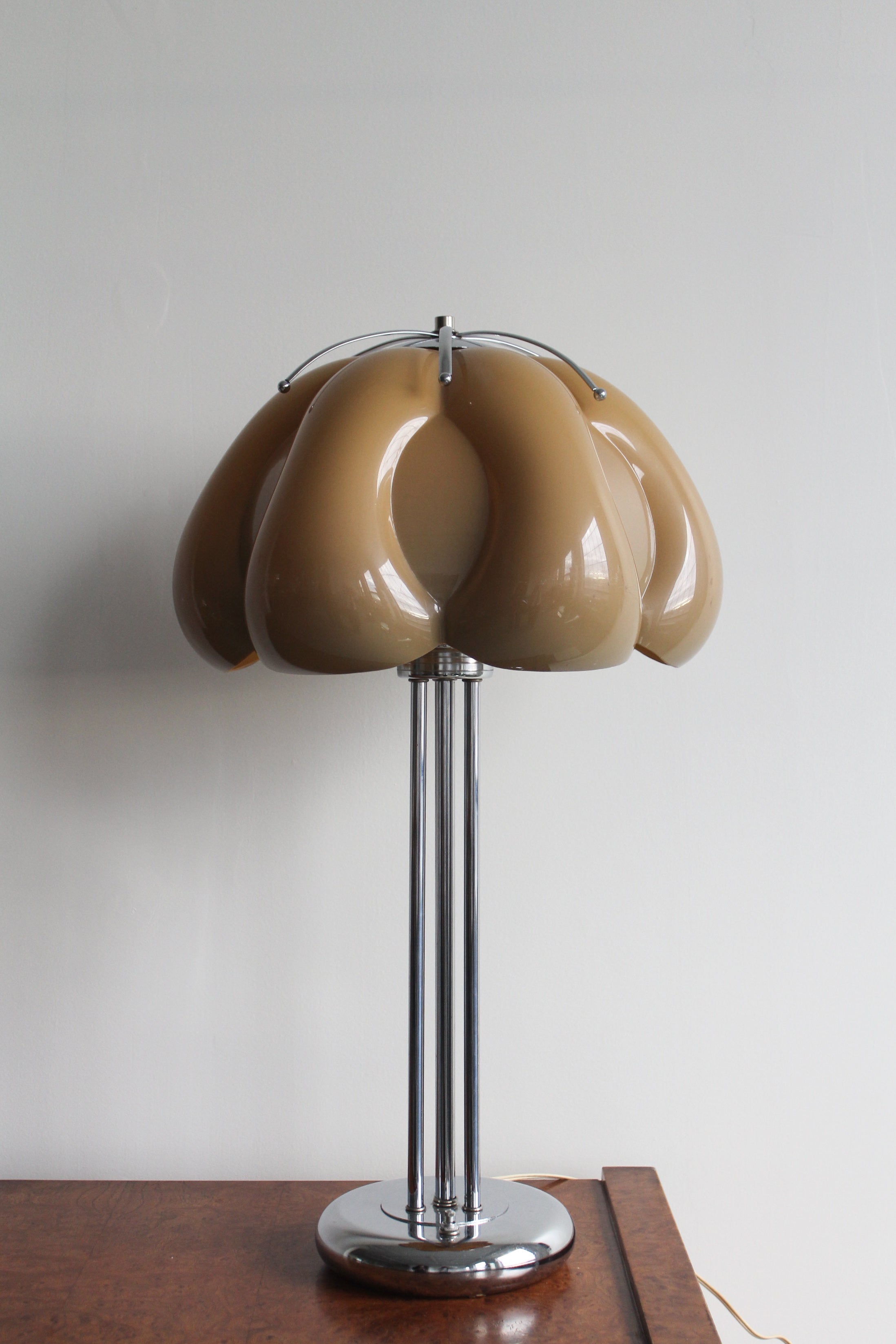 Lampe de table en acrylique dans le style de Harvey Guzzini, années 1970. Abat-jour en acrylique couleur caramel (butterscotch) avec base et détails en chrome.